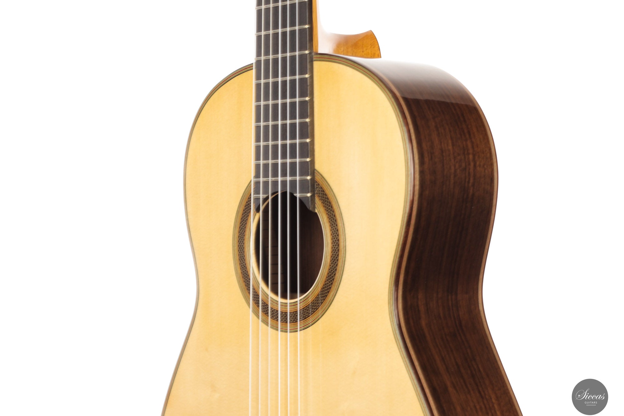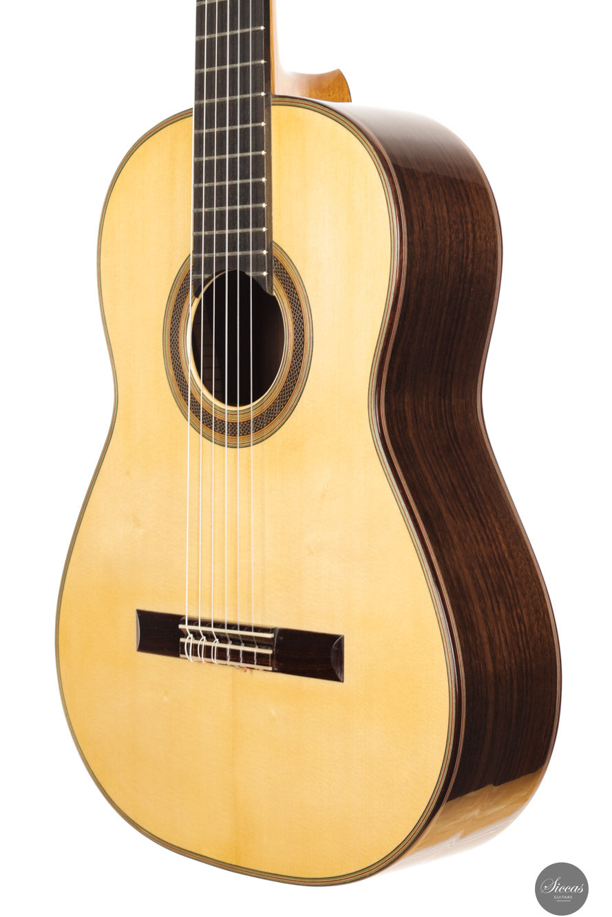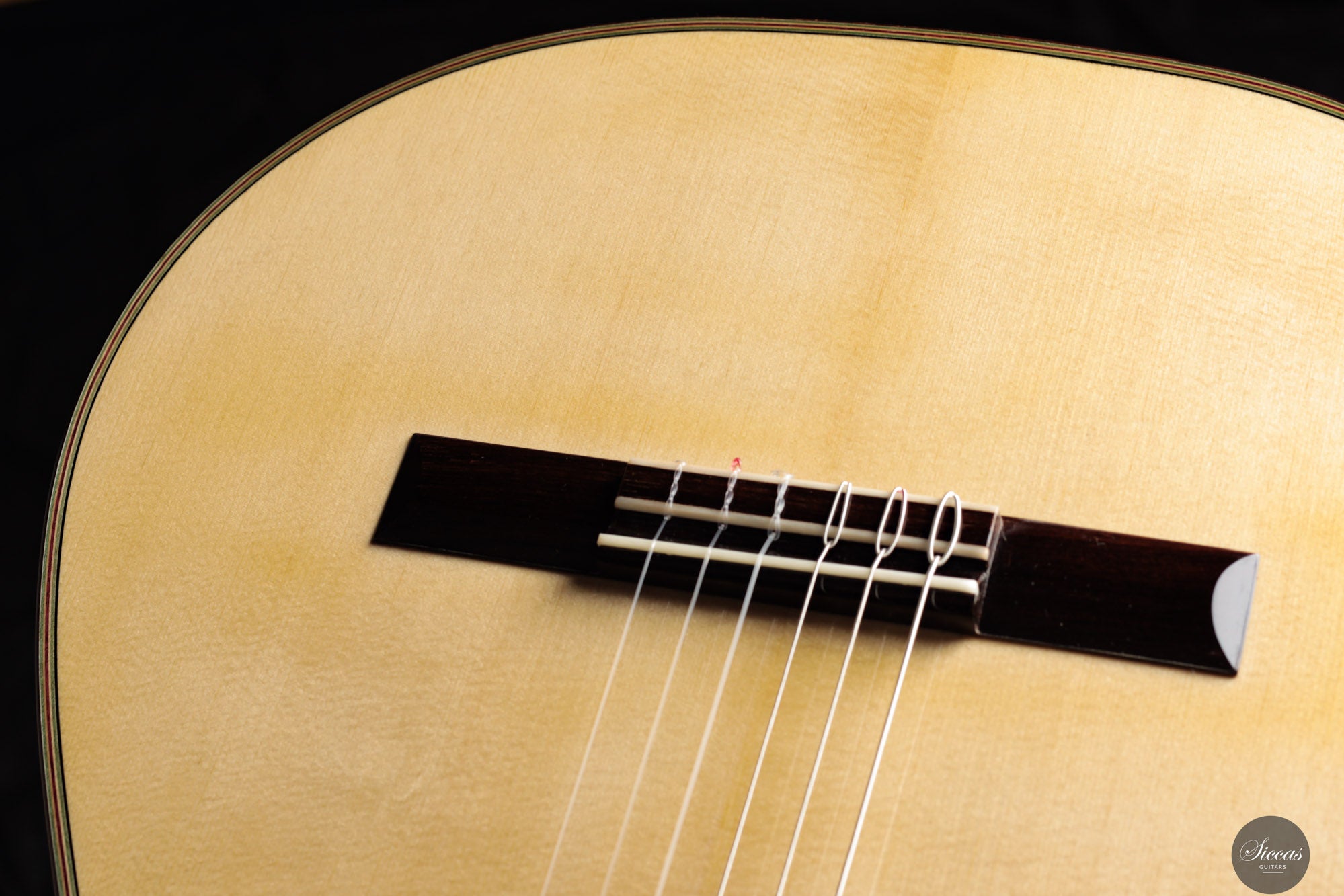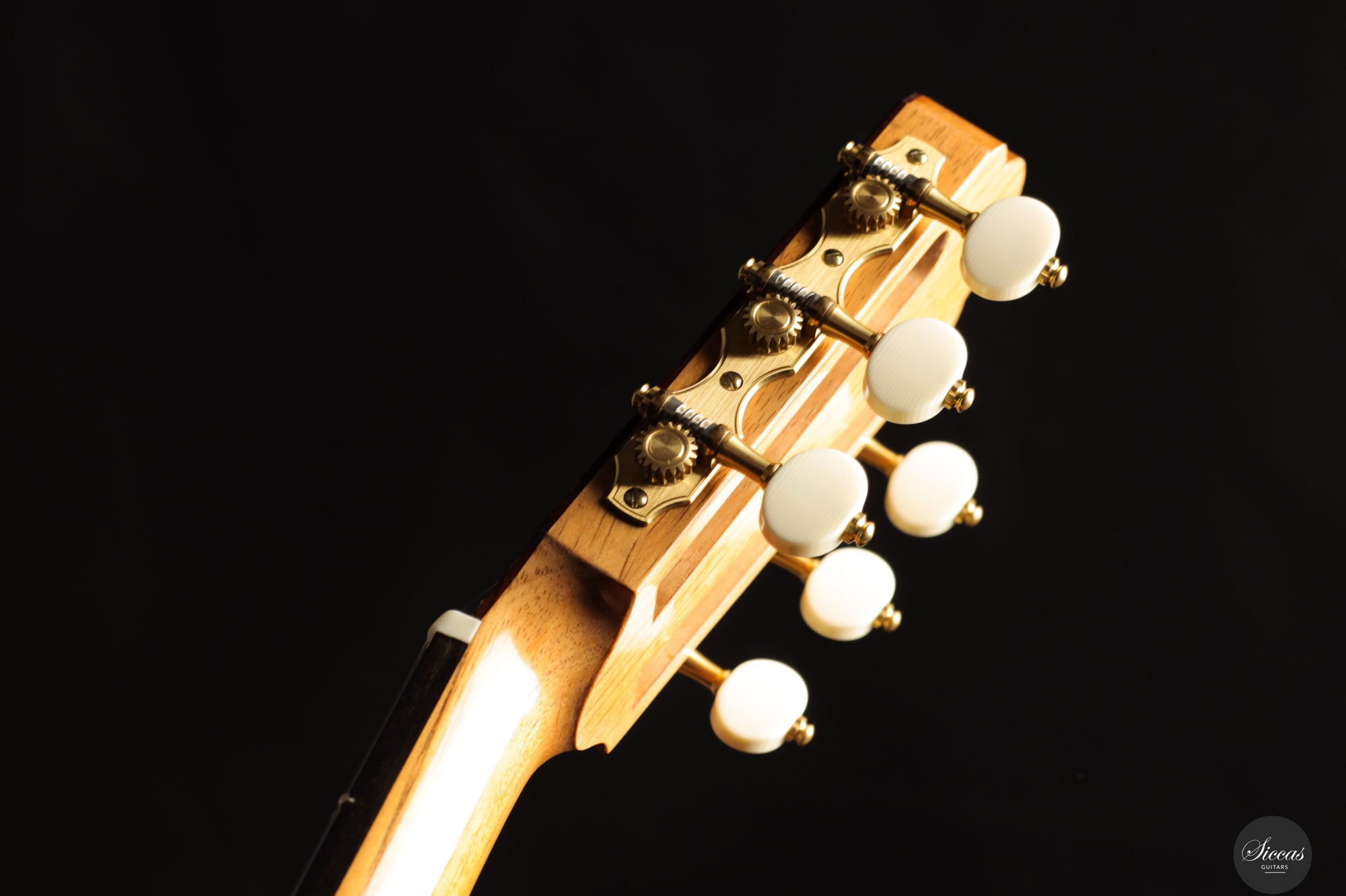 This concert guitar by Davide Scacchi embodies the refined elegance of the Milanese school while presenting a distinctive voice of its own. Exceptionally lightweight, it resonates deeply around F to F#, lending power and depth to its basses while maintaining immediacy and brilliance across the registers. The tone is nuanced, responsive, and alive under the hands, allowing the player to shape phrases with great subtlety and control. Though newly built, the instrument already conveys a maturity and complexity often found in seasoned guitars, with a wide expressive range and balanced projection. Completed with French polish, refined detailing, and Perona tuning machines, it represents both a high-level concert instrument and a clear expression of Scacchi’s artistry.