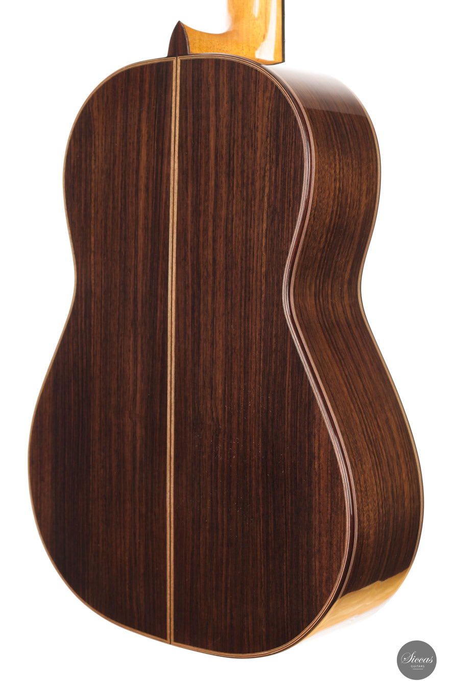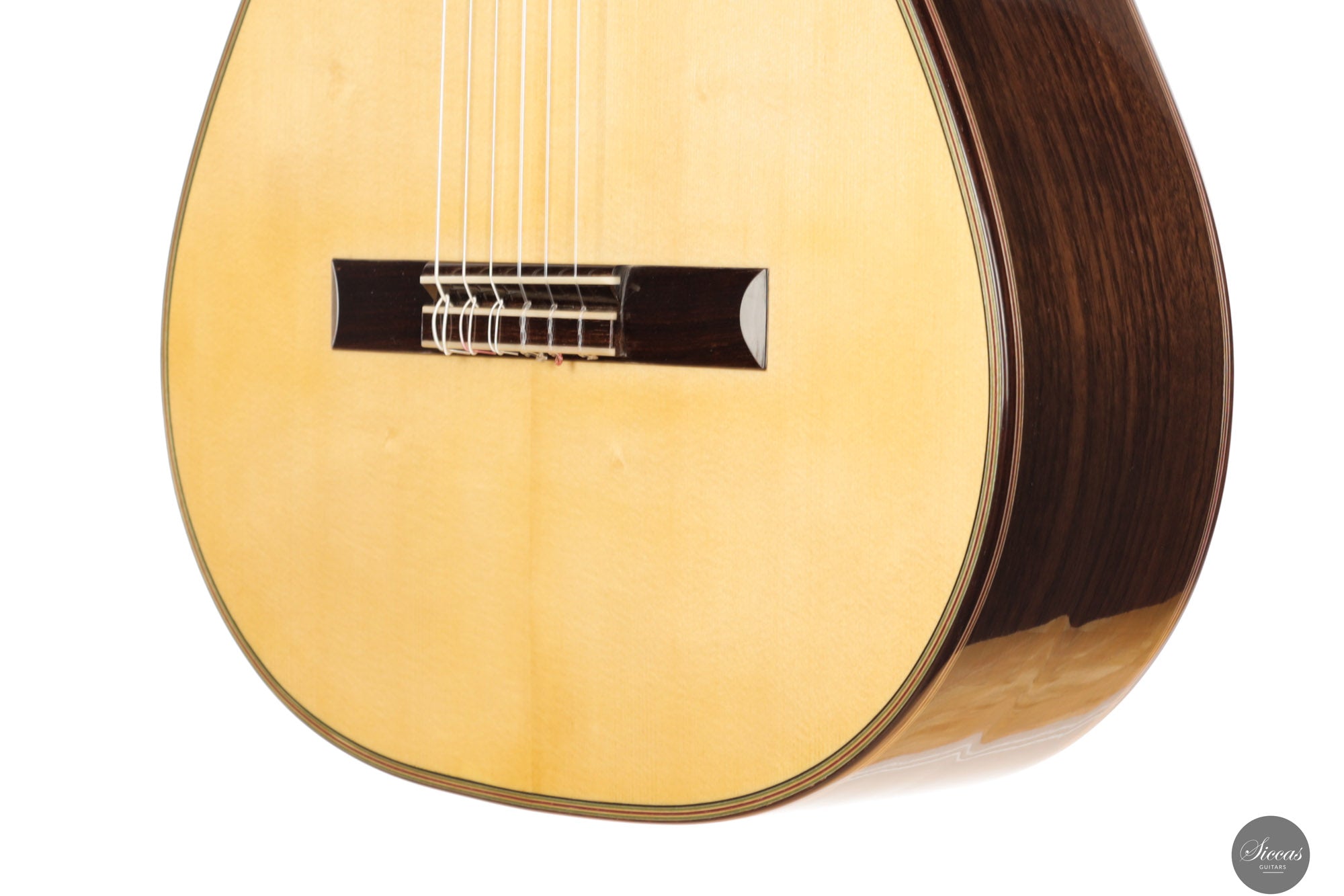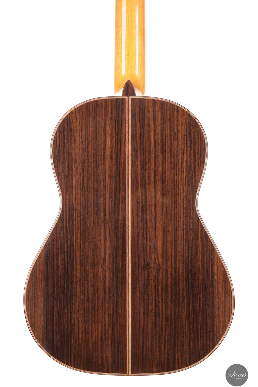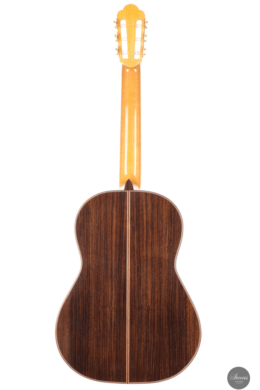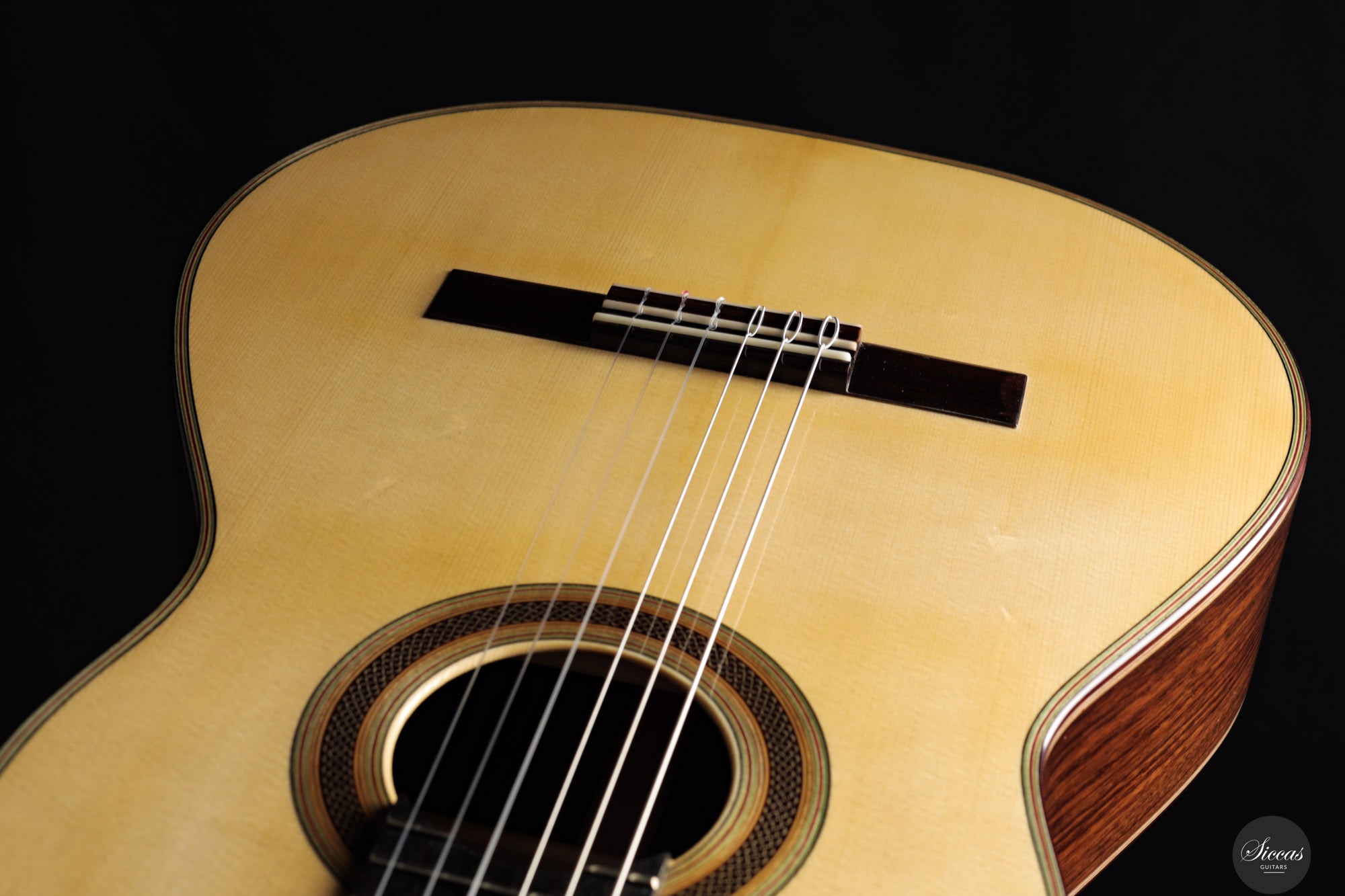 This concert guitar by Davide Scacchi embodies the refined elegance of the Milanese school while presenting a distinctive voice of its own. Exceptionally lightweight, it resonates deeply around F to F#, lending power and depth to its basses while maintaining immediacy and brilliance across the registers. The tone is nuanced, responsive, and alive under the hands, allowing the player to shape phrases with great subtlety and control. Though newly built, the instrument already conveys a maturity and complexity often found in seasoned guitars, with a wide expressive range and balanced projection. Completed with French polish, refined detailing, and Perona tuning machines, it represents both a high-level concert instrument and a clear expression of Scacchi’s artistry.