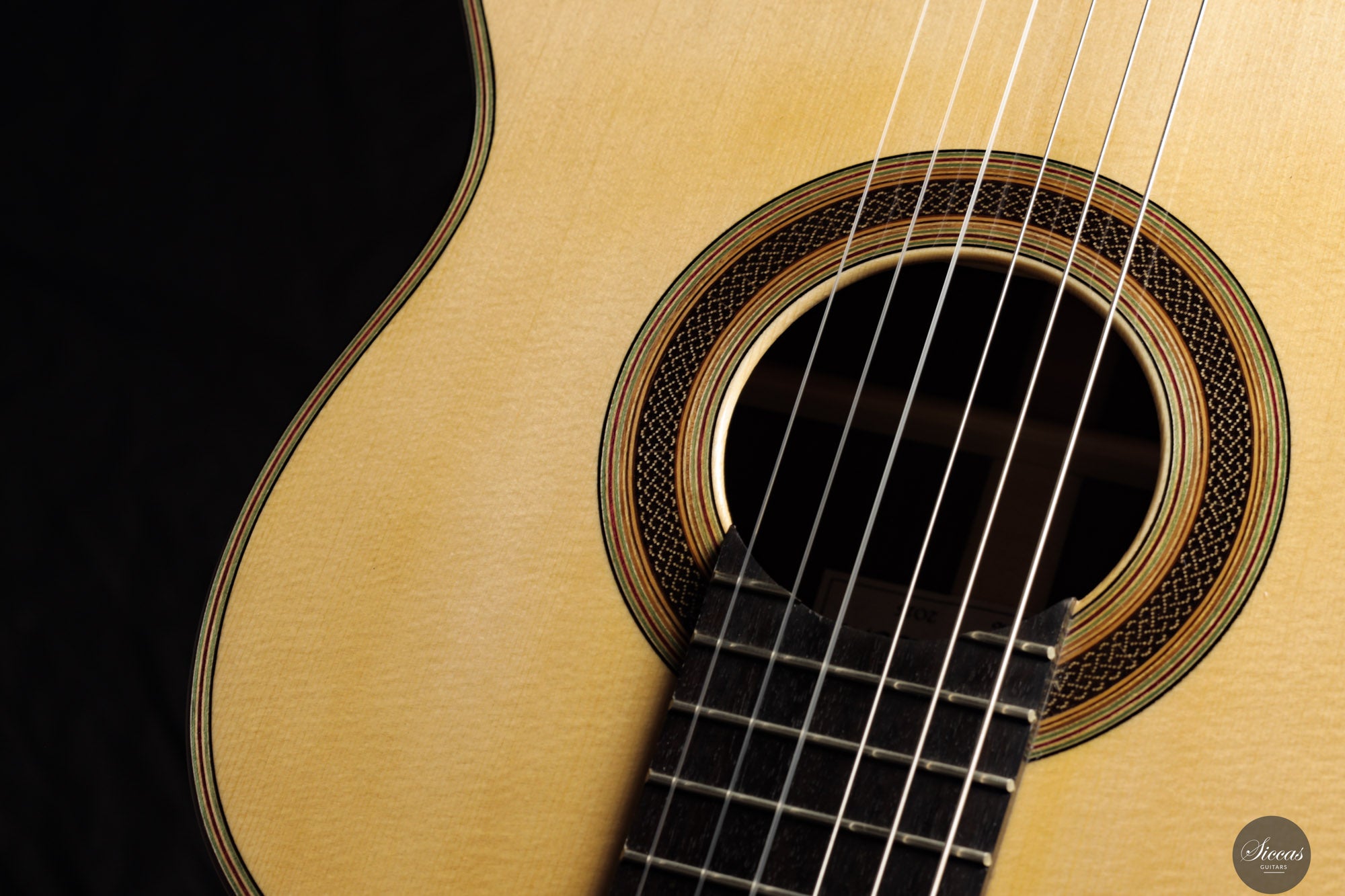 Exceptionally light in weight, it offers a deep, enveloping air resonance around F to F#, which provides a striking foundation for its powerful basses. At the same time, the guitar responds instantly to the lightest touch, producing a tone that is both brilliant and nuanced. The result is an instrument that feels alive in the hands of the player. Although newly built, it already projects with a maturity and complexity often associated with more seasoned guitars. Its expressive range is wide, allowing for subtle shaping of tone and dynamics. The carefully applied French polish, elegant detailing, and Perona tuning machines complete the picture of a concert instrument crafted to the highest standards. This guitar is not only an exceptional tool for performance but also a testament to the artistic vision of Davide Scacchi.