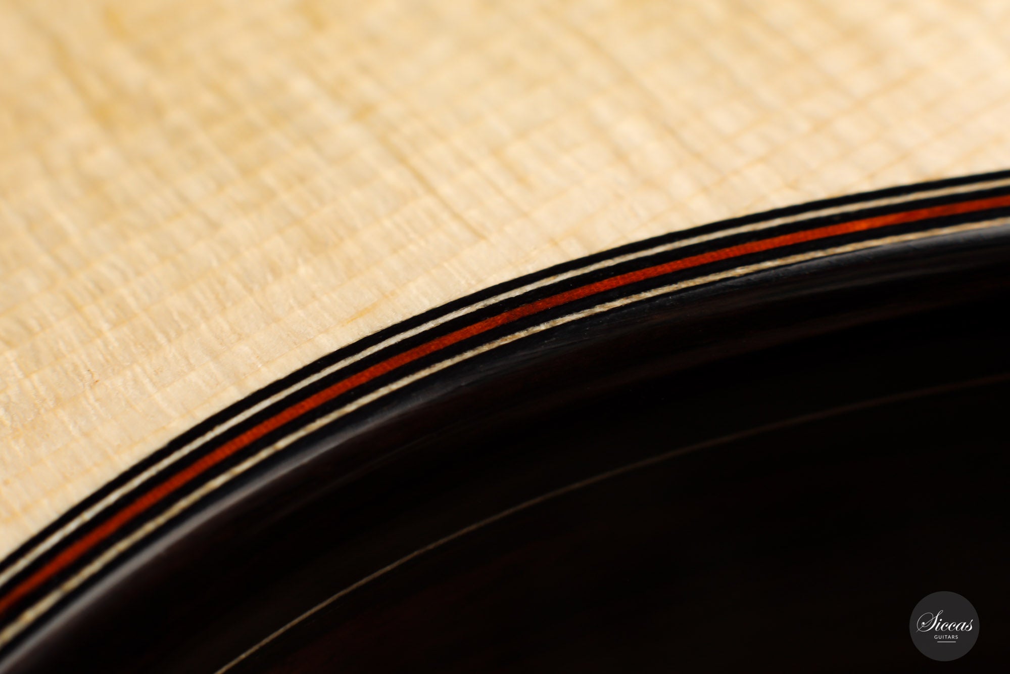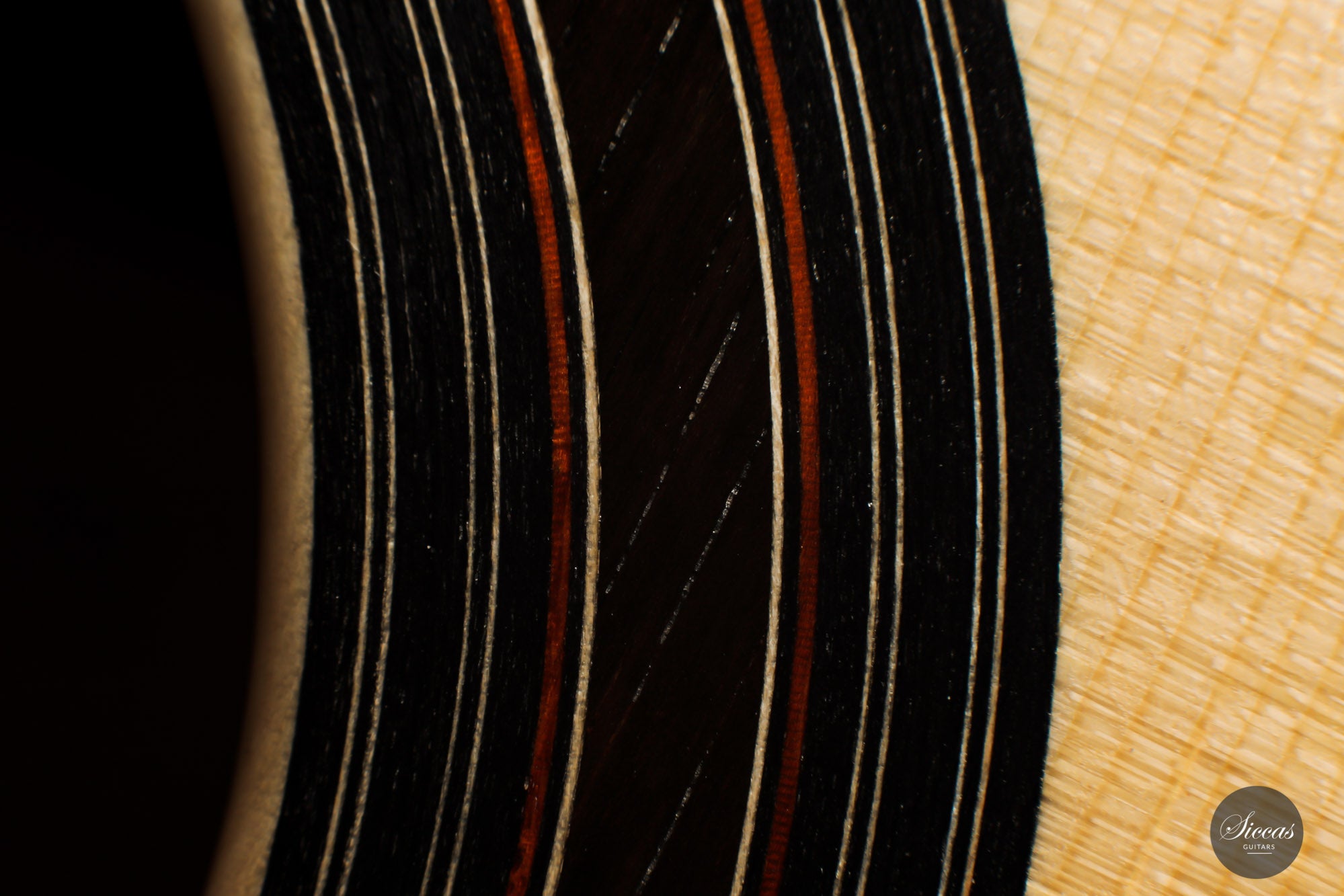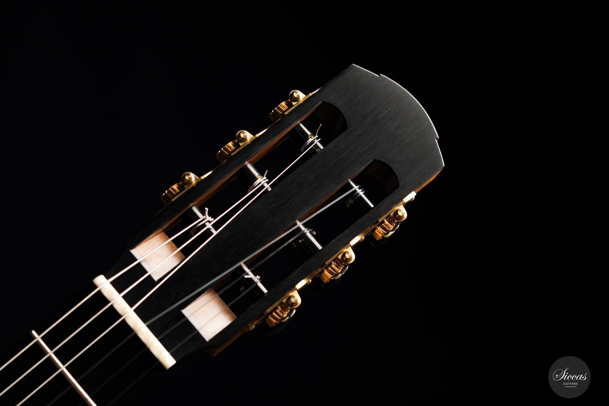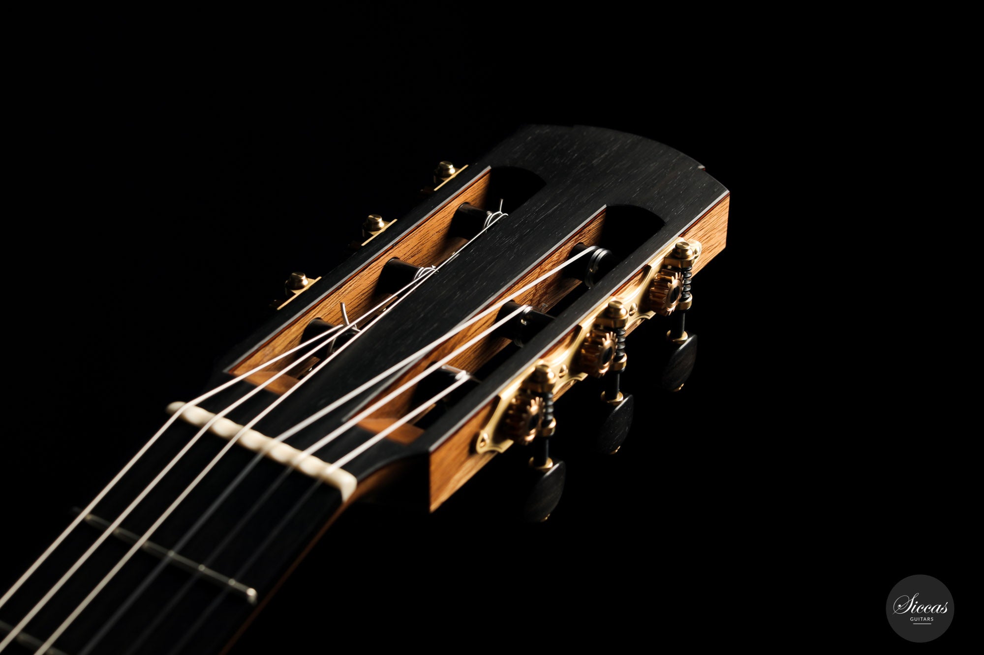 This instrument is a model of balance and elegance. Its flawless and modern design carries a clear idea of Dennis Tolz's commitment to intelligent and refined lutherie. The double-top soundboard made of an outside spruce layer and cedar on the inside is reinforced with a traditional lightweight fan bracing. This combination gives to this instrument a fantastic projection and yet a warm, precise and charming tone. The playing experience is lovely as the neck shape makes playing effortless, and the set up offers extreme comfort. We are pleased to present a guitar from Dennis and firmly believe that this guitar will seduce any passionate guitarist thanks to its pure, rich and voluminous sound.
