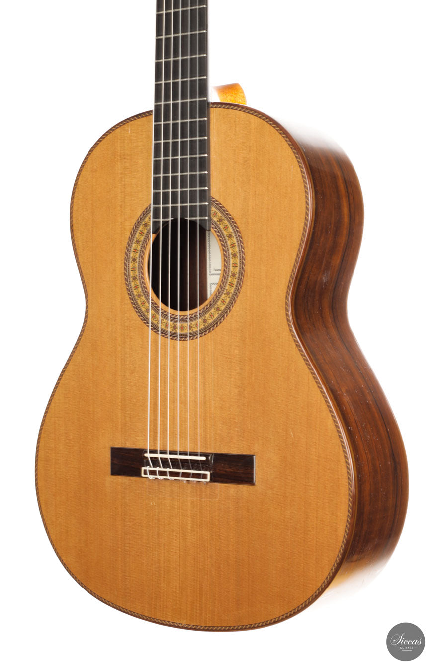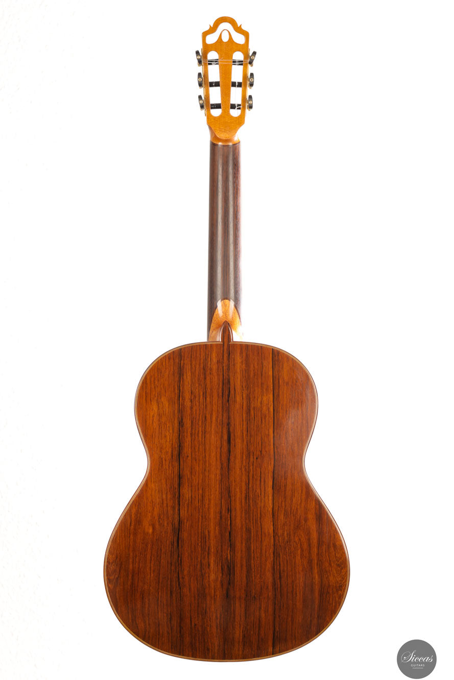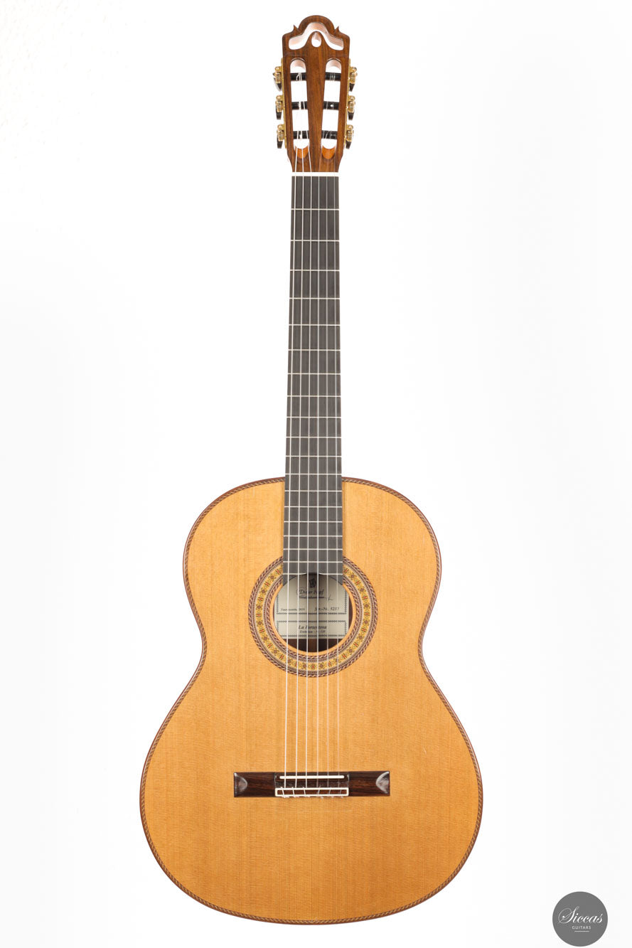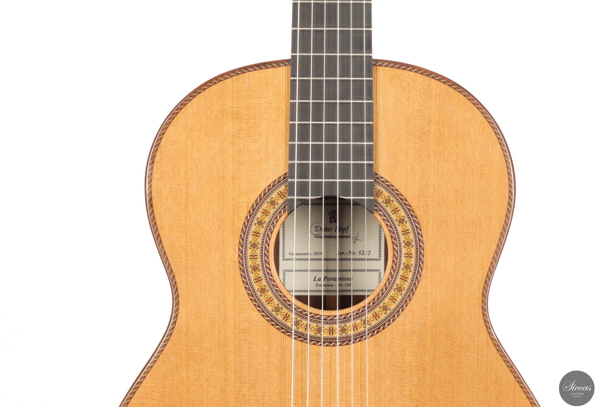 This 2019 *Portentosa Evolución* No. 120 is a remarkable example of Dieter Hopf’s craftsmanship, blending traditional design with modern innovations. The guitar features a cedar top paired with Indian rosewood back and sides, a combination that produces a warm, full-bodied tone with exceptional depth and clarity. The lattice-braced top, reinforced with a thin layer of carbon fiber, amplifies its loudness and projection, delivering a big, resonant sound that fills both intimate and large spaces effortlessly. Despite its power, the guitar offers surprisingly good tone separation, allowing each note to stand out clearly, making it ideal for complex musical passages. This guitar is not only powerful but also versatile, offering a tonal palette that is balanced, rounded, and rich in color. The light construction and responsive touch make it a pleasure to play, ensuring a comfortable and rewarding experience for the performer. This instrument is in very good condition, with normal signs of wear, maintaining its visual beauty and exceptional acoustic qualities.