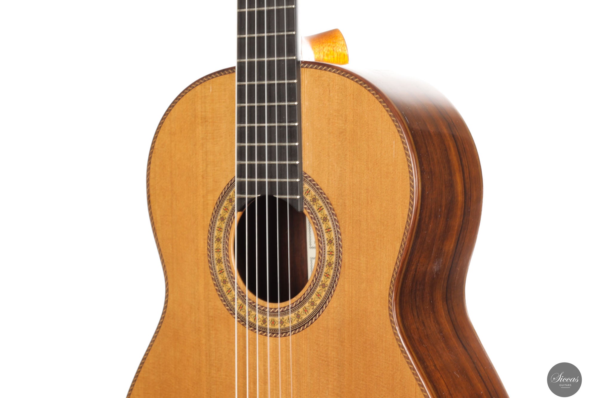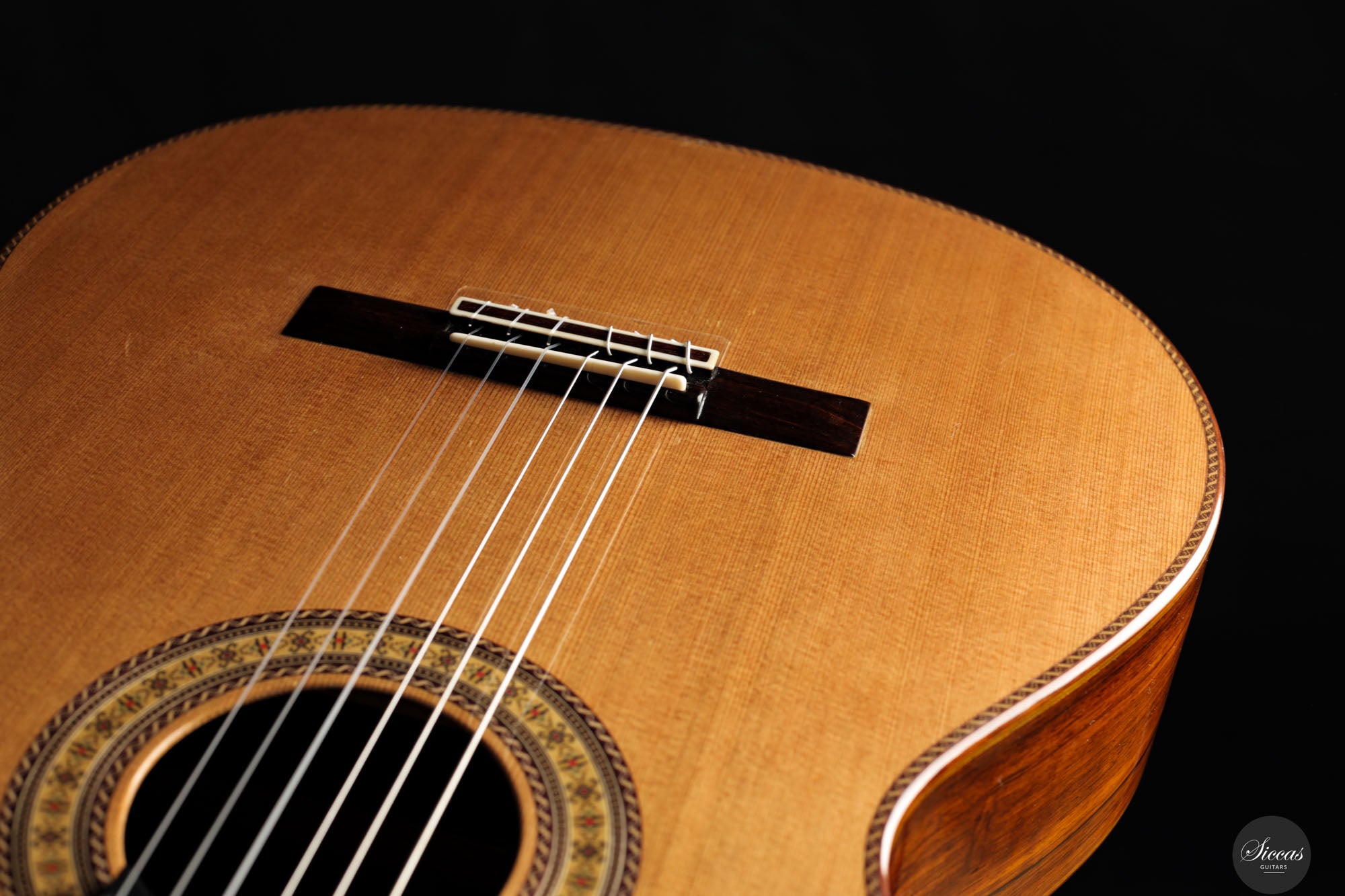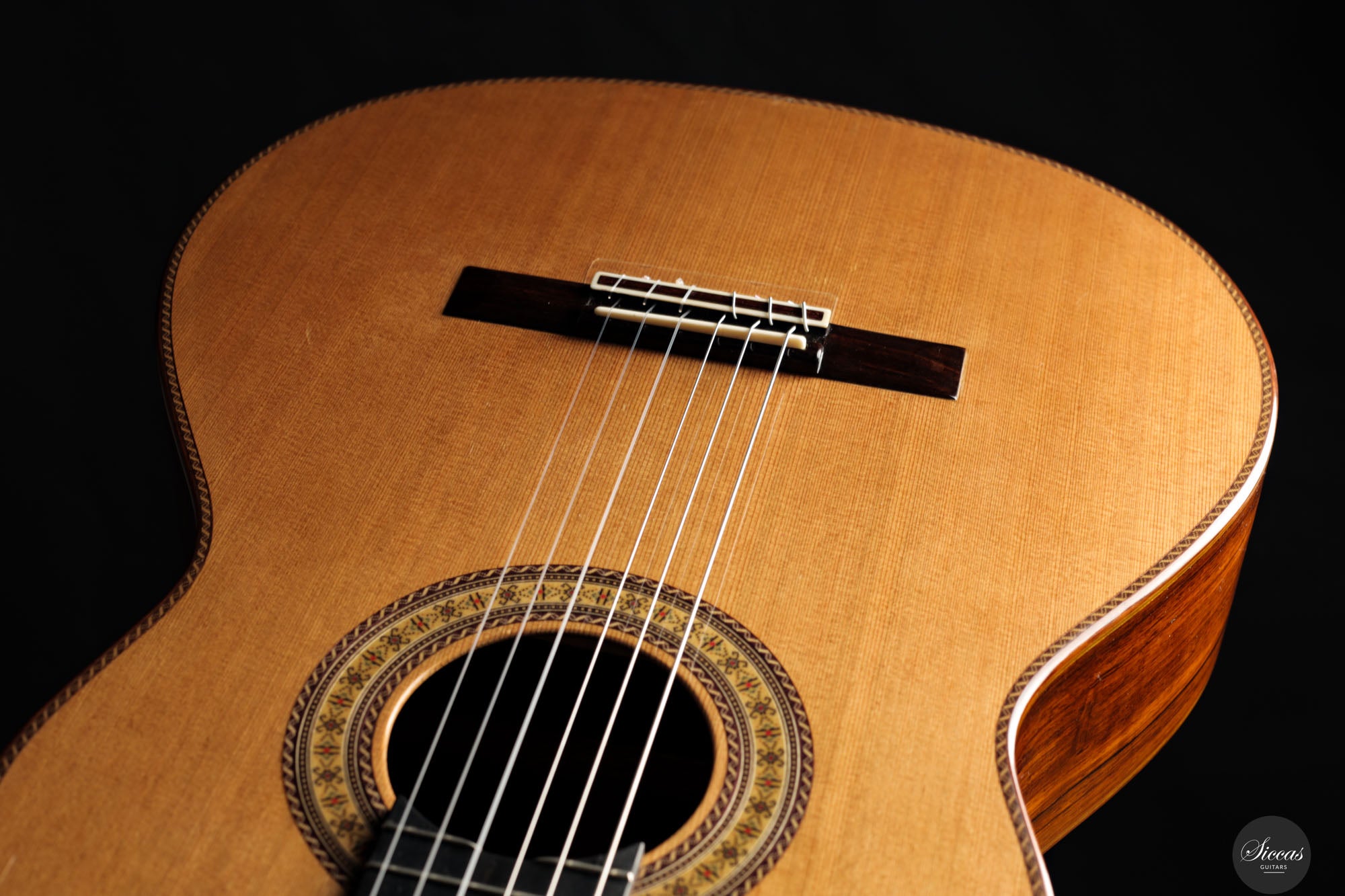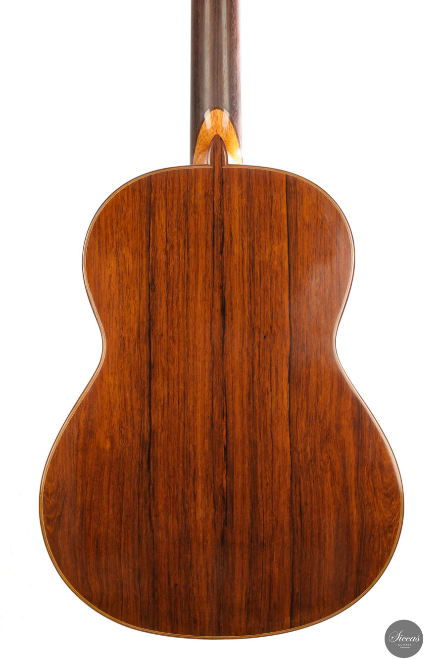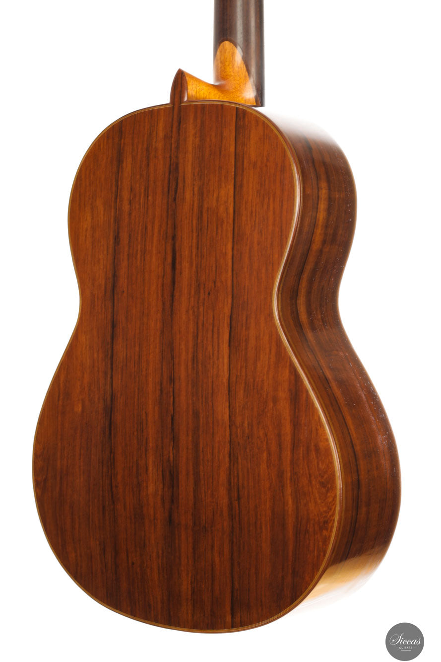 This 2019 *Portentosa Evolución* No. 120 is a remarkable example of Dieter Hopf’s craftsmanship, blending traditional design with modern innovations. The guitar features a cedar top paired with Indian rosewood back and sides, a combination that produces a warm, full-bodied tone with exceptional depth and clarity. The lattice-braced top, reinforced with a thin layer of carbon fiber, amplifies its loudness and projection, delivering a big, resonant sound that fills both intimate and large spaces effortlessly. Despite its power, the guitar offers surprisingly good tone separation, allowing each note to stand out clearly, making it ideal for complex musical passages. This guitar is not only powerful but also versatile, offering a tonal palette that is balanced, rounded, and rich in color. The light construction and responsive touch make it a pleasure to play, ensuring a comfortable and rewarding experience for the performer. This instrument is in very good condition, with normal signs of wear, maintaining its visual beauty and exceptional acoustic qualities.