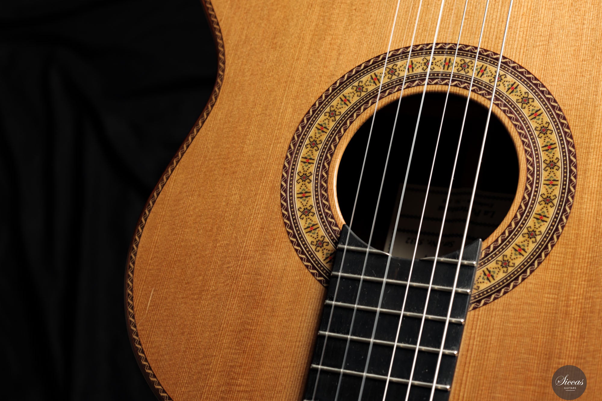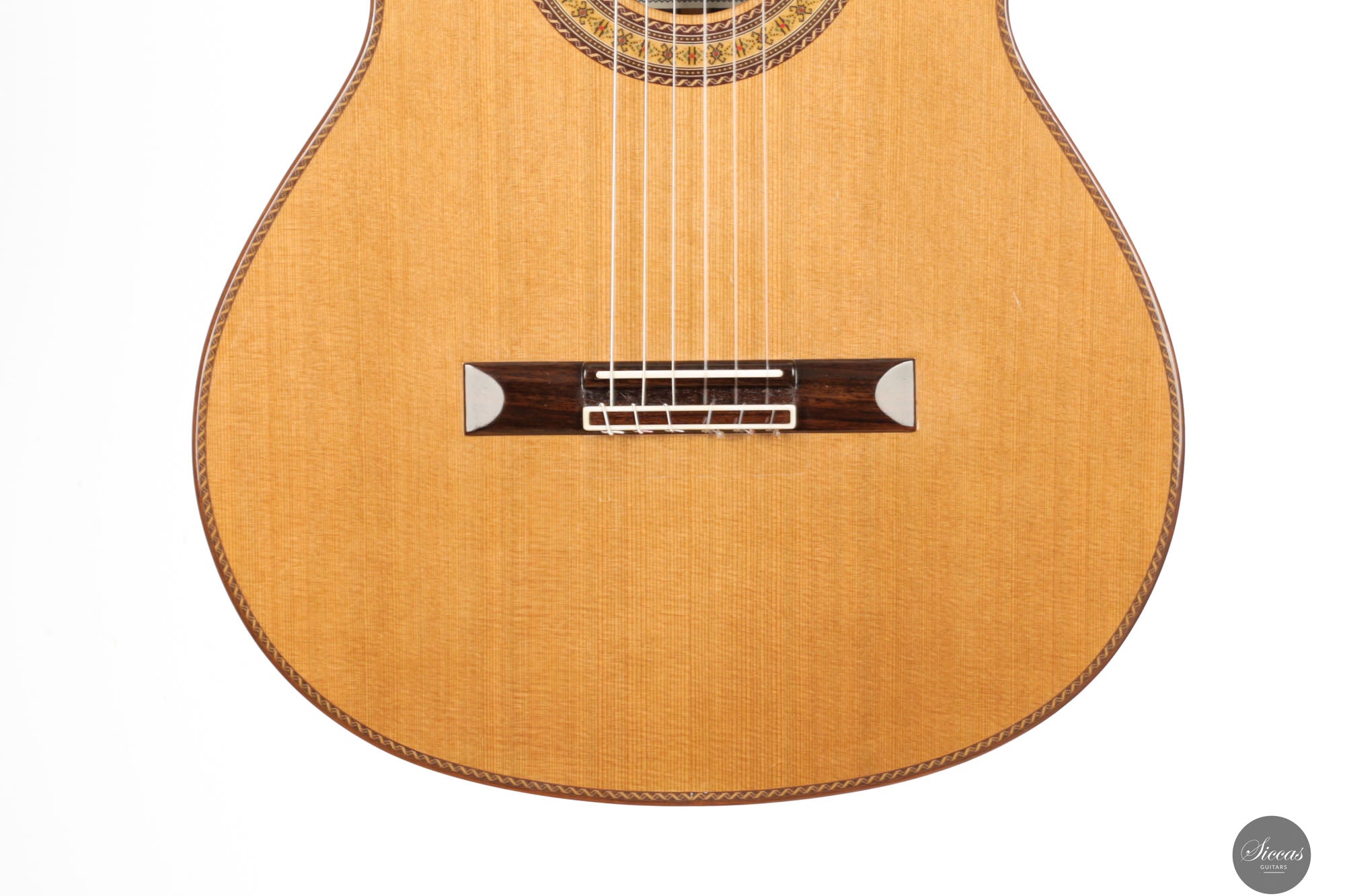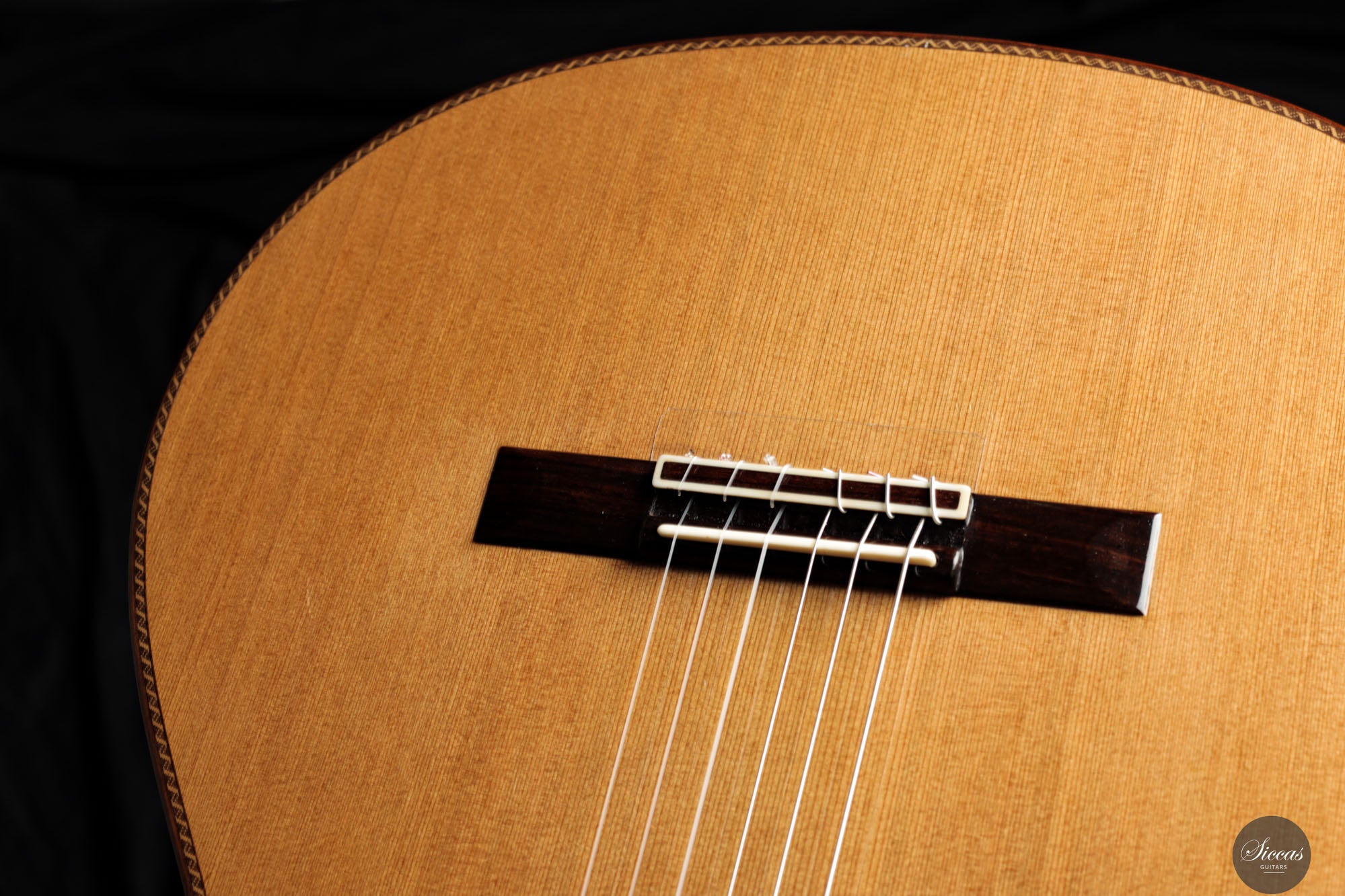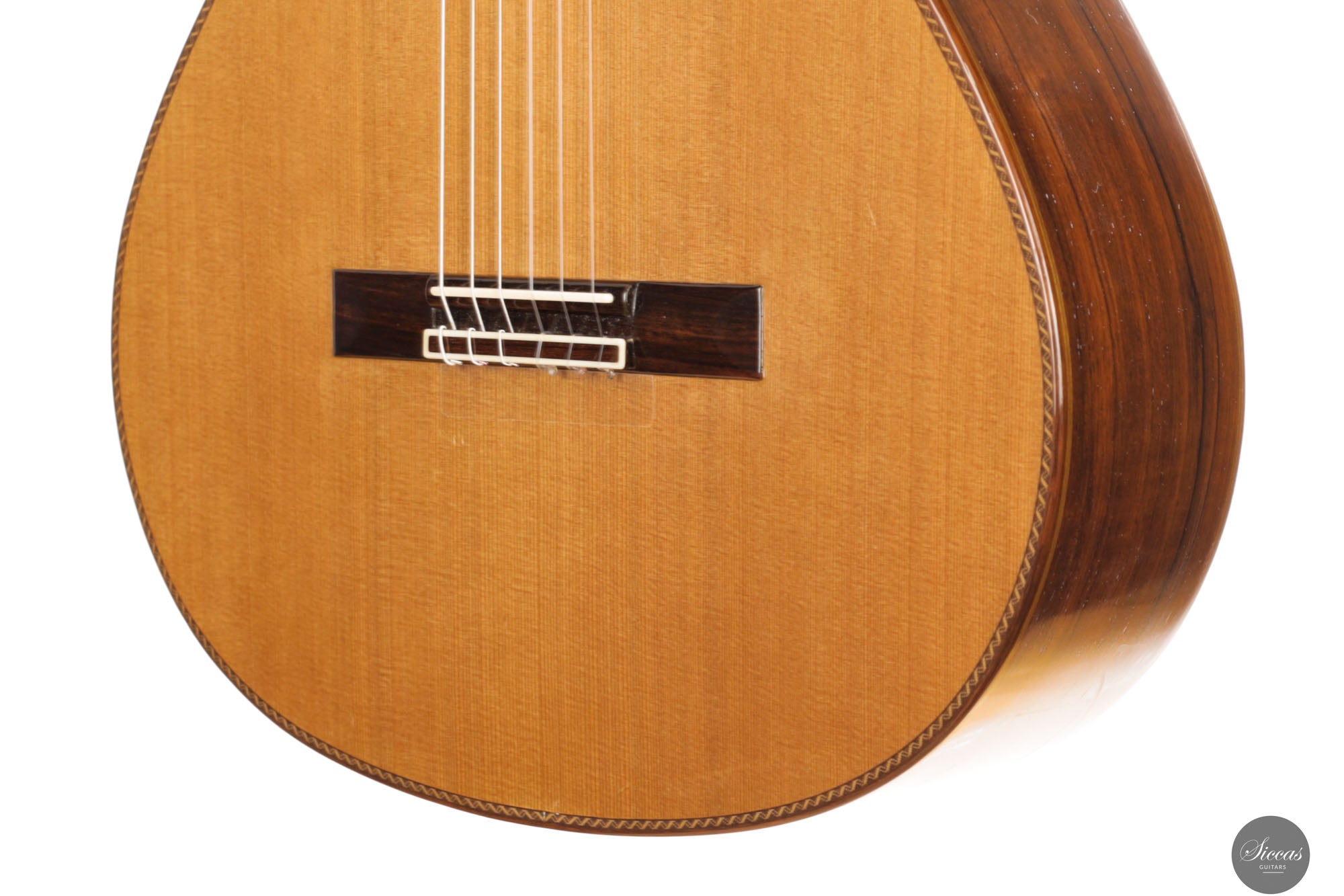 This 2019 *Portentosa Evolución* No. 120 is a remarkable example of Dieter Hopf’s craftsmanship, blending traditional design with modern innovations. The guitar features a cedar top paired with Indian rosewood back and sides, a combination that produces a warm, full-bodied tone with exceptional depth and clarity. The lattice-braced top, reinforced with a thin layer of carbon fiber, amplifies its loudness and projection, delivering a big, resonant sound that fills both intimate and large spaces effortlessly. Despite its power, the guitar offers surprisingly good tone separation, allowing each note to stand out clearly, making it ideal for complex musical passages. This guitar is not only powerful but also versatile, offering a tonal palette that is balanced, rounded, and rich in color. The light construction and responsive touch make it a pleasure to play, ensuring a comfortable and rewarding experience for the performer. This instrument is in very good condition, with normal signs of wear, maintaining its visual beauty and exceptional acoustic qualities.