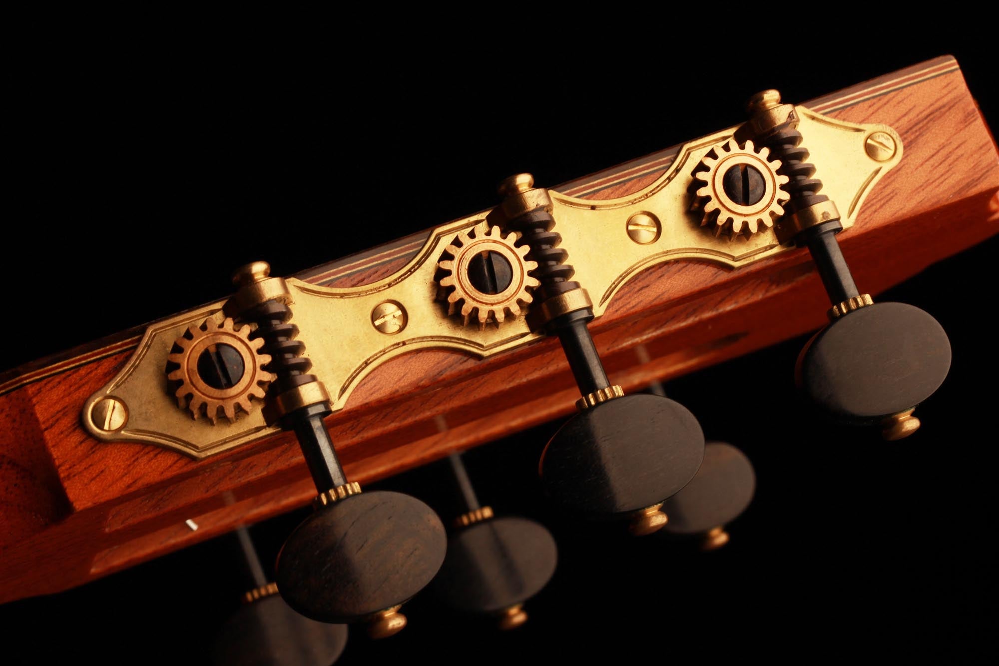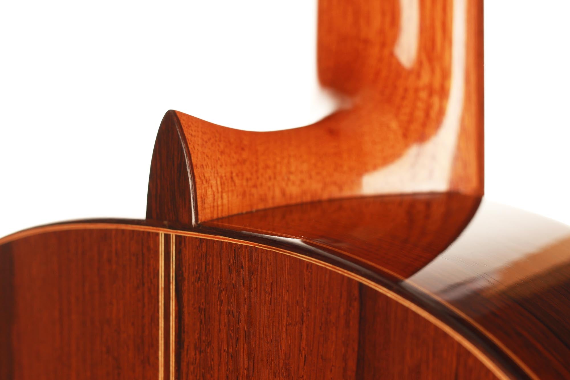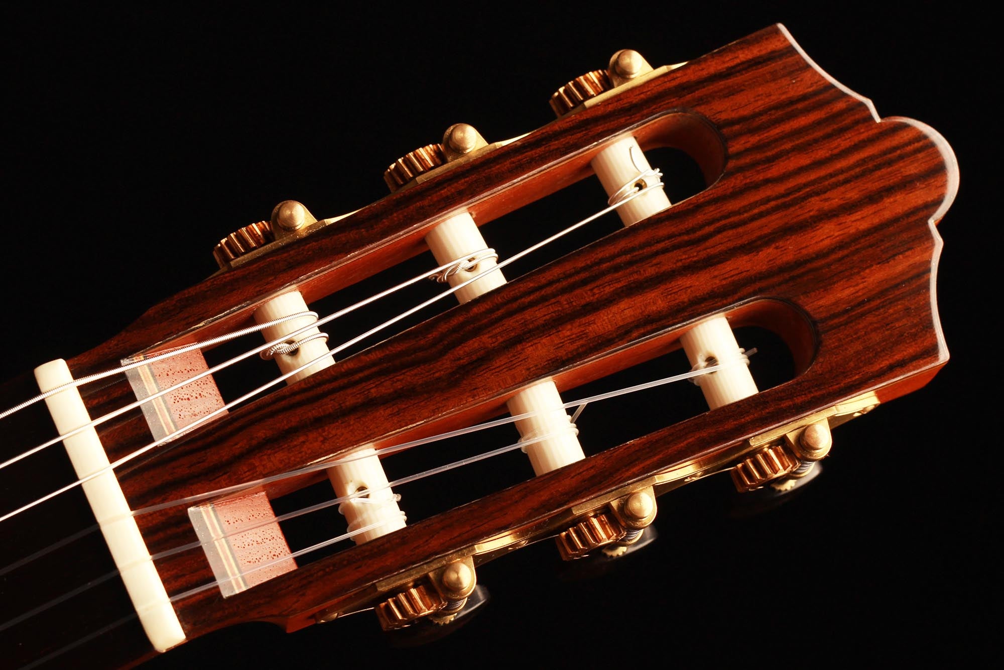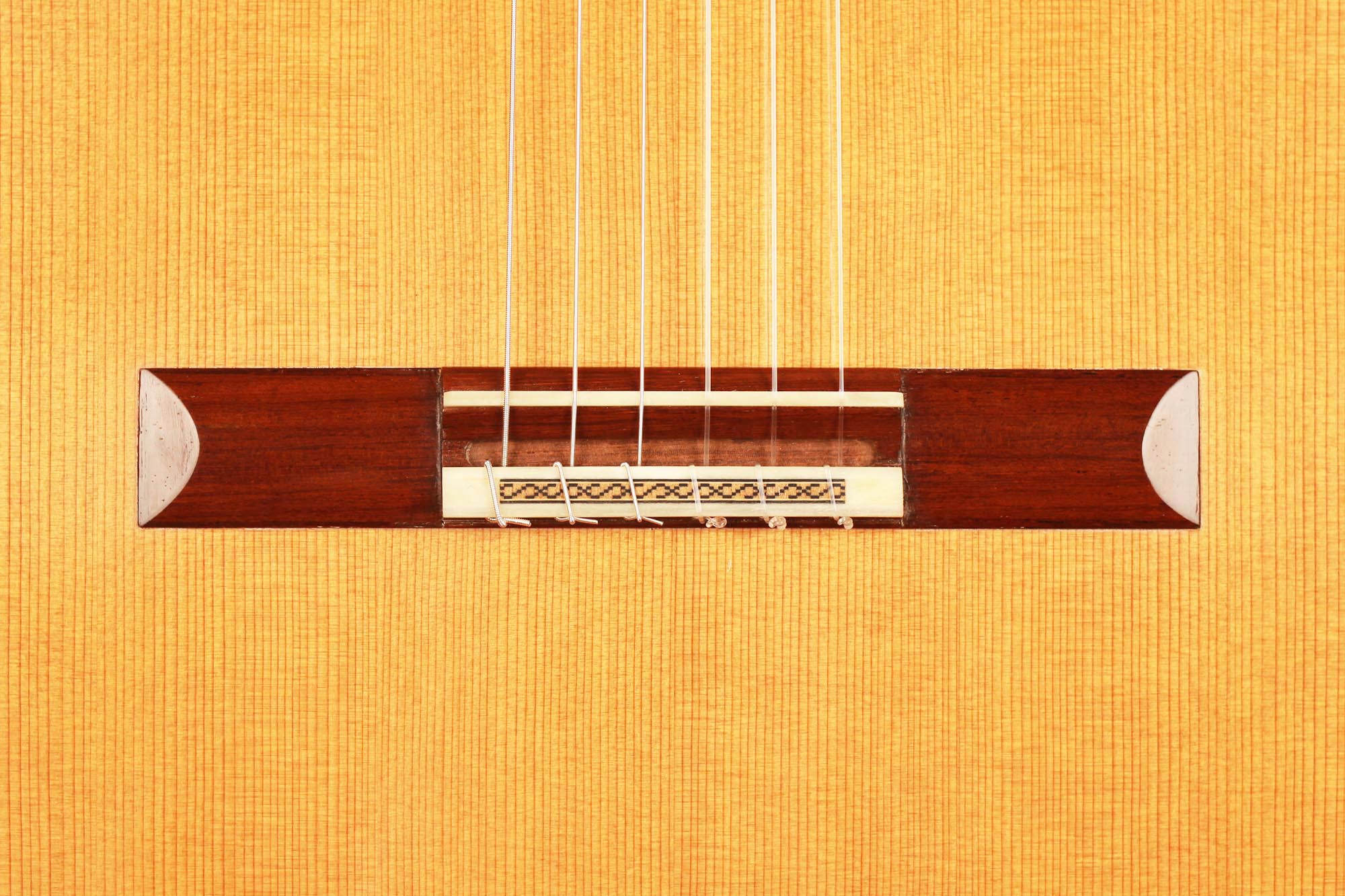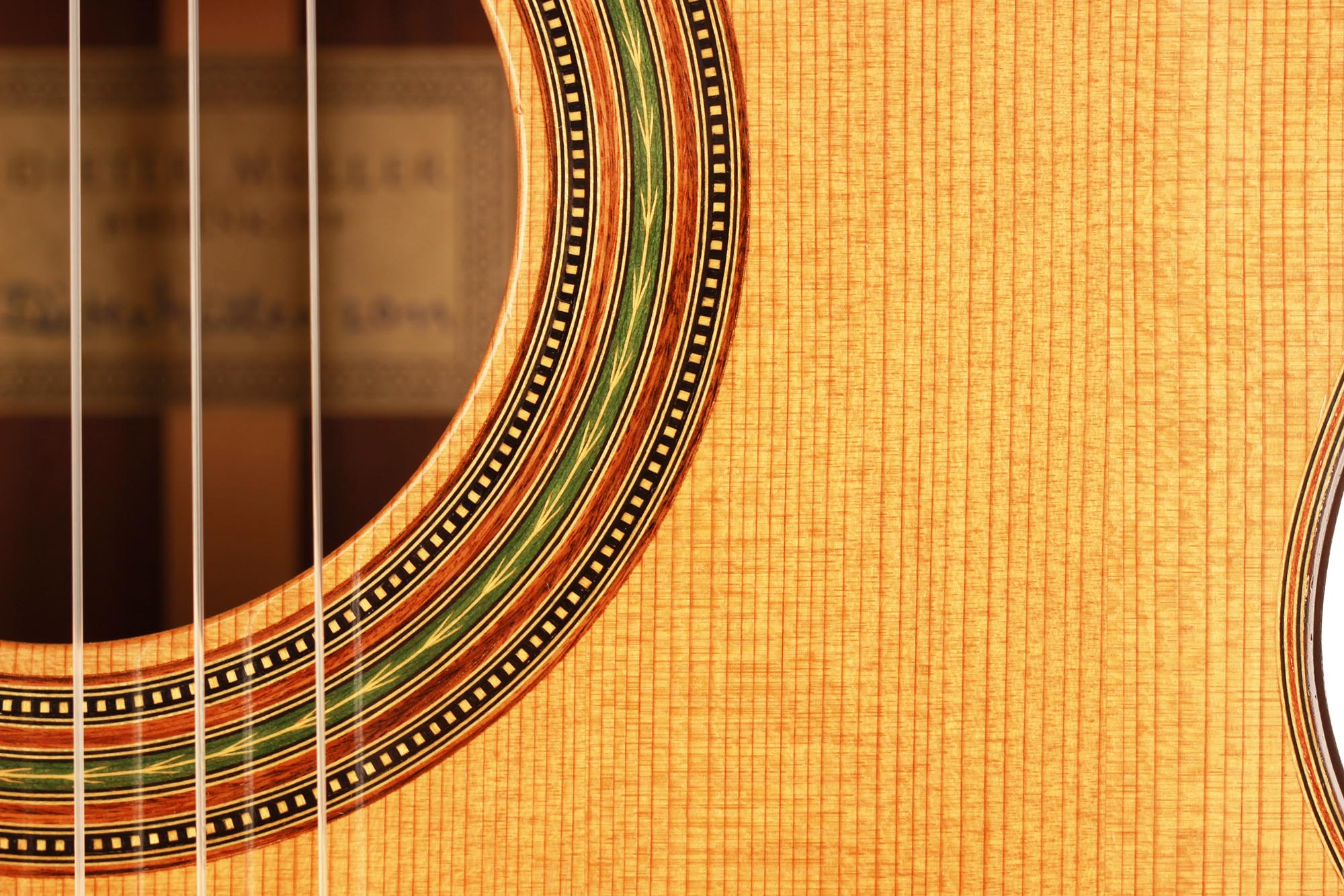 This guitar is a double top with a seven-strut fan bracing built in 2011. It is in astonishing good condition, almost as good as new. The rosette is inspired by Torres and the instrument is particularly decorated. It is the lightest guitar built by D. Müller that we have ever had. It weighs only a little more than a kilogram, which is comparable to a guitar made by Enrique Garcia. This lightness gives it a fantastic reactivity. In addition, this guitar is well balanced, powerful, and remarkably dynamic.