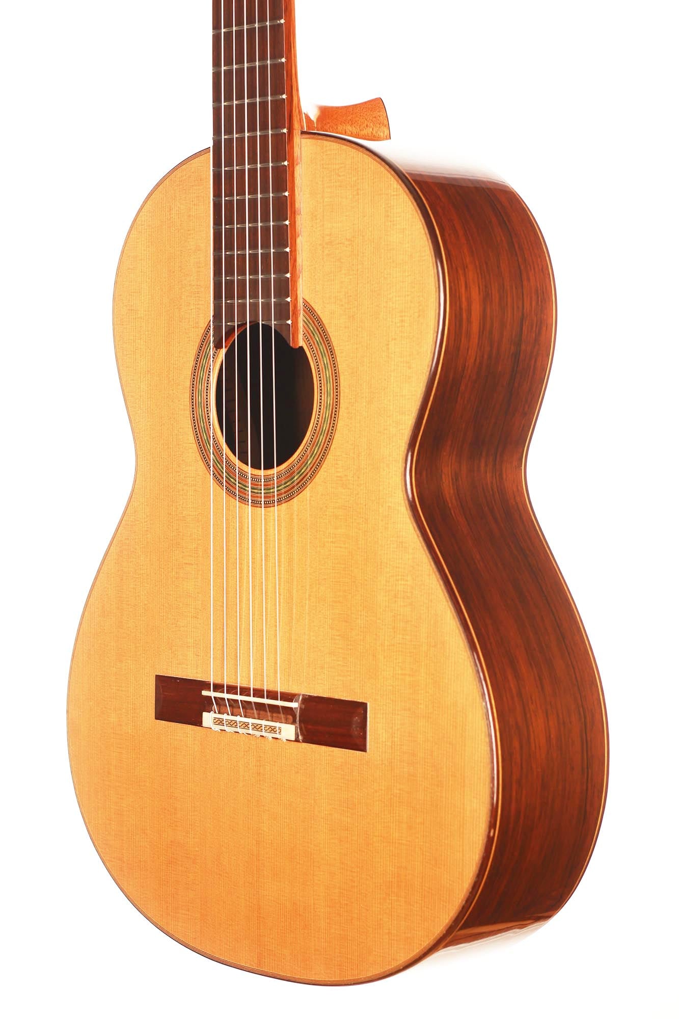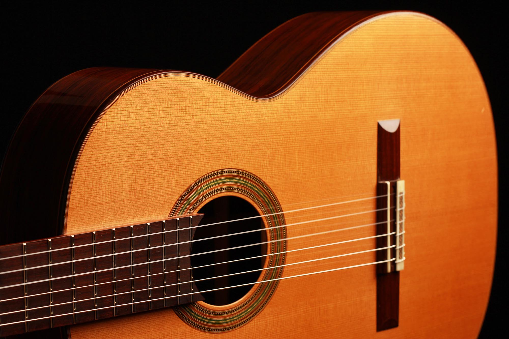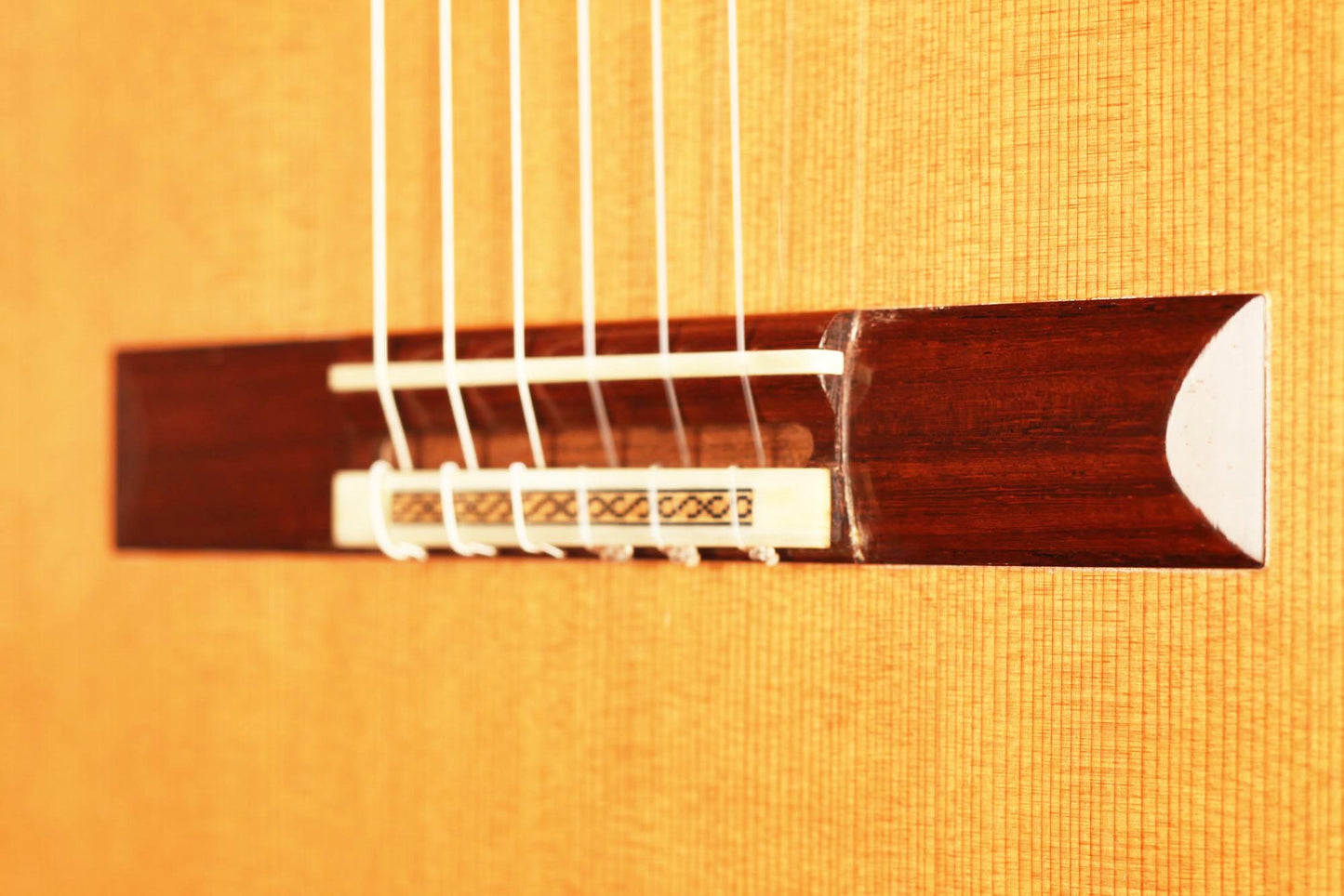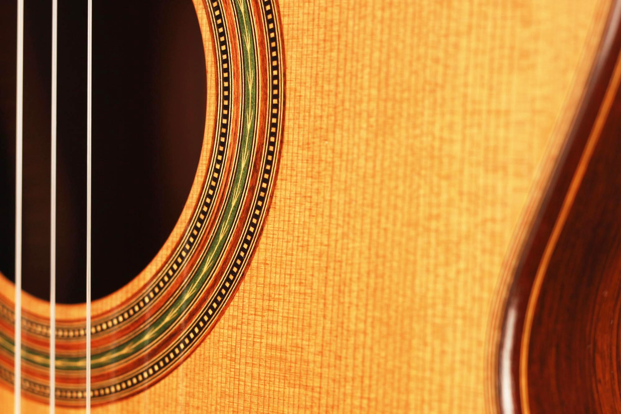 This guitar is a double top with a seven-strut fan bracing built in 2011. It is in astonishing good condition, almost as good as new. The rosette is inspired by Torres and the instrument is particularly decorated. It is the lightest guitar built by D. Müller that we have ever had. It weighs only a little more than a kilogram, which is comparable to a guitar made by Enrique Garcia. This lightness gives it a fantastic reactivity. In addition, this guitar is well balanced, powerful, and remarkably dynamic.