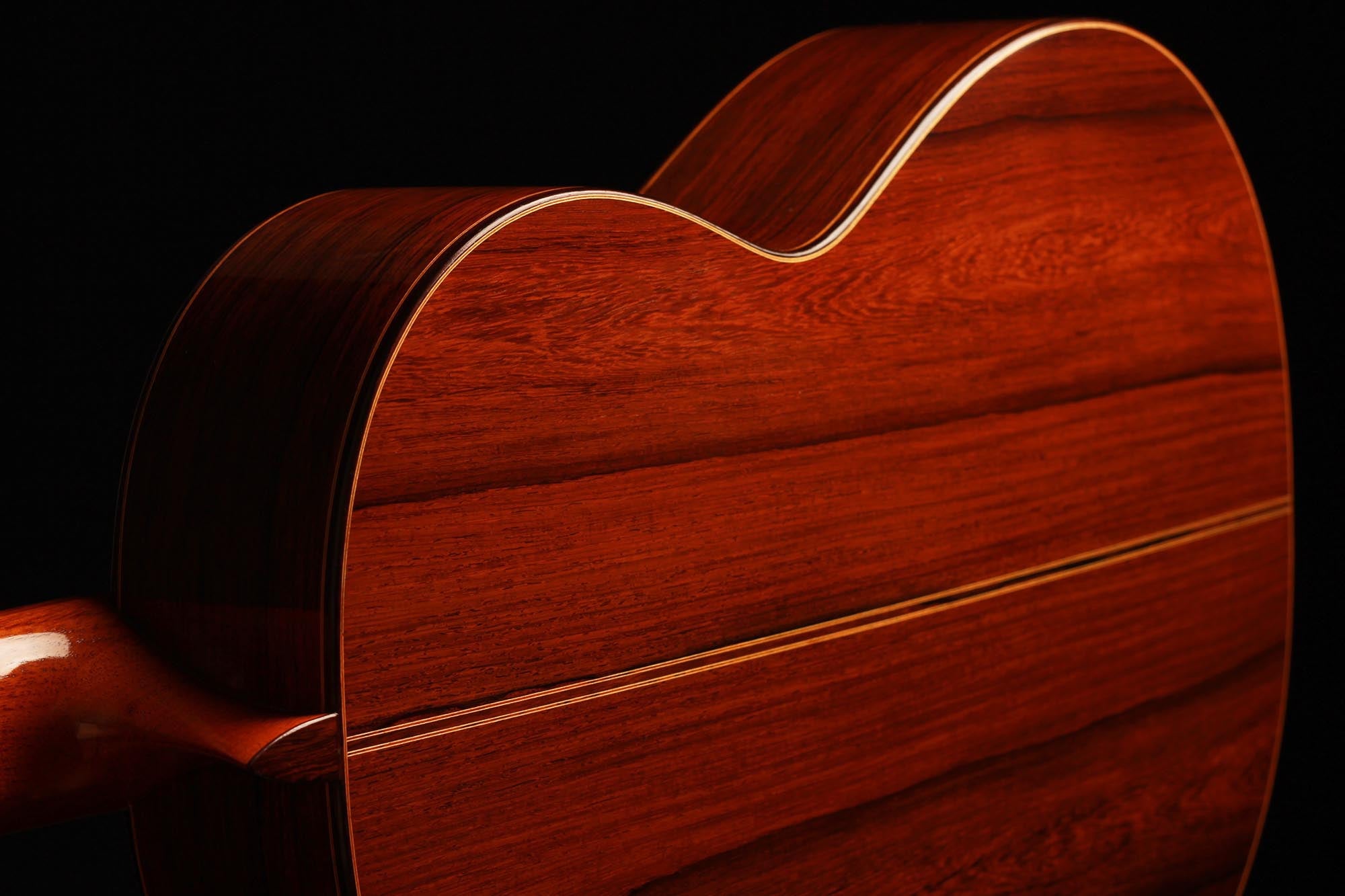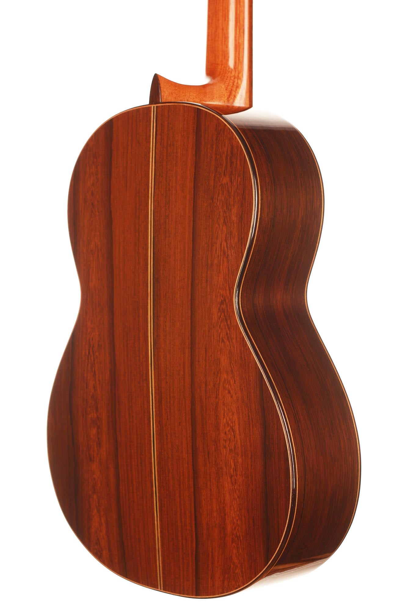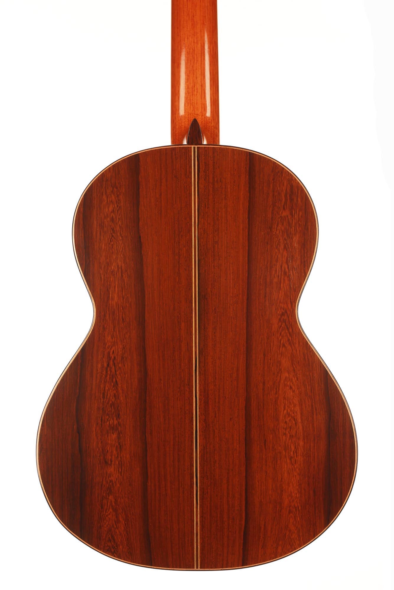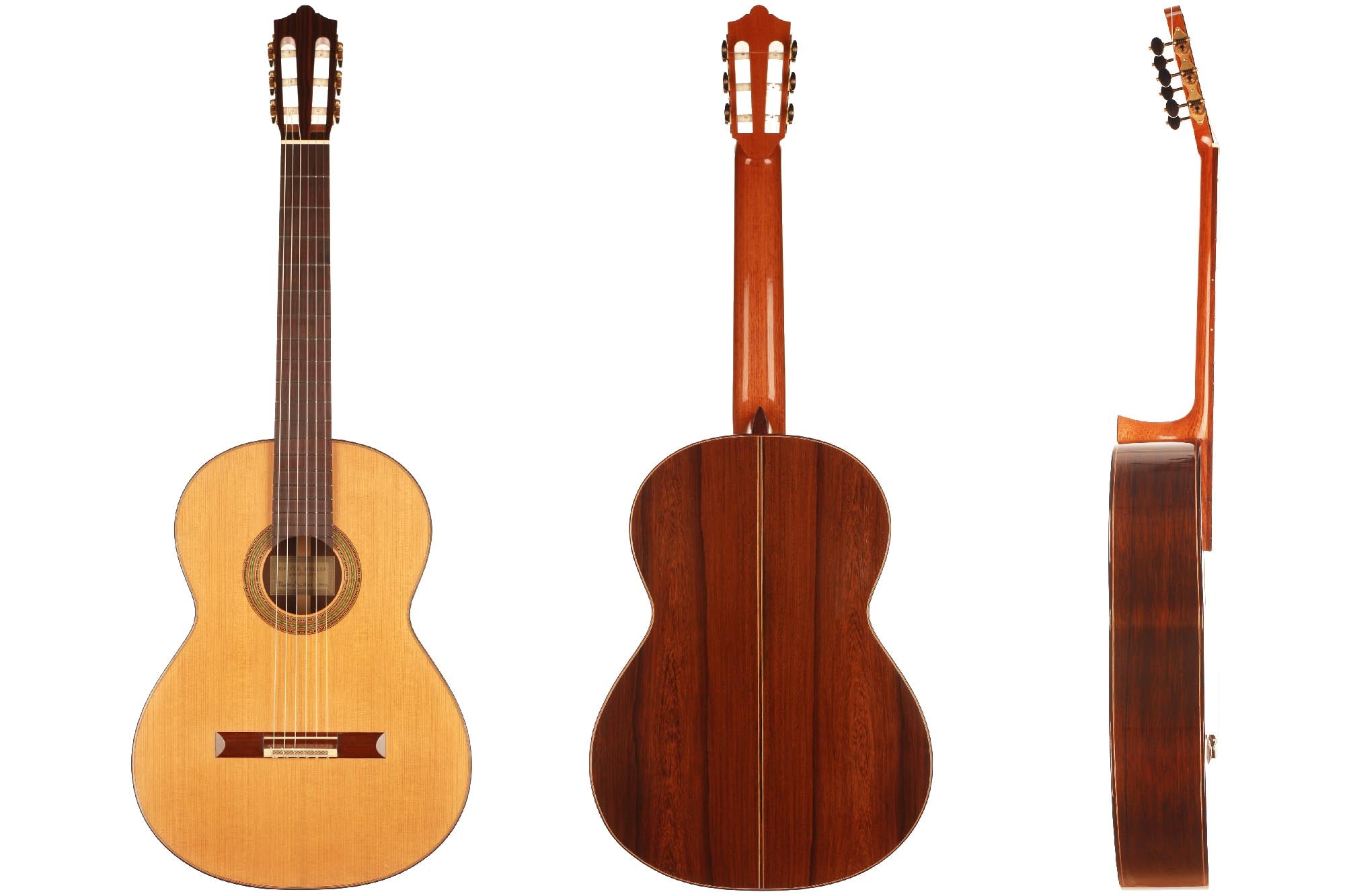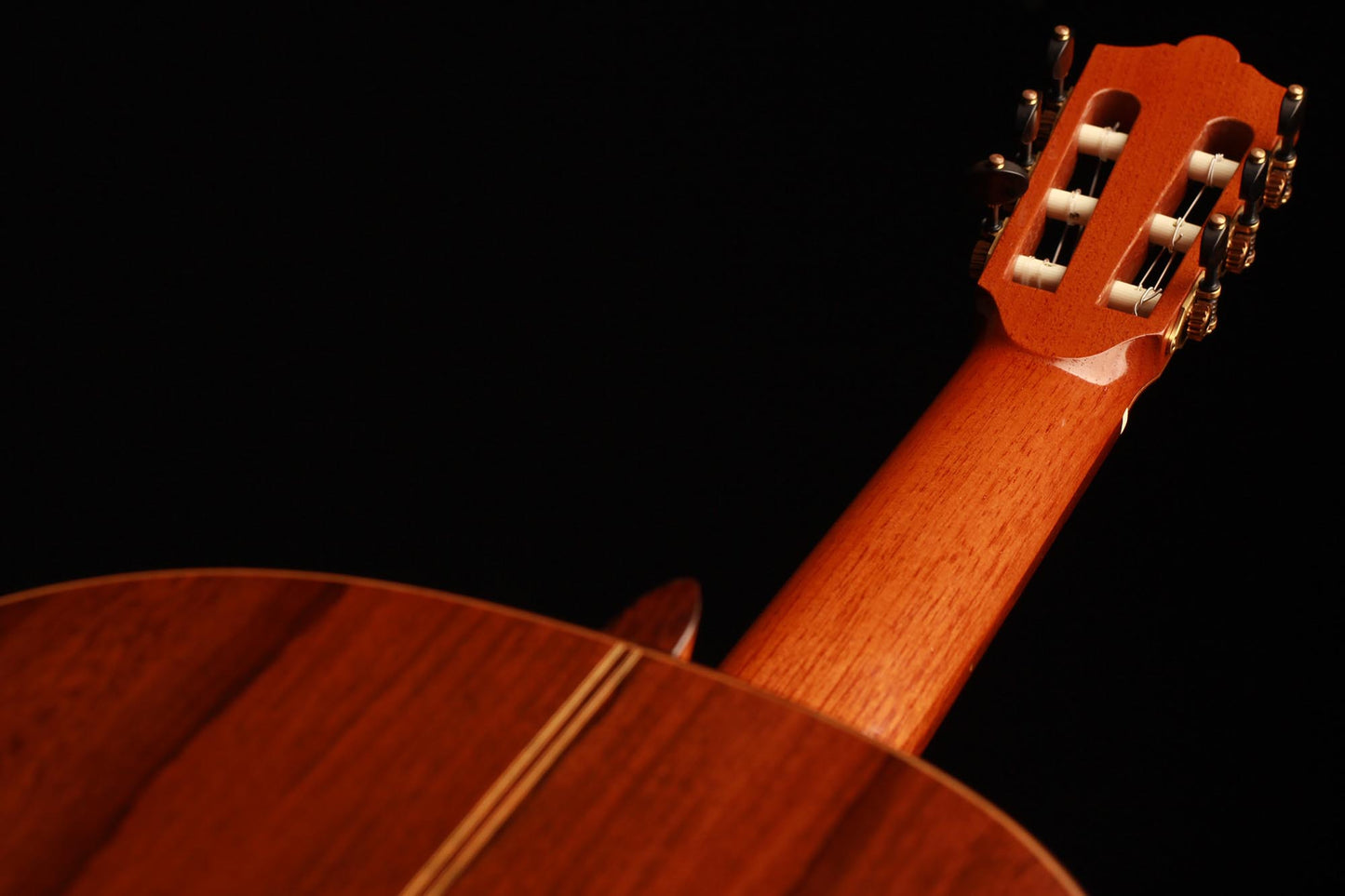 This guitar is a double top with a seven-strut fan bracing built in 2011. It is in astonishing good condition, almost as good as new. The rosette is inspired by Torres and the instrument is particularly decorated. It is the lightest guitar built by D. Müller that we have ever had. It weighs only a little more than a kilogram, which is comparable to a guitar made by Enrique Garcia. This lightness gives it a fantastic reactivity. In addition, this guitar is well balanced, powerful, and remarkably dynamic.