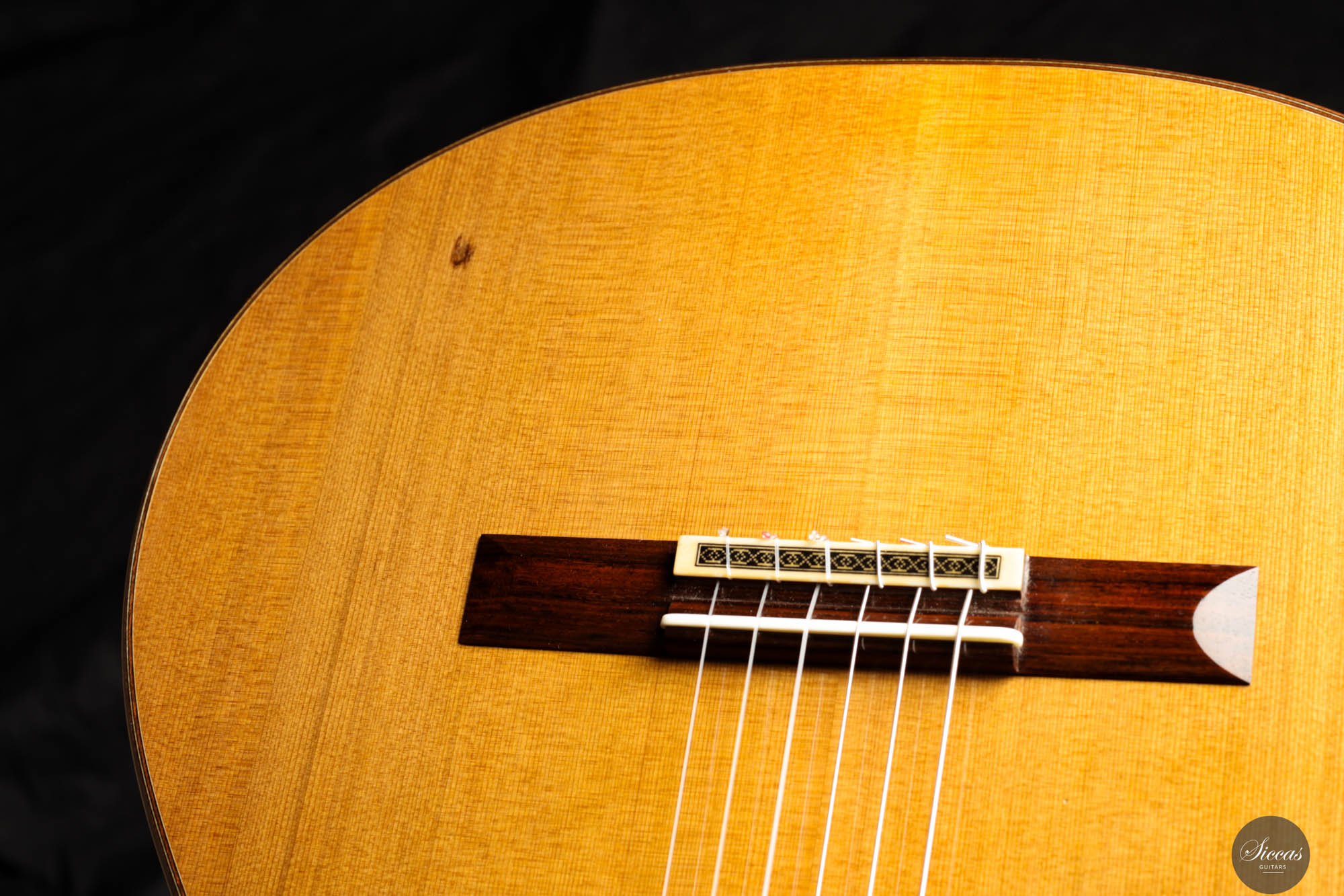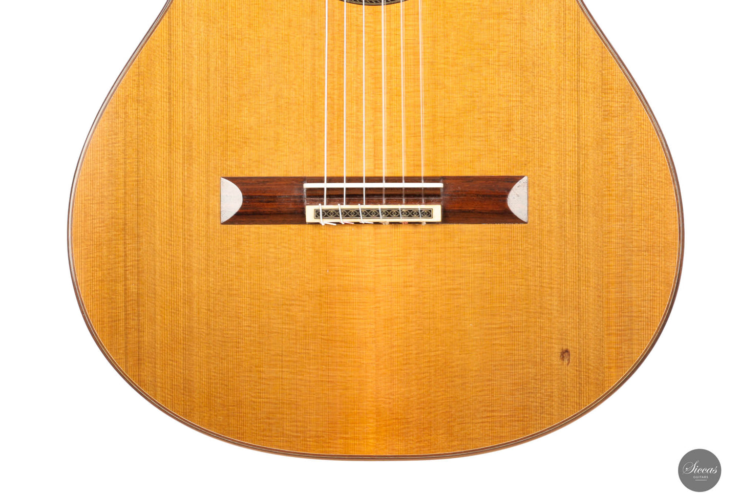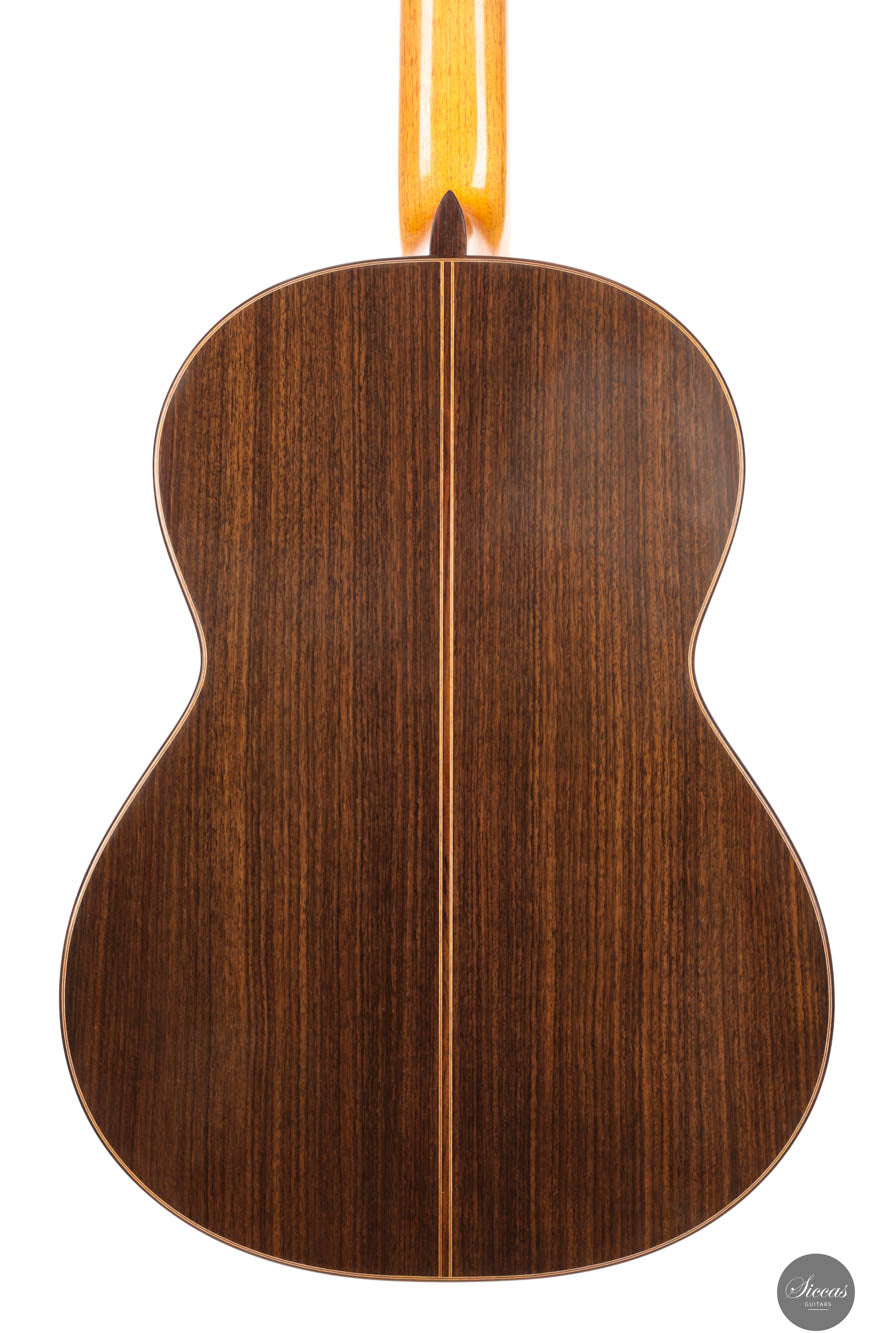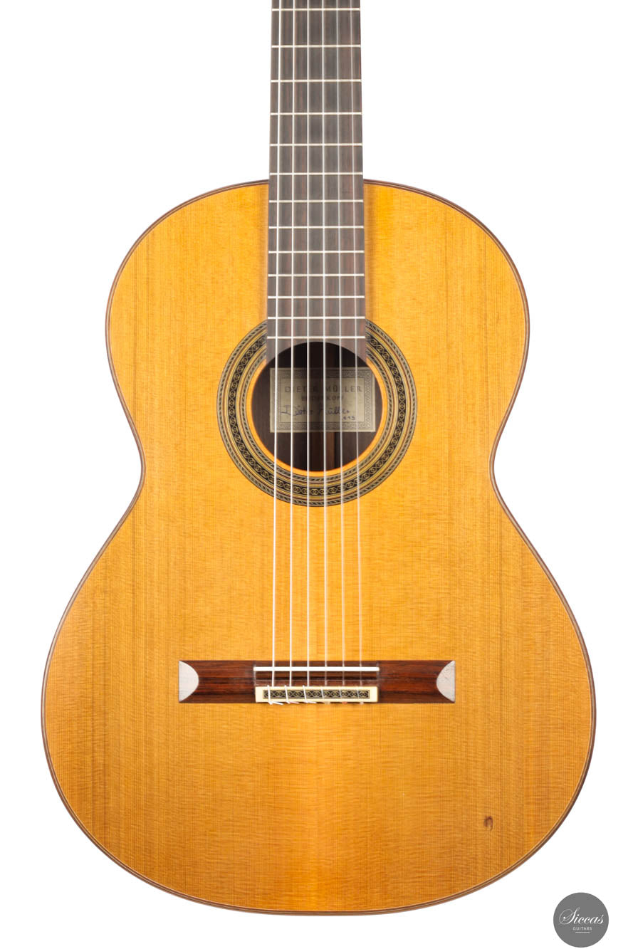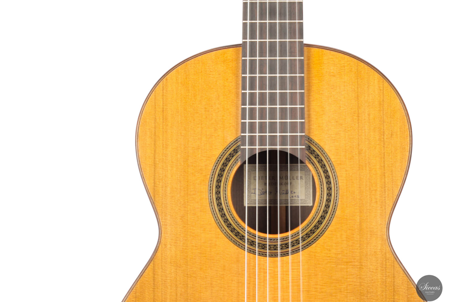 Built in 2015, this double-top guitar by Dieter Müller still makes a powerful impression. Despite being from an earlier period in his work, it holds its own with outstanding tone separation, warm sustain, and a beautifully developed voice. It may be slightly less sensitive than Müller’s most recent creations, but it delivers a refined sound with great ease and projection. The lightweight construction, with no doubled back or sides, makes it extremely comfortable to play, while the elevated fingerboard further enhances the ease of access to the upper register. The shellac finish is neatly applied and visually appealing, underscoring the high level of craftsmanship that defines Müller’s instruments.