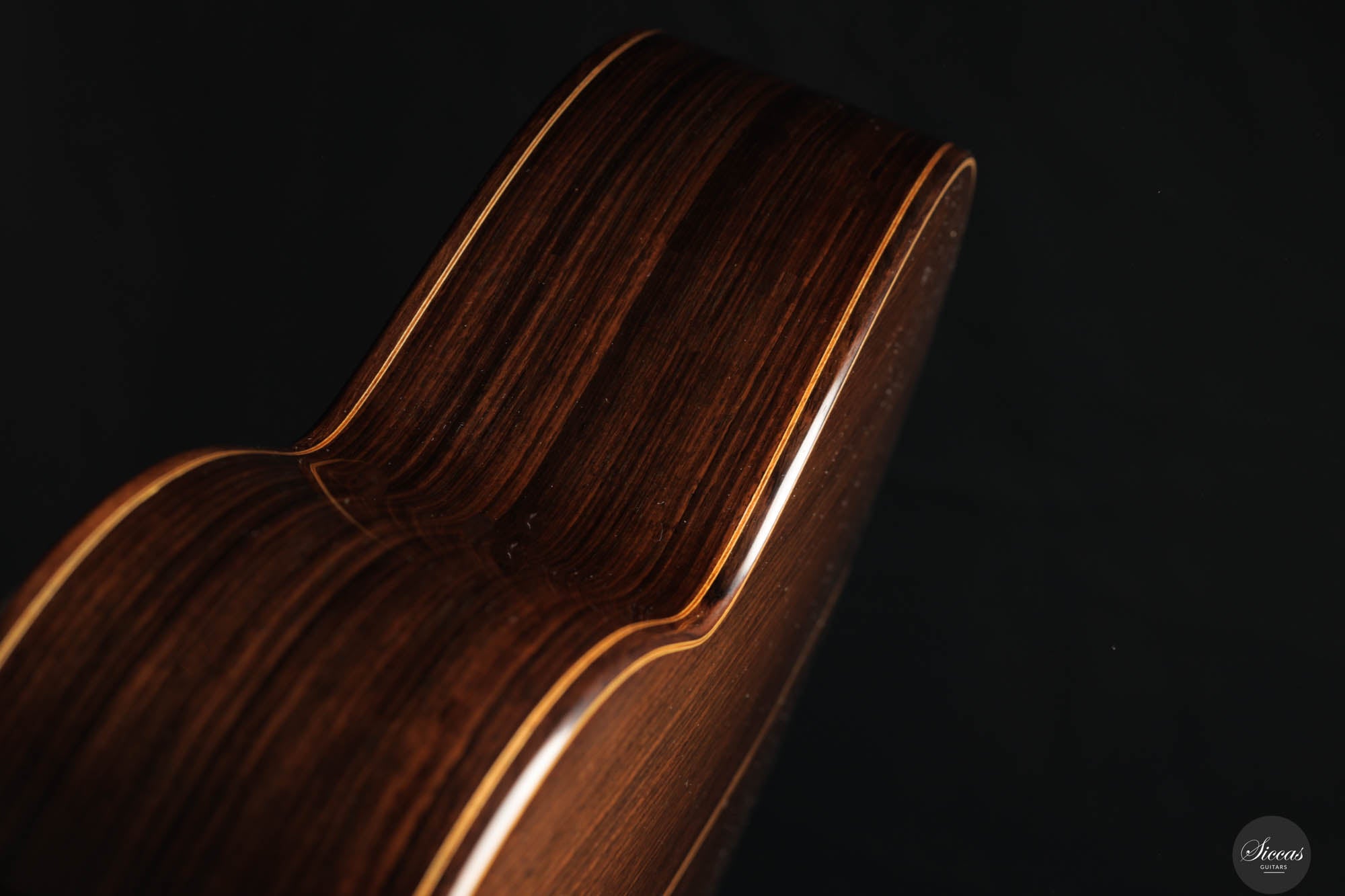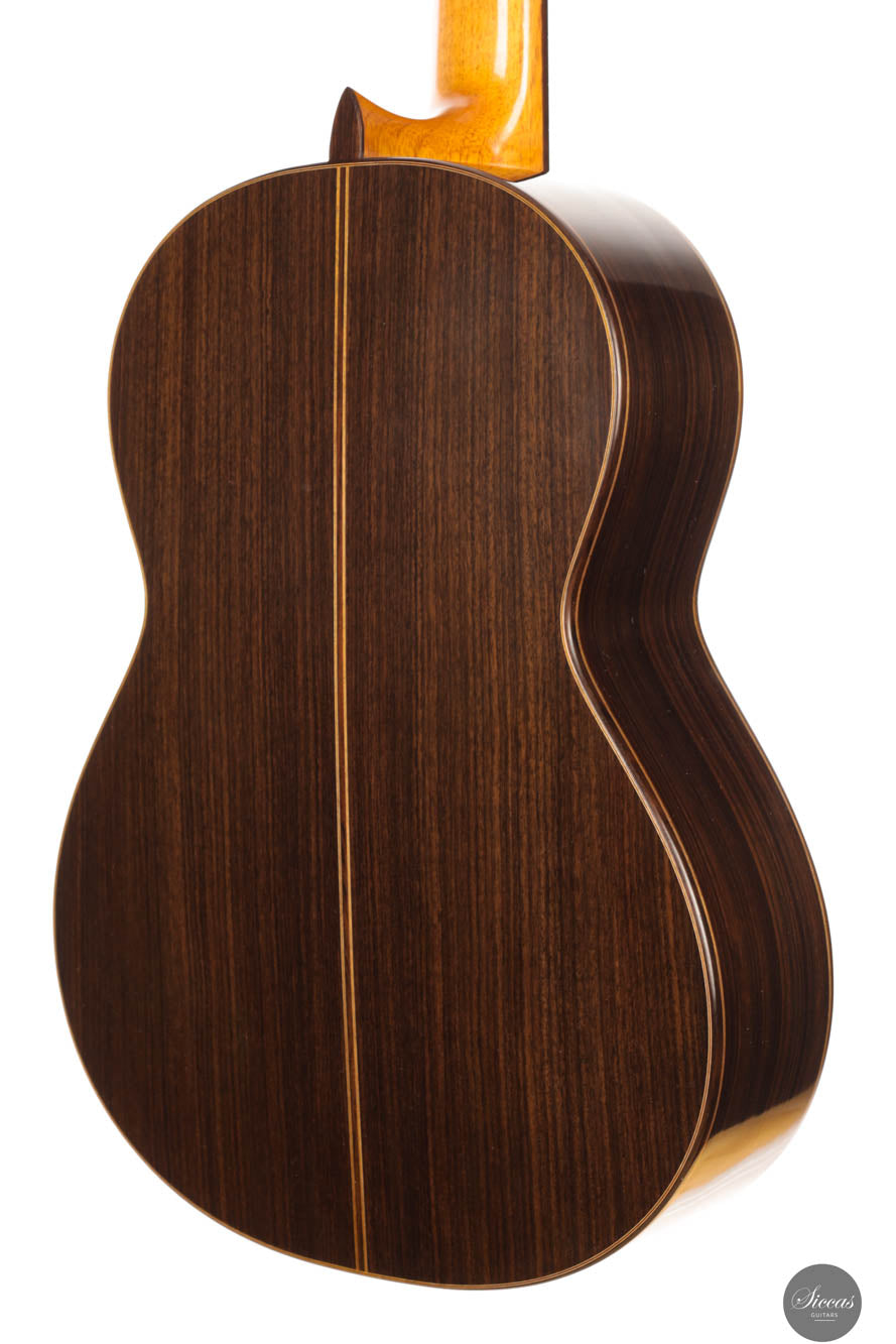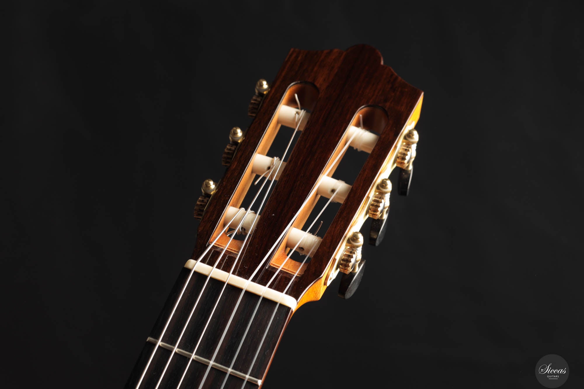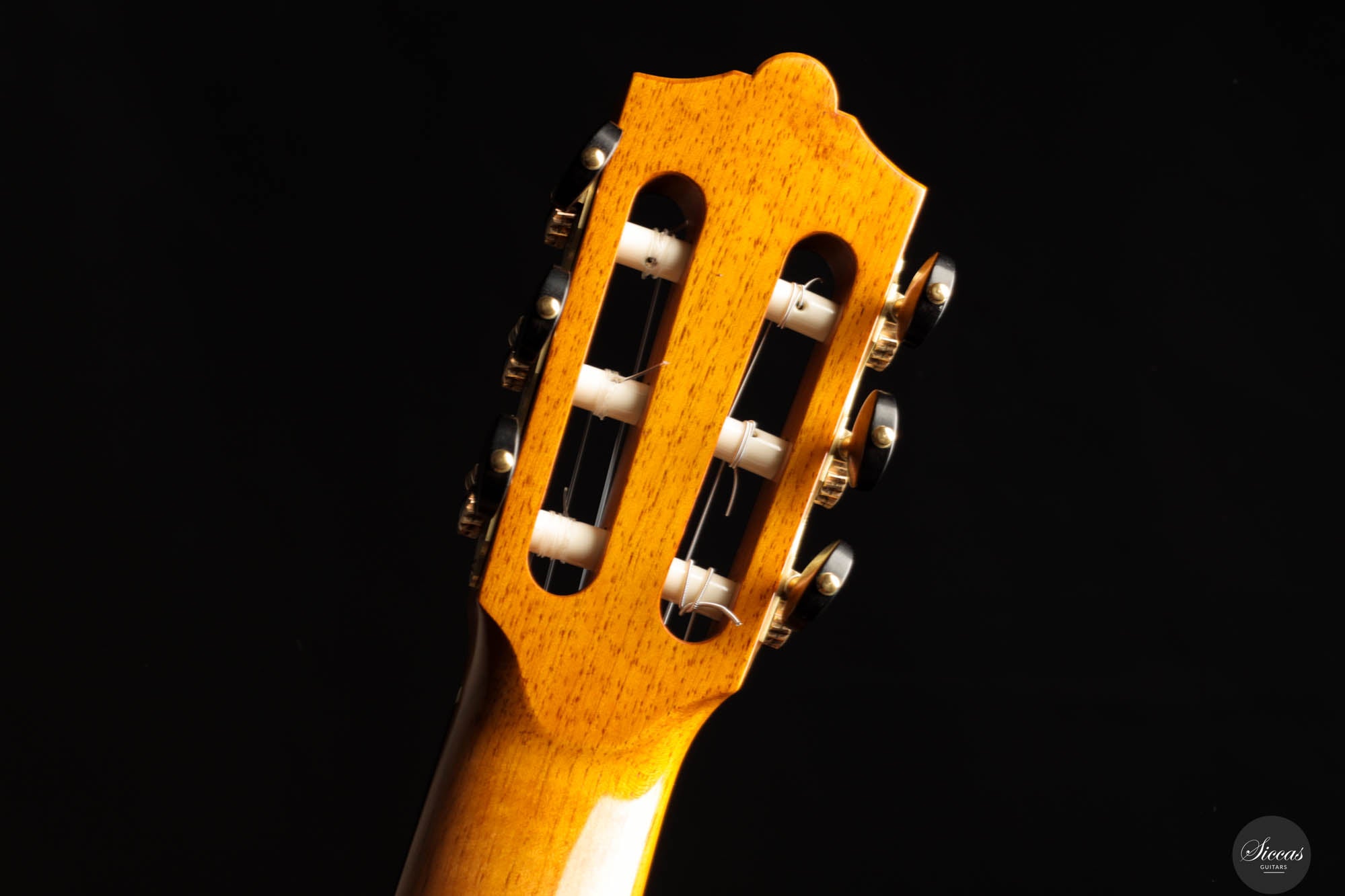 Built in 2015, this double-top guitar by Dieter Müller still makes a powerful impression. Despite being from an earlier period in his work, it holds its own with outstanding tone separation, warm sustain, and a beautifully developed voice. It may be slightly less sensitive than Müller’s most recent creations, but it delivers a refined sound with great ease and projection. The lightweight construction, with no doubled back or sides, makes it extremely comfortable to play, while the elevated fingerboard further enhances the ease of access to the upper register. The shellac finish is neatly applied and visually appealing, underscoring the high level of craftsmanship that defines Müller’s instruments.