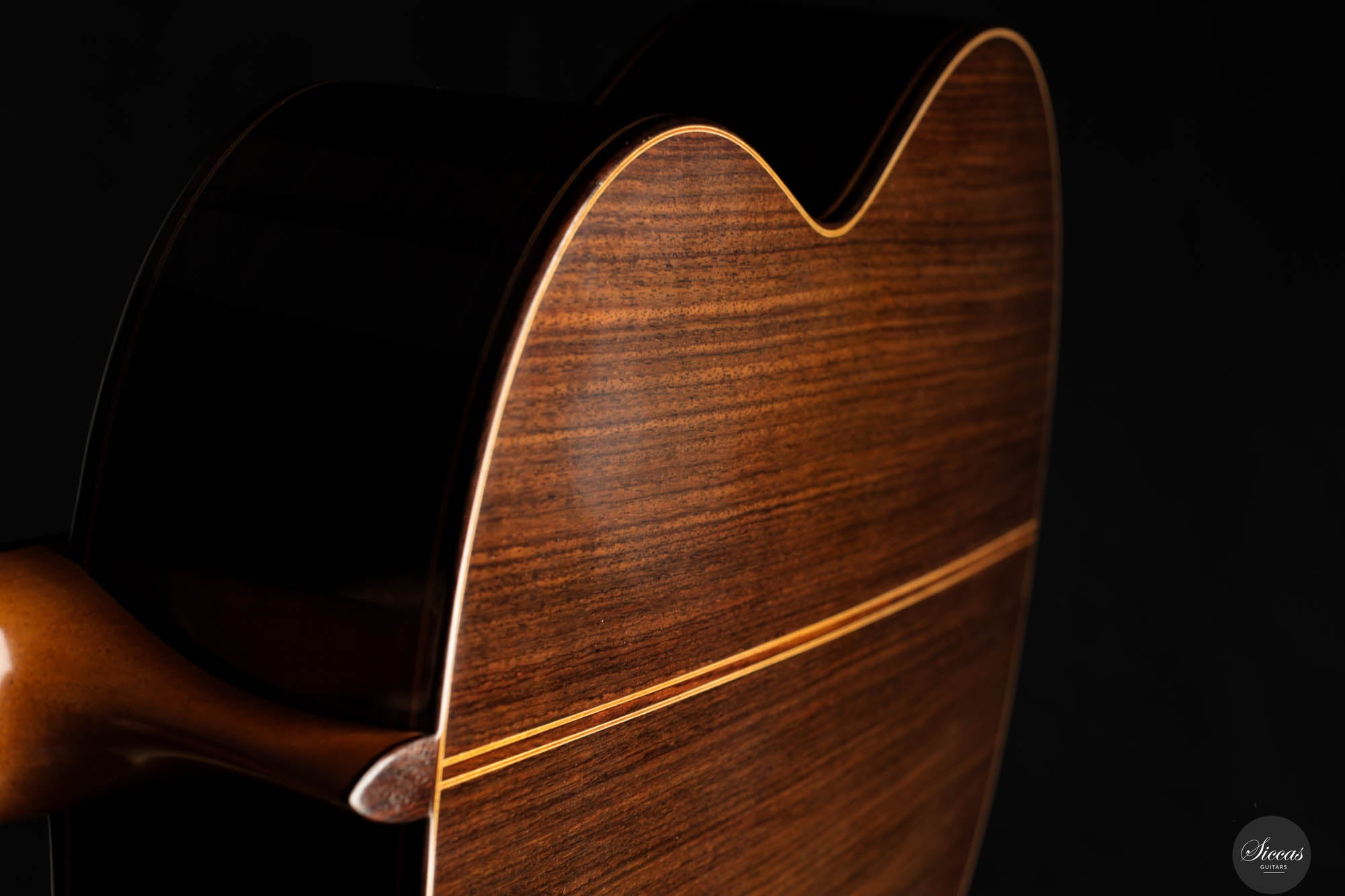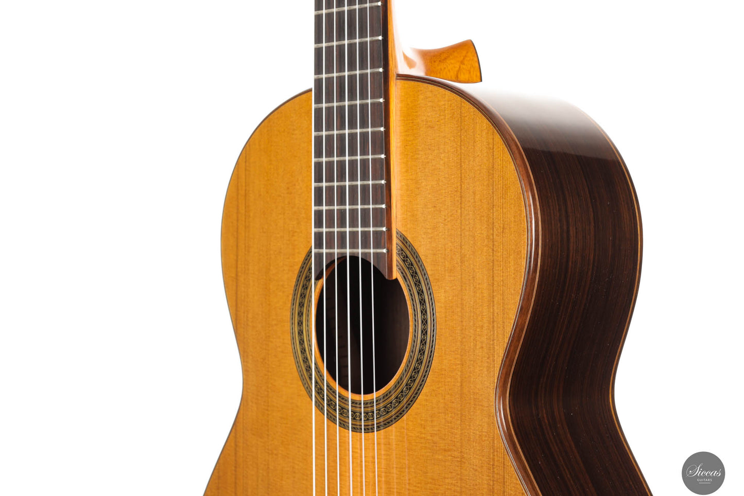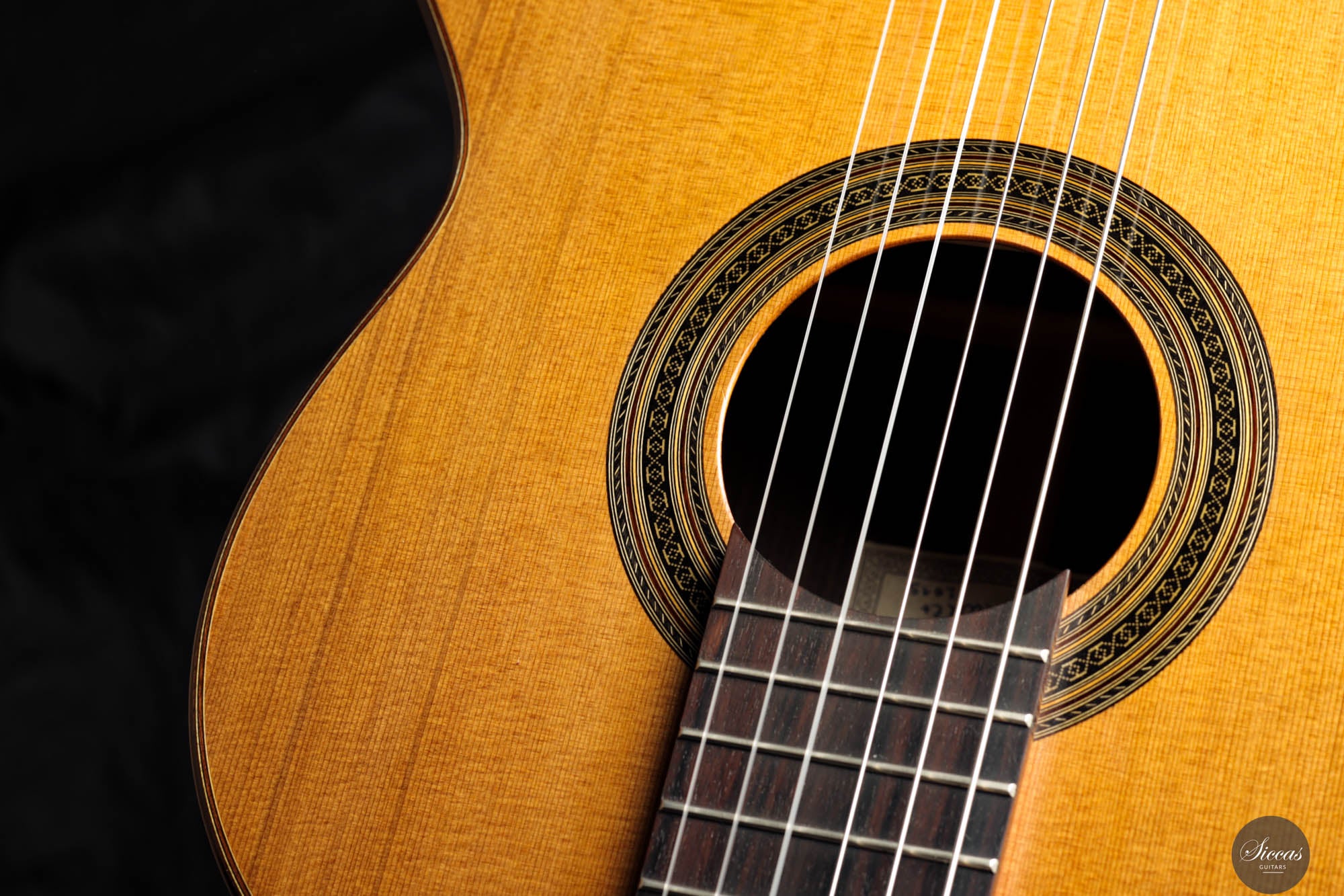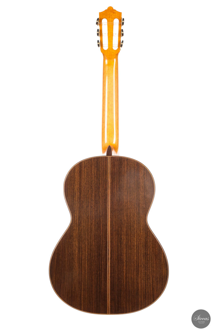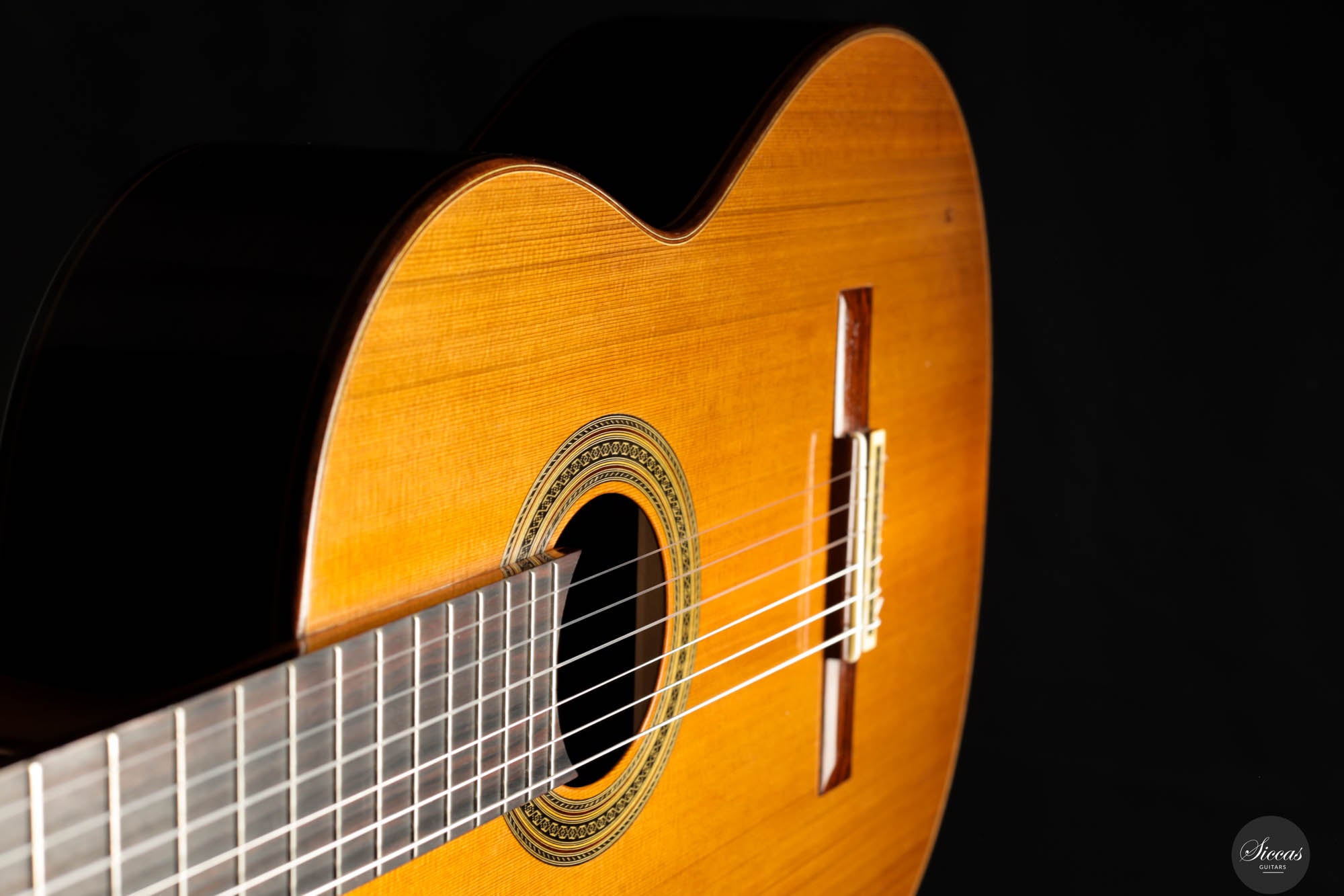 Built in 2015, this double-top guitar by Dieter Müller still makes a powerful impression. Despite being from an earlier period in his work, it holds its own with outstanding tone separation, warm sustain, and a beautifully developed voice. It may be slightly less sensitive than Müller’s most recent creations, but it delivers a refined sound with great ease and projection. The lightweight construction, with no doubled back or sides, makes it extremely comfortable to play, while the elevated fingerboard further enhances the ease of access to the upper register. The shellac finish is neatly applied and visually appealing, underscoring the high level of craftsmanship that defines Müller’s instruments.