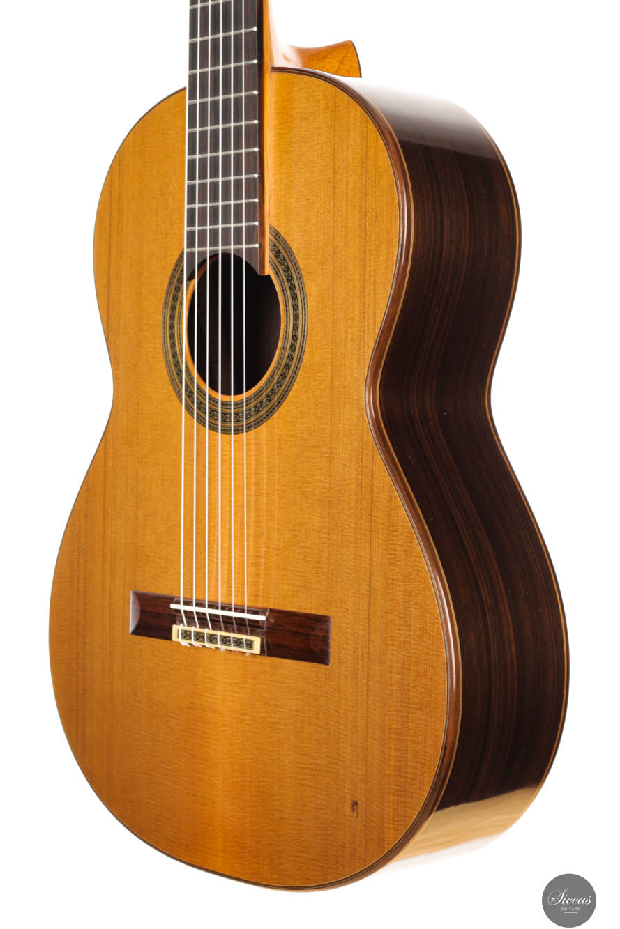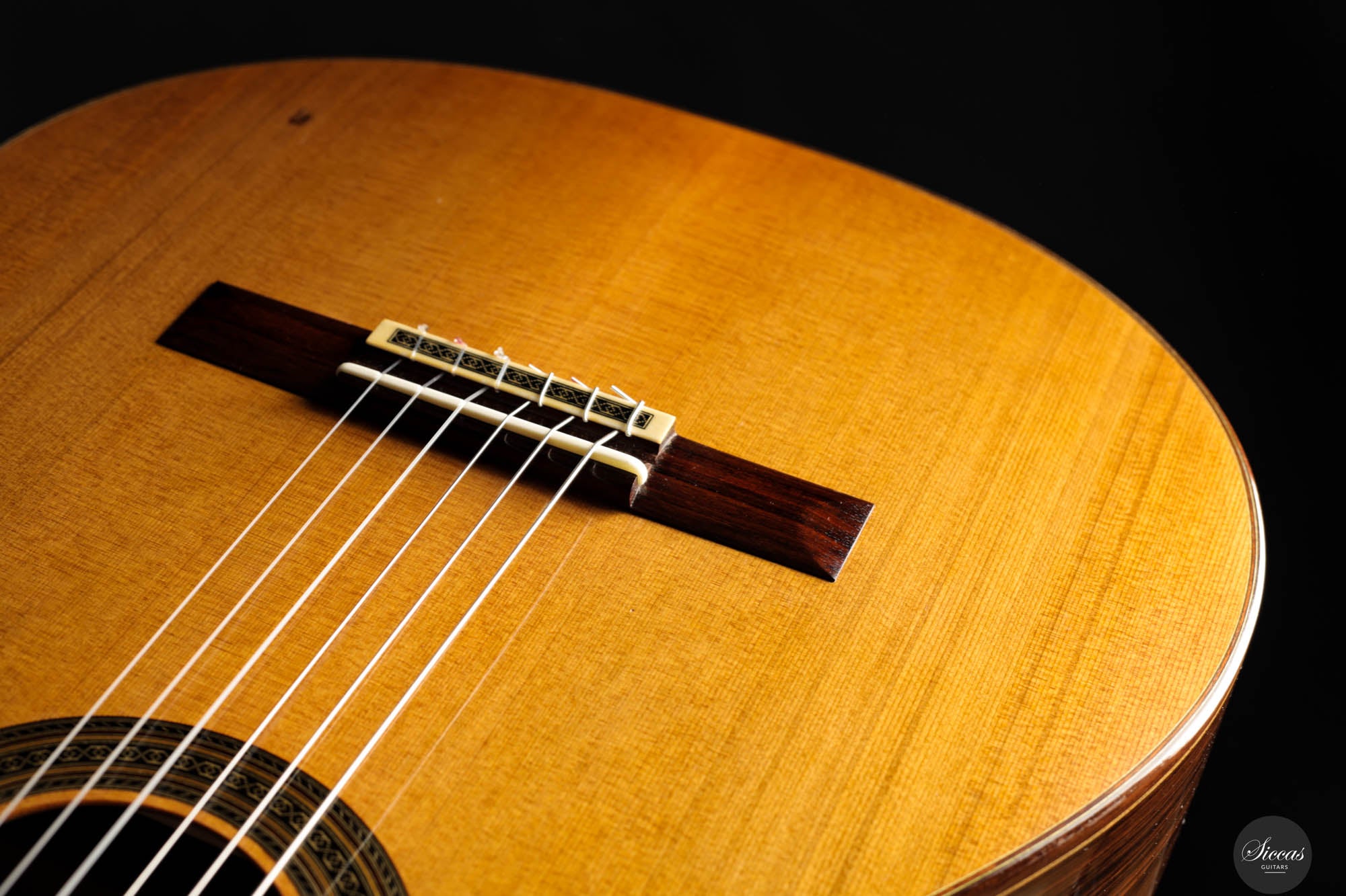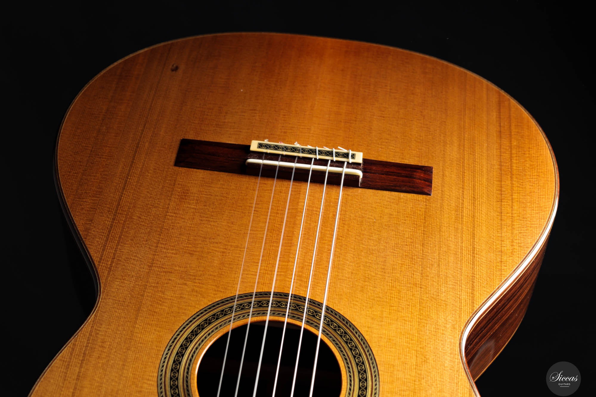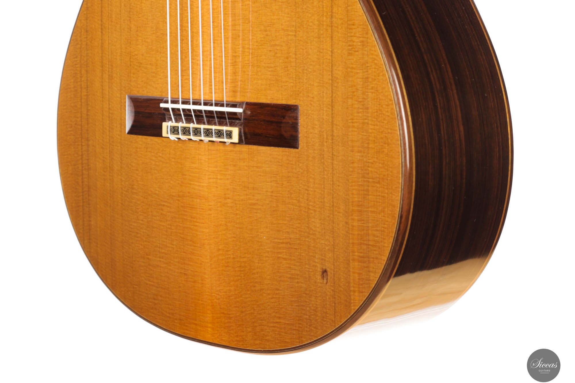 Built in 2015, this double-top guitar by Dieter Müller still makes a powerful impression. Despite being from an earlier period in his work, it holds its own with outstanding tone separation, warm sustain, and a beautifully developed voice. It may be slightly less sensitive than Müller’s most recent creations, but it delivers a refined sound with great ease and projection. The lightweight construction, with no doubled back or sides, makes it extremely comfortable to play, while the elevated fingerboard further enhances the ease of access to the upper register. The shellac finish is neatly applied and visually appealing, underscoring the high level of craftsmanship that defines Müller’s instruments.