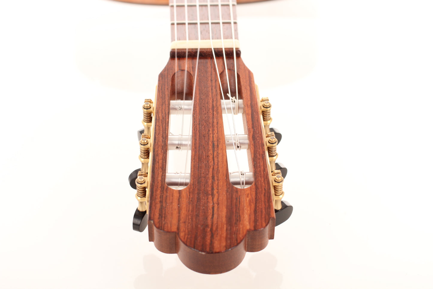 Dieter Müller built this double top guitar in 2011. The top is made of cedar/Nomex, back and sides are made of Palo Escrito. The guitar has slight traces of use. The tuners are made by Gotoh. The guitar has a French polish finish. A hardshell case is included.