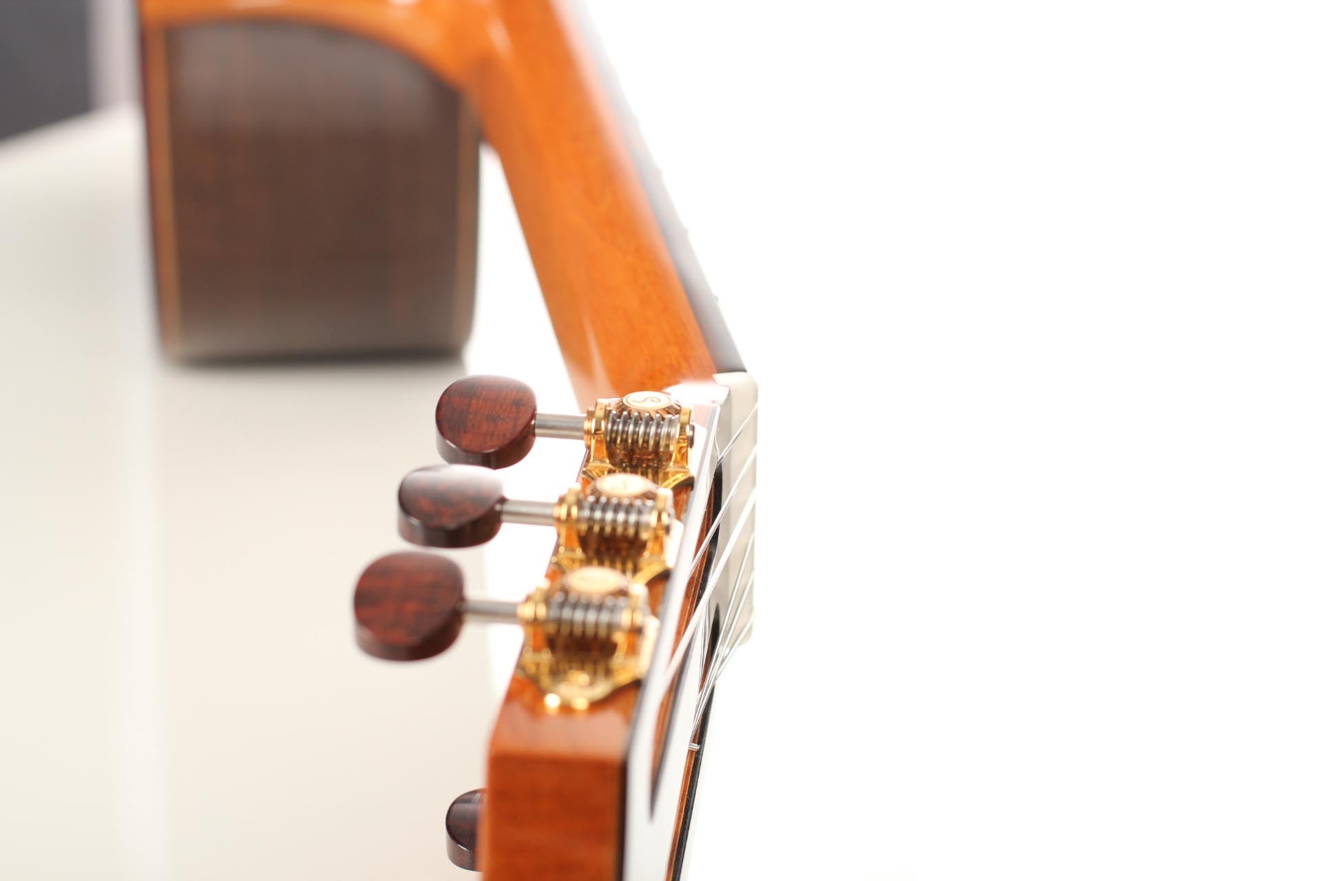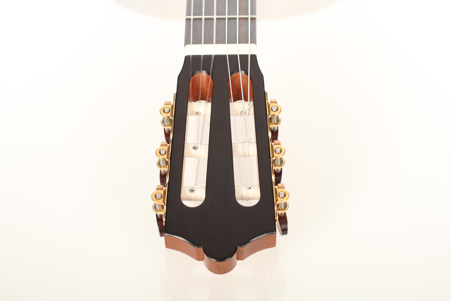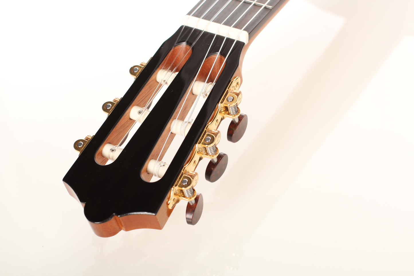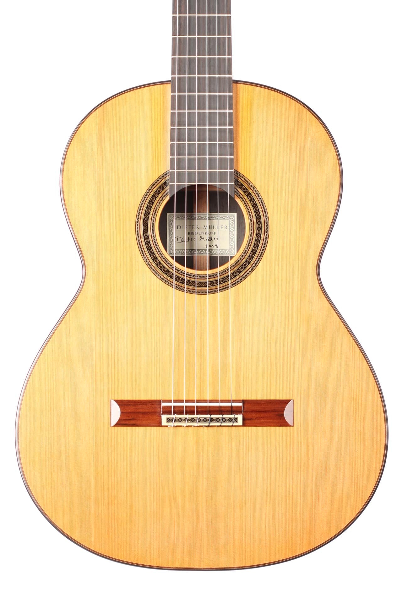 Dieter Müller ist ein sehr angesehener deutscher Gitarrenbauer, der sich auf Doubletop-Gitarren spezialisiert hat. Seit Matthias Dammann sind deutsche Gitarrenbauer Spezialisten im Bereich der Doubletop-Gitarren. Die Instrumente von Dieter Müller sind besonders wegen ihrer Klangqualität, der vielfältigen Klangfarben und des großen Volumens gefragt. Diese Gitarre entspricht einer Handwerkskunst auf höchstem Niveau. Die feine dunkle Rosette betont die Honigfarbe der hellen Zederndecke. Der Boden und die Zargen sind aus dunklem, australischem Blackwood und stehen im Kontrast mit der Decke, um eine ästhetisch perfekt ausbalancierte Gitarre zu erhalten. Diese Gitarre hat einen sehr starken Charakter, ist unglaublich angenehm zu spielen und hat eine sehr persönliche Klangfarbe. Es ist insgesamt eines der besten Doubletop-Instrumente unserer Zeit. Diese Gitarre ist CITES-frei (CF).