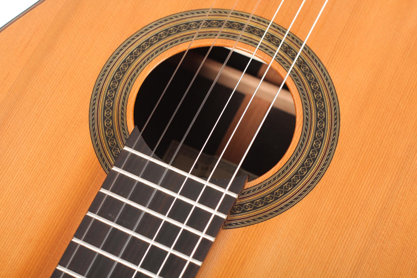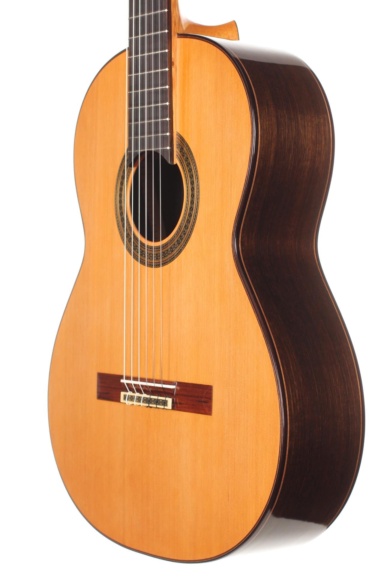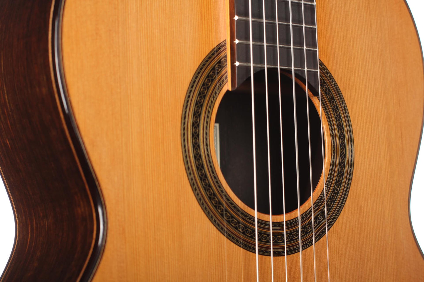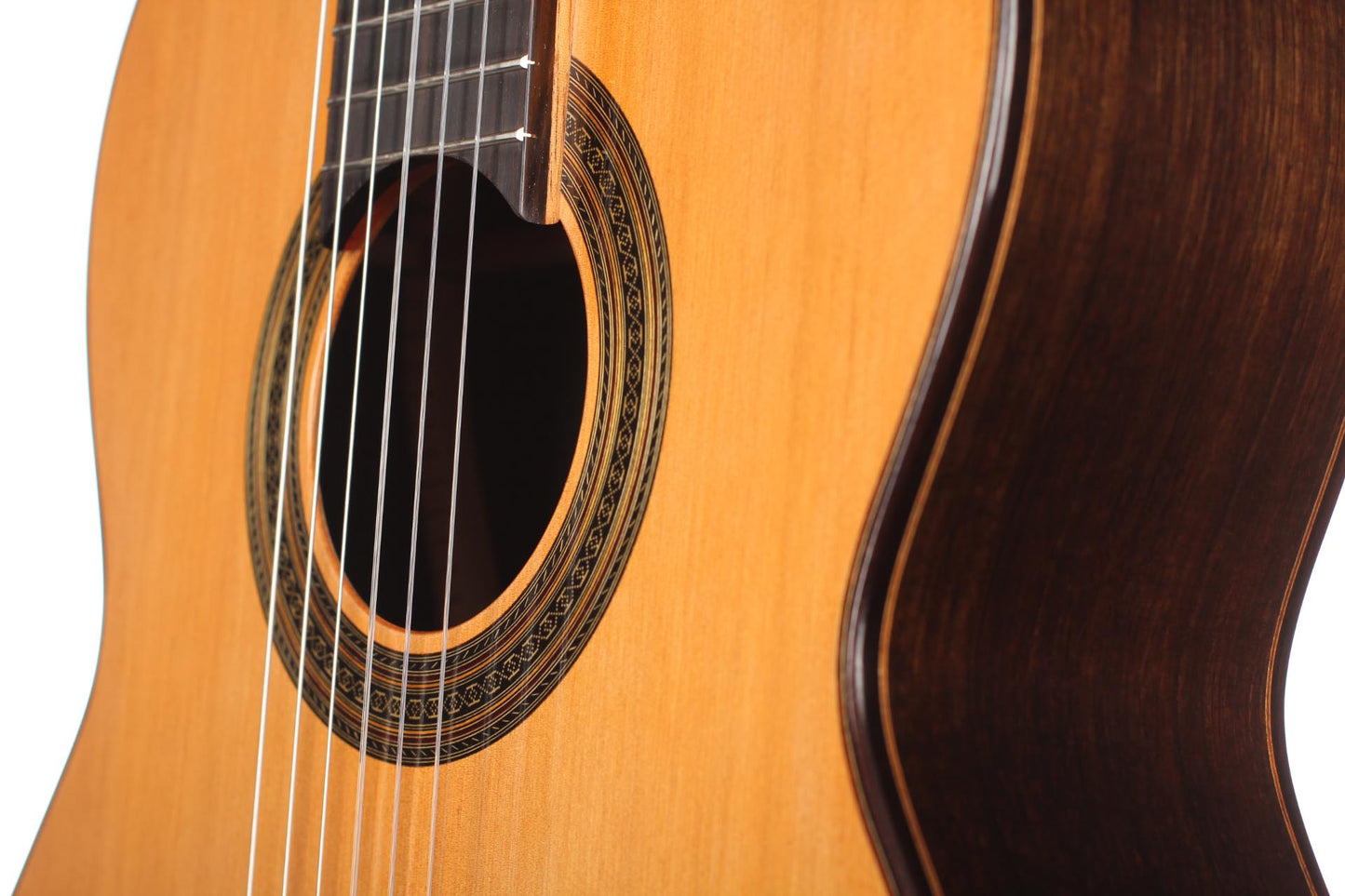 Dieter Müller ist ein sehr angesehener deutscher Gitarrenbauer, der sich auf Doubletop-Gitarren spezialisiert hat. Seit Matthias Dammann sind deutsche Gitarrenbauer Spezialisten im Bereich der Doubletop-Gitarren. Die Instrumente von Dieter Müller sind besonders wegen ihrer Klangqualität, der vielfältigen Klangfarben und des großen Volumens gefragt. Diese Gitarre entspricht einer Handwerkskunst auf höchstem Niveau. Die feine dunkle Rosette betont die Honigfarbe der hellen Zederndecke. Der Boden und die Zargen sind aus dunklem, australischem Blackwood und stehen im Kontrast mit der Decke, um eine ästhetisch perfekt ausbalancierte Gitarre zu erhalten. Diese Gitarre hat einen sehr starken Charakter, ist unglaublich angenehm zu spielen und hat eine sehr persönliche Klangfarbe. Es ist insgesamt eines der besten Doubletop-Instrumente unserer Zeit. Diese Gitarre ist CITES-frei (CF).