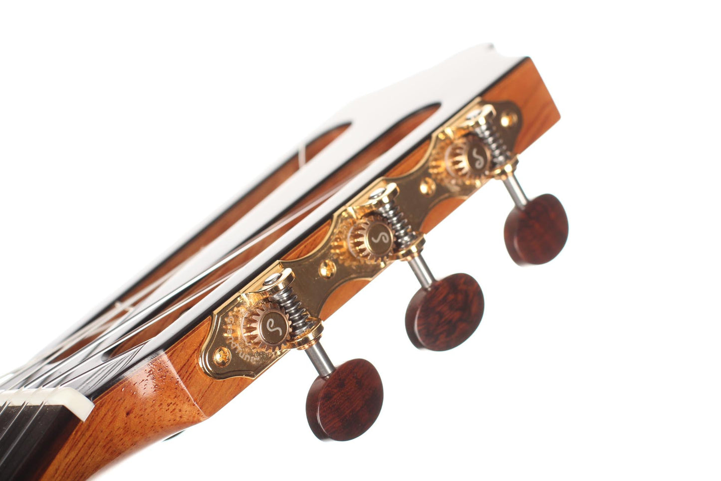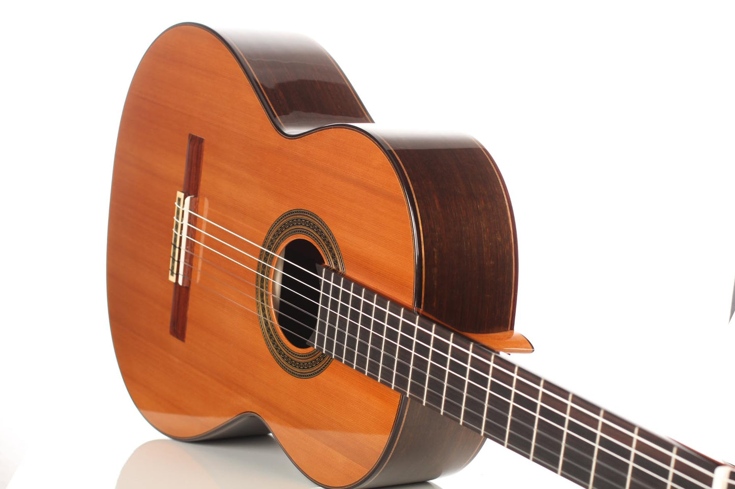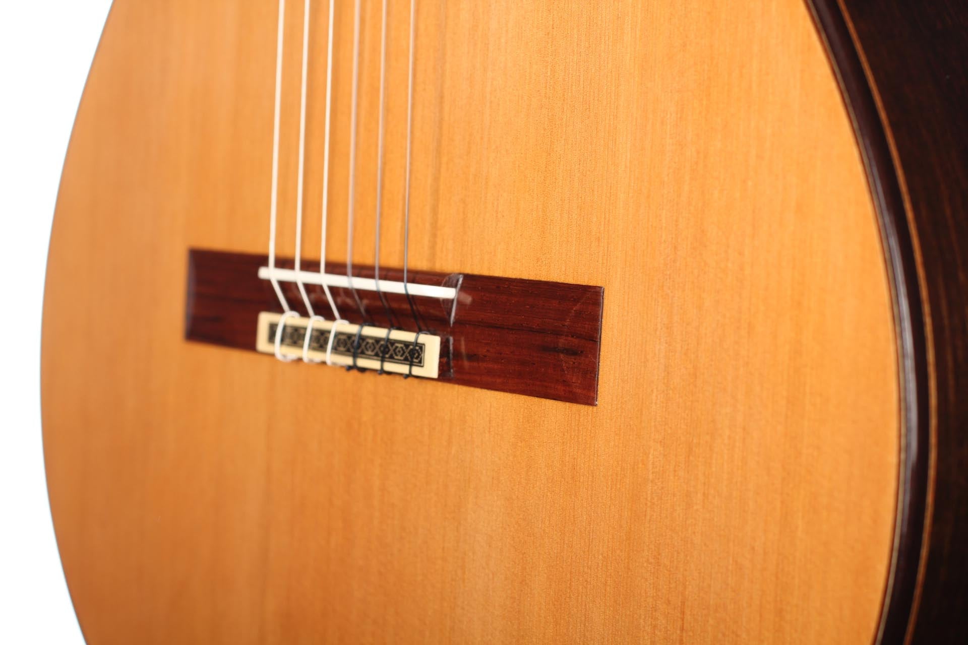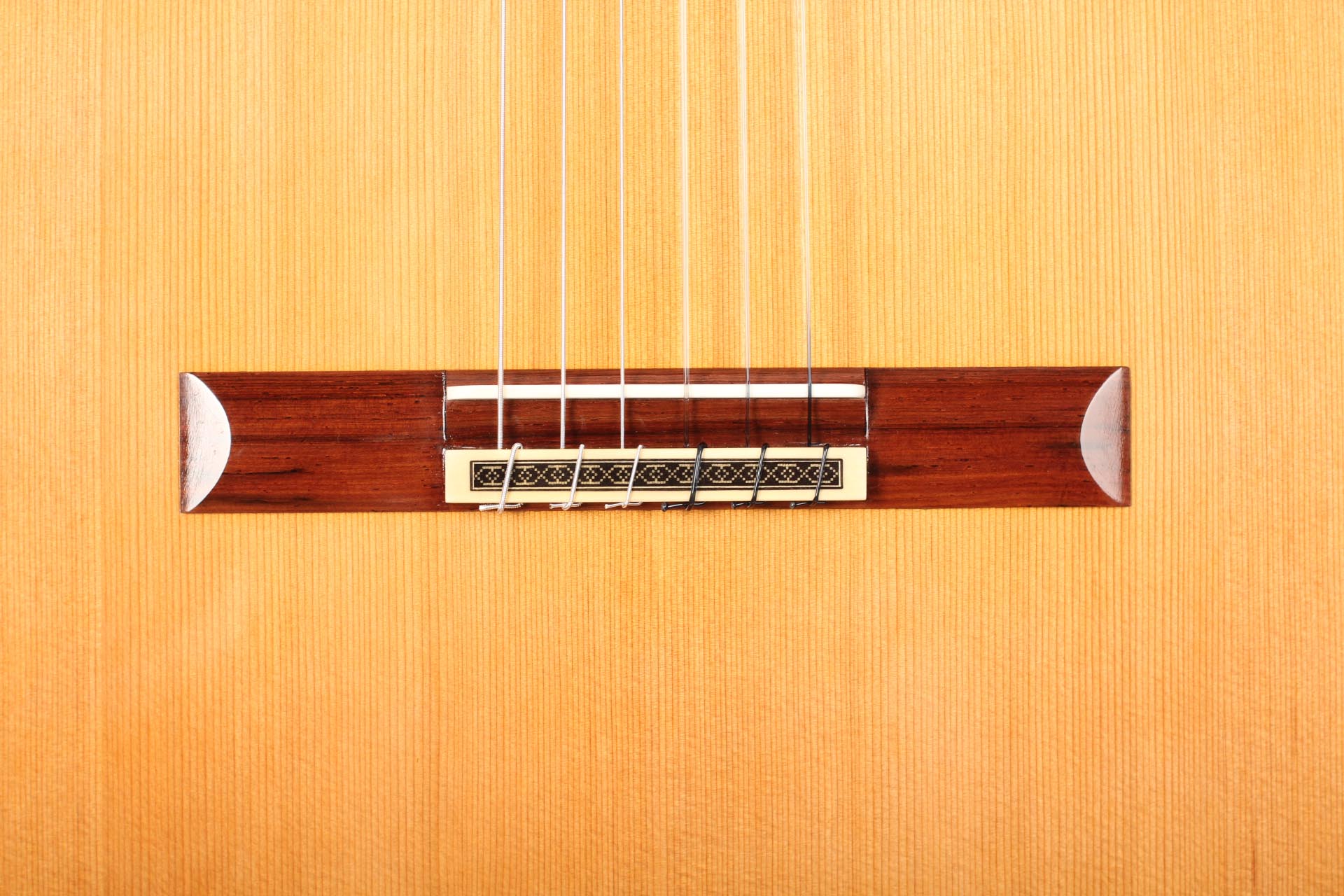 Dieter Müller ist ein sehr angesehener deutscher Gitarrenbauer, der sich auf Doubletop-Gitarren spezialisiert hat. Seit Matthias Dammann sind deutsche Gitarrenbauer Spezialisten im Bereich der Doubletop-Gitarren. Die Instrumente von Dieter Müller sind besonders wegen ihrer Klangqualität, der vielfältigen Klangfarben und des großen Volumens gefragt. Diese Gitarre entspricht einer Handwerkskunst auf höchstem Niveau. Die feine dunkle Rosette betont die Honigfarbe der hellen Zederndecke. Der Boden und die Zargen sind aus dunklem, australischem Blackwood und stehen im Kontrast mit der Decke, um eine ästhetisch perfekt ausbalancierte Gitarre zu erhalten. Diese Gitarre hat einen sehr starken Charakter, ist unglaublich angenehm zu spielen und hat eine sehr persönliche Klangfarbe. Es ist insgesamt eines der besten Doubletop-Instrumente unserer Zeit. Diese Gitarre ist CITES-frei (CF).