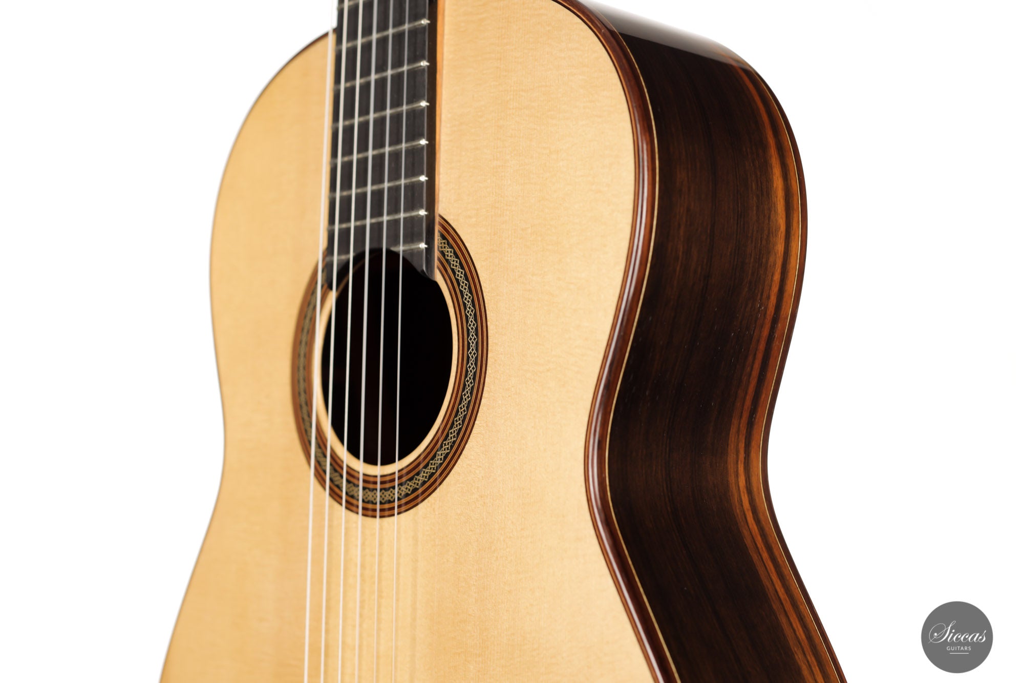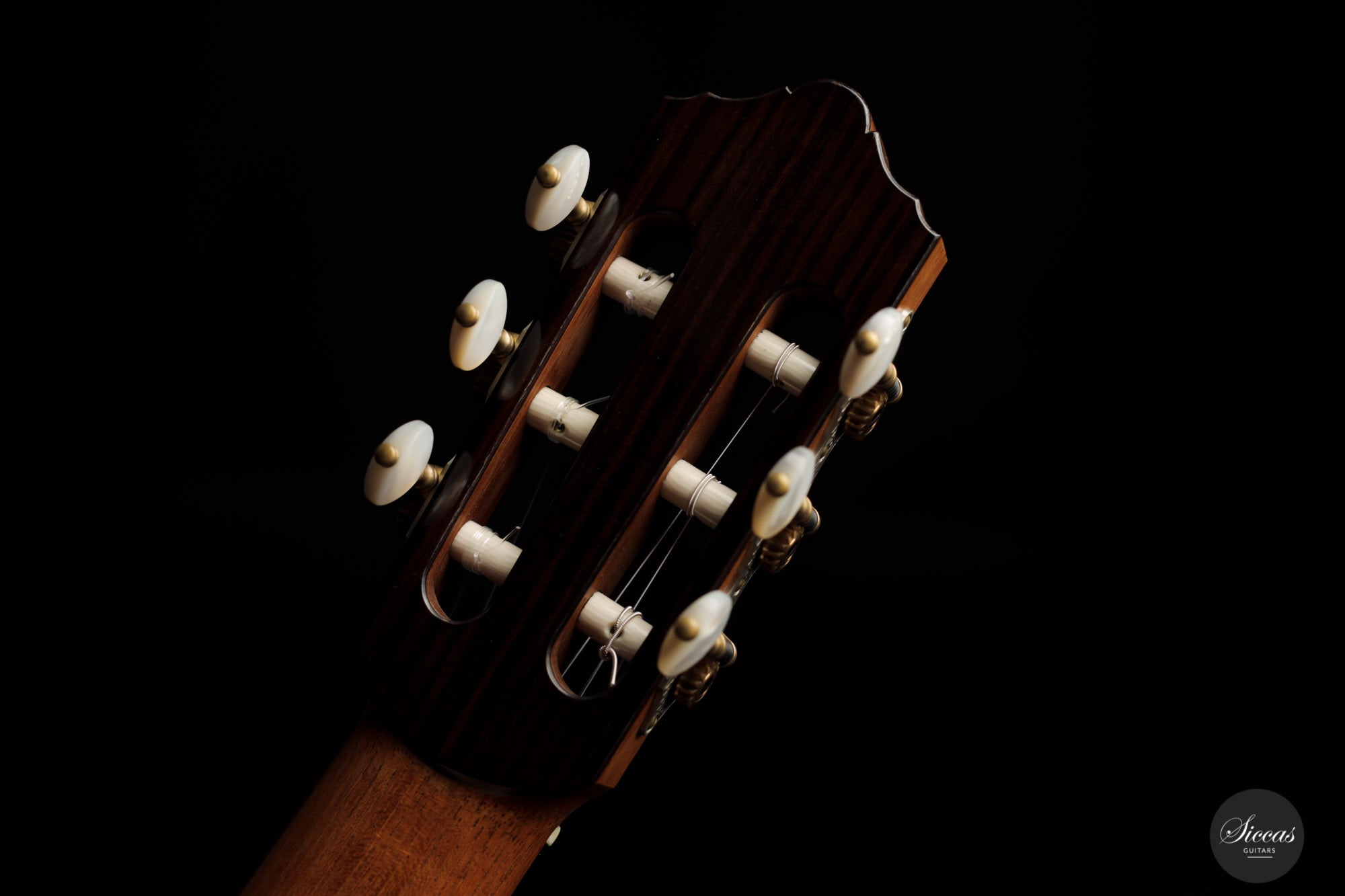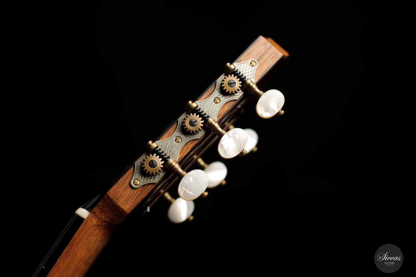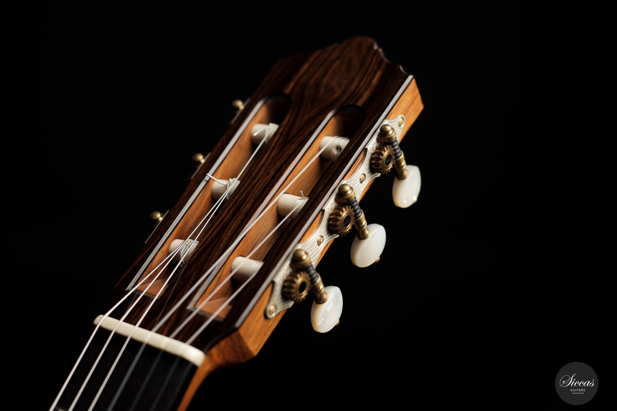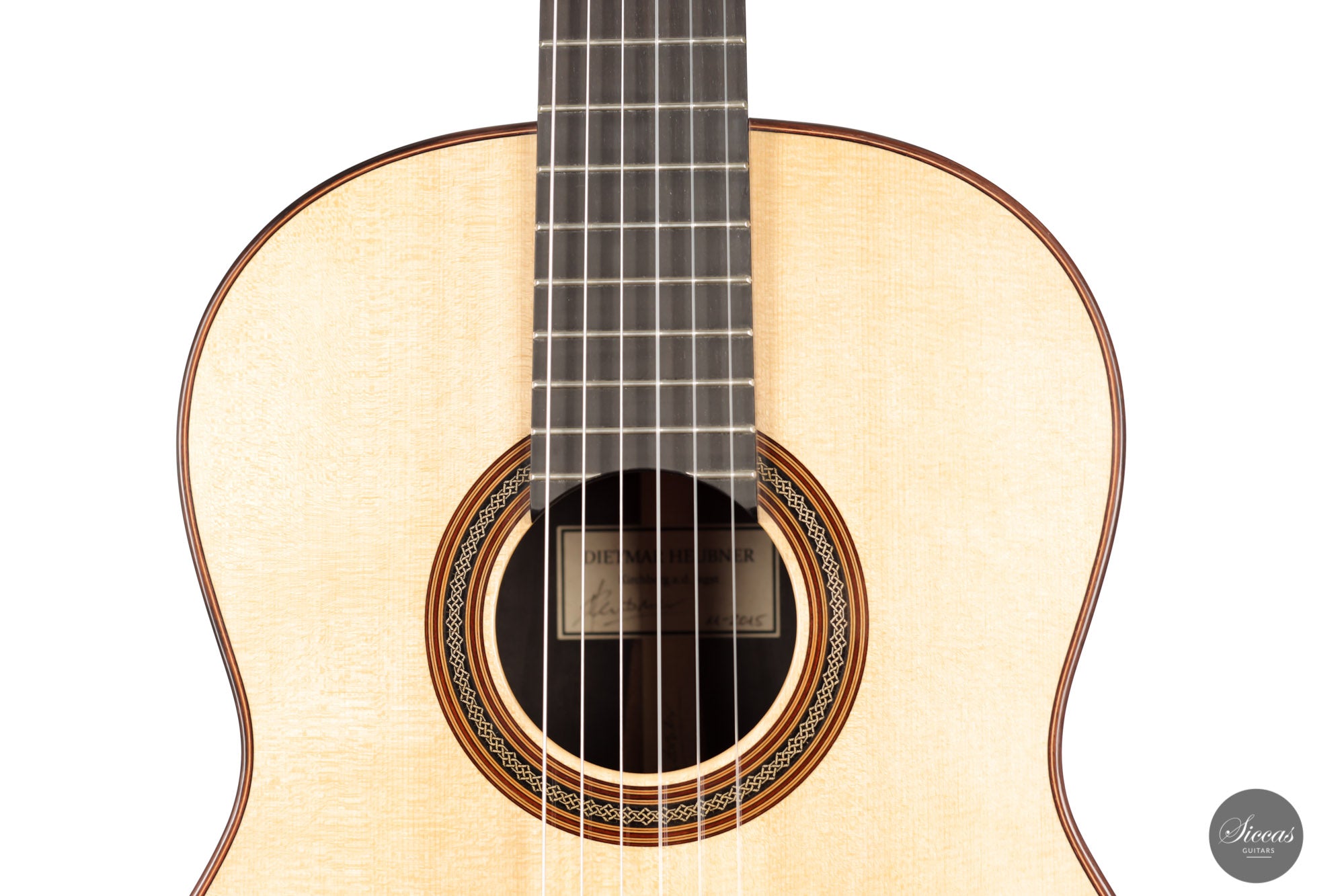 This beautiful guitar made in 2015 is a top-notch concert instrument. It is a true powerhouse with an amazing sonority, extremely pleasant playability, and stunning dynamic expressiveness. Dietmar Heubner recently refinished the varnish on this guitar himself, so it is in almost spotless condition. The tuners are made in Germany by Scheller and have the particularity of being made of engraved nickel silver.