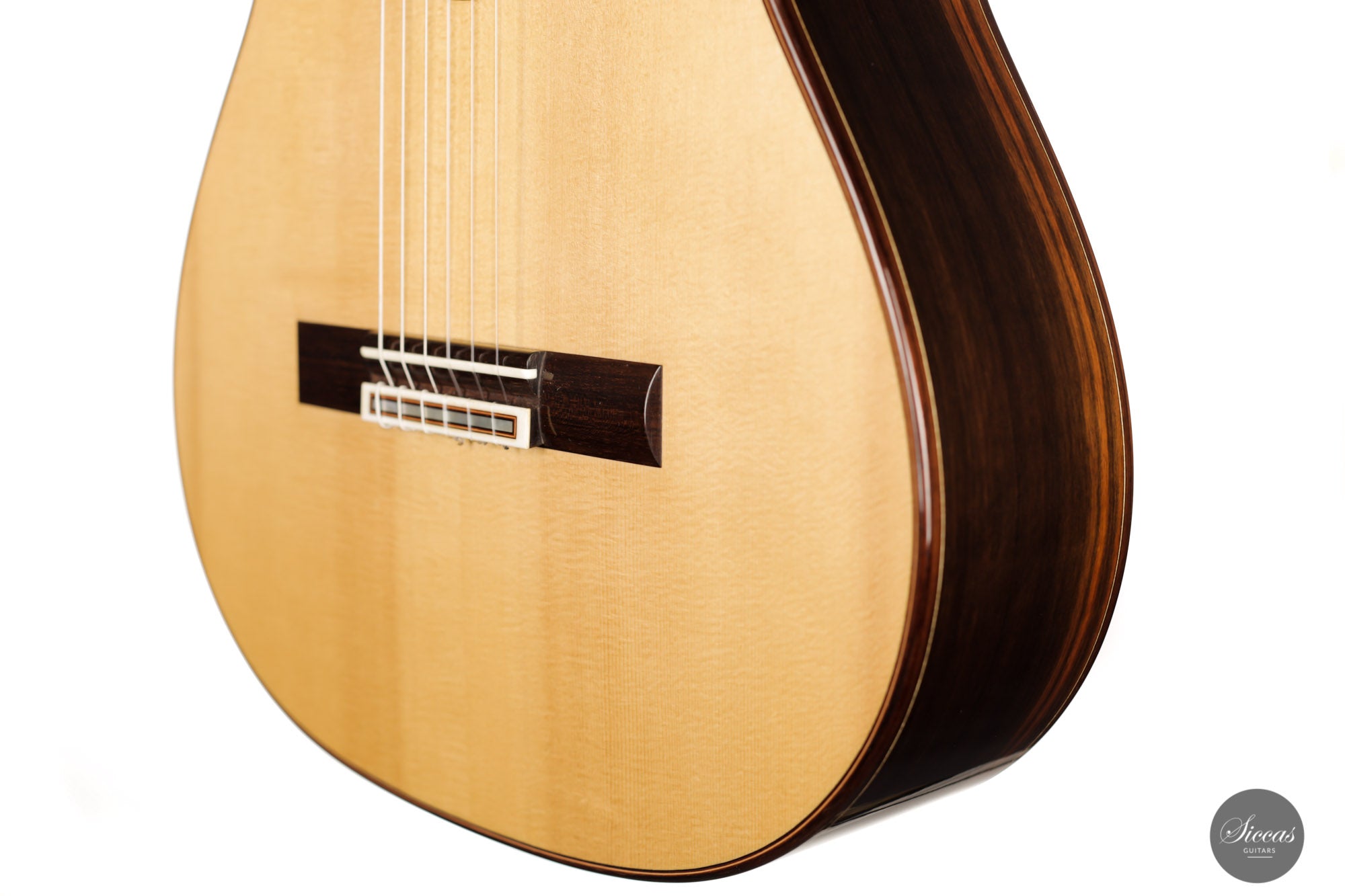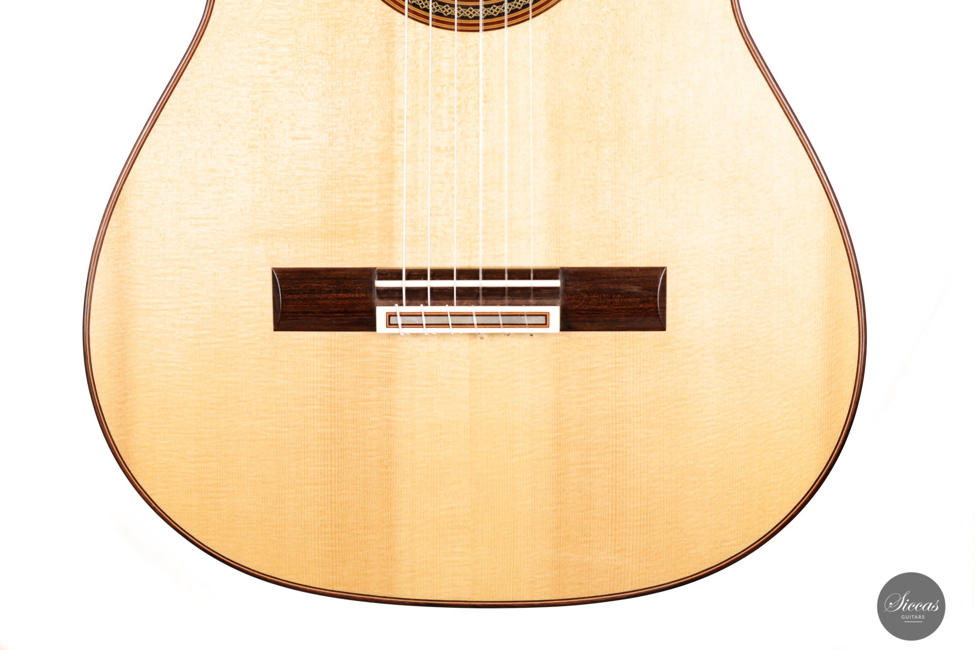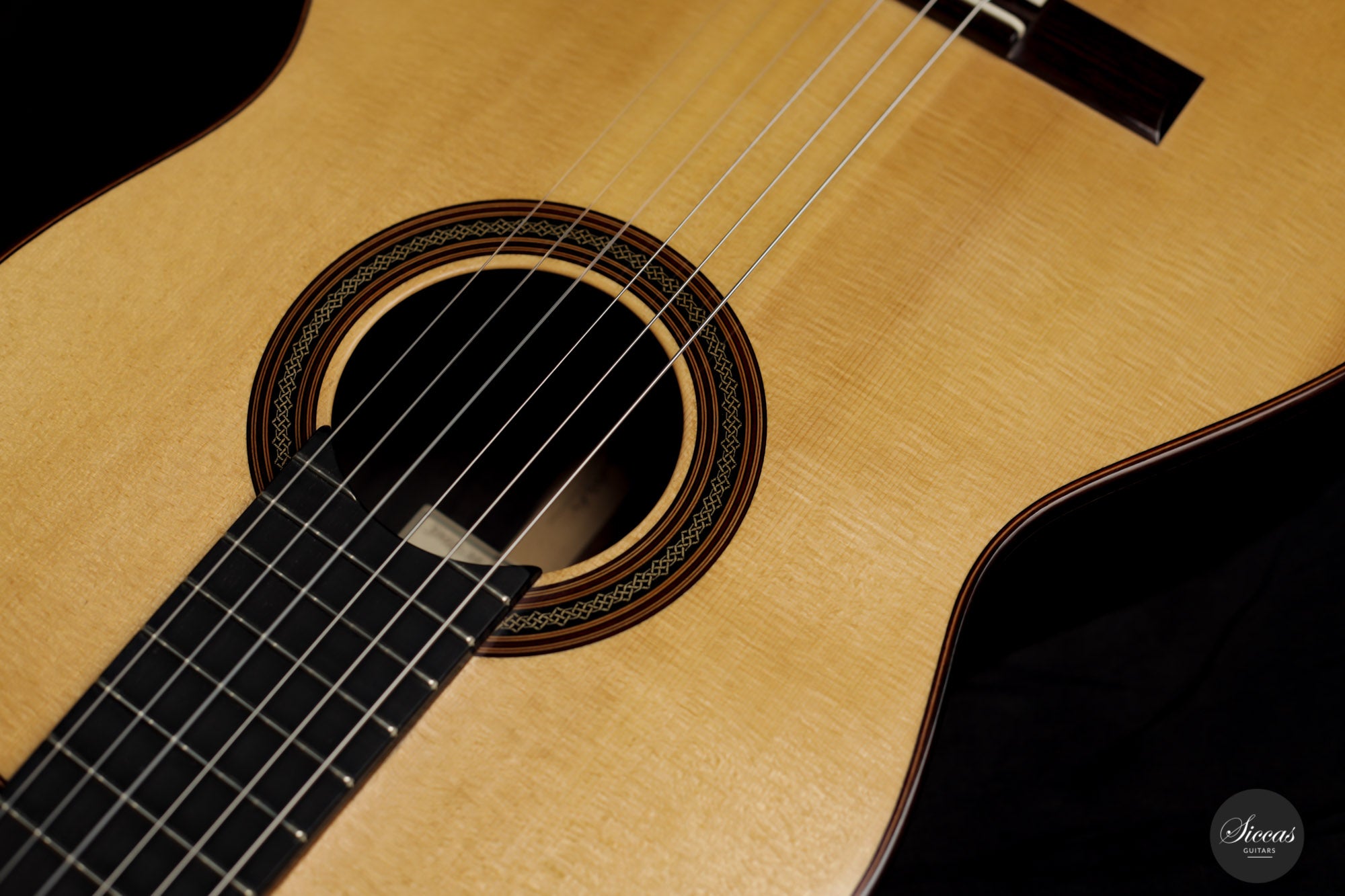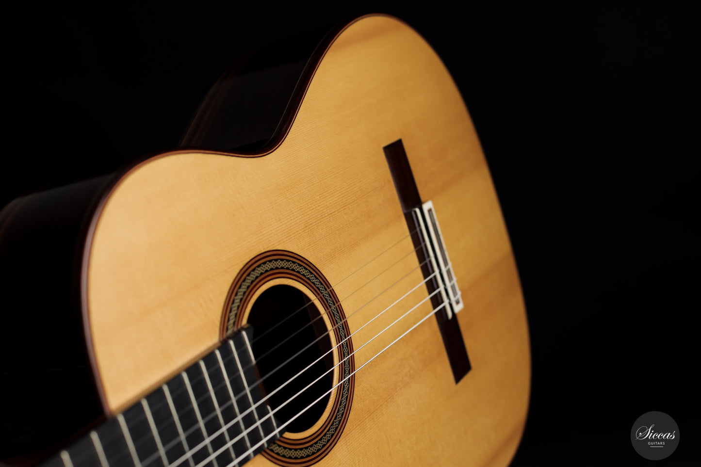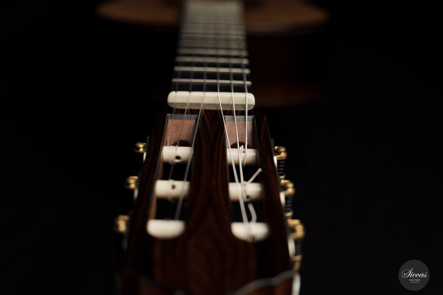 This beautiful guitar made in 2015 is a top-notch concert instrument. It is a true powerhouse with an amazing sonority, extremely pleasant playability, and stunning dynamic expressiveness. Dietmar Heubner recently refinished the varnish on this guitar himself, so it is in almost spotless condition. The tuners are made in Germany by Scheller and have the particularity of being made of engraved nickel silver.