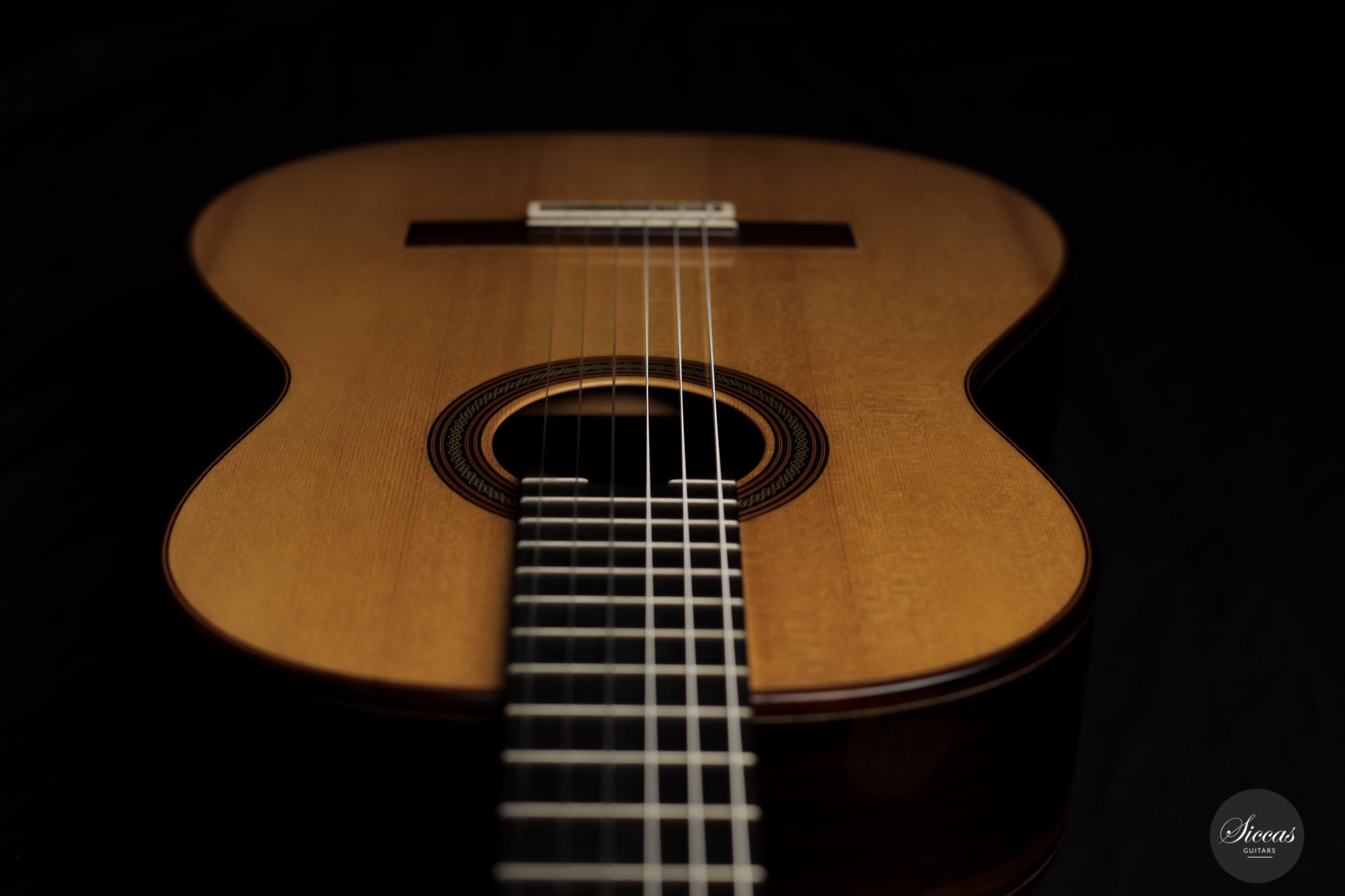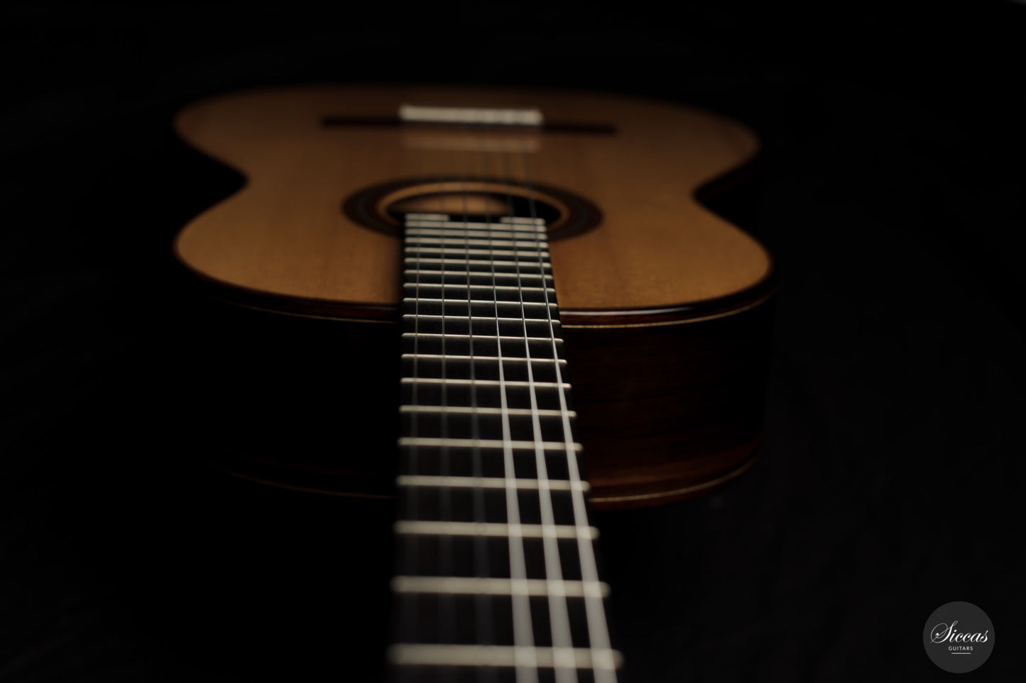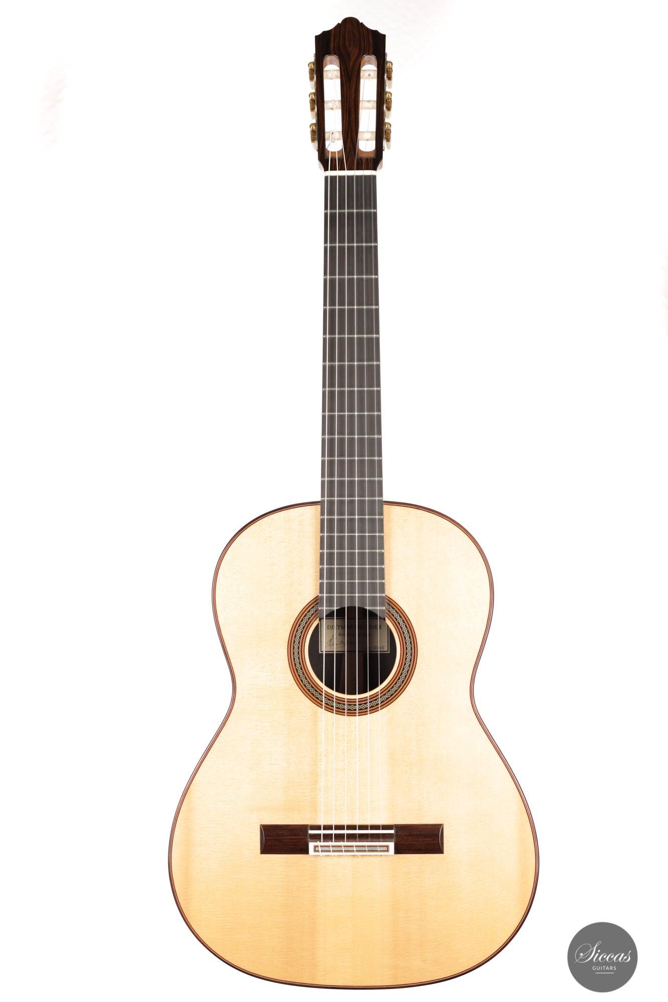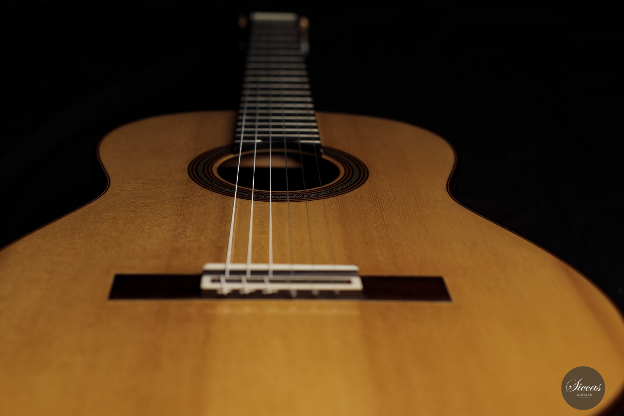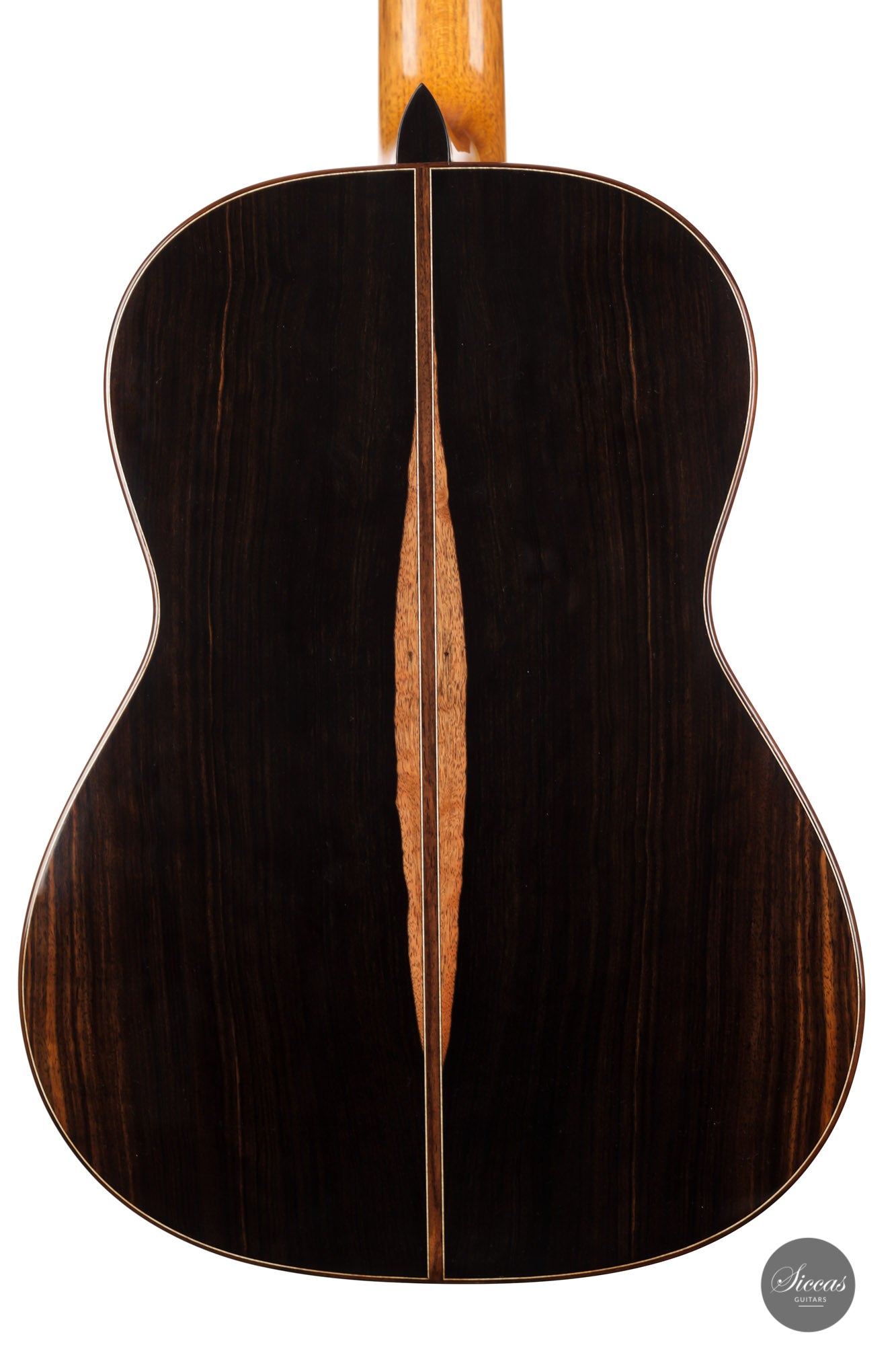 This beautiful guitar made in 2015 is a top-notch concert instrument. It is a true powerhouse with an amazing sonority, extremely pleasant playability, and stunning dynamic expressiveness. Dietmar Heubner recently refinished the varnish on this guitar himself, so it is in almost spotless condition. The tuners are made in Germany by Scheller and have the particularity of being made of engraved nickel silver.
