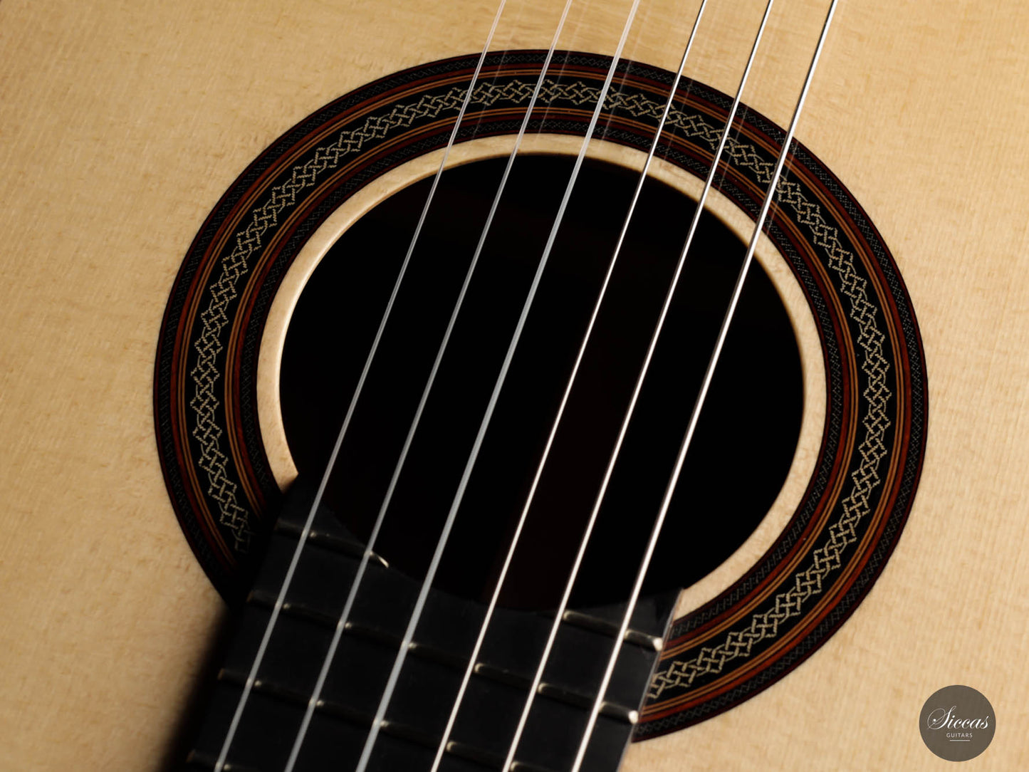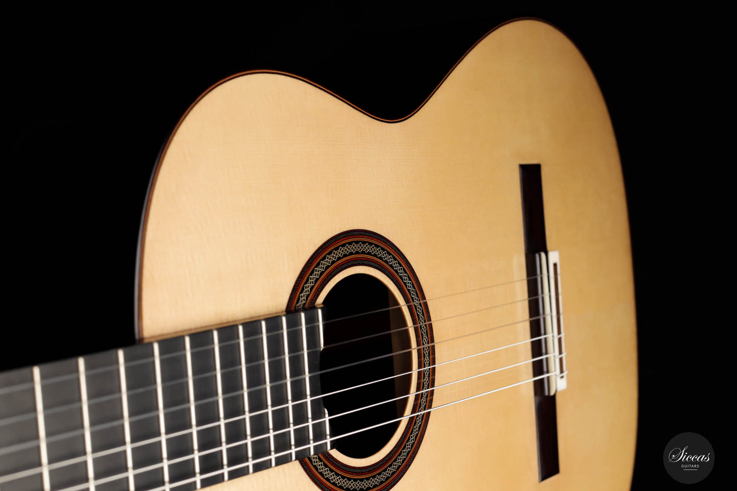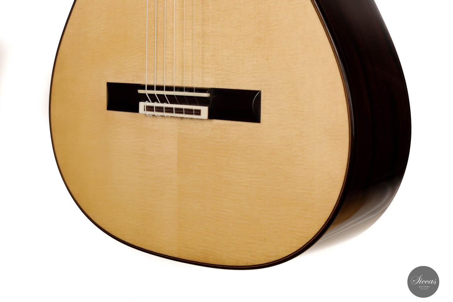 To craft this extraordinary instrument, Dietmar Heubner decided to refrain from using machines and to get as close as possible to the wood. He shaped the top, back, and sides using hand planes and scraper blades. This masterly feat of craftsmanship allowed him to control the thickness of the wood, adjust spontaneously to its characteristics, and take advantage of the possibilities and opportunities inherent in any craft. This approach is ideal in line with Dietmar’s philosophy, emphasizing that traditional construction still offers unlimited possibilities for development in terms of sound aesthetics, projection, and everything else that makes the guitar such an exceptional instrument.