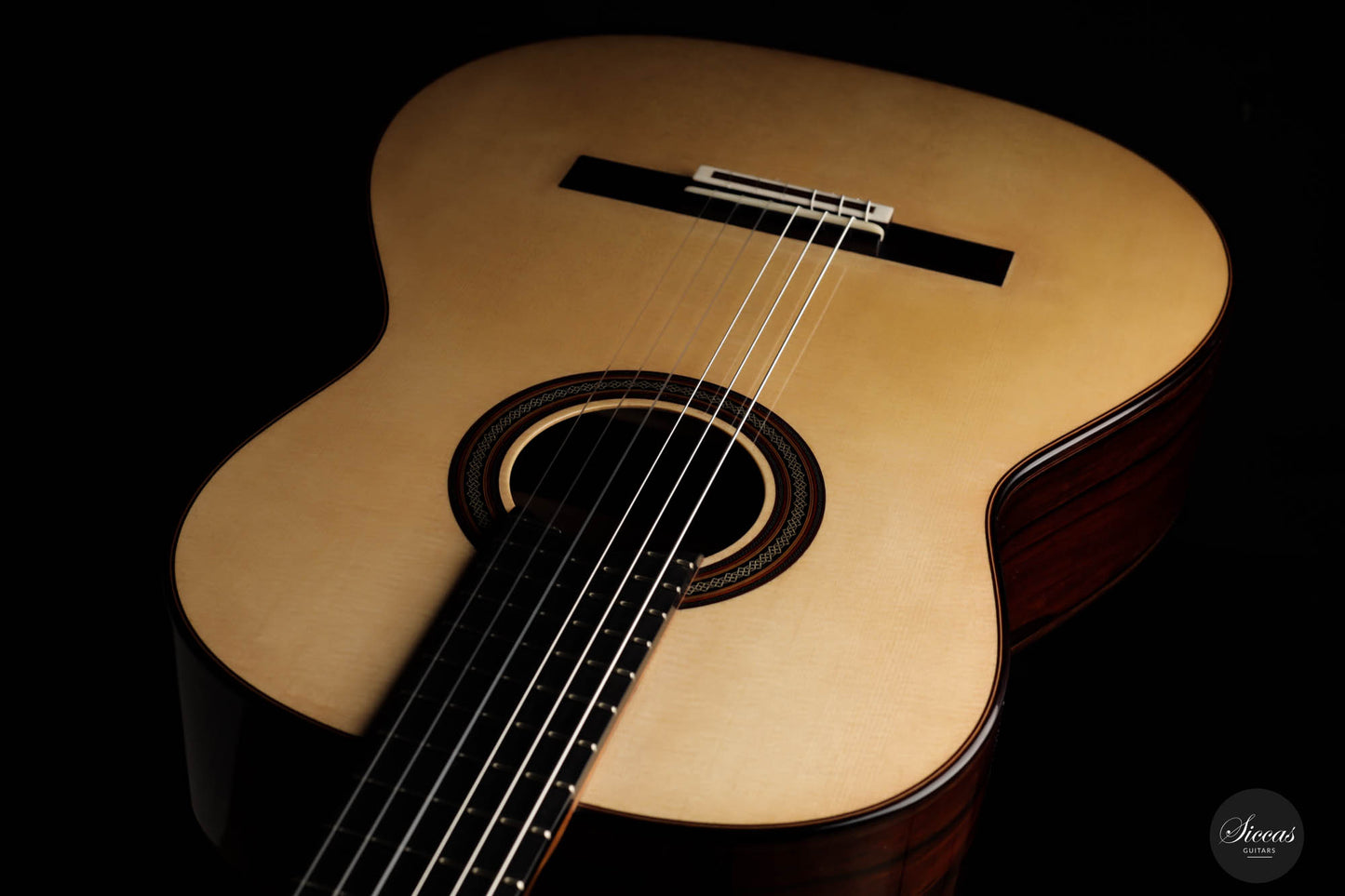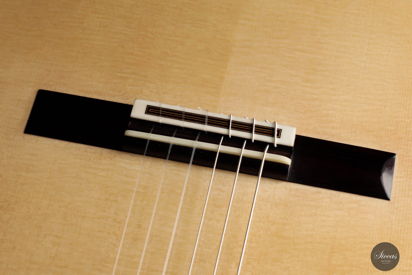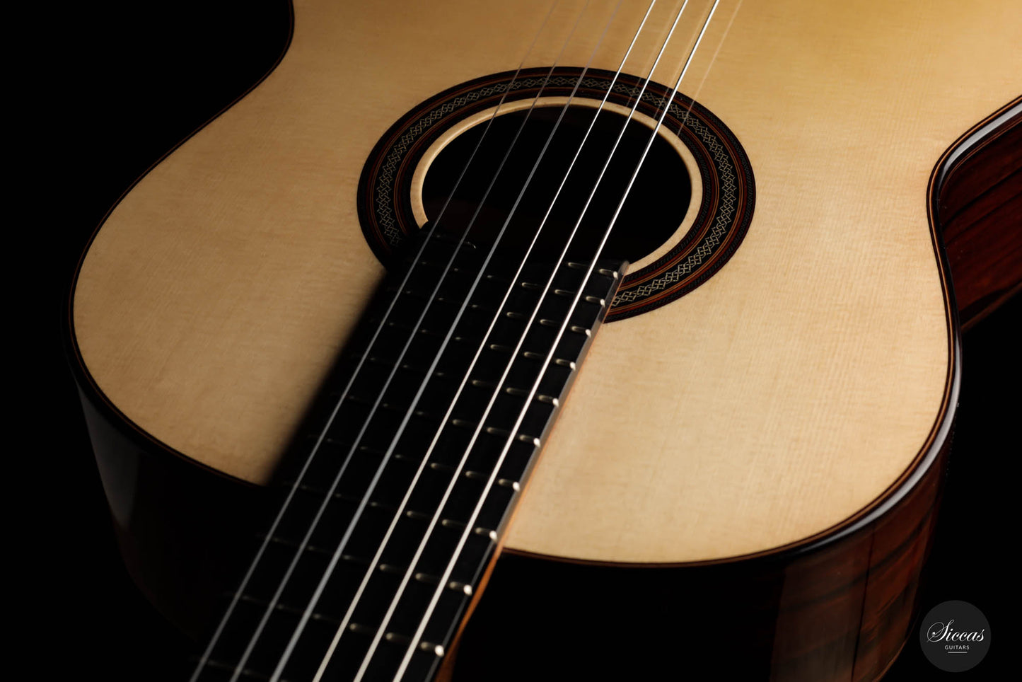To craft this extraordinary instrument, Dietmar Heubner decided to refrain from using machines and to get as close as possible to the wood. He shaped the top, back, and sides using hand planes and scraper blades. This masterly feat of craftsmanship allowed him to control the thickness of the wood, adjust spontaneously to its characteristics, and take advantage of the possibilities and opportunities inherent in any craft. This approach is ideal in line with Dietmar’s philosophy, emphasizing that traditional construction still offers unlimited possibilities for development in terms of sound aesthetics, projection, and everything else that makes the guitar such an exceptional instrument.