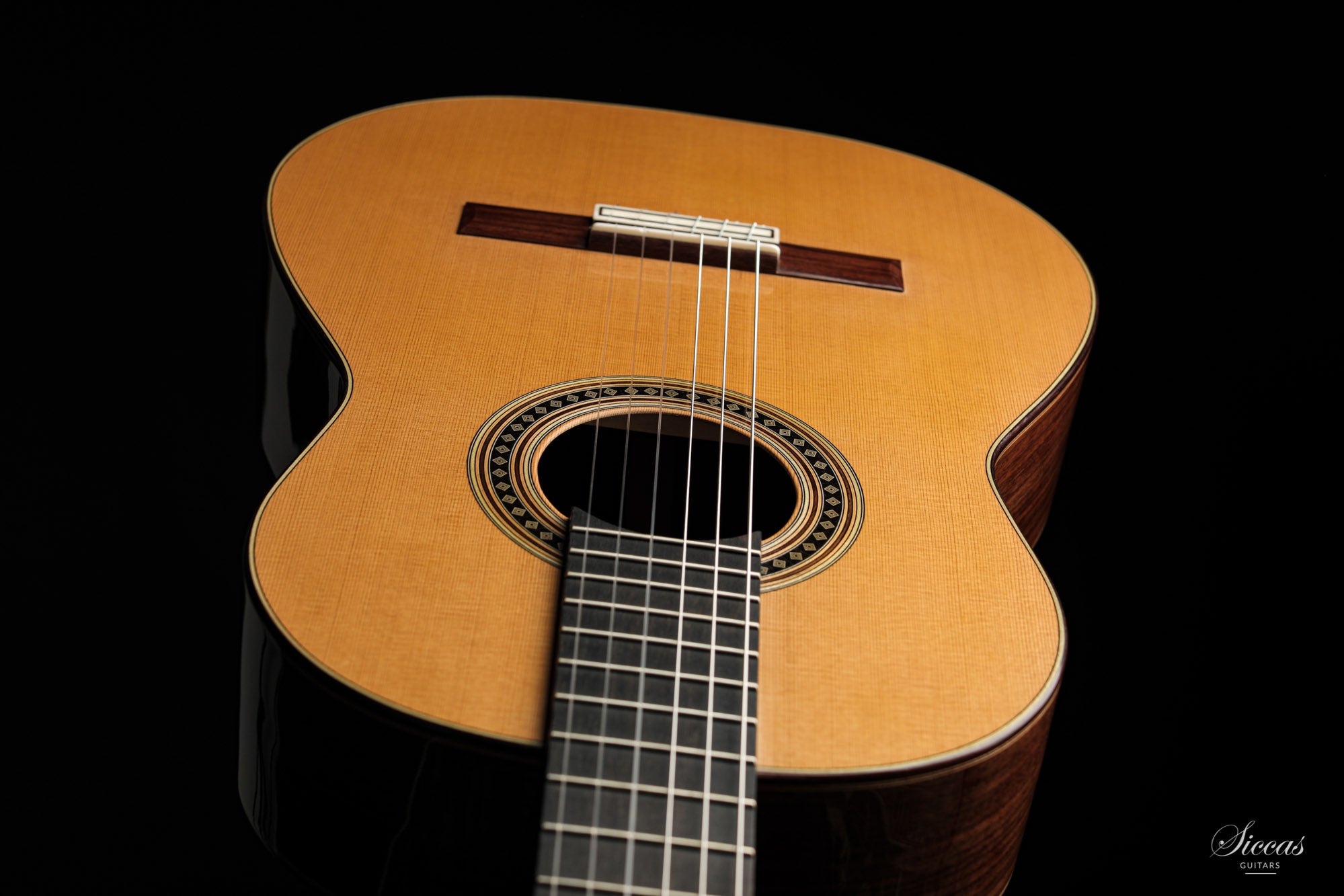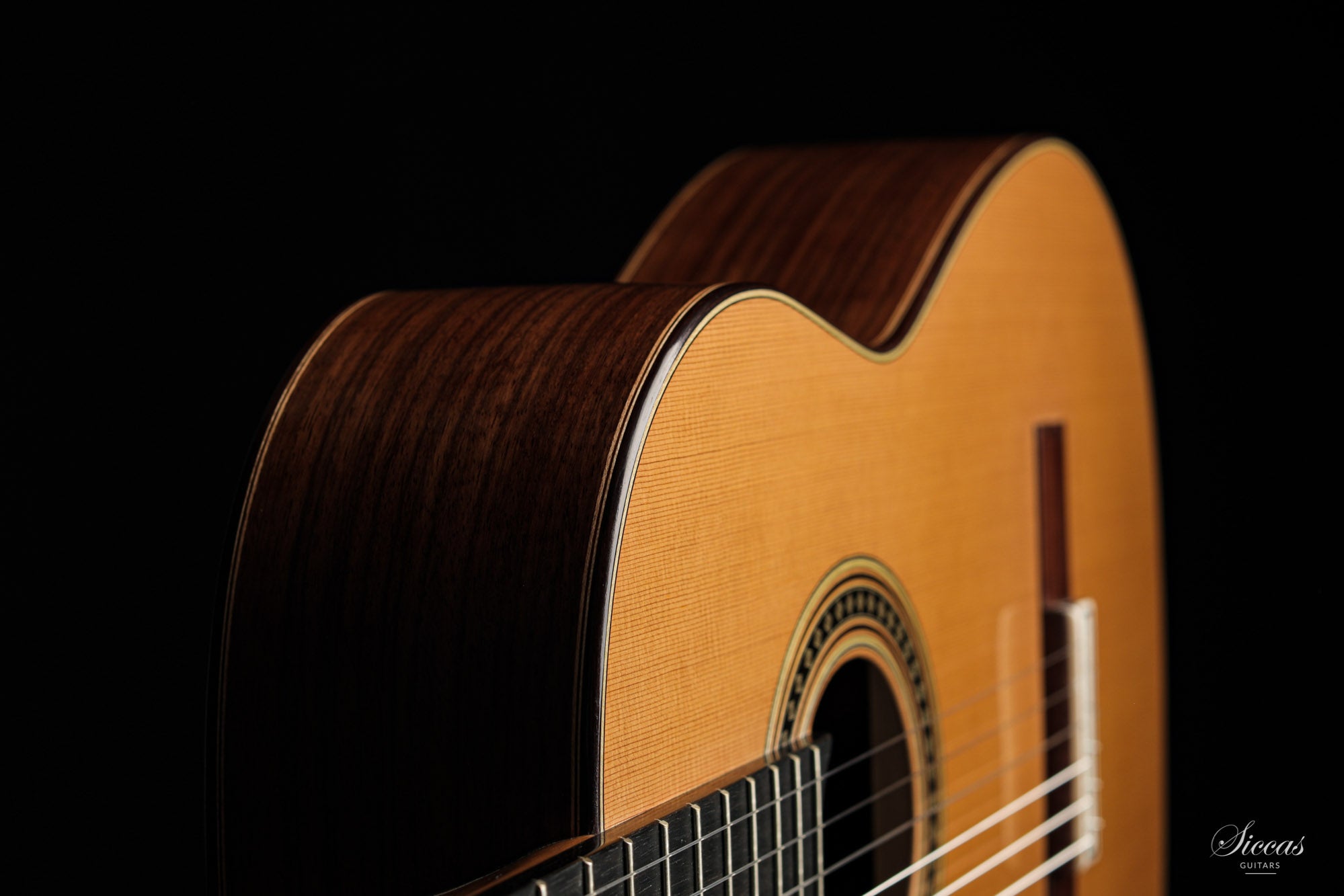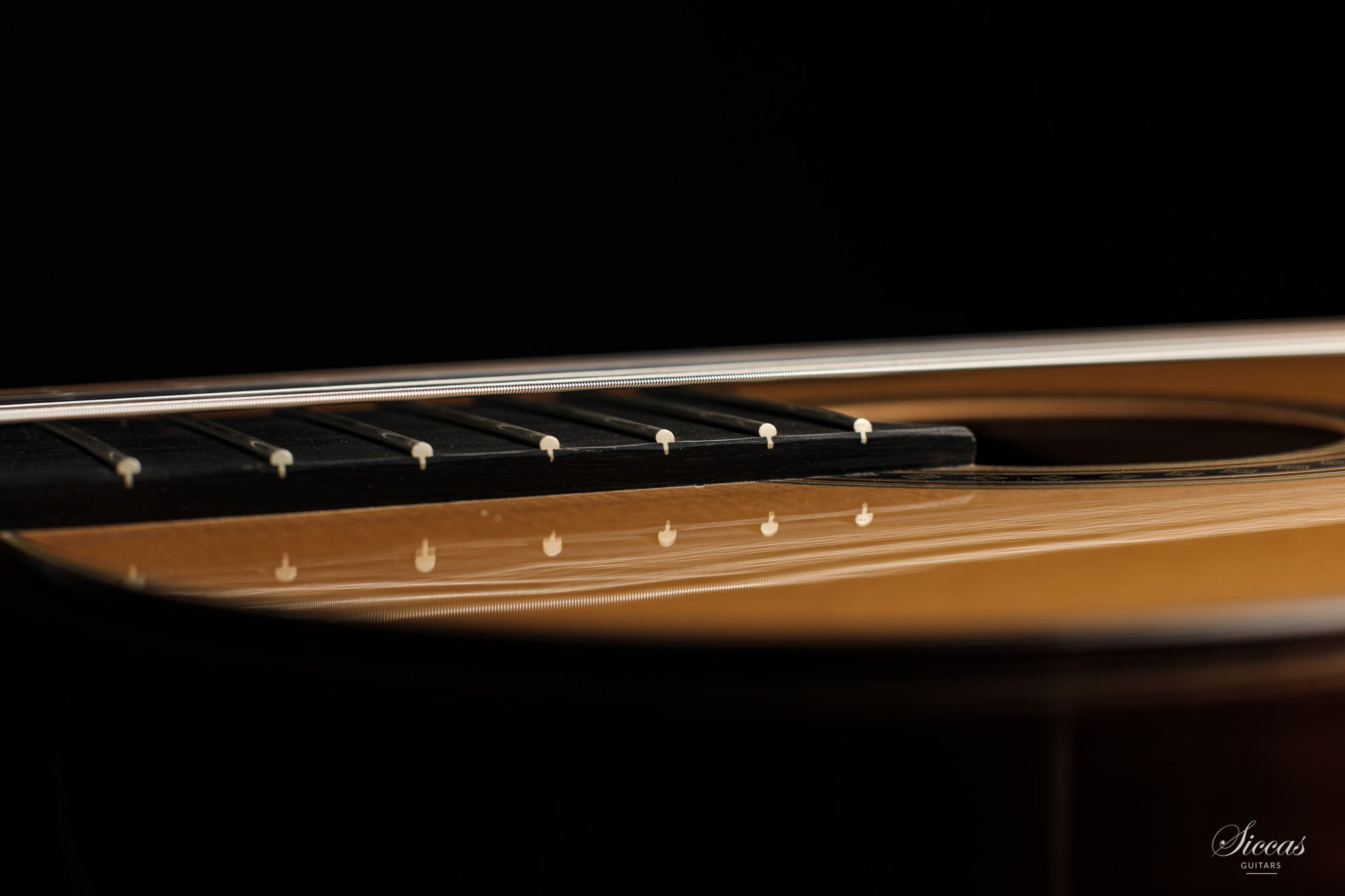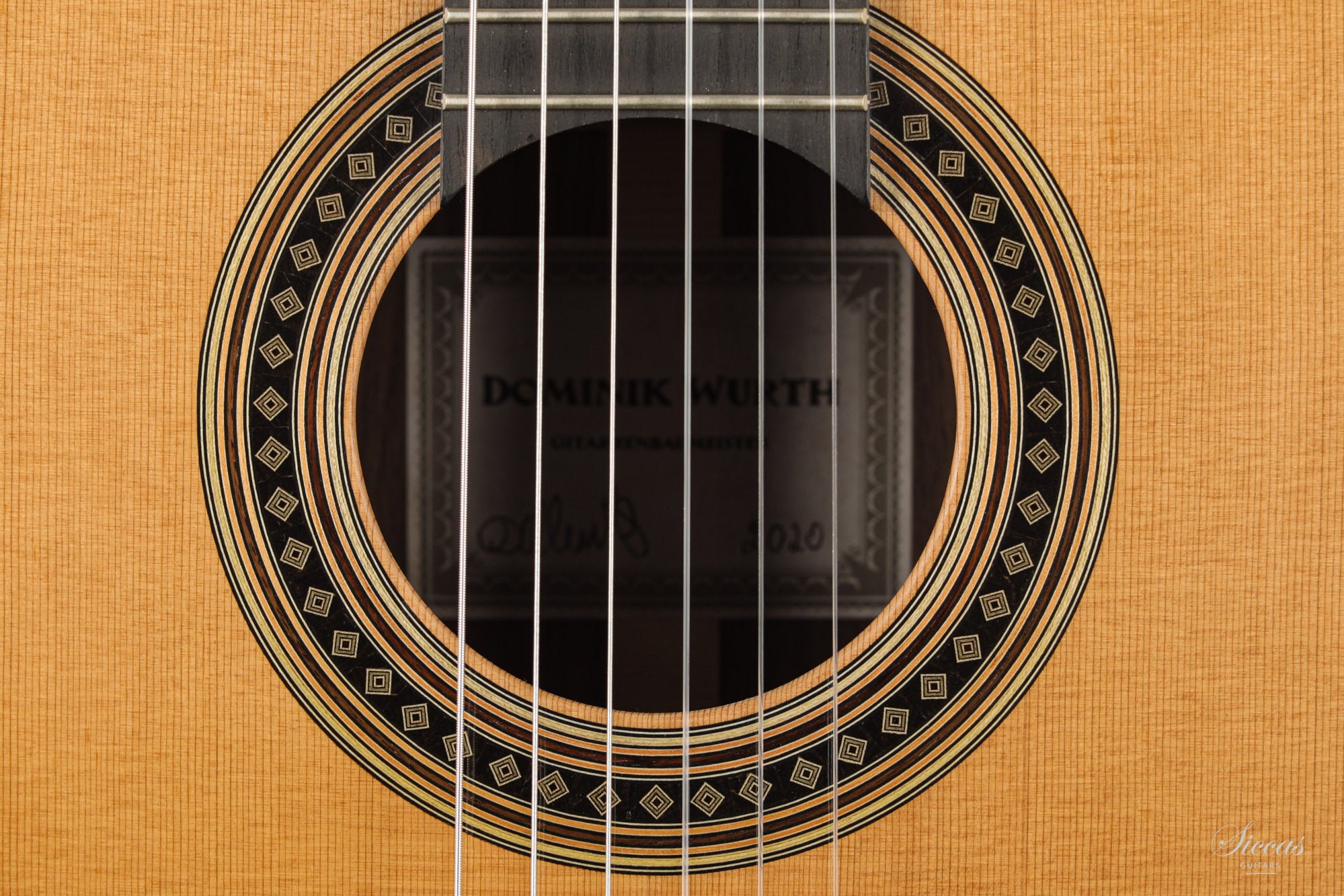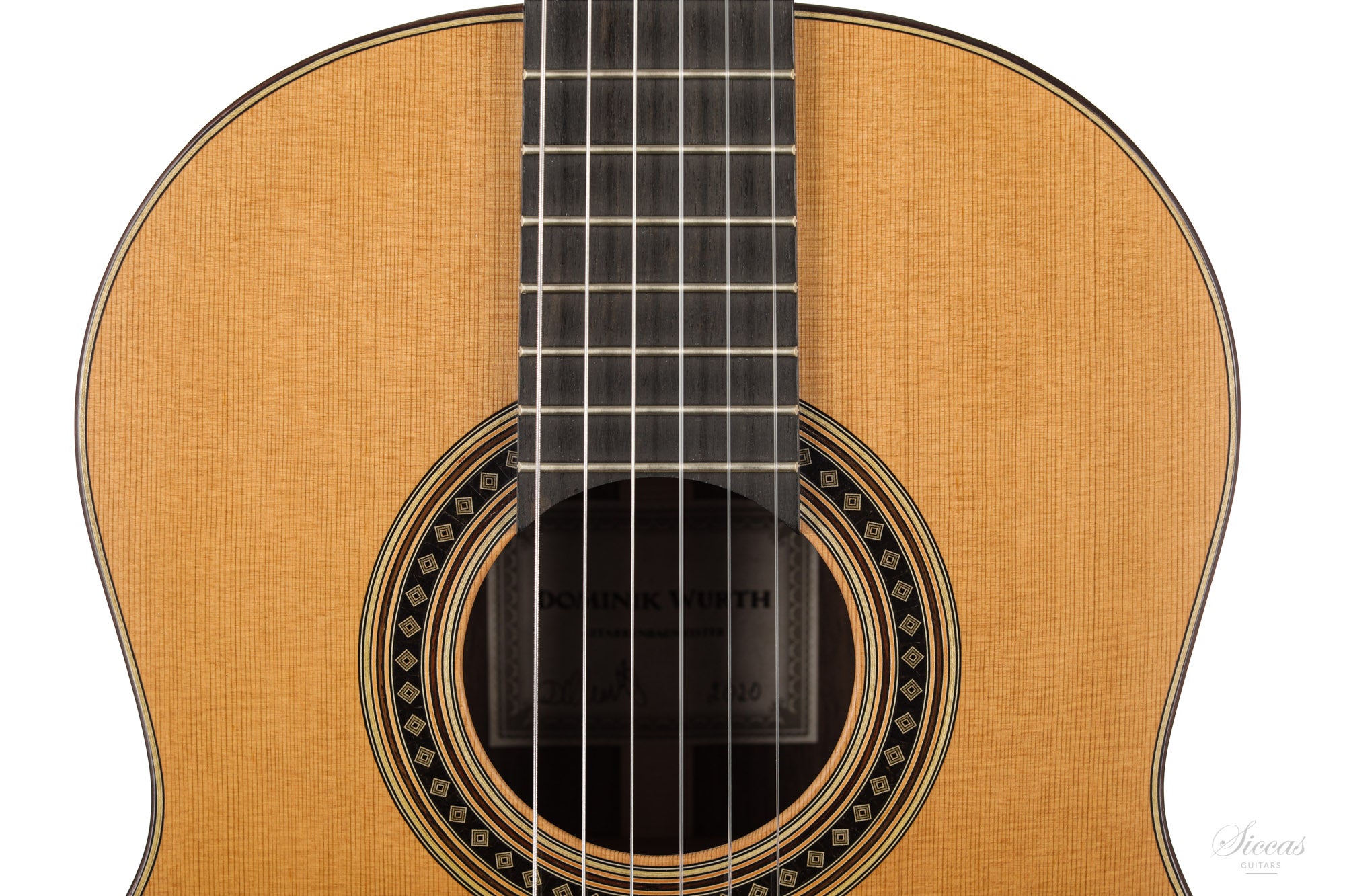 An amazing response with a big and powerful sound make this guitar a real pleasure to play. It has a wonderful palette of overtones that resonate and create a kind of echo effect. The instrument responds very well to different kinds of attack and hand position, which makes it a very accomplished concert guitar. Something that stands out about this double top is its very natural sound character. Dominik spends a lot of time perfecting the voicing of his instruments, and this one has that little something extra. Clear, rich trebles that hover towards the Gernot-Wagnerian sound, paired with strong and energetic basses. The craftsmanship is refined with a sense of wholeness that goes through the entire design in a magnificent way. Dominik uses a traditional shellac polish to create a mirror-smooth finish. In addition, the saddle and bridge bones are worked in such a way that each string is individually compensated, which greatly improves intonation.