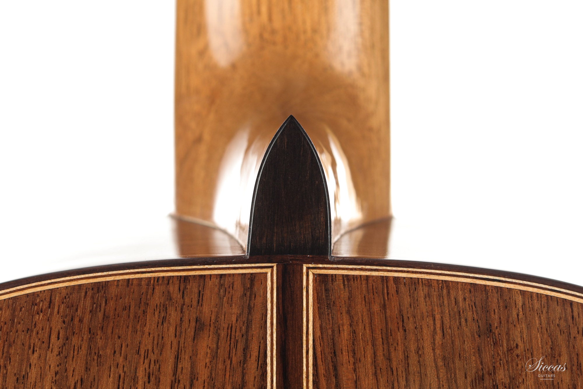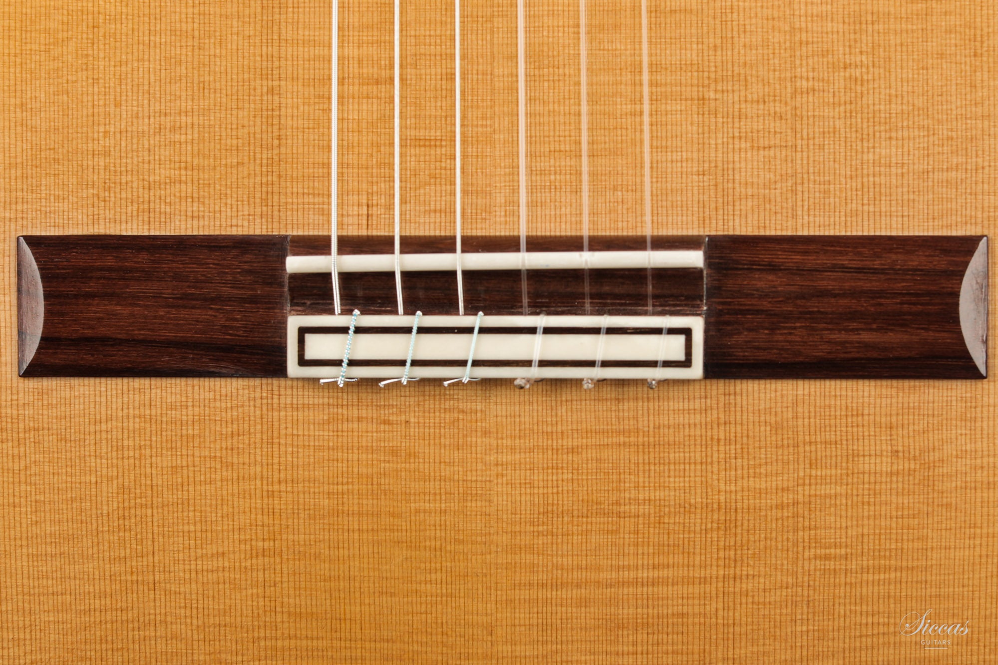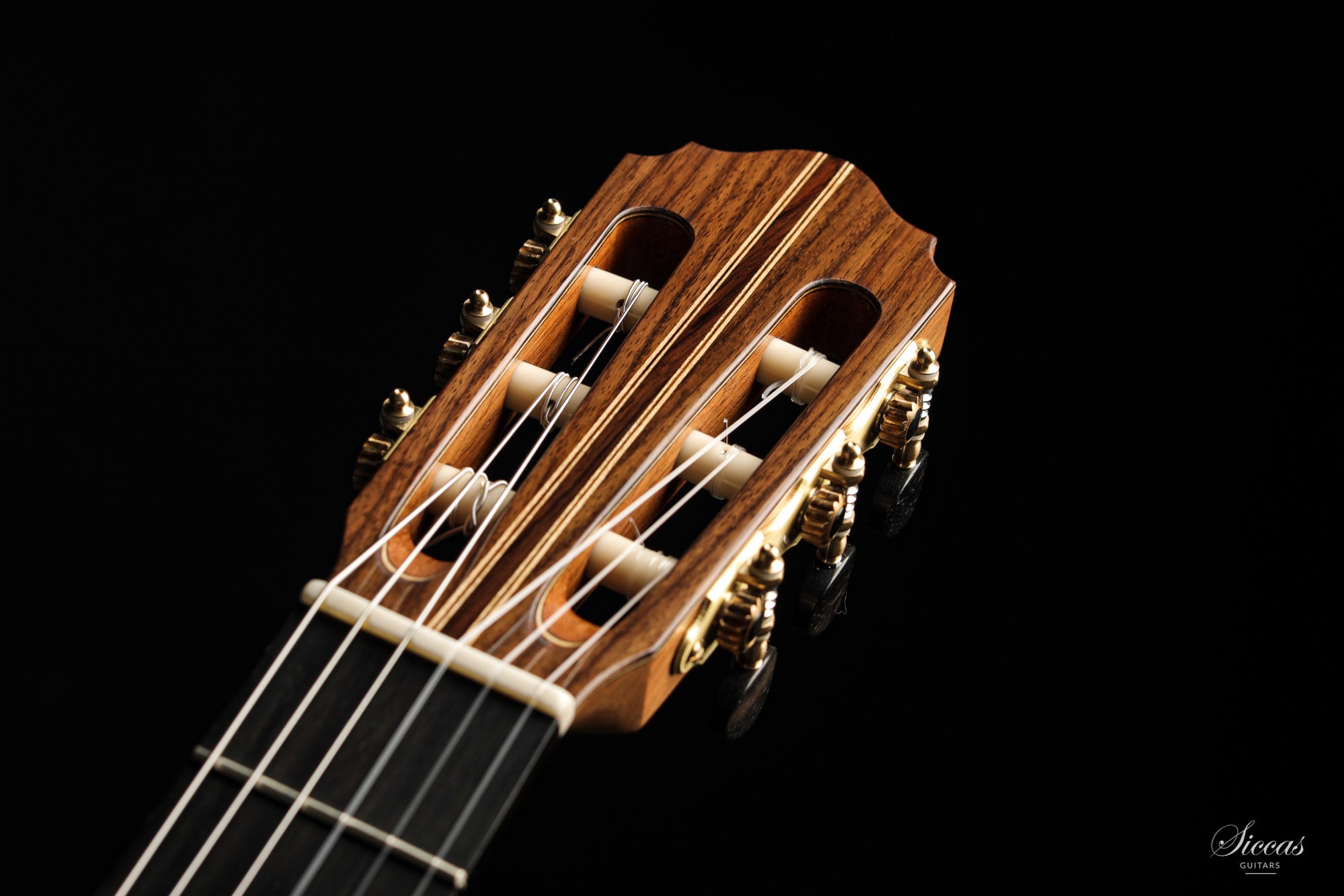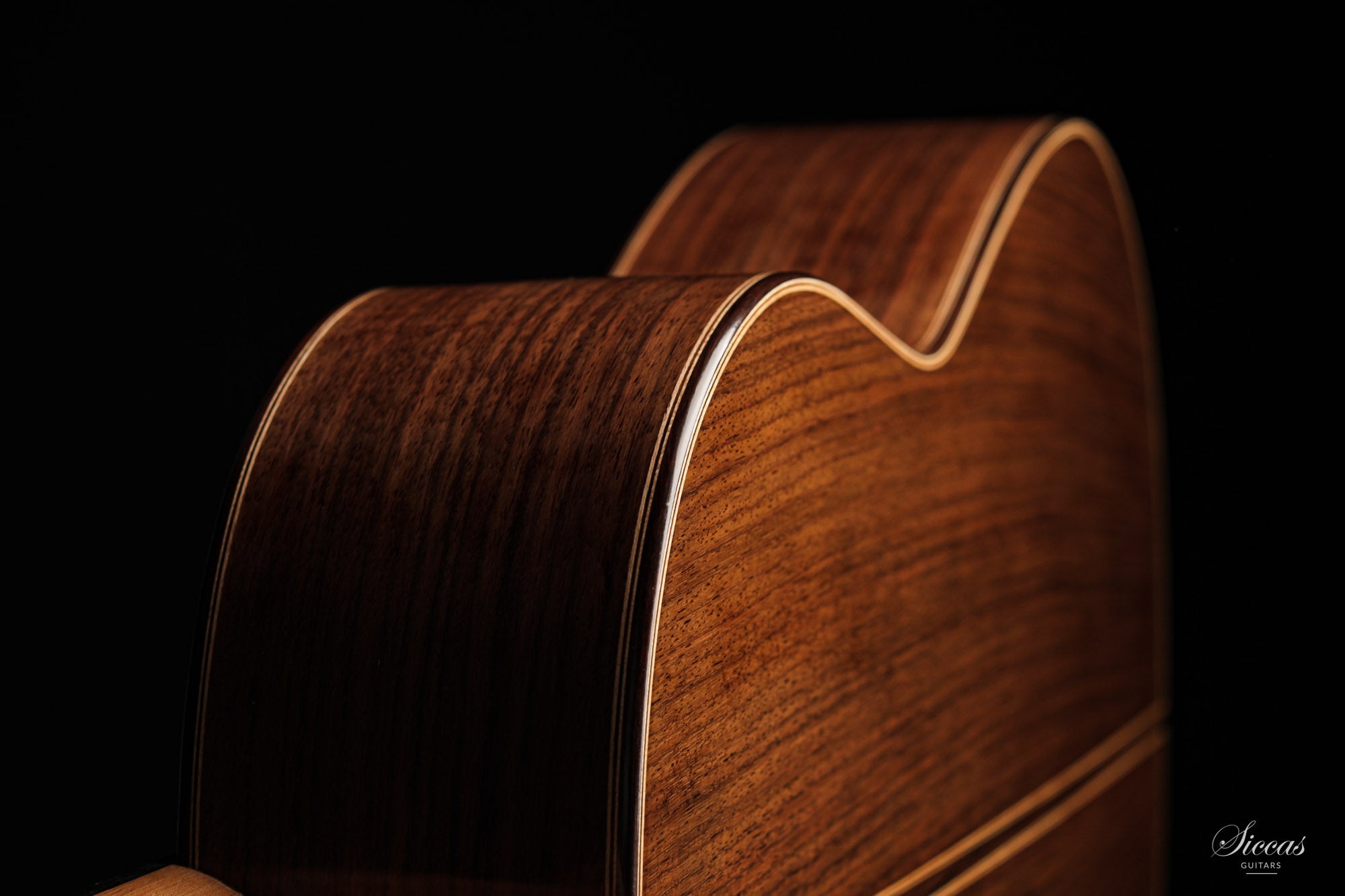 An amazing response with a big and powerful sound make this guitar a real pleasure to play. It has a wonderful palette of overtones that resonate and create a kind of echo effect. The instrument responds very well to different kinds of attack and hand position, which makes it a very accomplished concert guitar. Something that stands out about this double top is its very natural sound character. Dominik spends a lot of time perfecting the voicing of his instruments, and this one has that little something extra. Clear, rich trebles that hover towards the Gernot-Wagnerian sound, paired with strong and energetic basses. The craftsmanship is refined with a sense of wholeness that goes through the entire design in a magnificent way. Dominik uses a traditional shellac polish to create a mirror-smooth finish. In addition, the saddle and bridge bones are worked in such a way that each string is individually compensated, which greatly improves intonation.