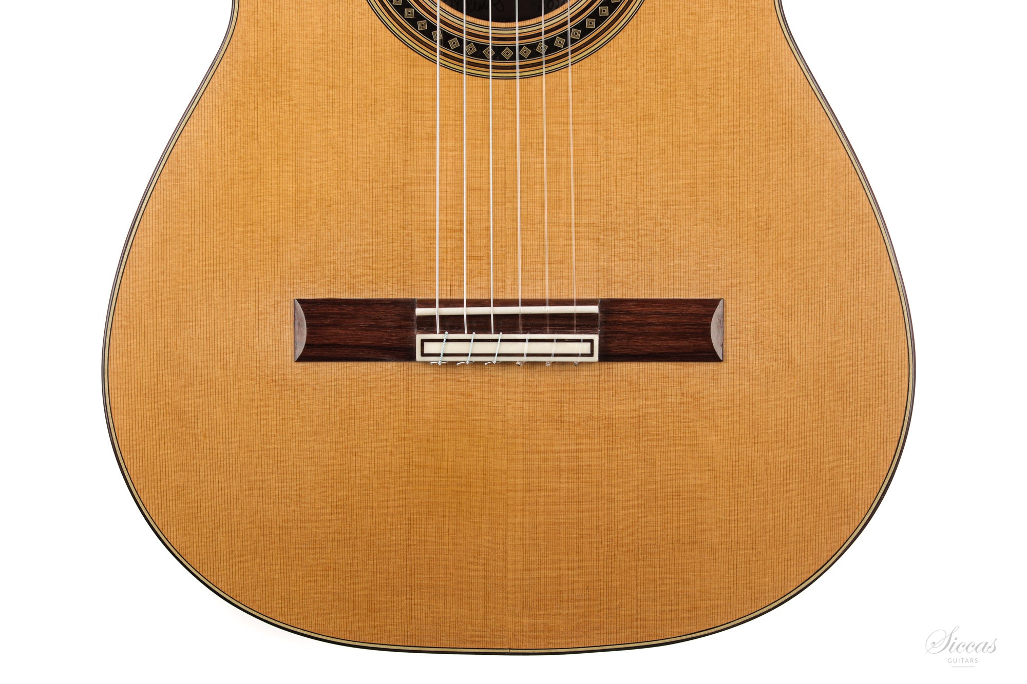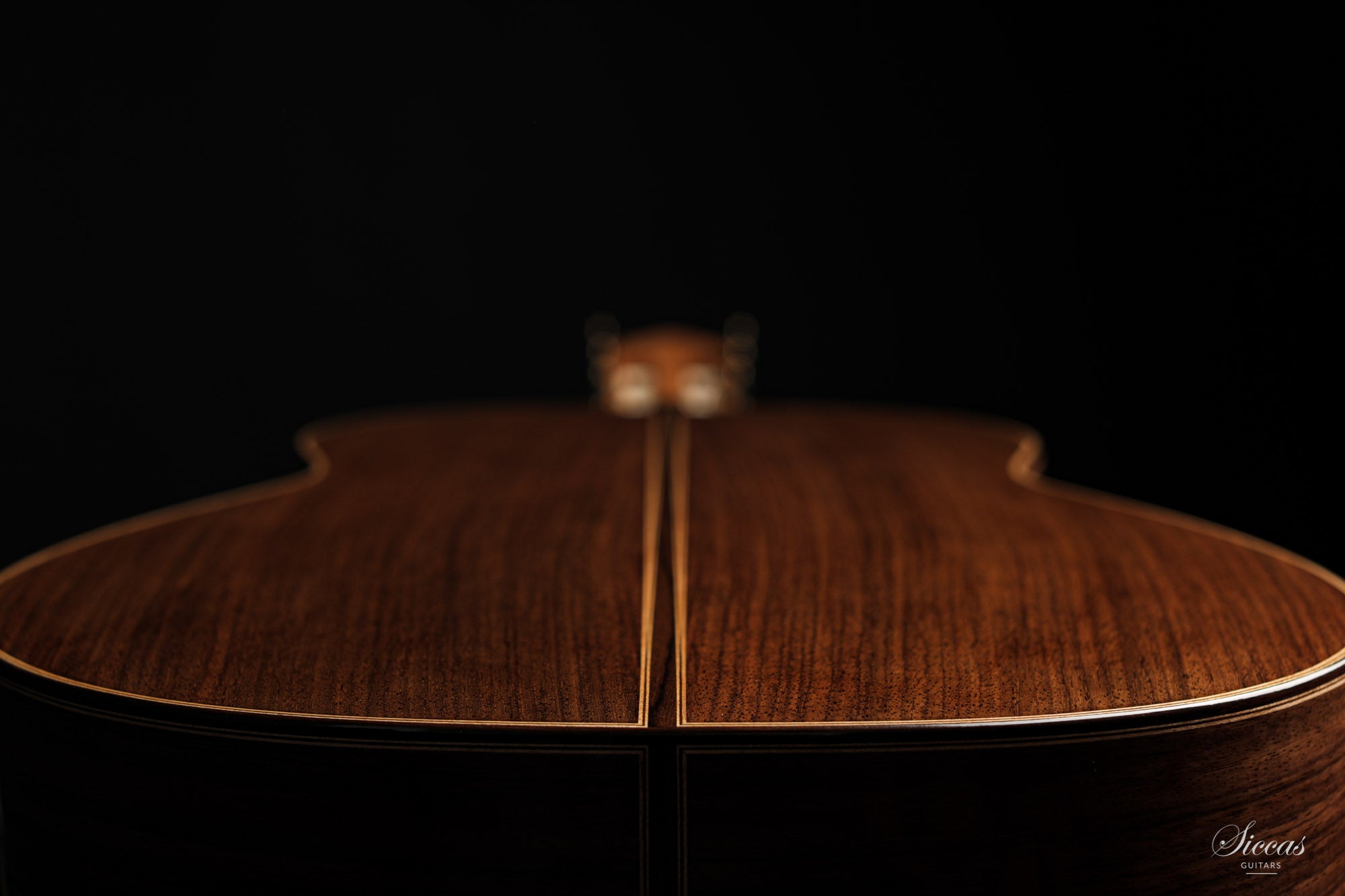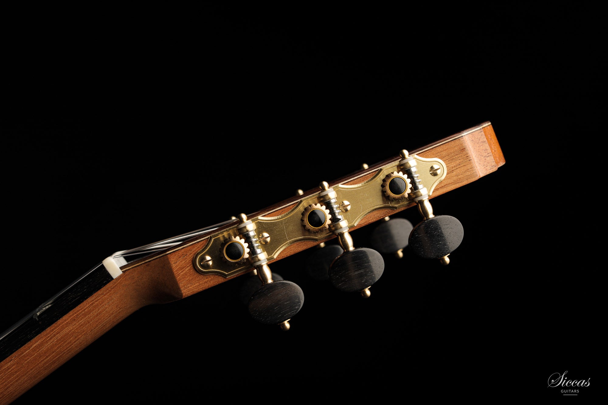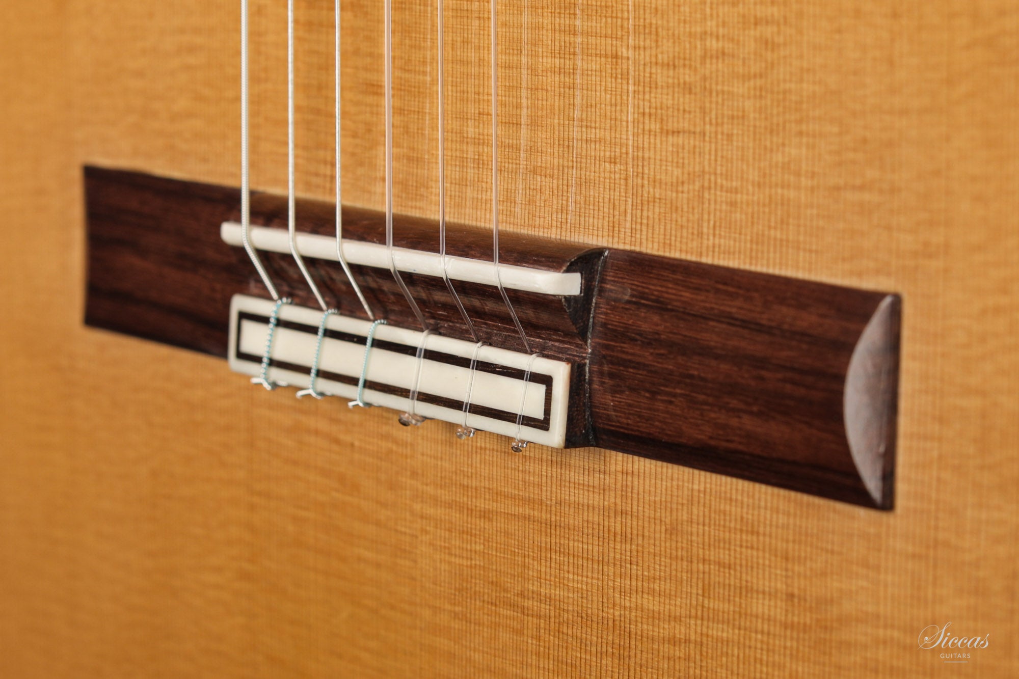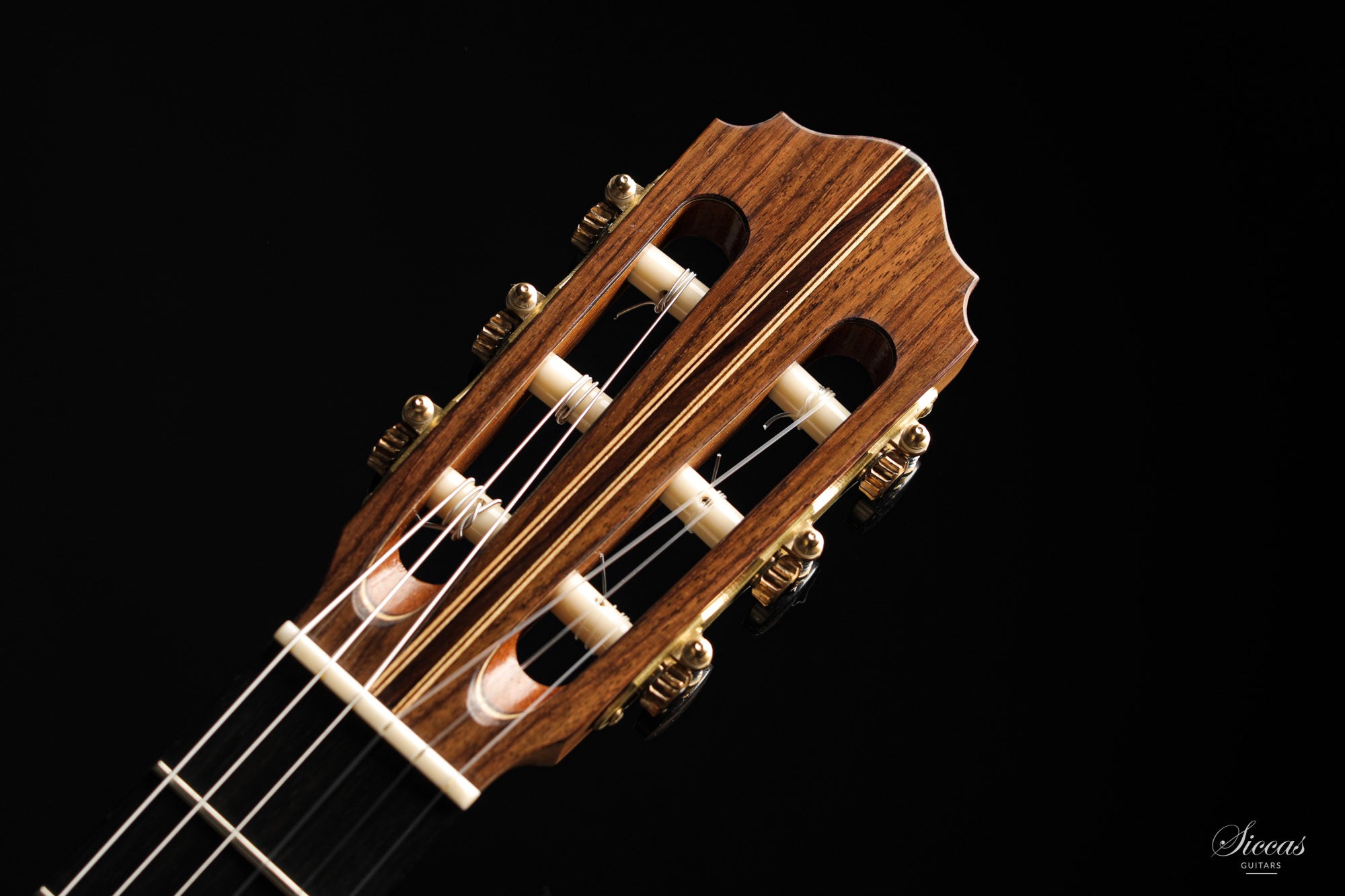 An amazing response with a big and powerful sound make this guitar a real pleasure to play. It has a wonderful palette of overtones that resonate and create a kind of echo effect. The instrument responds very well to different kinds of attack and hand position, which makes it a very accomplished concert guitar. Something that stands out about this double top is its very natural sound character. Dominik spends a lot of time perfecting the voicing of his instruments, and this one has that little something extra. Clear, rich trebles that hover towards the Gernot-Wagnerian sound, paired with strong and energetic basses. The craftsmanship is refined with a sense of wholeness that goes through the entire design in a magnificent way. Dominik uses a traditional shellac polish to create a mirror-smooth finish. In addition, the saddle and bridge bones are worked in such a way that each string is individually compensated, which greatly improves intonation.
