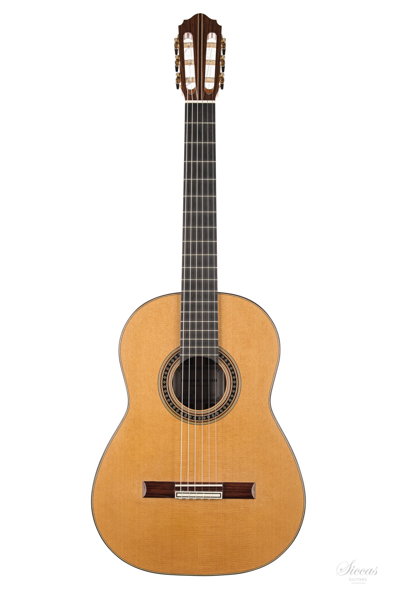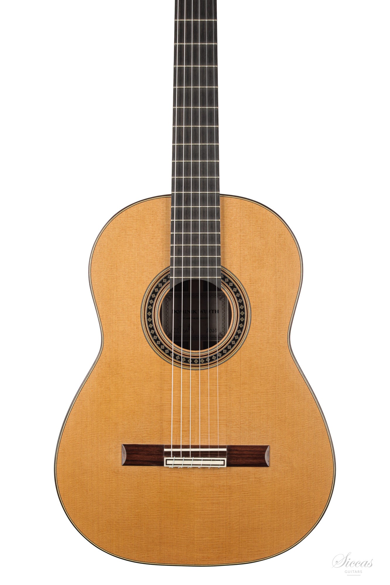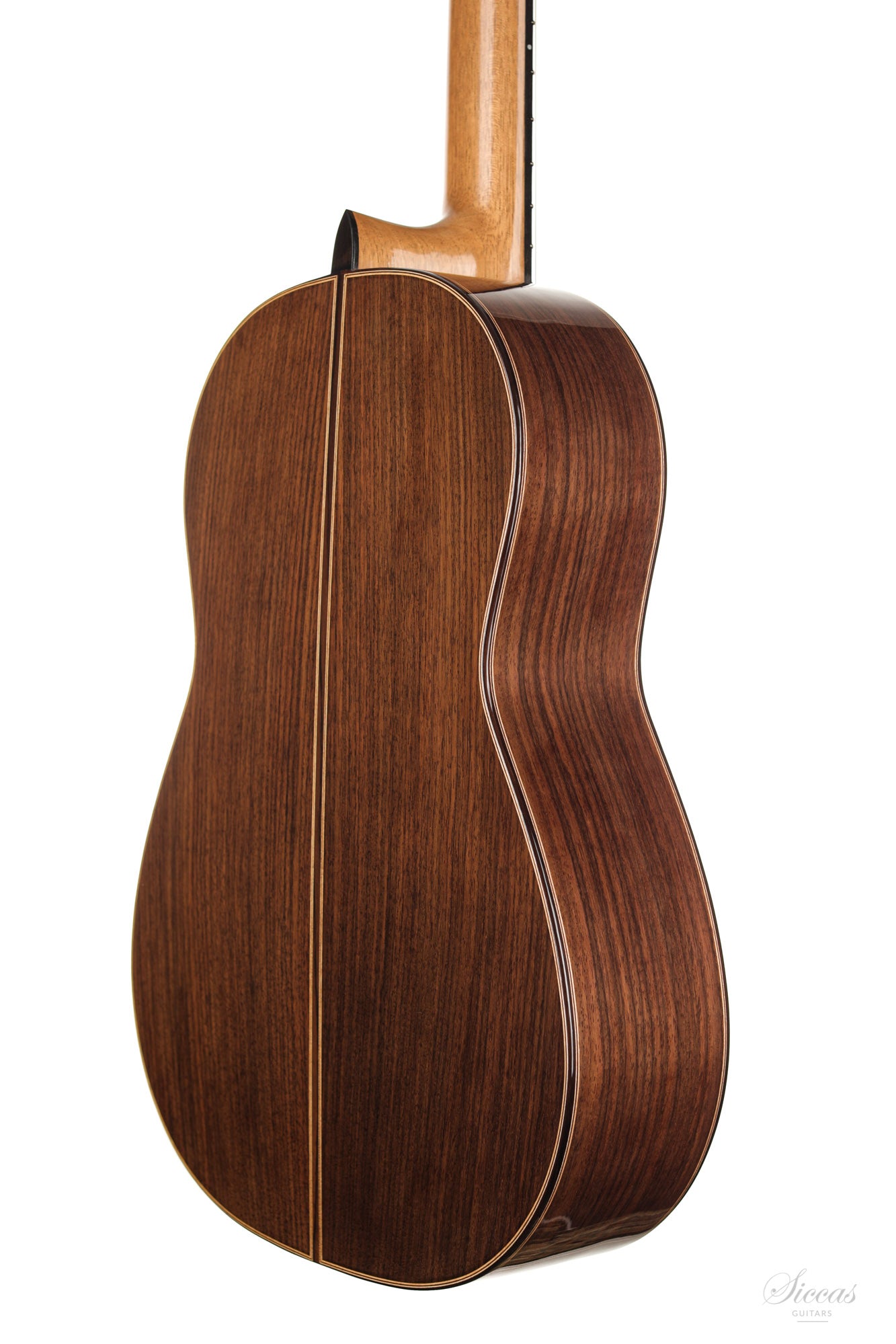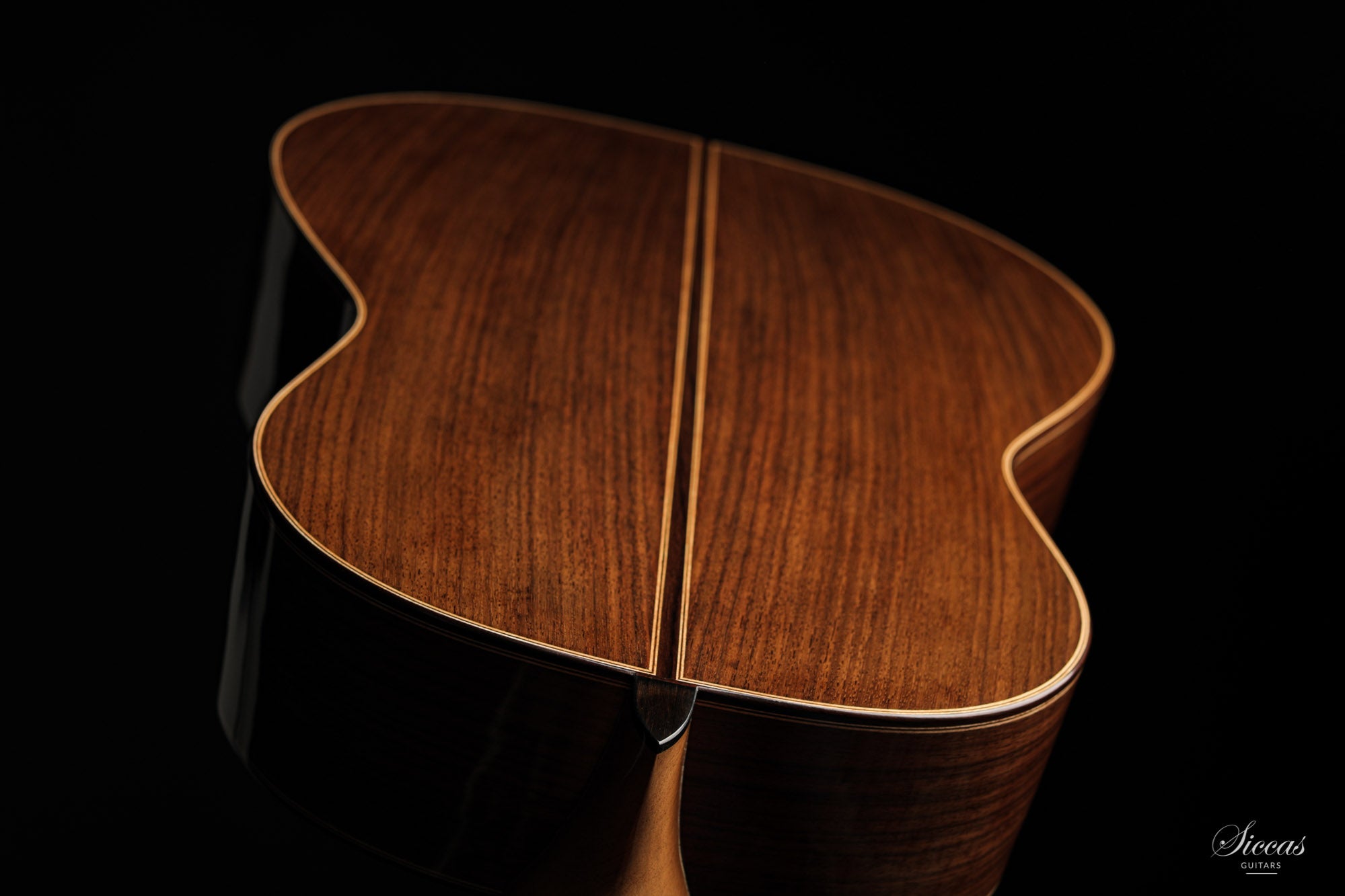 An amazing response with a big and powerful sound make this guitar a real pleasure to play. It has a wonderful palette of overtones that resonate and create a kind of echo effect. The instrument responds very well to different kinds of attack and hand position, which makes it a very accomplished concert guitar. Something that stands out about this double top is its very natural sound character. Dominik spends a lot of time perfecting the voicing of his instruments, and this one has that little something extra. Clear, rich trebles that hover towards the Gernot-Wagnerian sound, paired with strong and energetic basses. The craftsmanship is refined with a sense of wholeness that goes through the entire design in a magnificent way. Dominik uses a traditional shellac polish to create a mirror-smooth finish. In addition, the saddle and bridge bones are worked in such a way that each string is individually compensated, which greatly improves intonation.
