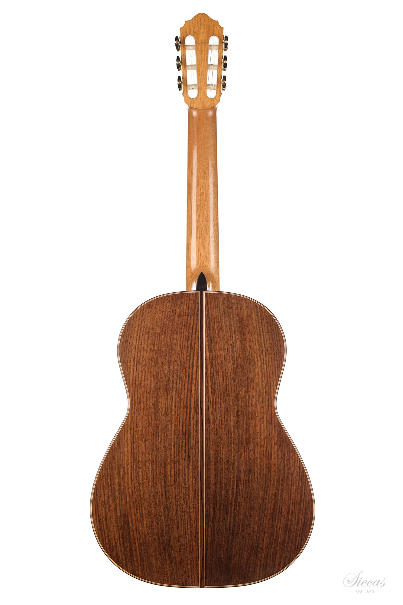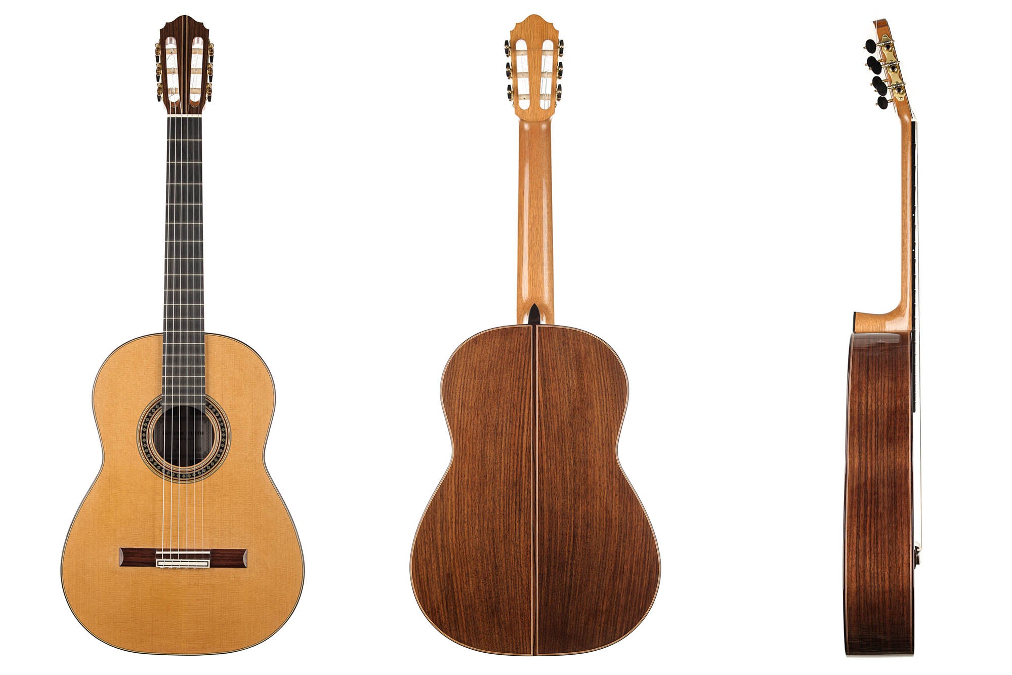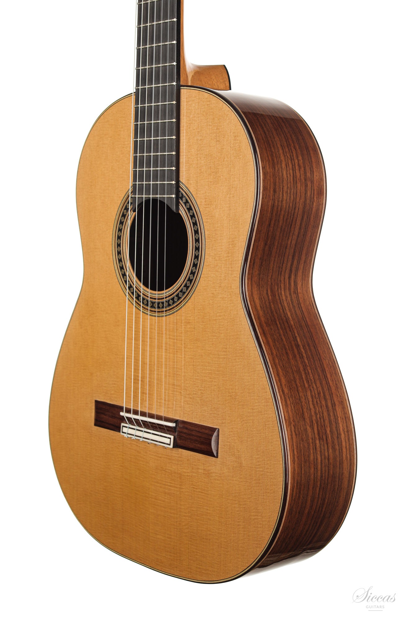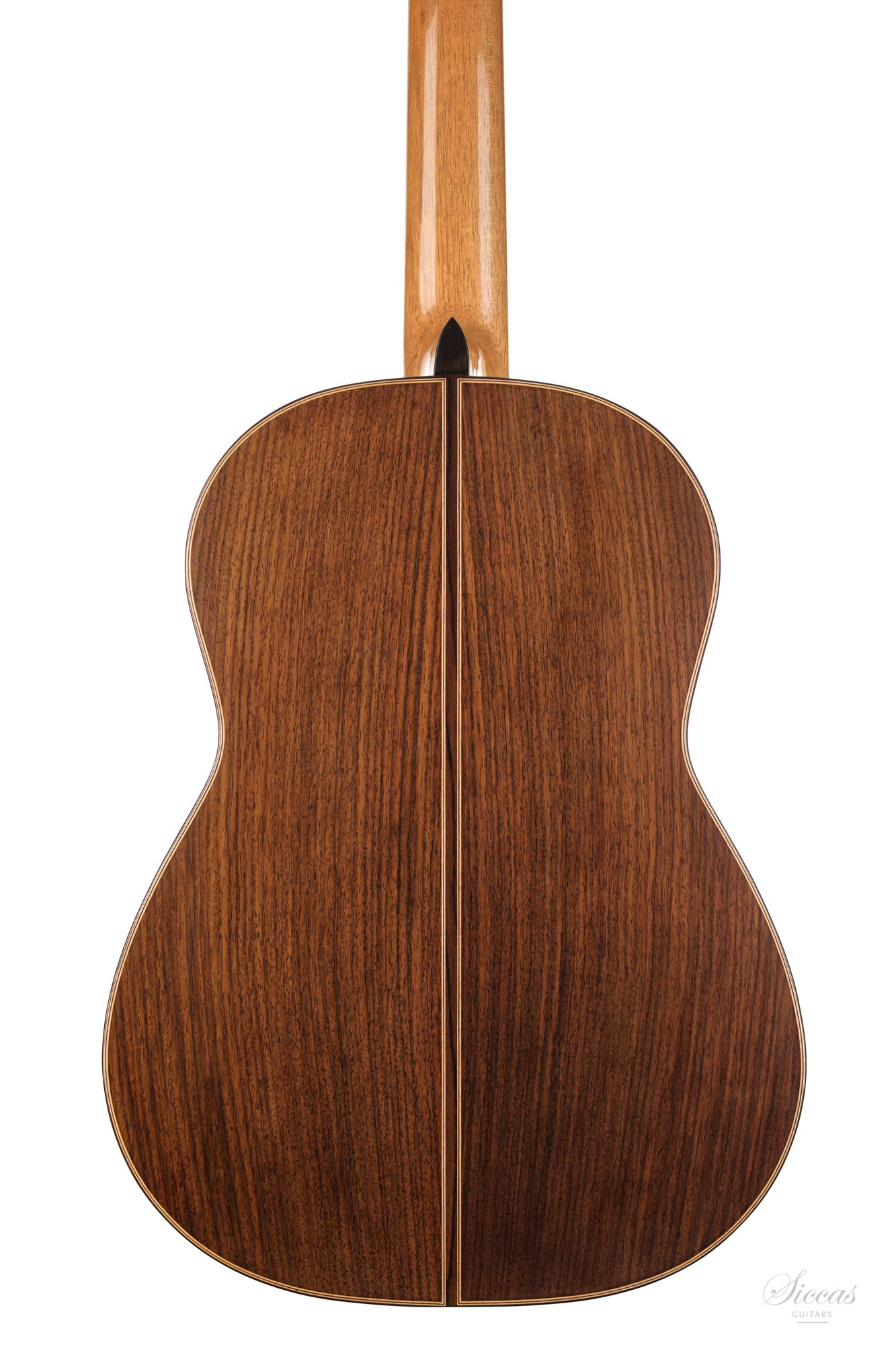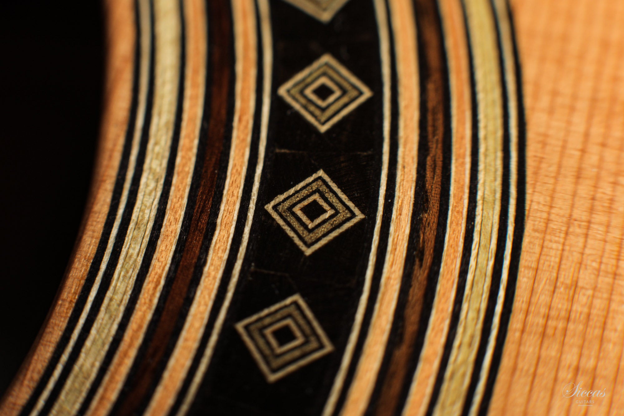 An amazing response with a big and powerful sound make this guitar a real pleasure to play. It has a wonderful palette of overtones that resonate and create a kind of echo effect. The instrument responds very well to different kinds of attack and hand position, which makes it a very accomplished concert guitar. Something that stands out about this double top is its very natural sound character. Dominik spends a lot of time perfecting the voicing of his instruments, and this one has that little something extra. Clear, rich trebles that hover towards the Gernot-Wagnerian sound, paired with strong and energetic basses. The craftsmanship is refined with a sense of wholeness that goes through the entire design in a magnificent way. Dominik uses a traditional shellac polish to create a mirror-smooth finish. In addition, the saddle and bridge bones are worked in such a way that each string is individually compensated, which greatly improves intonation.