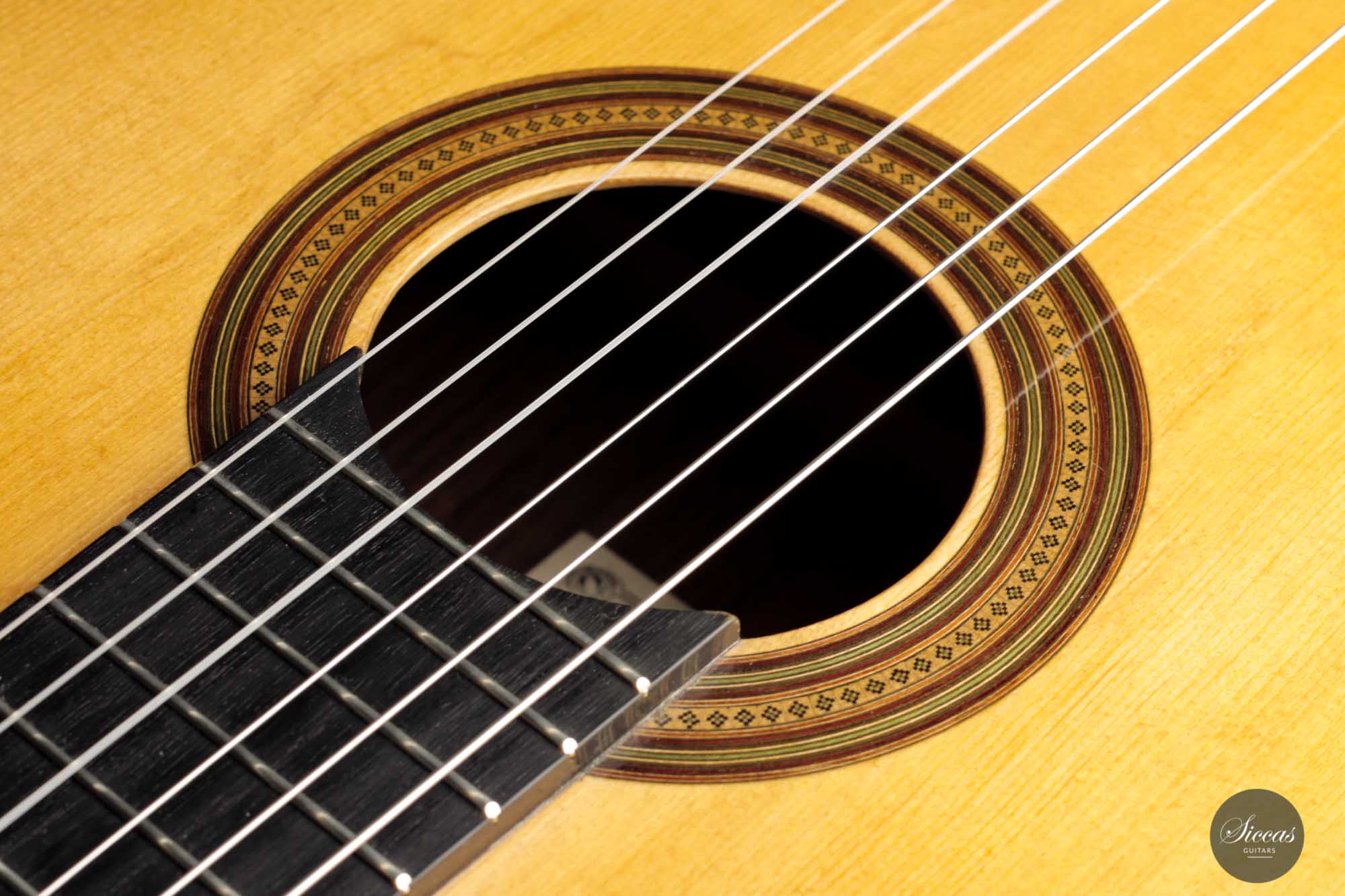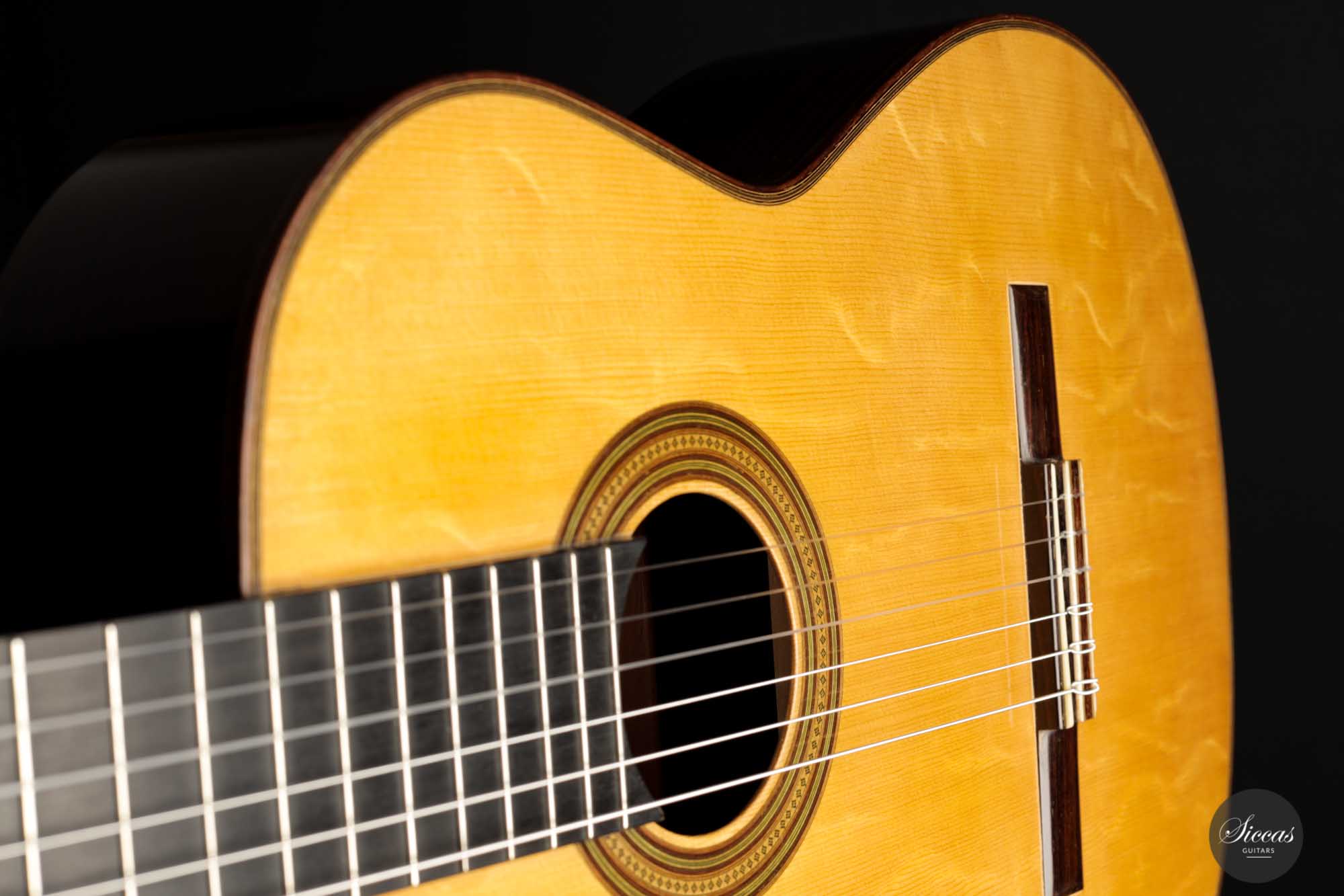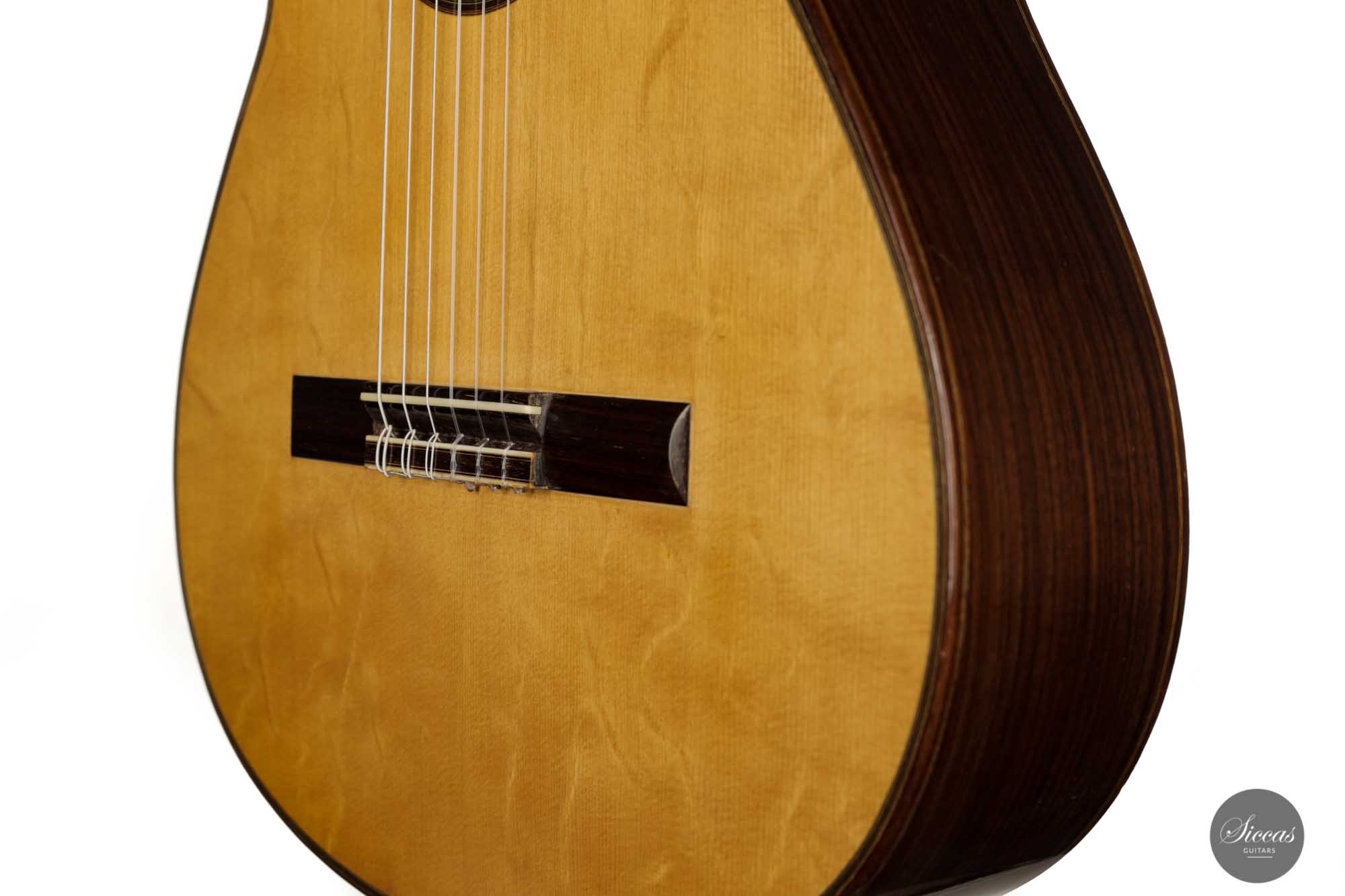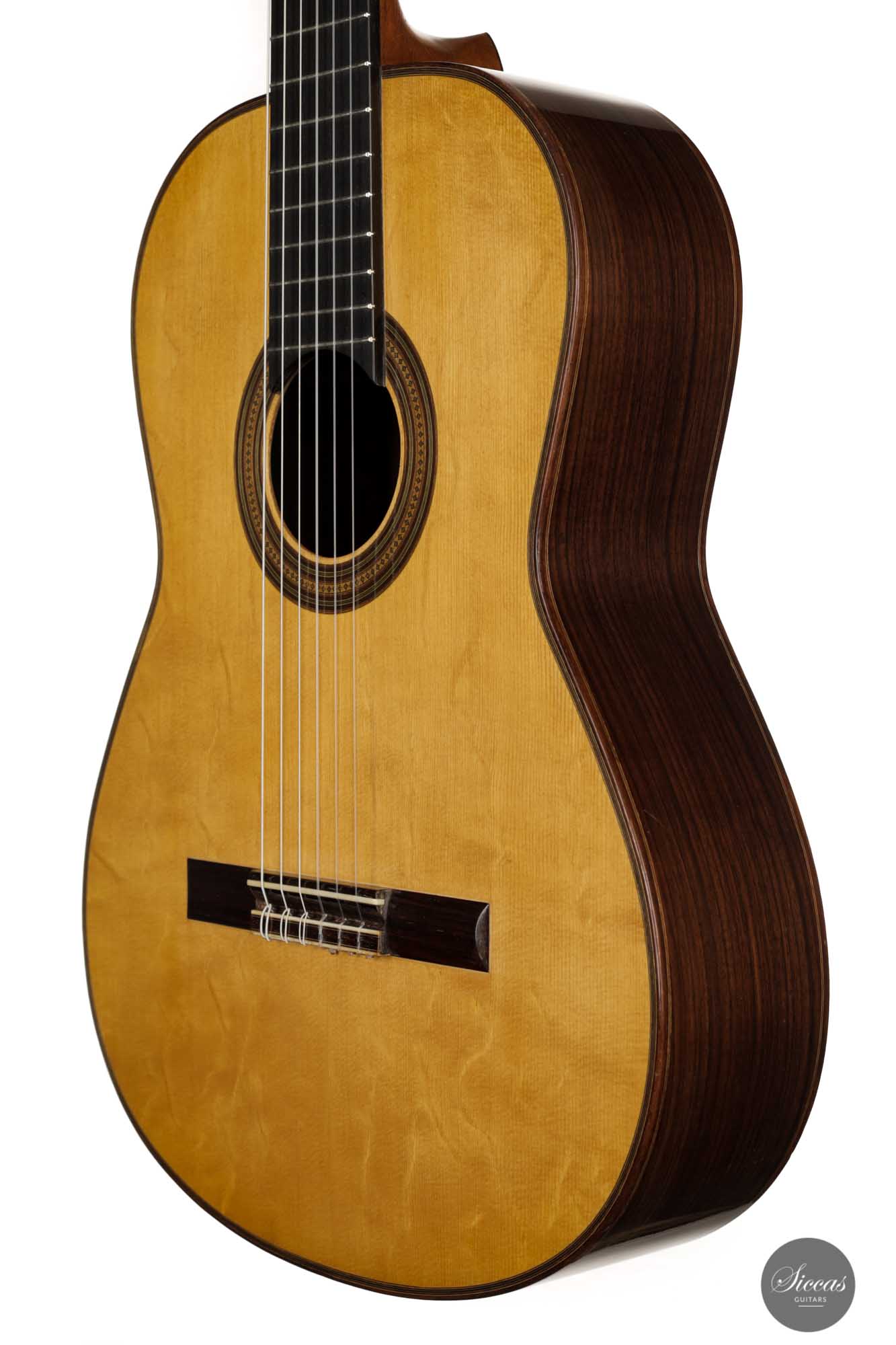 This splendid concert guitar made in 1986 bearing the number 36 is a true work of art and is immediately noticeable for its excellent condition, showing only superficial signs of playing. In addition, the spruce top shows some wonderful bear claws, and the Indian rosewood's dark color has a magnificent depth. Arguably inspired by Torres and possibly Fleta guitars with spruce tops, this instrument is built with single sides and a seven-fan bracing to which a slightly diagonal crossbar under the sound hole was added. With no reinforcement under the bridge, this guitar has a very instantaneous and straightforward sound-character but also a touching smoothness and roundness.