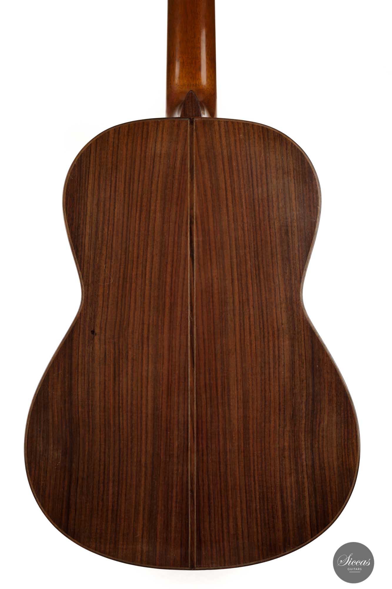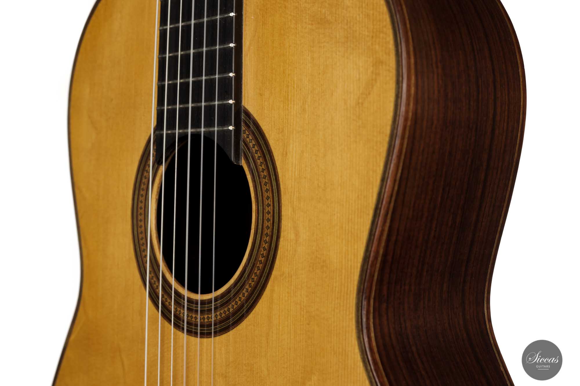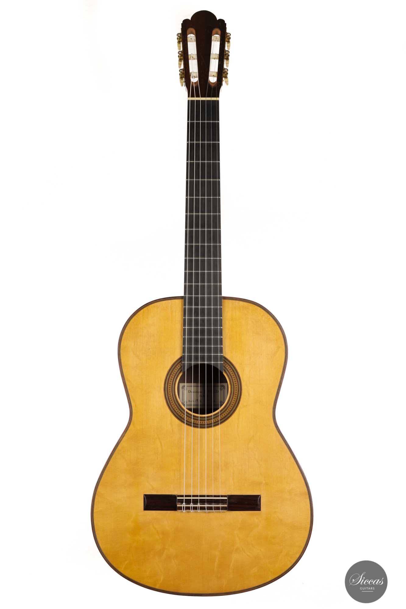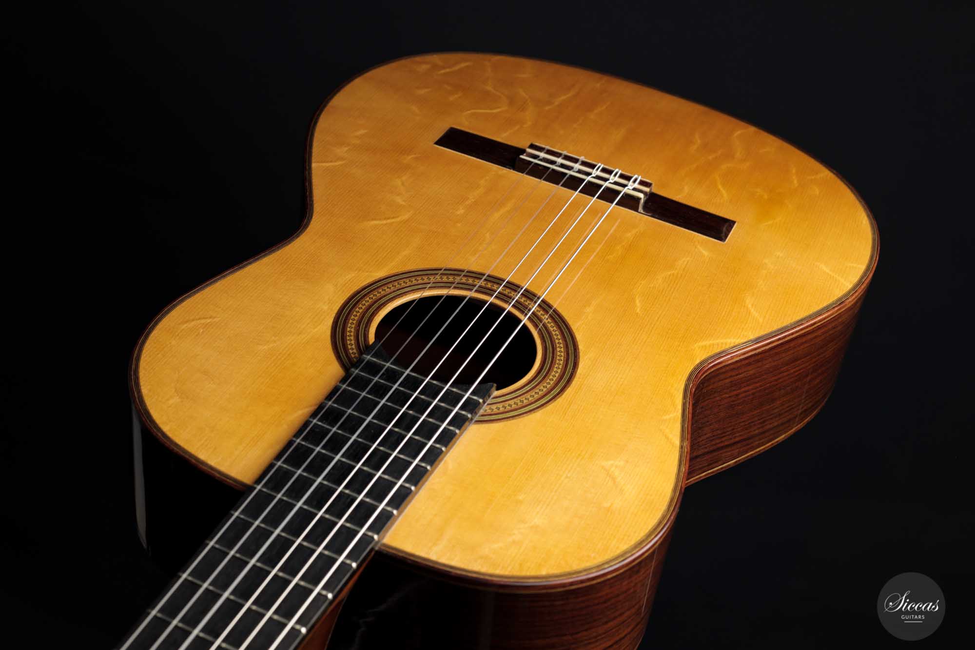 This splendid concert guitar made in 1986 bearing the number 36 is a true work of art and is immediately noticeable for its excellent condition, showing only superficial signs of playing. In addition, the spruce top shows some wonderful bear claws, and the Indian rosewood's dark color has a magnificent depth. Arguably inspired by Torres and possibly Fleta guitars with spruce tops, this instrument is built with single sides and a seven-fan bracing to which a slightly diagonal crossbar under the sound hole was added. With no reinforcement under the bridge, this guitar has a very instantaneous and straightforward sound-character but also a touching smoothness and roundness.