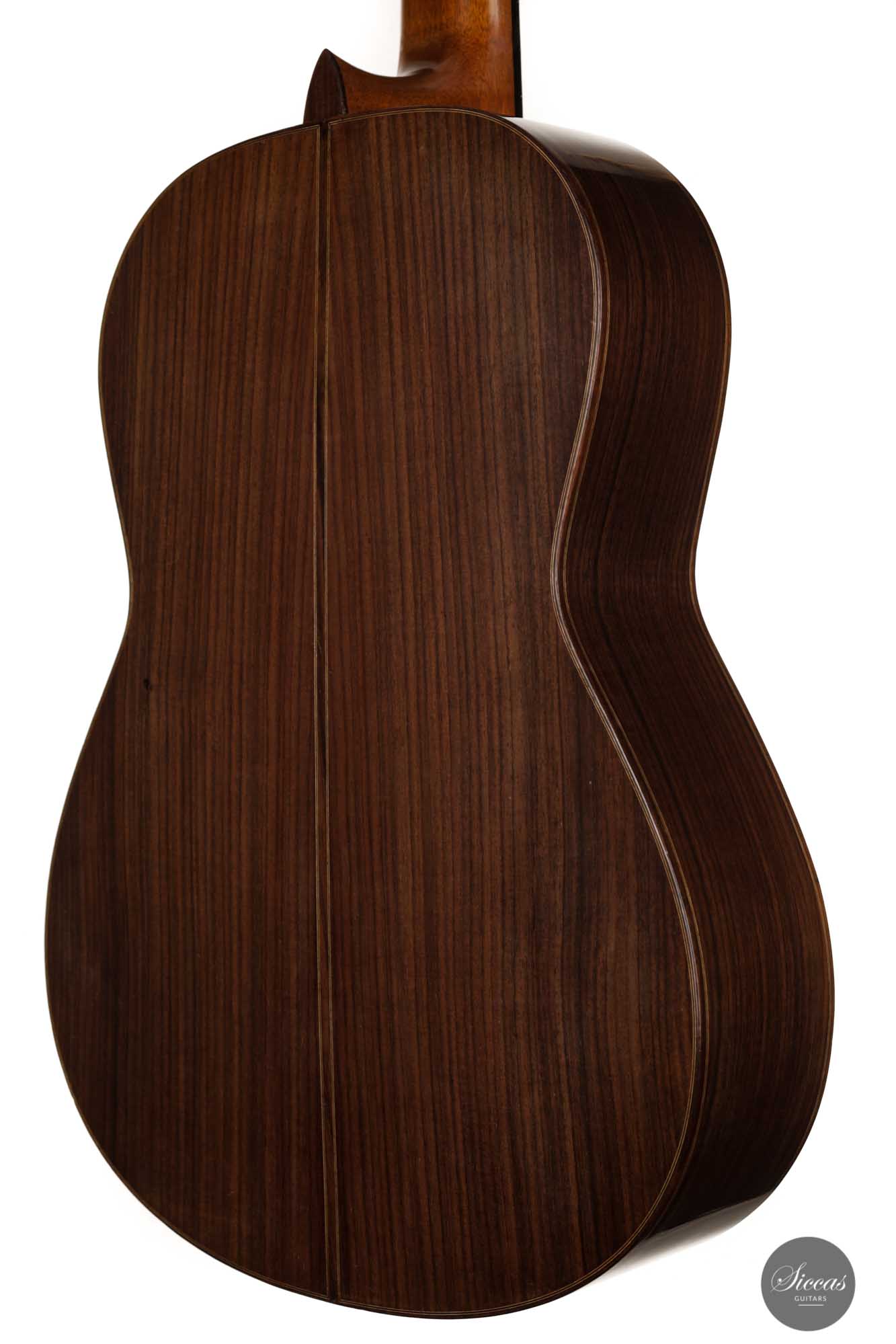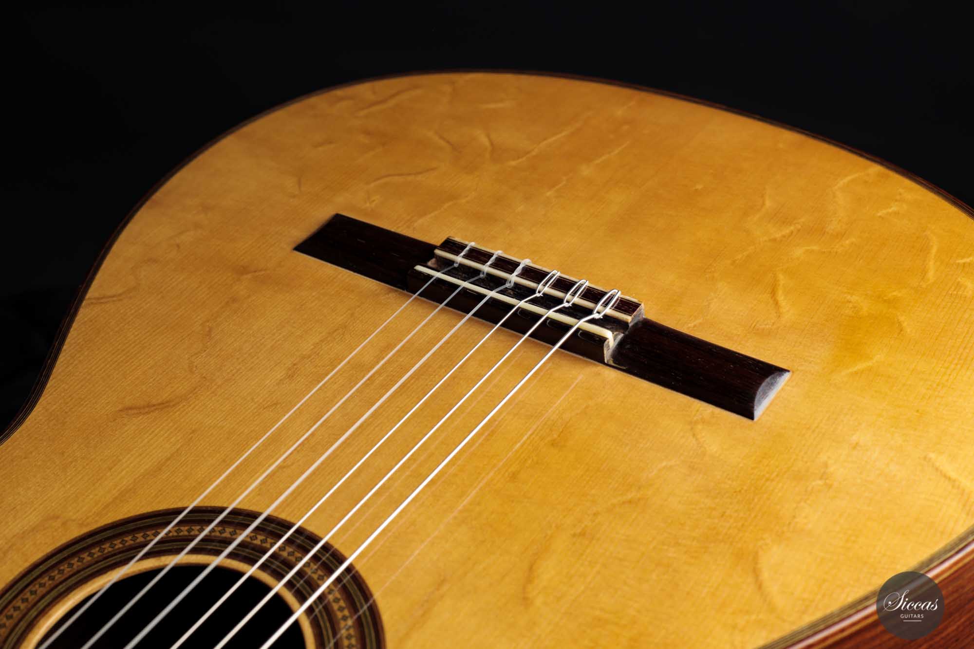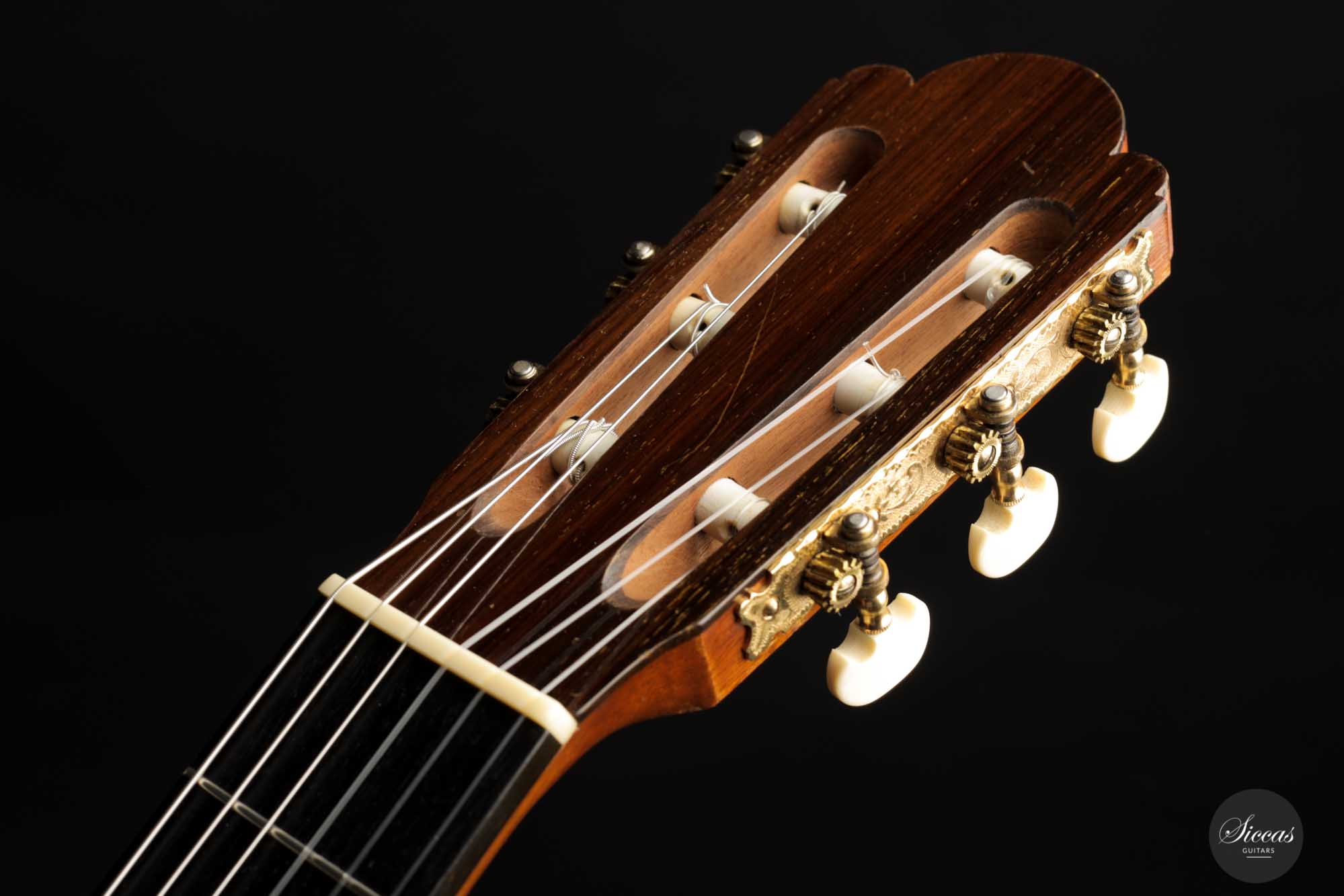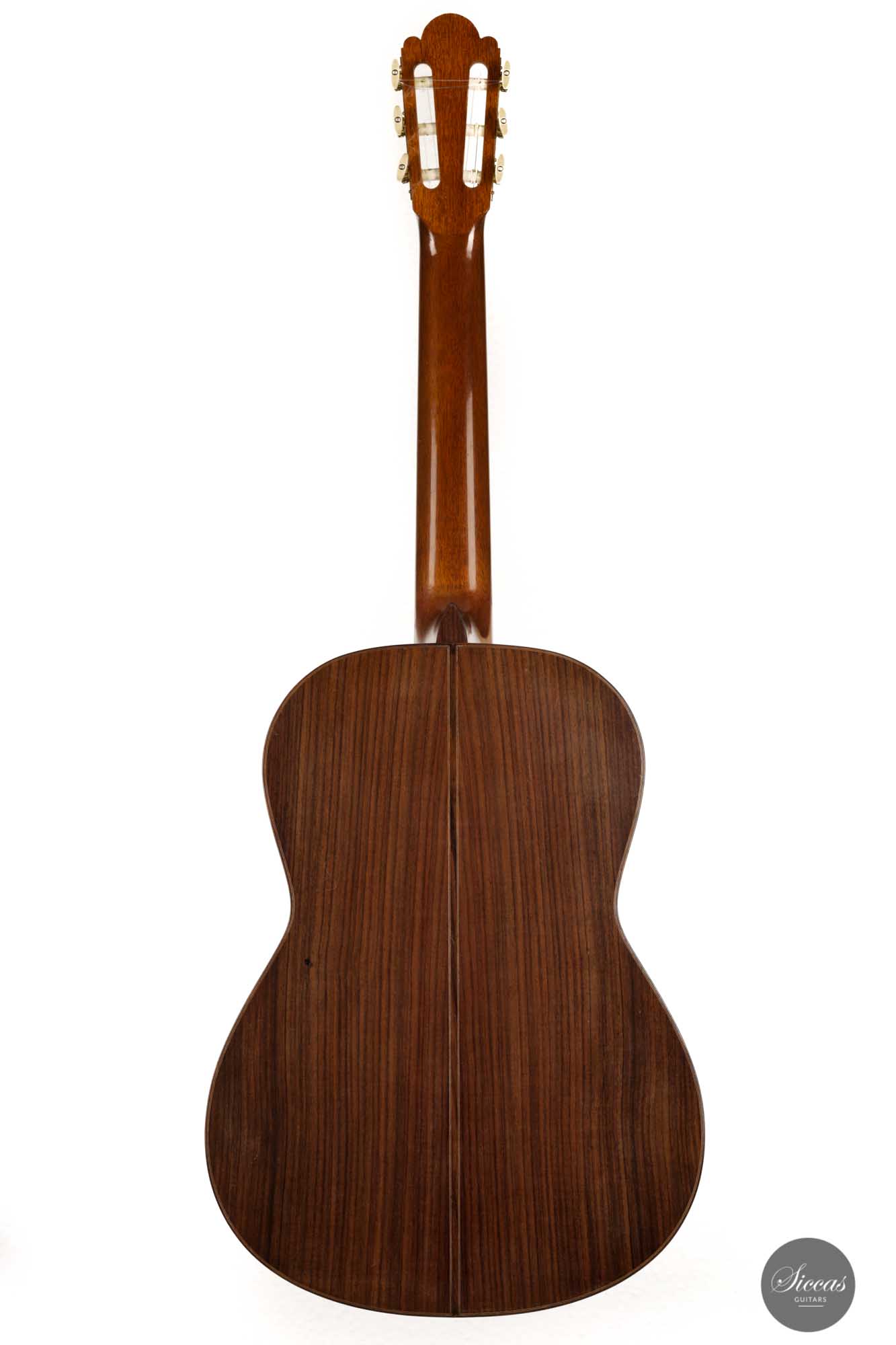 This splendid concert guitar made in 1986 bearing the number 36 is a true work of art and is immediately noticeable for its excellent condition, showing only superficial signs of playing. In addition, the spruce top shows some wonderful bear claws, and the Indian rosewood's dark color has a magnificent depth. Arguably inspired by Torres and possibly Fleta guitars with spruce tops, this instrument is built with single sides and a seven-fan bracing to which a slightly diagonal crossbar under the sound hole was added. With no reinforcement under the bridge, this guitar has a very instantaneous and straightforward sound-character but also a touching smoothness and roundness.