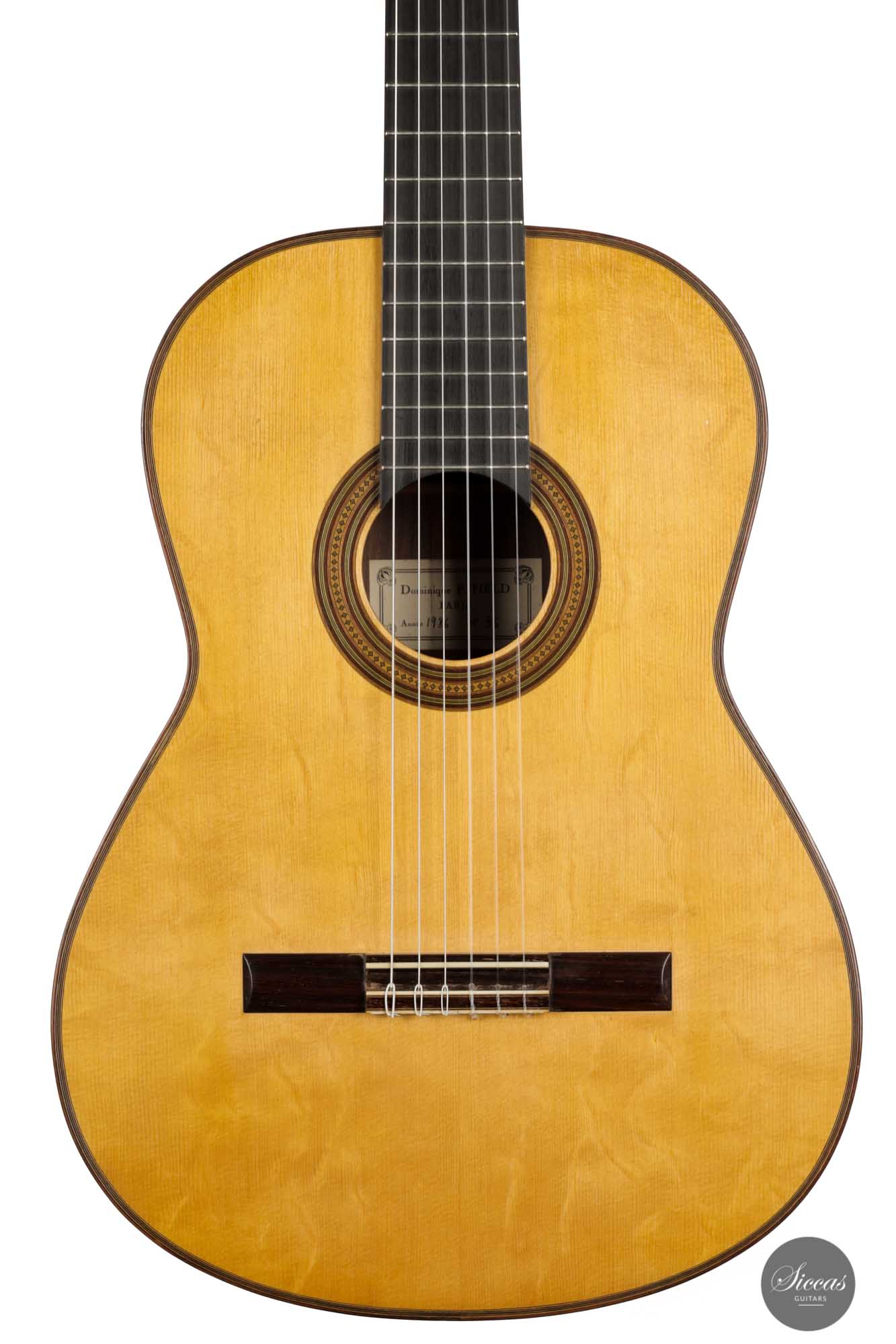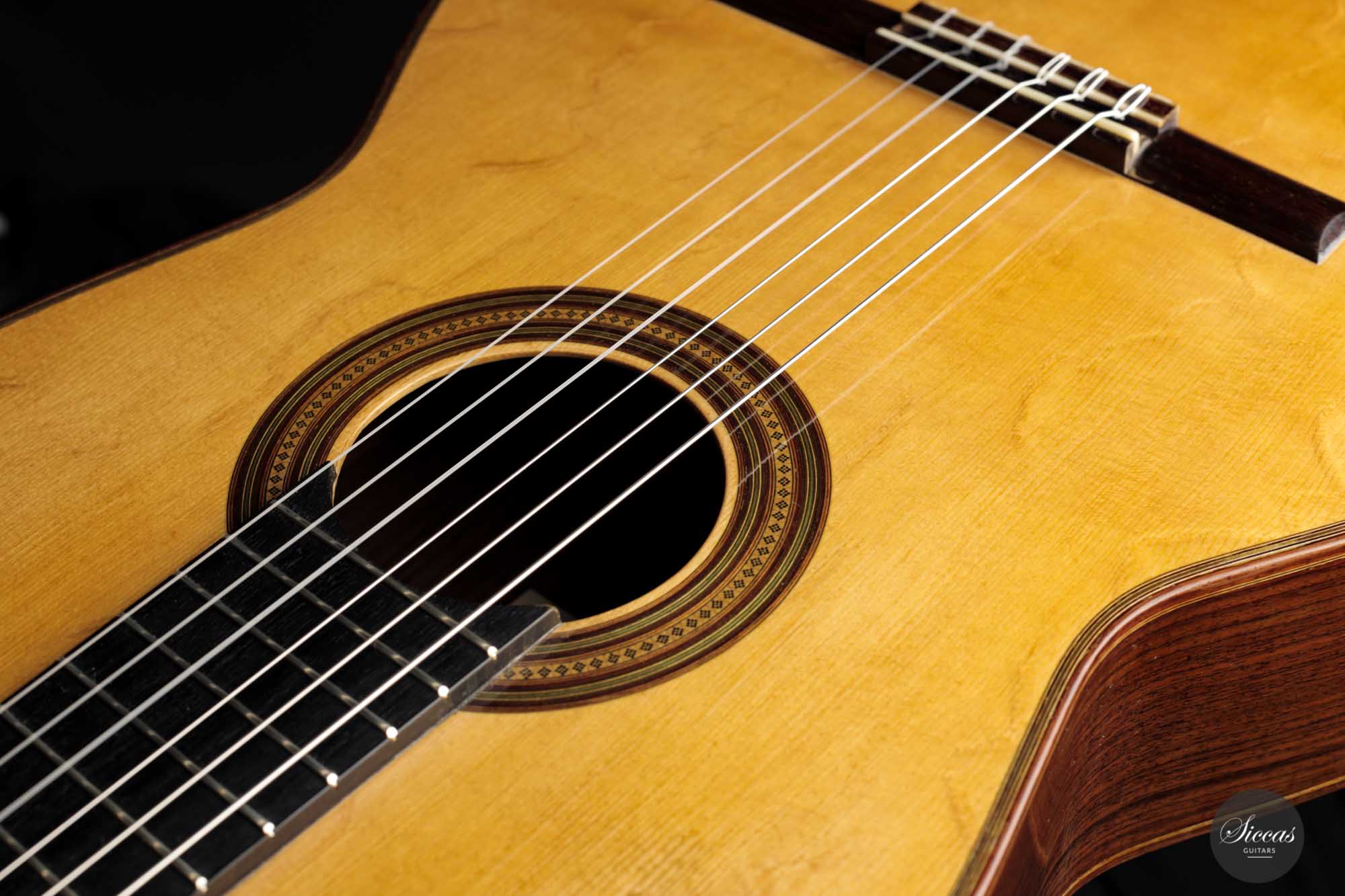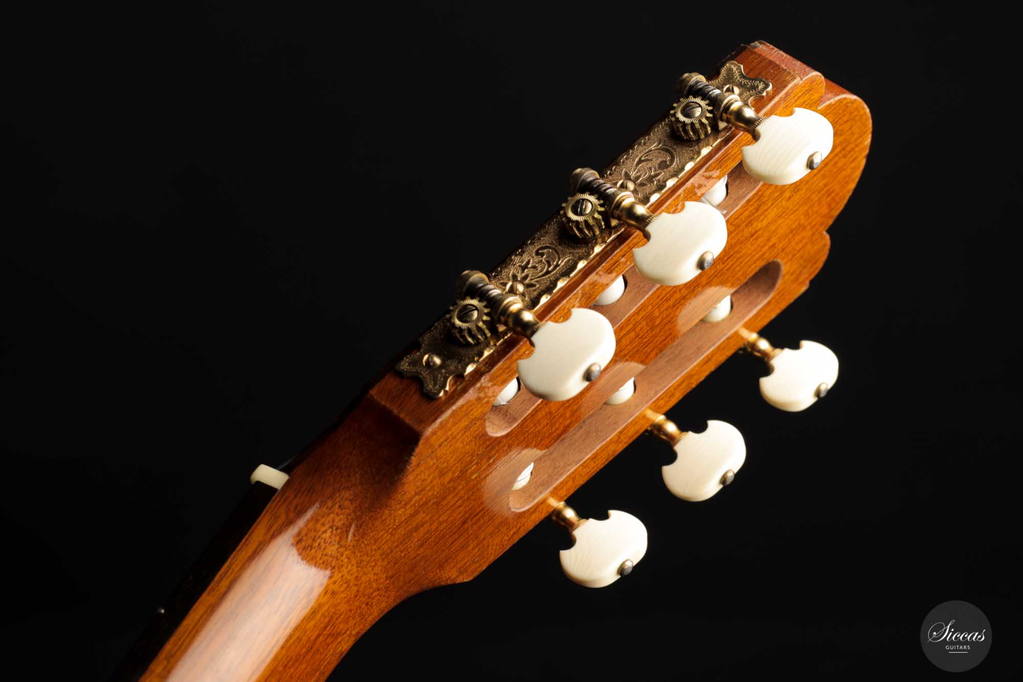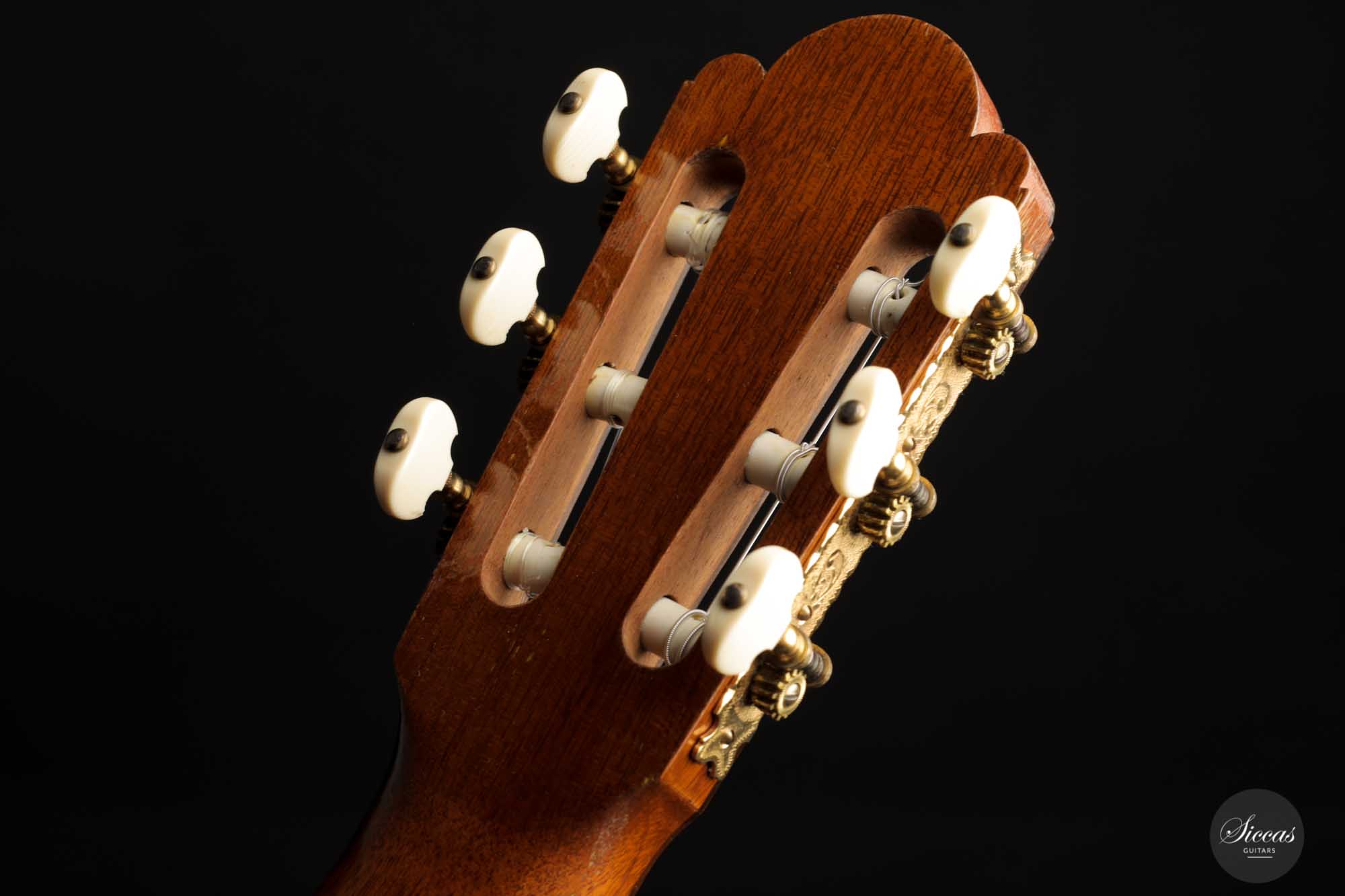 This splendid concert guitar made in 1986 bearing the number 36 is a true work of art and is immediately noticeable for its excellent condition, showing only superficial signs of playing. In addition, the spruce top shows some wonderful bear claws, and the Indian rosewood's dark color has a magnificent depth. Arguably inspired by Torres and possibly Fleta guitars with spruce tops, this instrument is built with single sides and a seven-fan bracing to which a slightly diagonal crossbar under the sound hole was added. With no reinforcement under the bridge, this guitar has a very instantaneous and straightforward sound-character but also a touching smoothness and roundness.