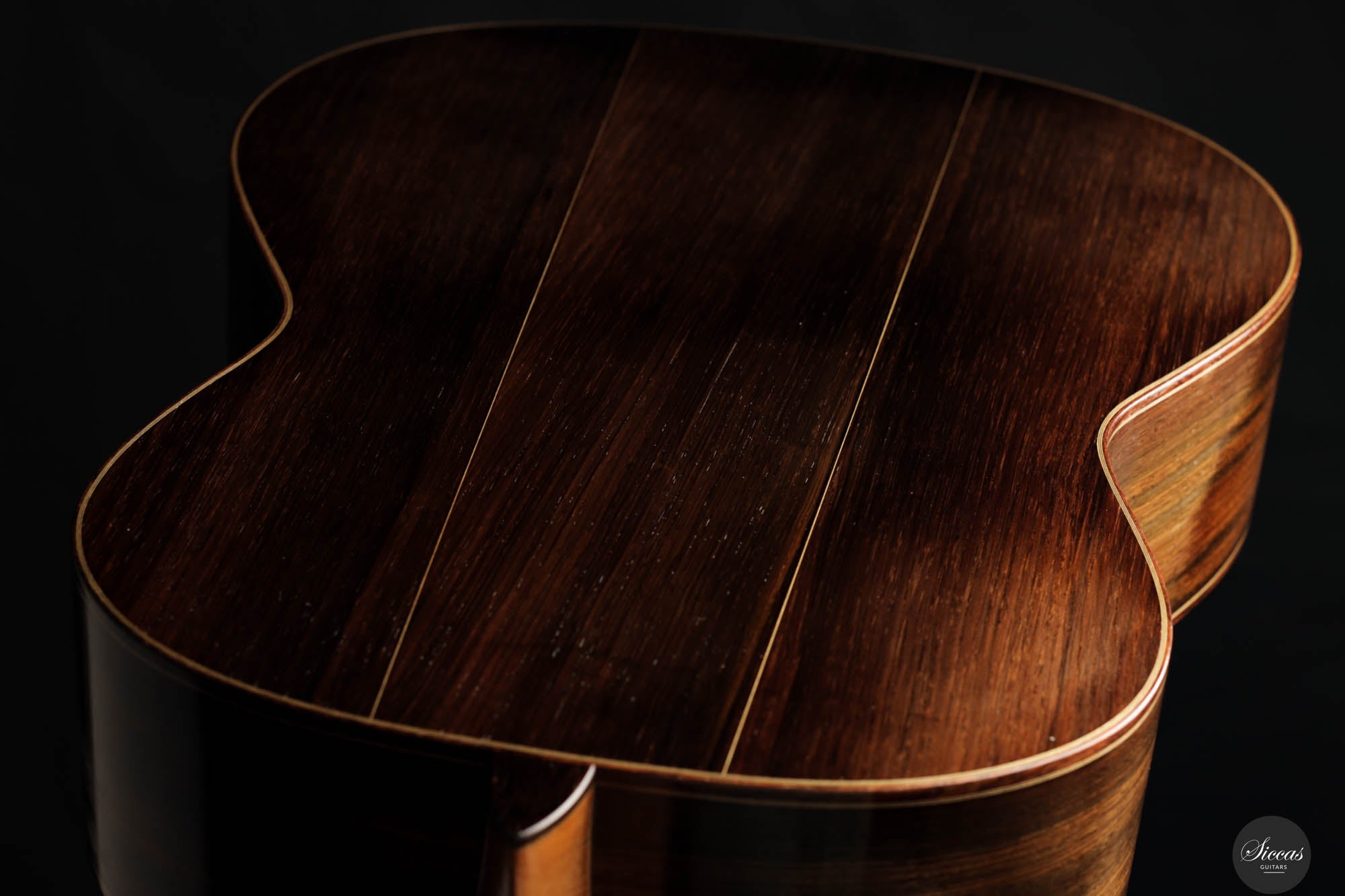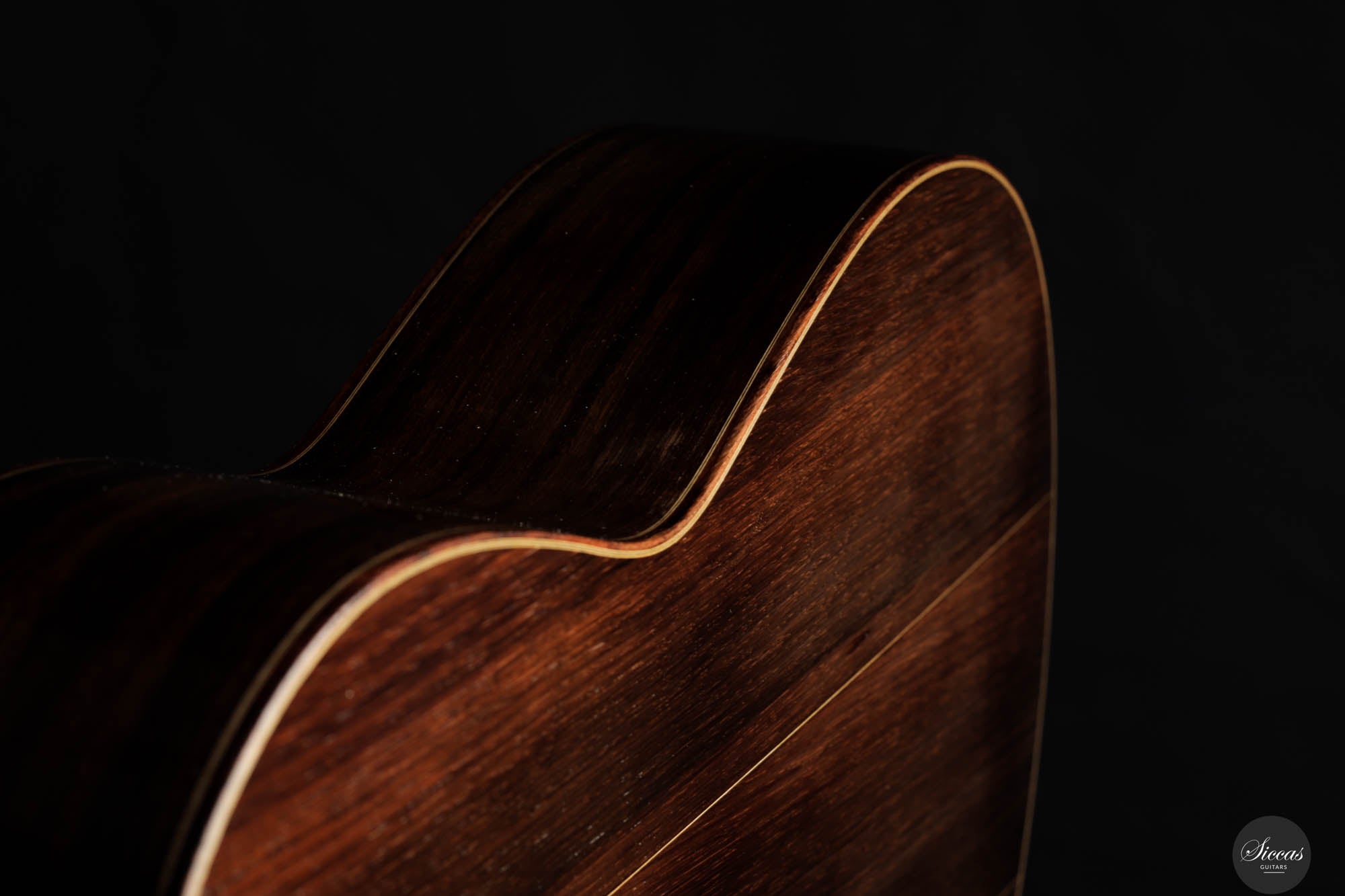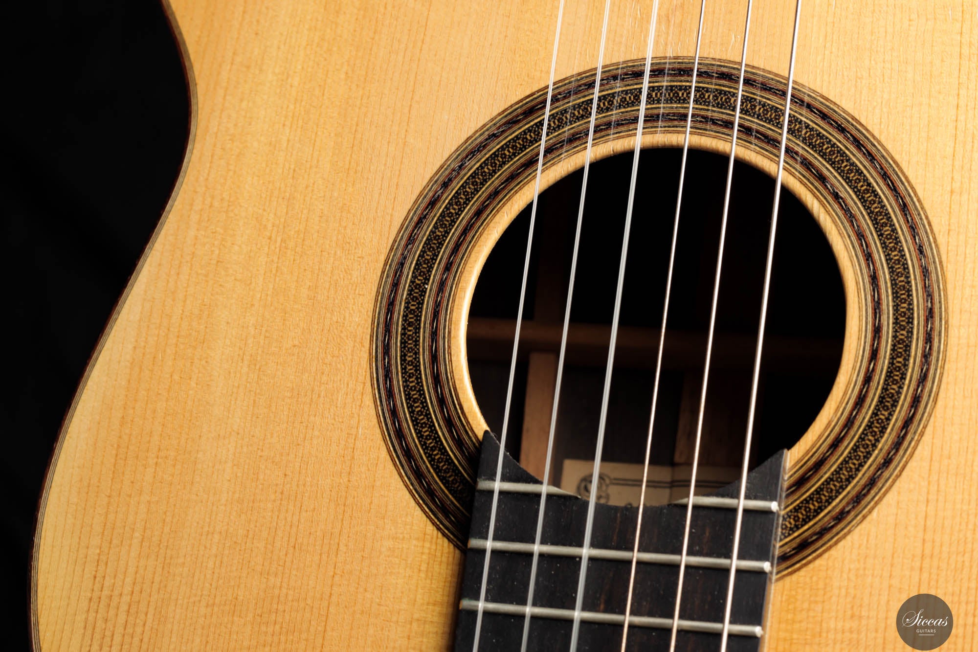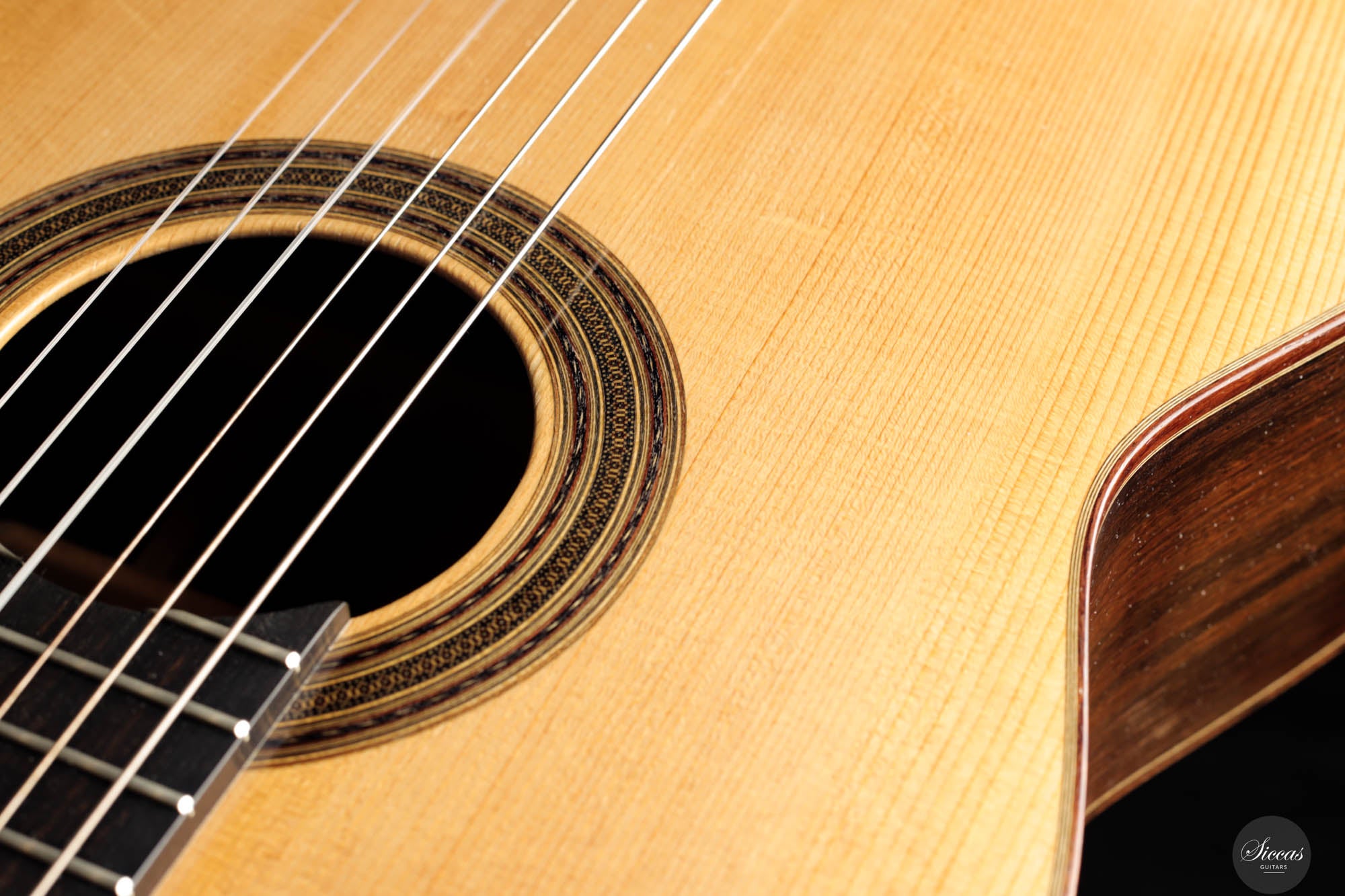 This 2007 Dominique Field guitar, a testament to exquisite craftsmanship, has been played regularly yet remains in very good condition, a mark of its enduring quality. Free from cracks or repairs, it only shows light signs of use, which contribute to its character without detracting from its beauty. The back and sides are crafted from stunning Madagascar rosewood, while the finely scaled spruce top has naturally darkened over the years, acquiring a captivating honey-colored hue. This aging process not only enhances the guitar's visual appeal but also speaks to the rich history embedded within its strings.