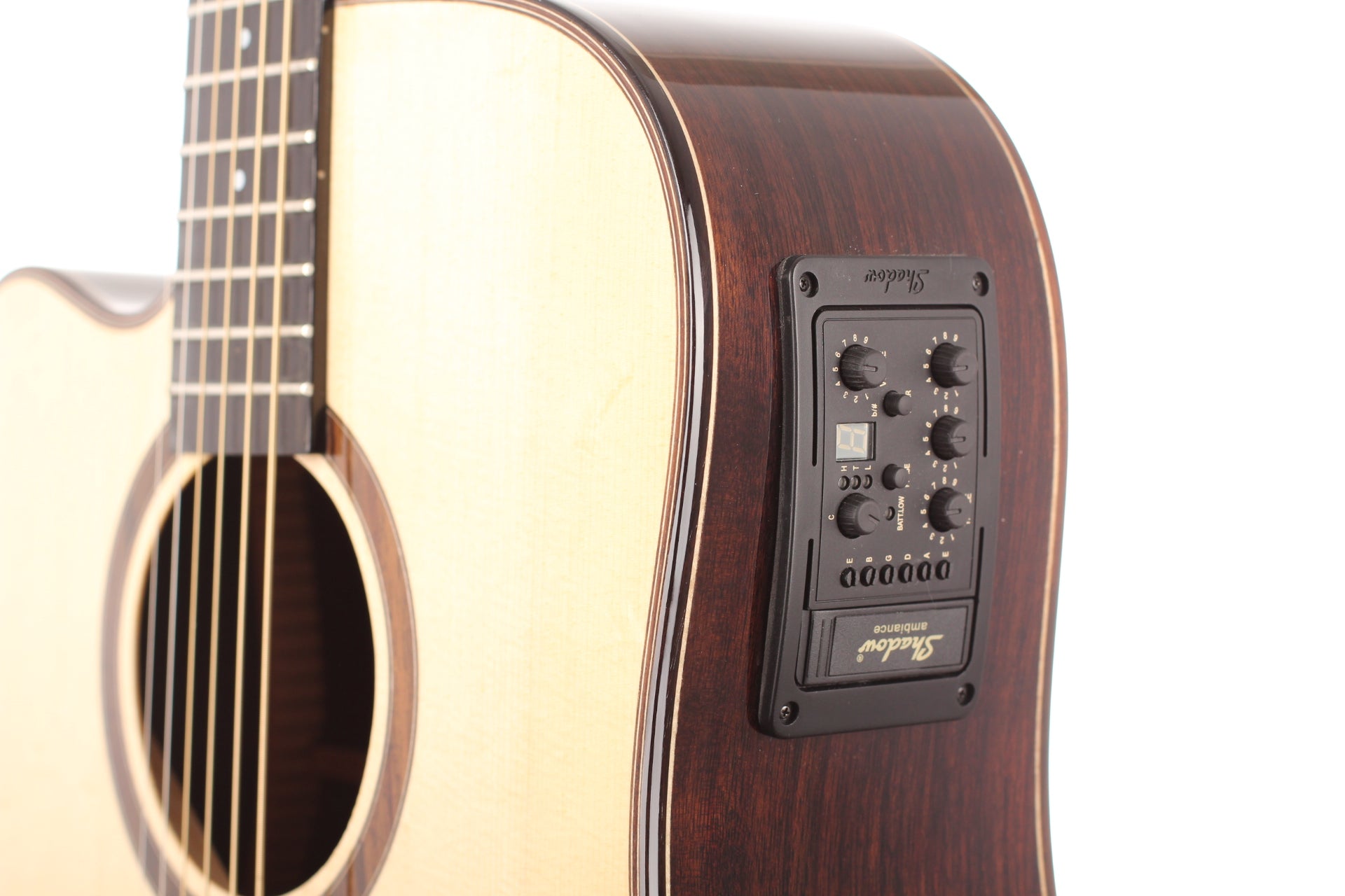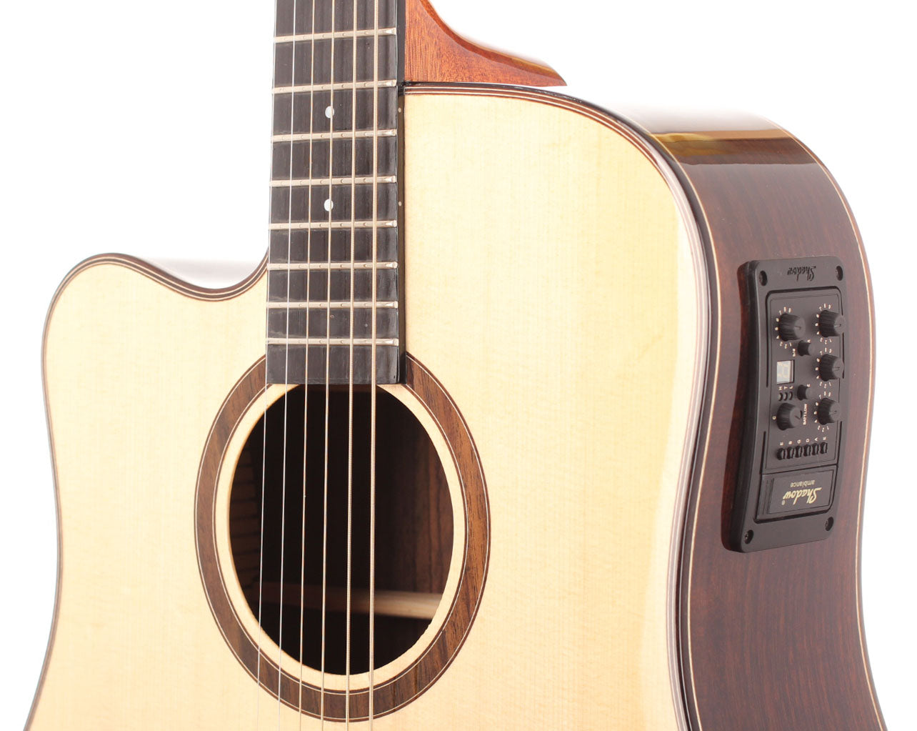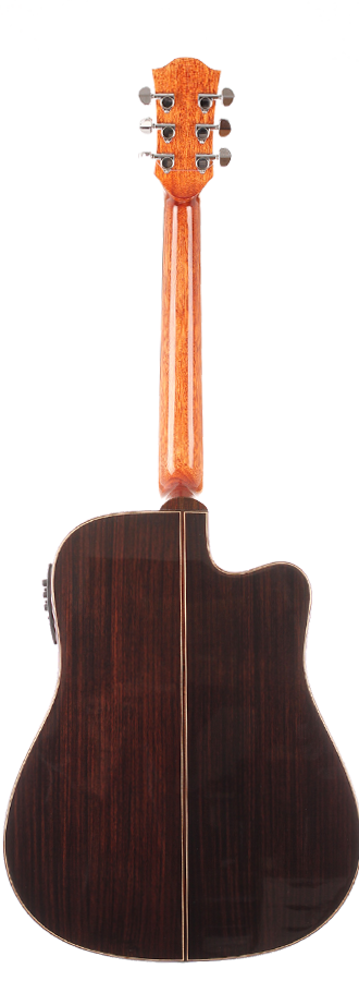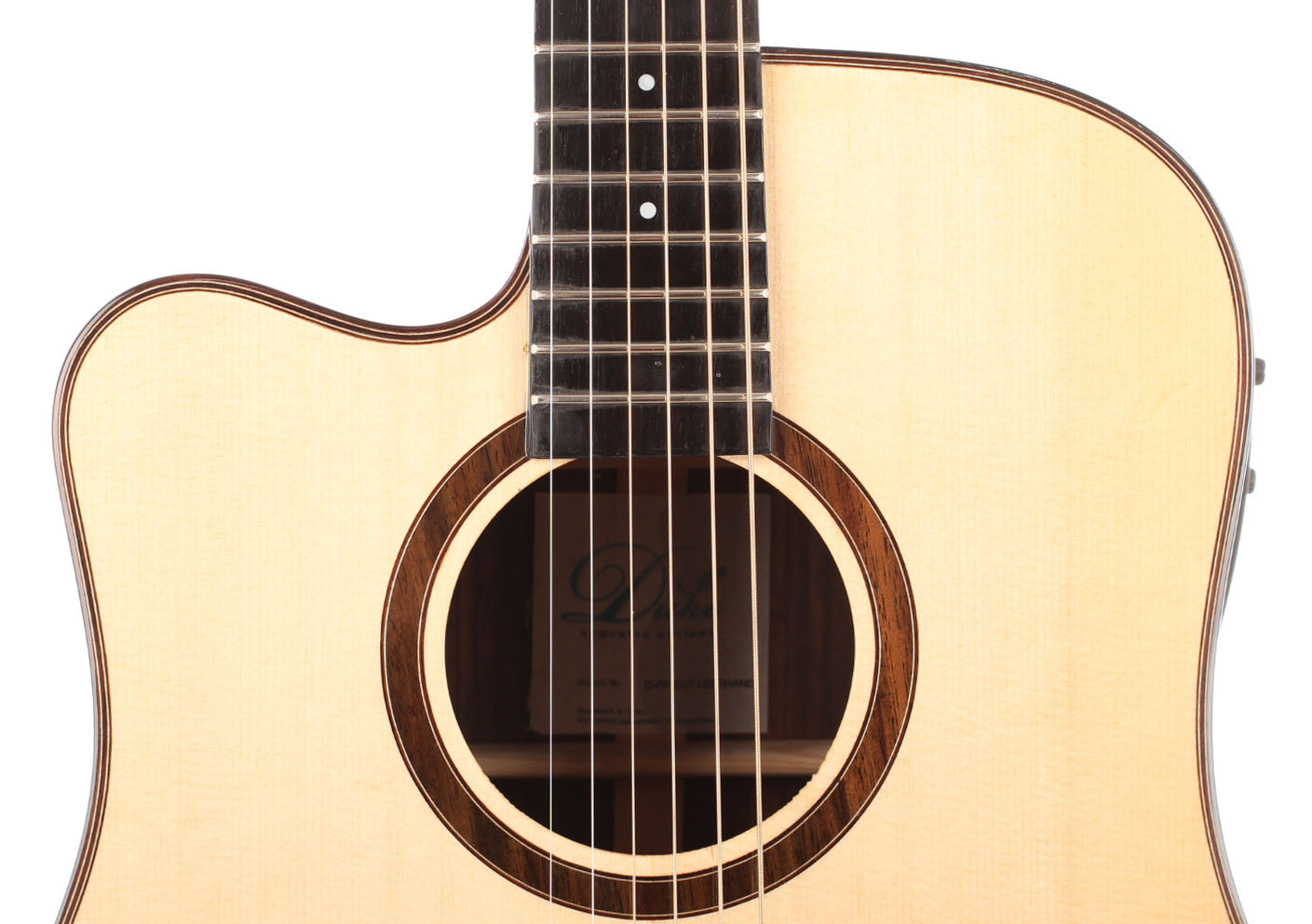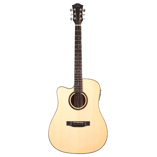 This Duke Dreadnought with cutaway guitar has an exceptional quality. It has a very powerful and equilibrated sound. This guitar is perfect for beginners and also professional players. The Duke D-PF-Cut-Solid guitar has a solid spruce top and back and sides that are made of Indian rosewood. The guitars are refined with a high gloss finish. Included is a gig-bag by Duke.