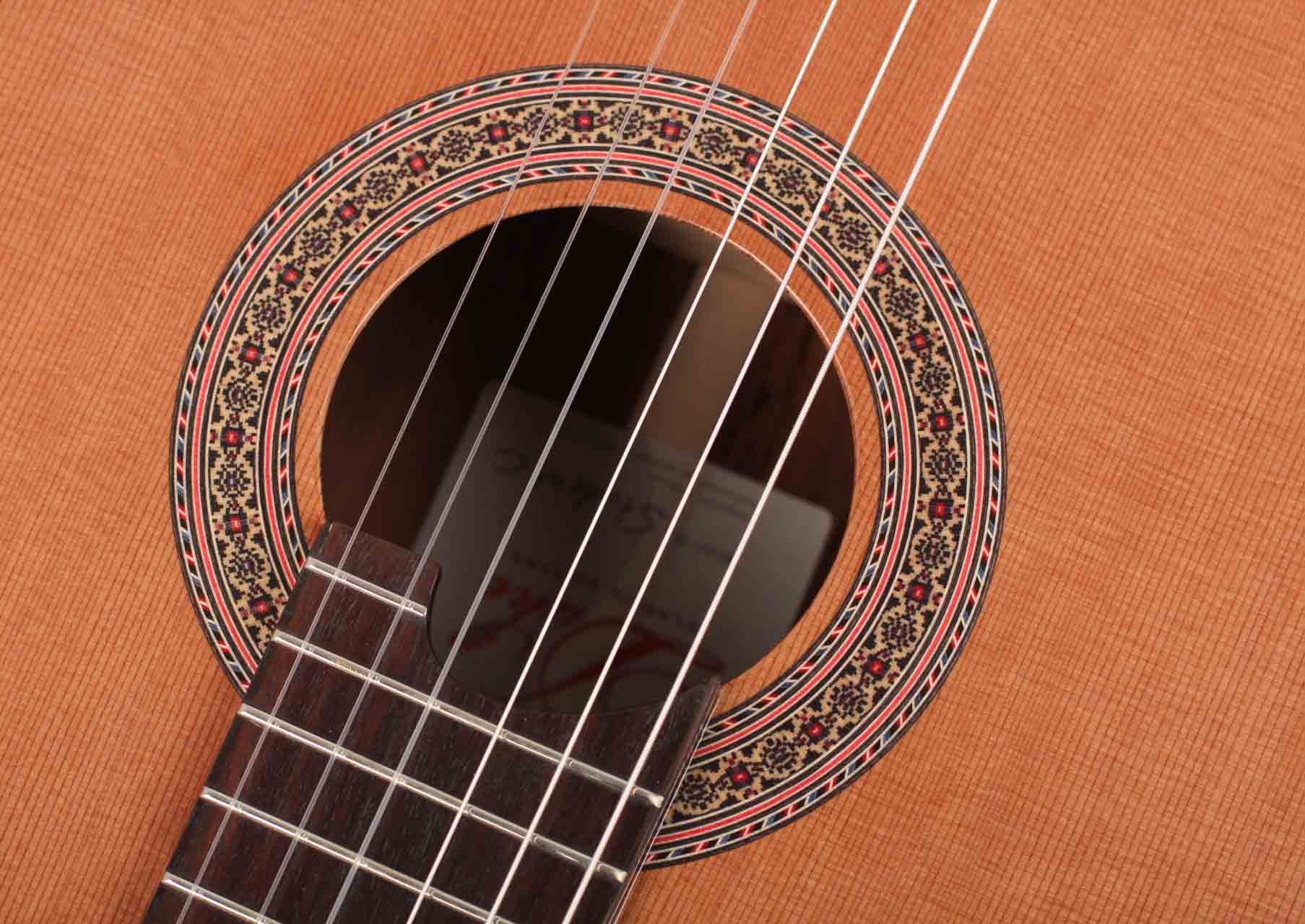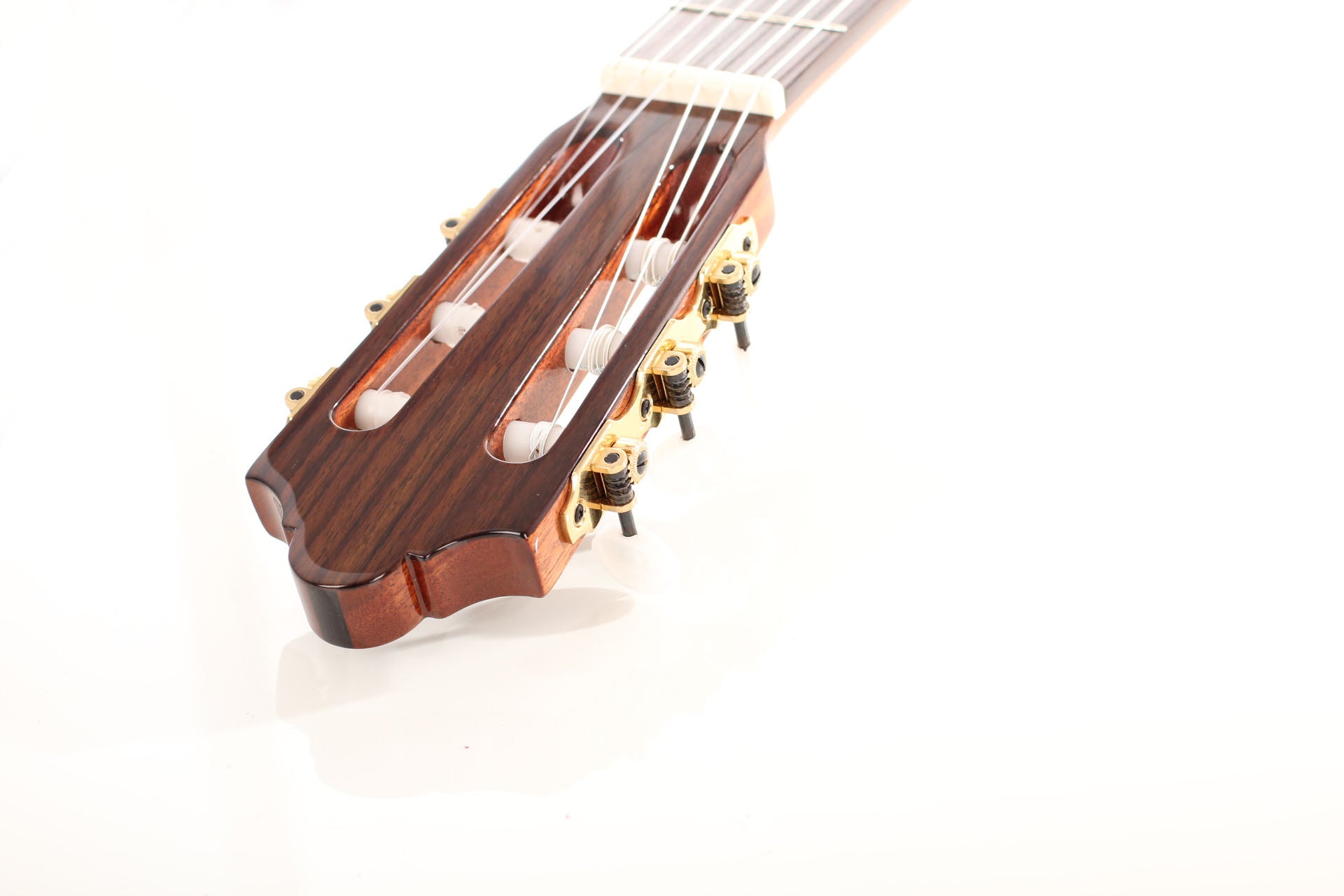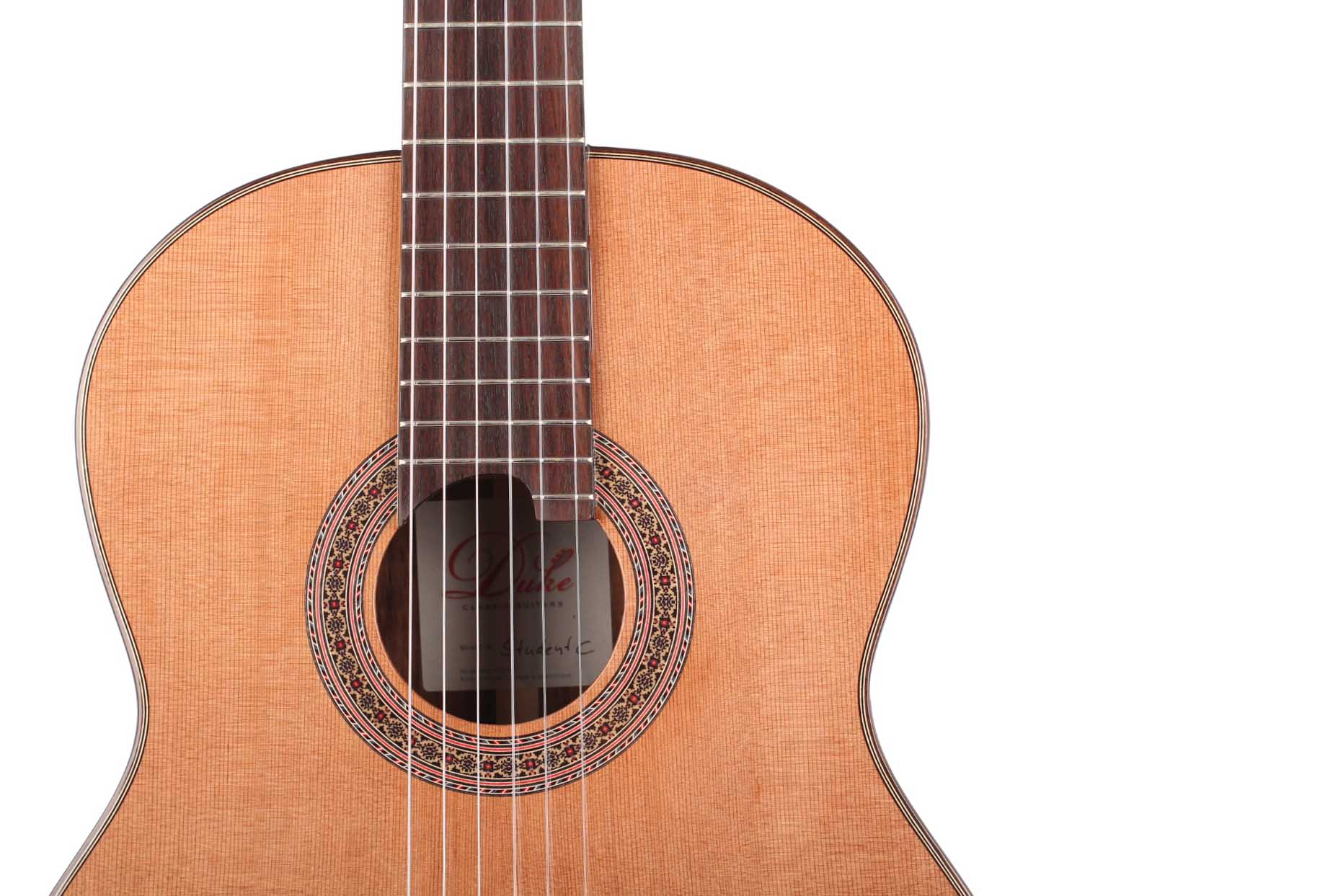 This Duke Student C model has a scale of 65 cm. The top is made of very fine solid cedar, back and sides are made of laminated Indian Rosewood. The neck is made of cedro and is reinforced in the middle of the neck with Indian rosewood. The machine heads are R1 by Rubner. The guitars are refined with a high gloss finish.