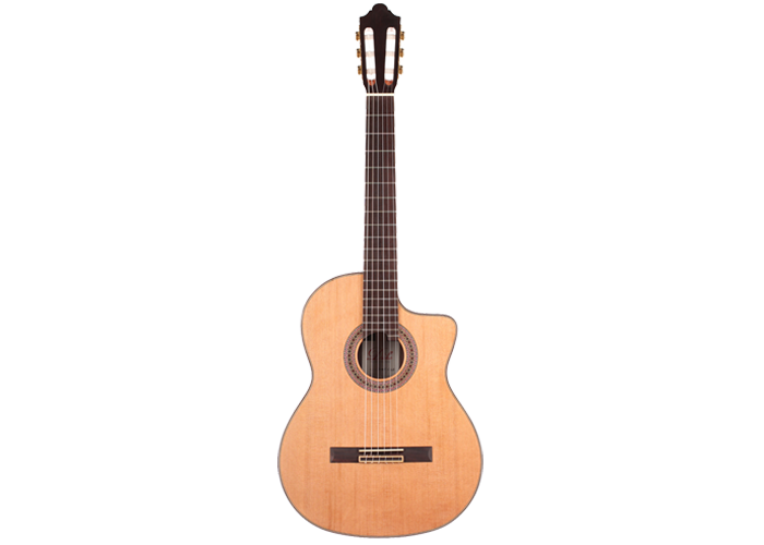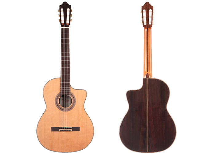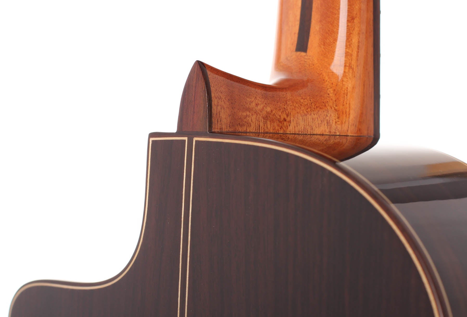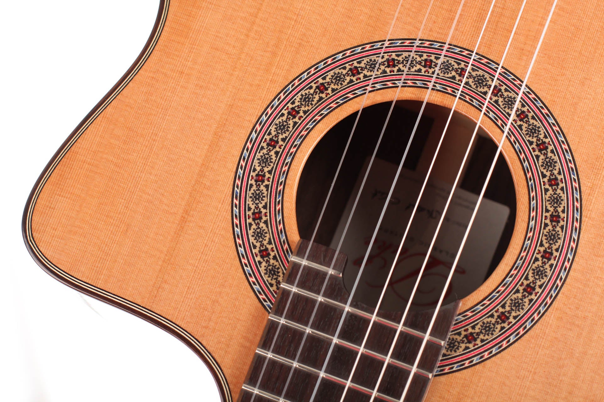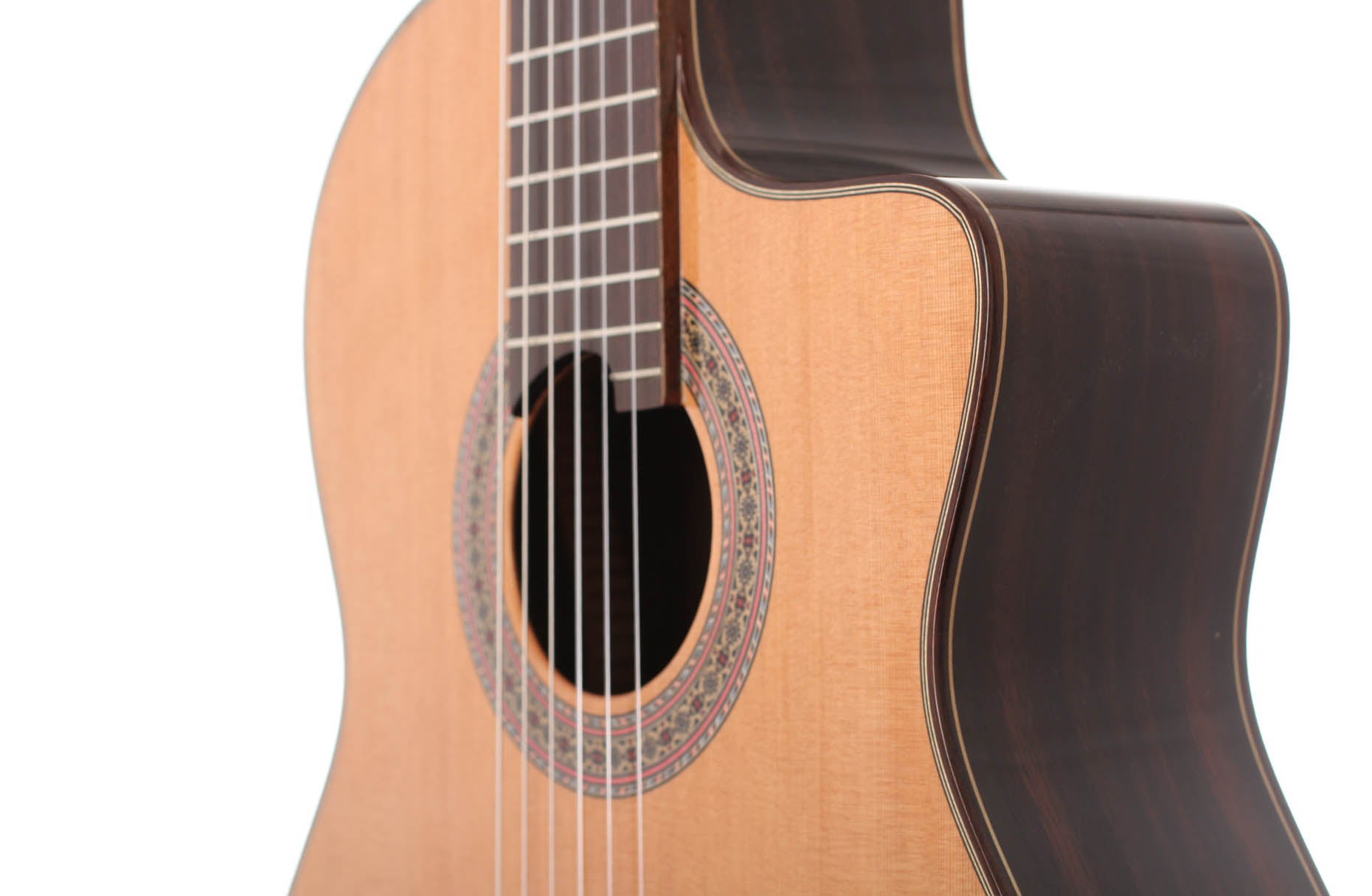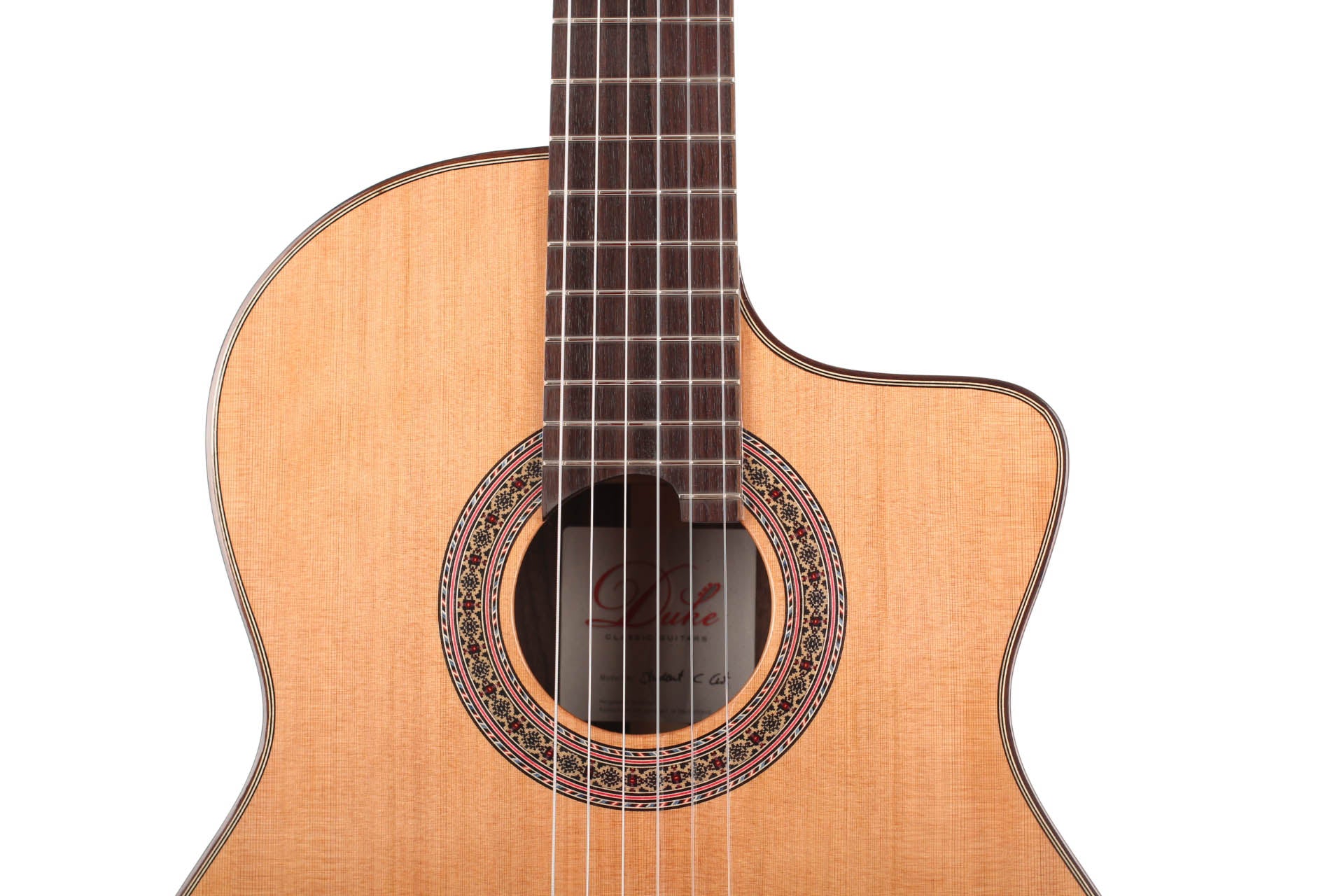 This Duke Student C model has a scale of 65 cm. The top is made of very fine solid cedar, back and sides are made of laminated Indian Rosewood. The neck is made of cedro and is reinforced in the middle of the neck with Indian rosewood. The machine heads are R1 by Rubner. The guitars are refined with a high gloss finish. Model: Student C Cut (without pickup)
