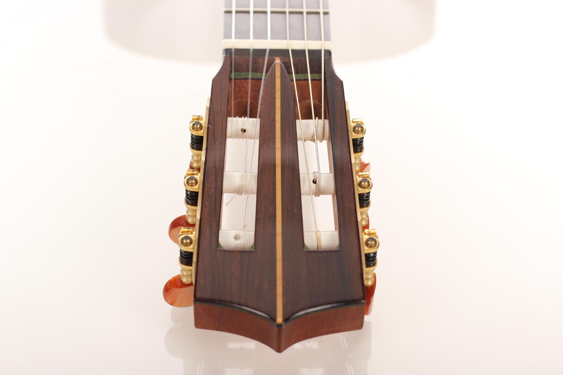 Price on requestLuthier: Fritz OberConstruction Year: 2019Construction Type: TraditionalTop: SpruceBack and Sides: Brazilian rosewood (CITES certified)Soundboard Finish: French polishBody Finish: French polishAir Body Frequency: C sharp / DWeight (g): 1345Tuner: Klaus SchellerCondition: Excellent -