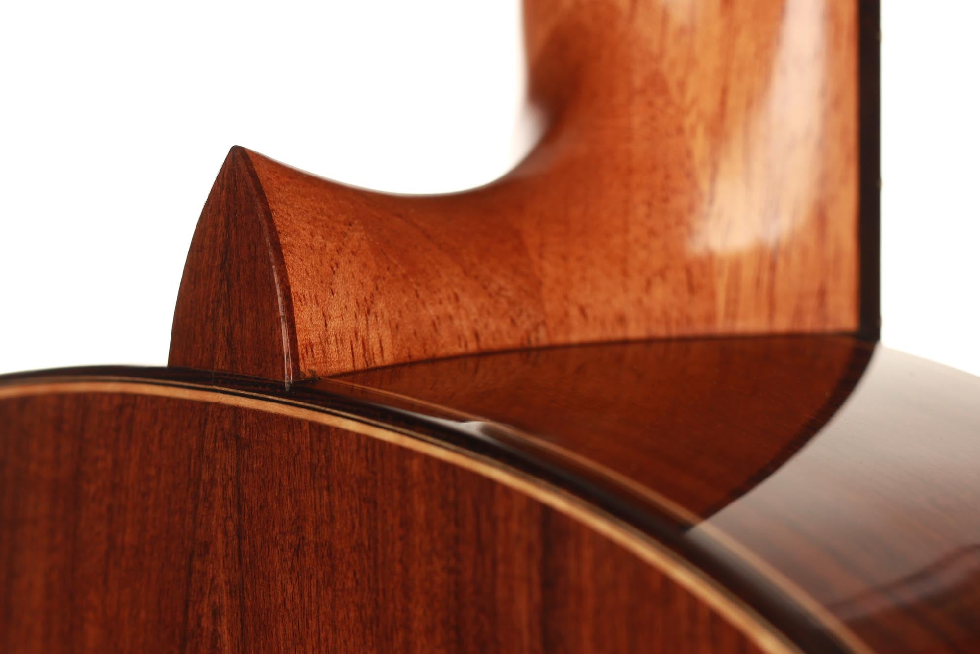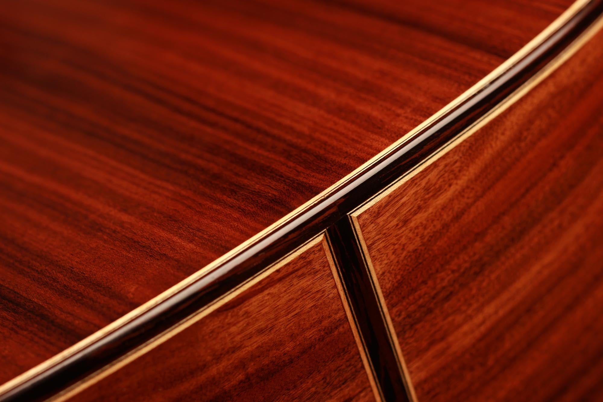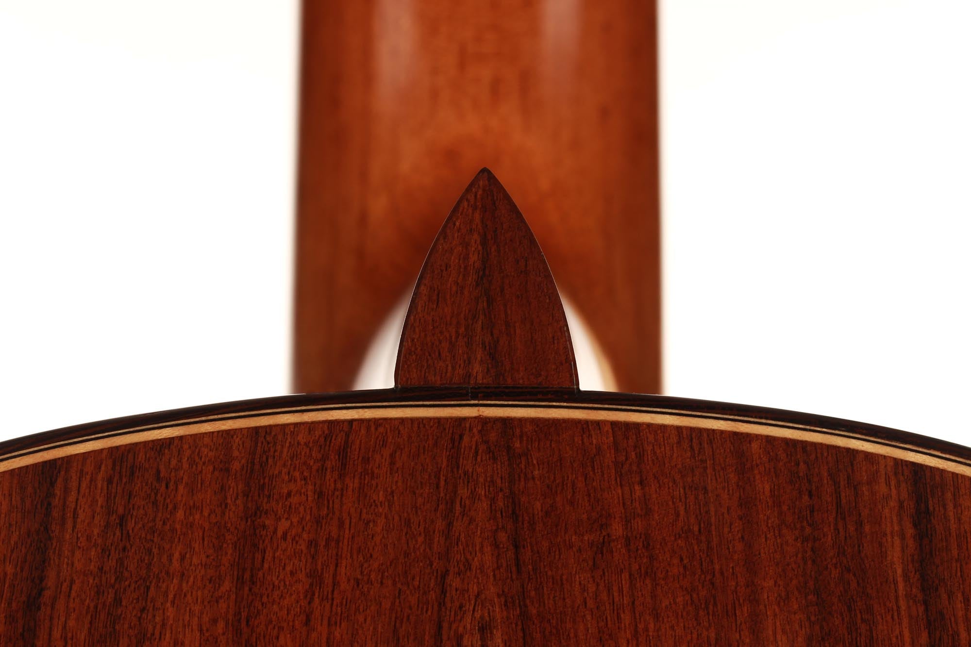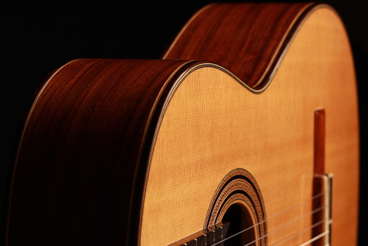 This guitar is almost like new and has only a few superficial playing marks. The soundboard has taken a magnificent colour in recent years and now seems to come directly from the 1940s. This optical characteristic of maturity and elegance is reflected in the sound of this guitar. The bracing is reminiscent of Daniel Friederich's guitars of the 70s and the sound is of phenomenal transparency and complexity. The basses are generous and support the crystalline trebles to create a very rich, noble and harmonically balanced guitar.
