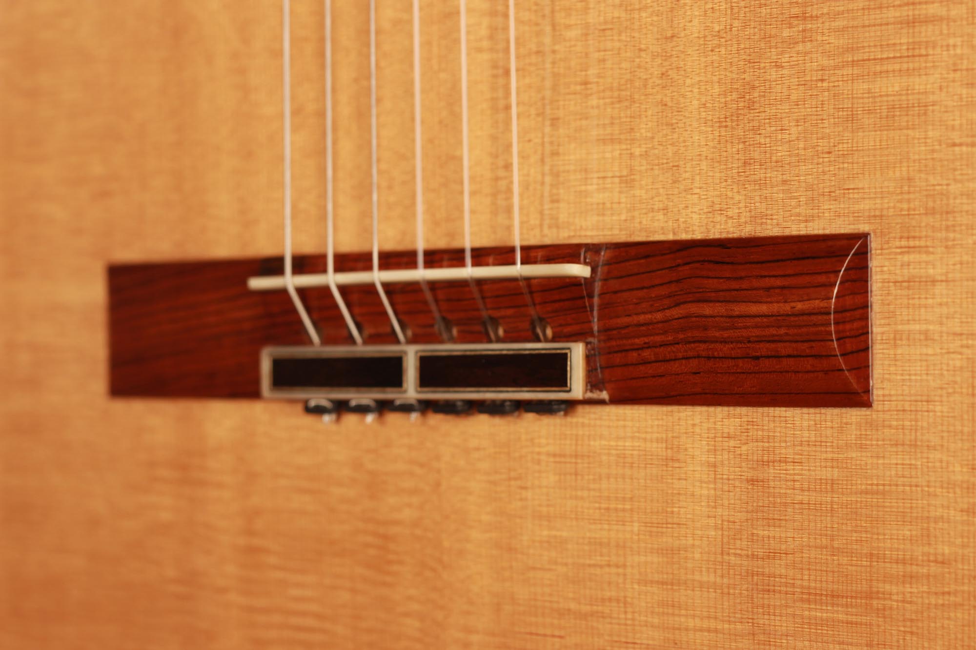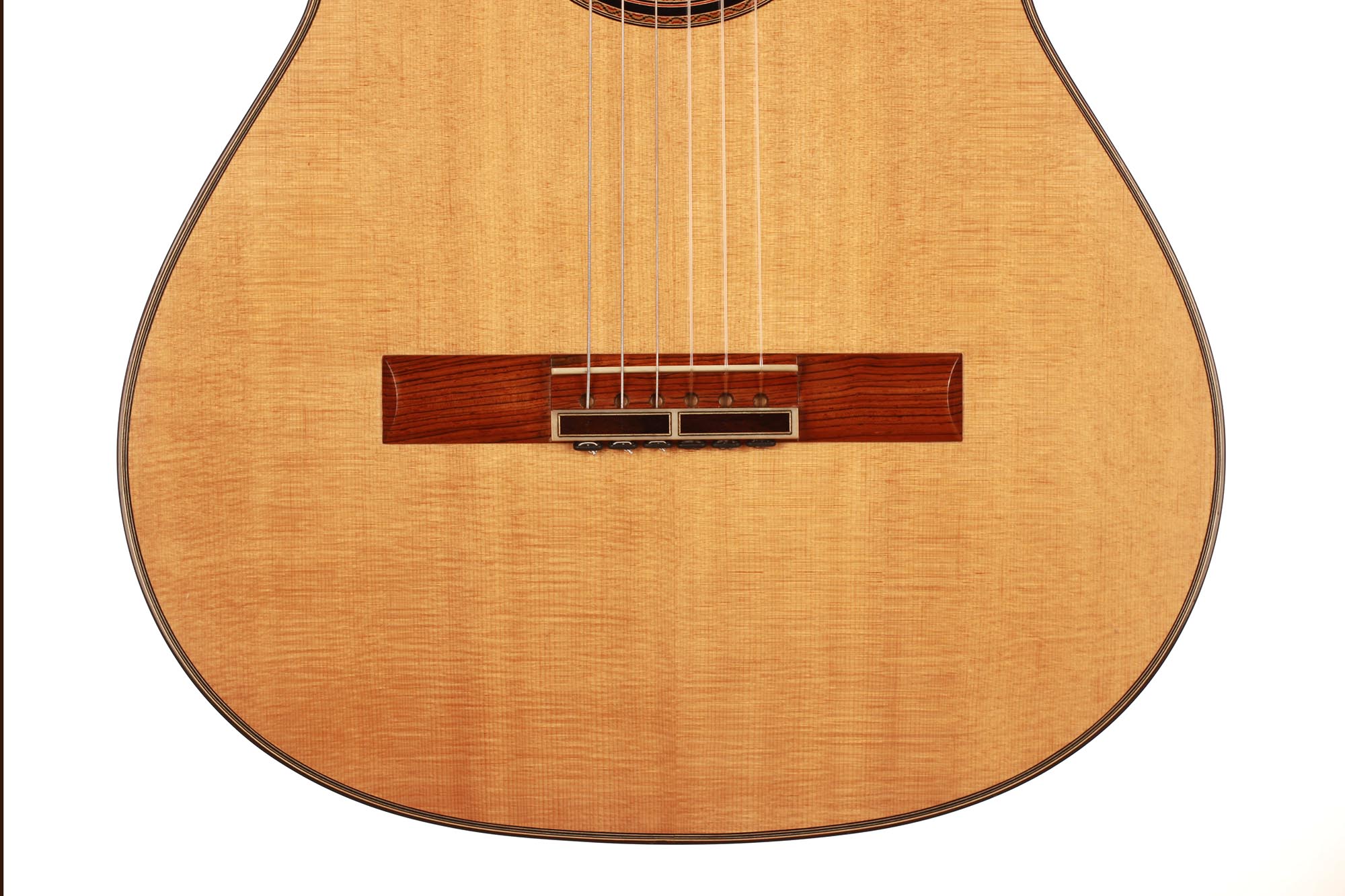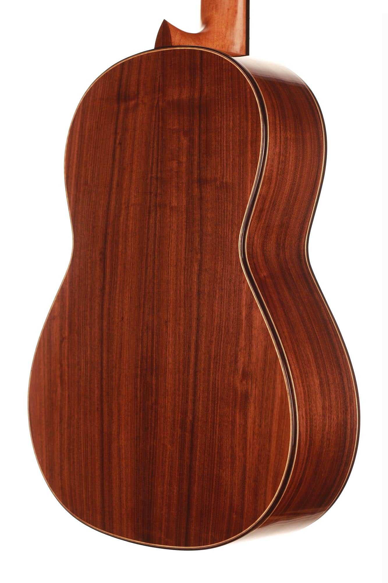 This guitar is almost like new and has only a few superficial playing marks. The soundboard has taken a magnificent colour in recent years and now seems to come directly from the 1940s. This optical characteristic of maturity and elegance is reflected in the sound of this guitar. The bracing is reminiscent of Daniel Friederich's guitars of the 70s and the sound is of phenomenal transparency and complexity. The basses are generous and support the crystalline trebles to create a very rich, noble and harmonically balanced guitar.
