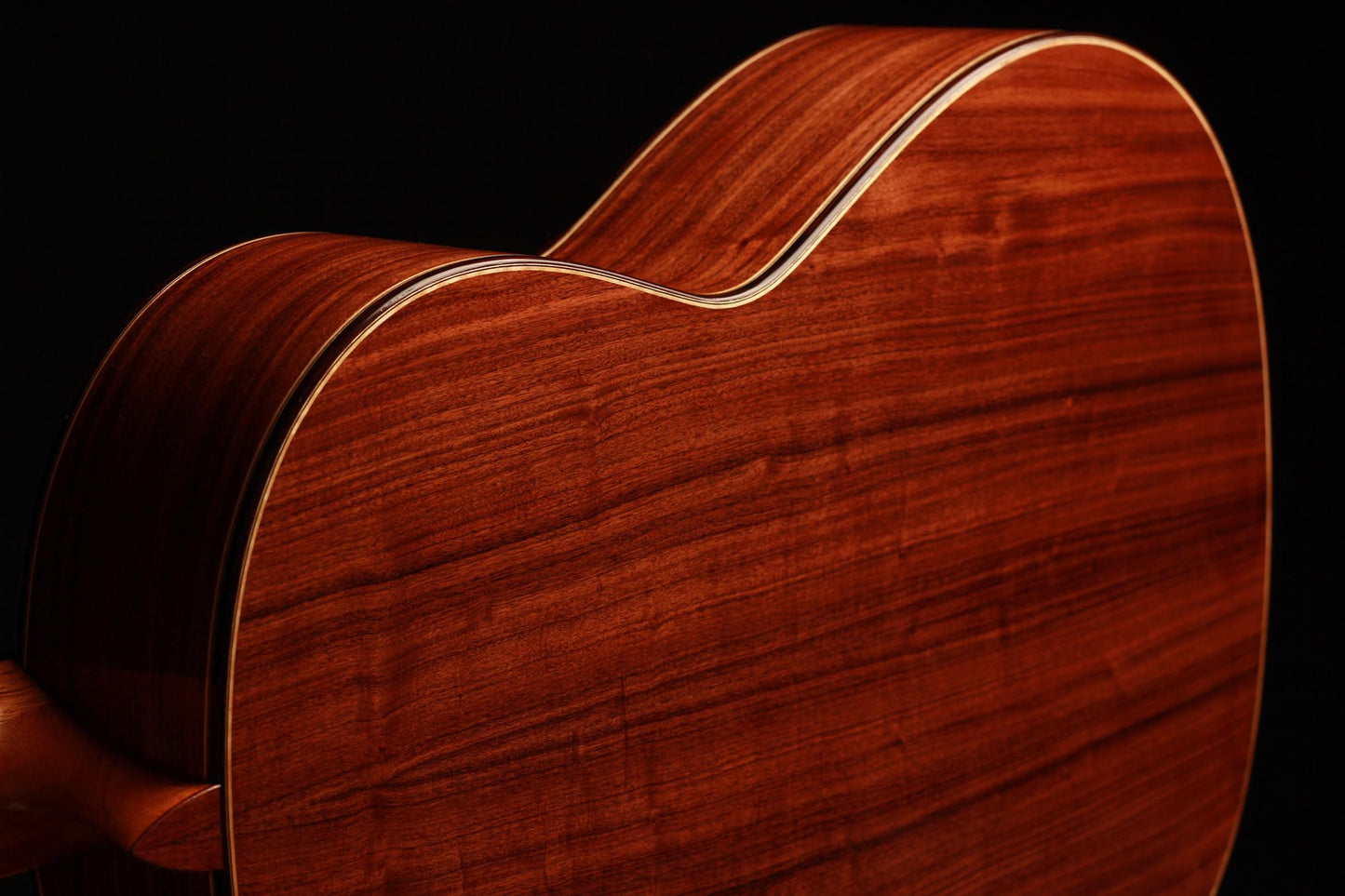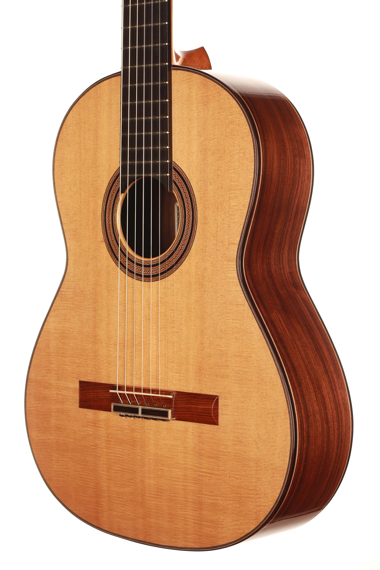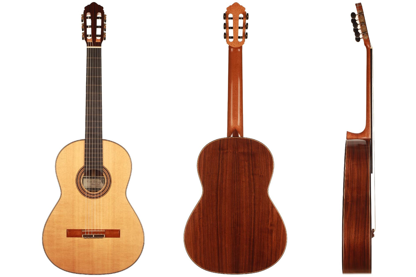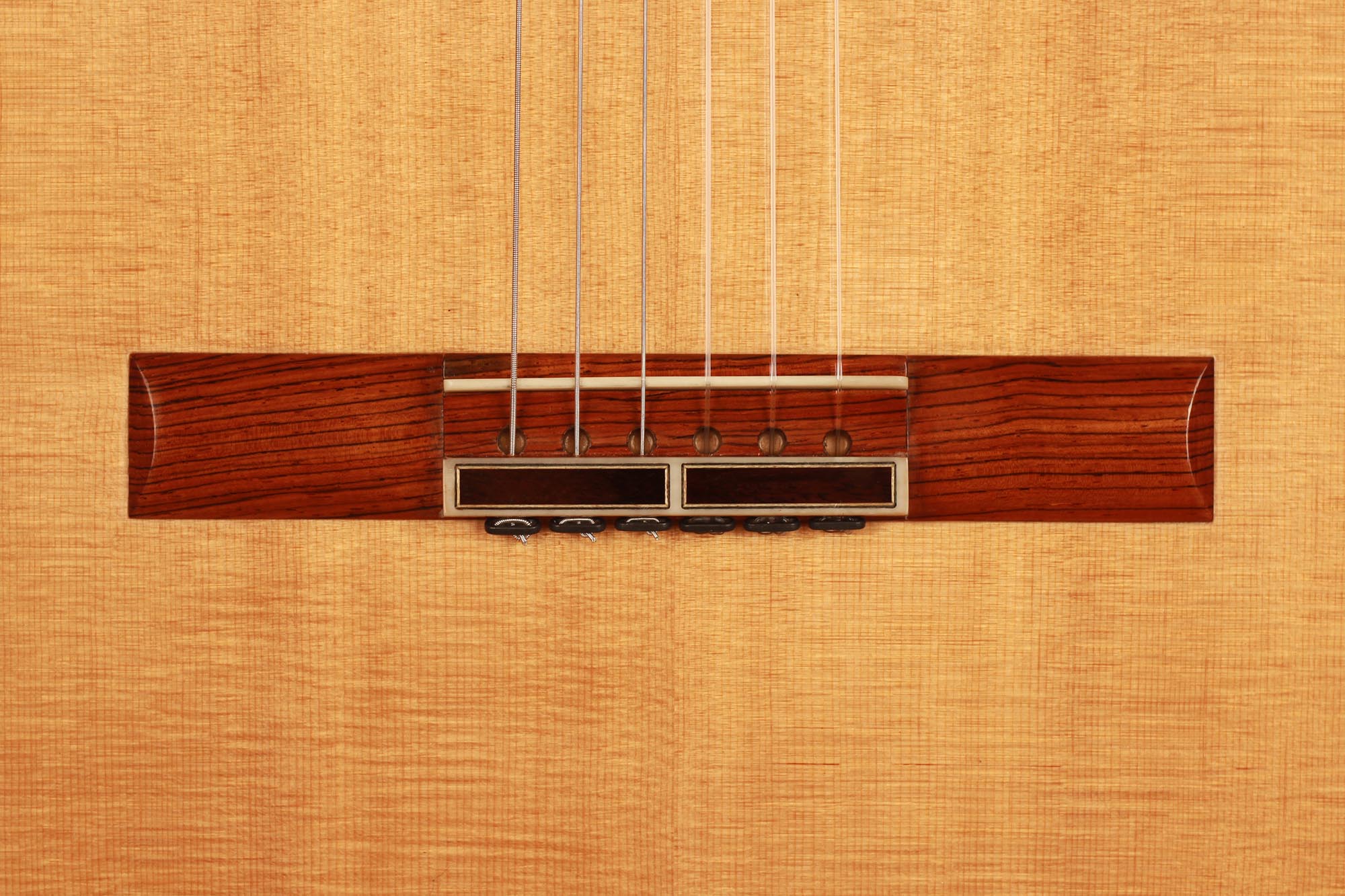 This guitar is almost like new and has only a few superficial playing marks. The soundboard has taken a magnificent colour in recent years and now seems to come directly from the 1940s. This optical characteristic of maturity and elegance is reflected in the sound of this guitar. The bracing is reminiscent of Daniel Friederich's guitars of the 70s and the sound is of phenomenal transparency and complexity. The basses are generous and support the crystalline trebles to create a very rich, noble and harmonically balanced guitar.