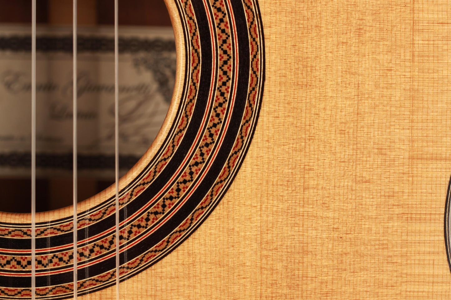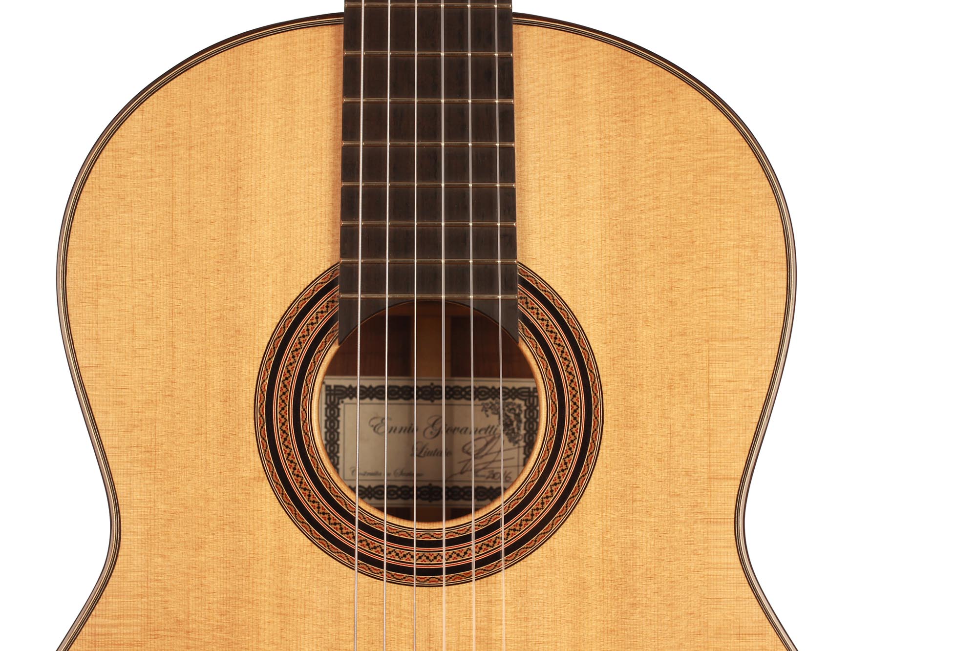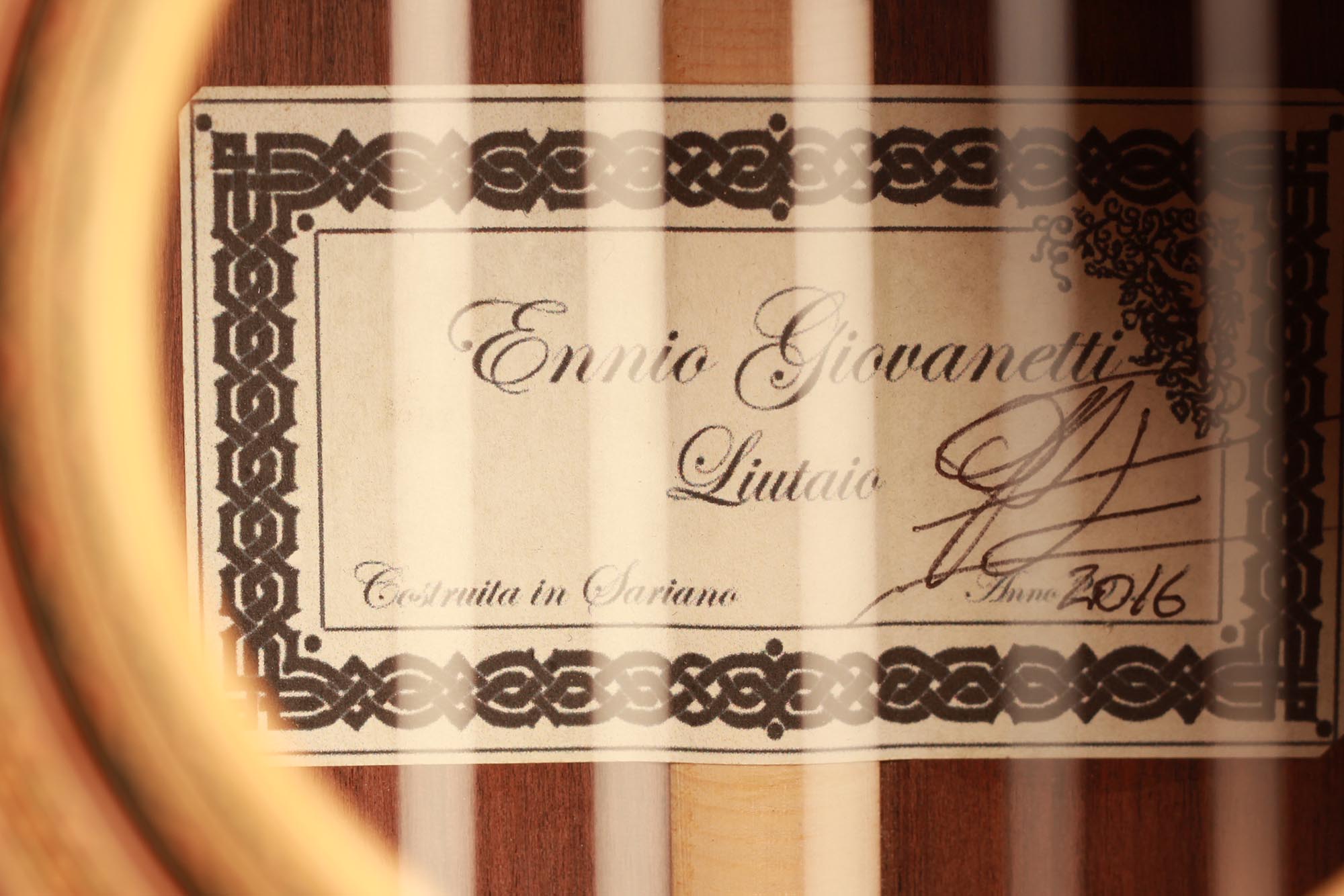 Ennio Giovanetti has been building guitars since 1998 and has his workshop in Sariano di Gropparello, near Piacenza (Italy). He studied guitar making in Milan with Enrico Bottelli, where he had the opportunity to get to know many guitars by Antonio de Torres, Simplicio, Garcia and many others. His guitars are built in the traditional way, but recognizable by their own elements. For example, behind the knotting block, a part was excavated to optimize the angle of the strings and thus promote vibrations.
