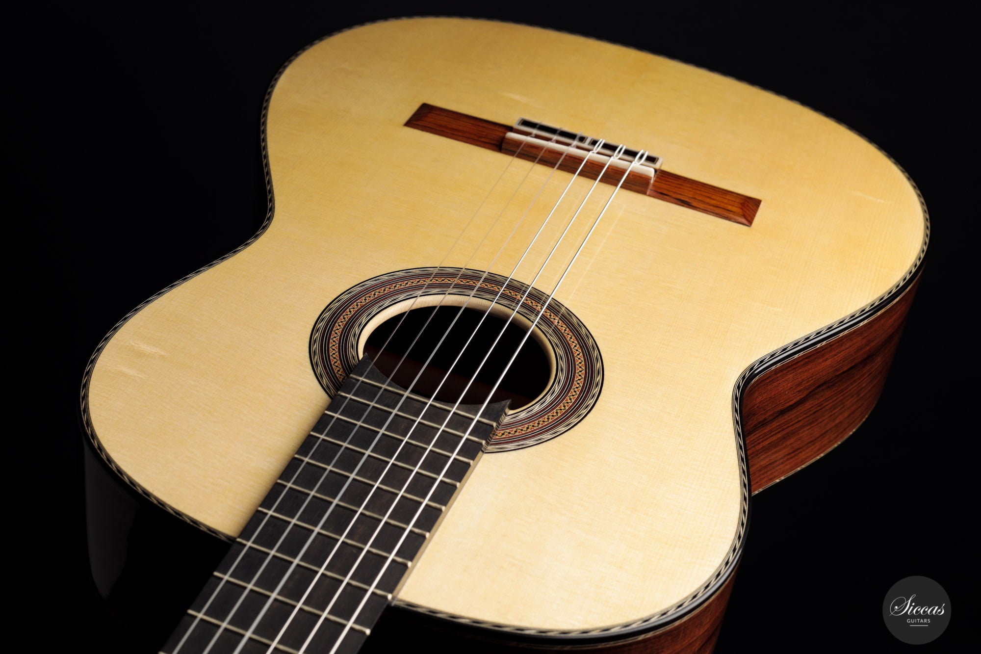 As always with Ennio Giovanetti guitars, this brand new 2022 instrument stands for elegance, charm and sophistication. This meticulously decorated and crafted model features a specially assembled exquisite selection of tone woods: back and sides are made of superb Madagascar rosewood, while the top is made of captivating bear-claw-spruce. The instrument fascinates with its tonal and visual elegance and complex sound. Thanks to its long sustain and impressive homogeneity between the registers, it is also suitable for a wide repertoire. In addition, the 64 cm scale length contributes to the optimal playability of this already very comfortable instrument. The left-hand fingering feels effortless, and this guitar will please any guitarist looking for a sensitive traditional classical guitar with ideal playability.