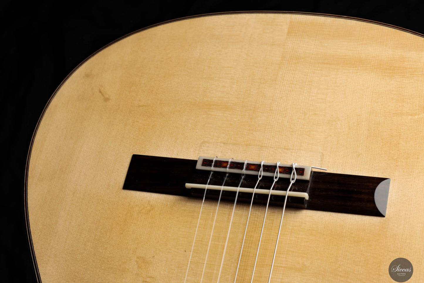 Ennio Giovanetti's 2024 REG Limited Edition guitar serves as a bold tribute to a 1964 Daniel Friederich model, particularly notable for its use of a spruce top—a less common choice compared to the more frequently used cedar in Friederich's designs. This audacious replication reflects Giovanetti's deep admiration for Friederich's work, highlighted by his acquisition of special woods from Friederich’s personal collection following a visit in 2017, after the master had ceased his own guitar-making operations. The resulting instrument captures the quintessence of Friederich's legacy—its balance, power, evenness, and elegance are all reflective of the master’s iconic style, making this guitar not only a performer's dream but also a collector's gem.