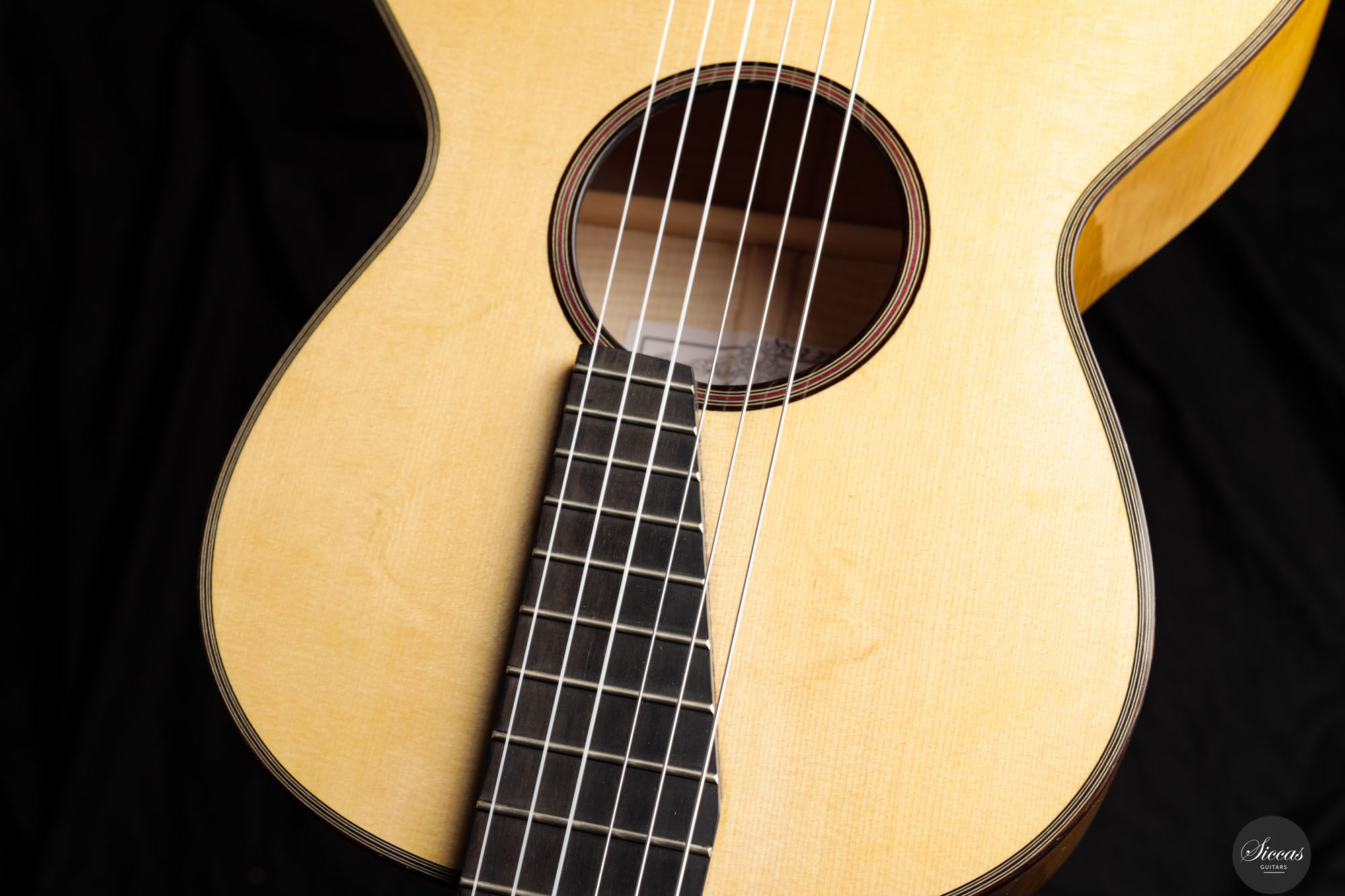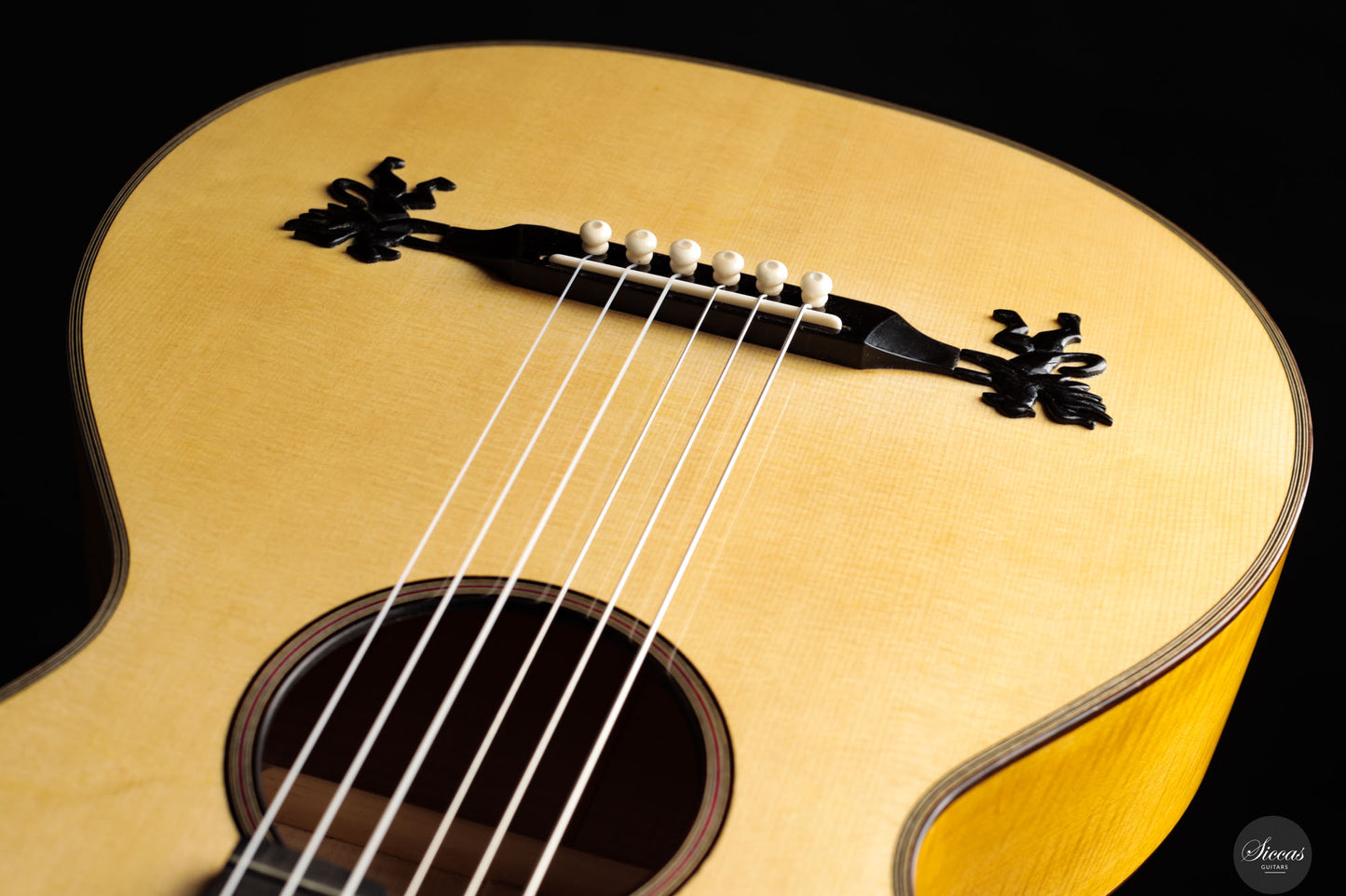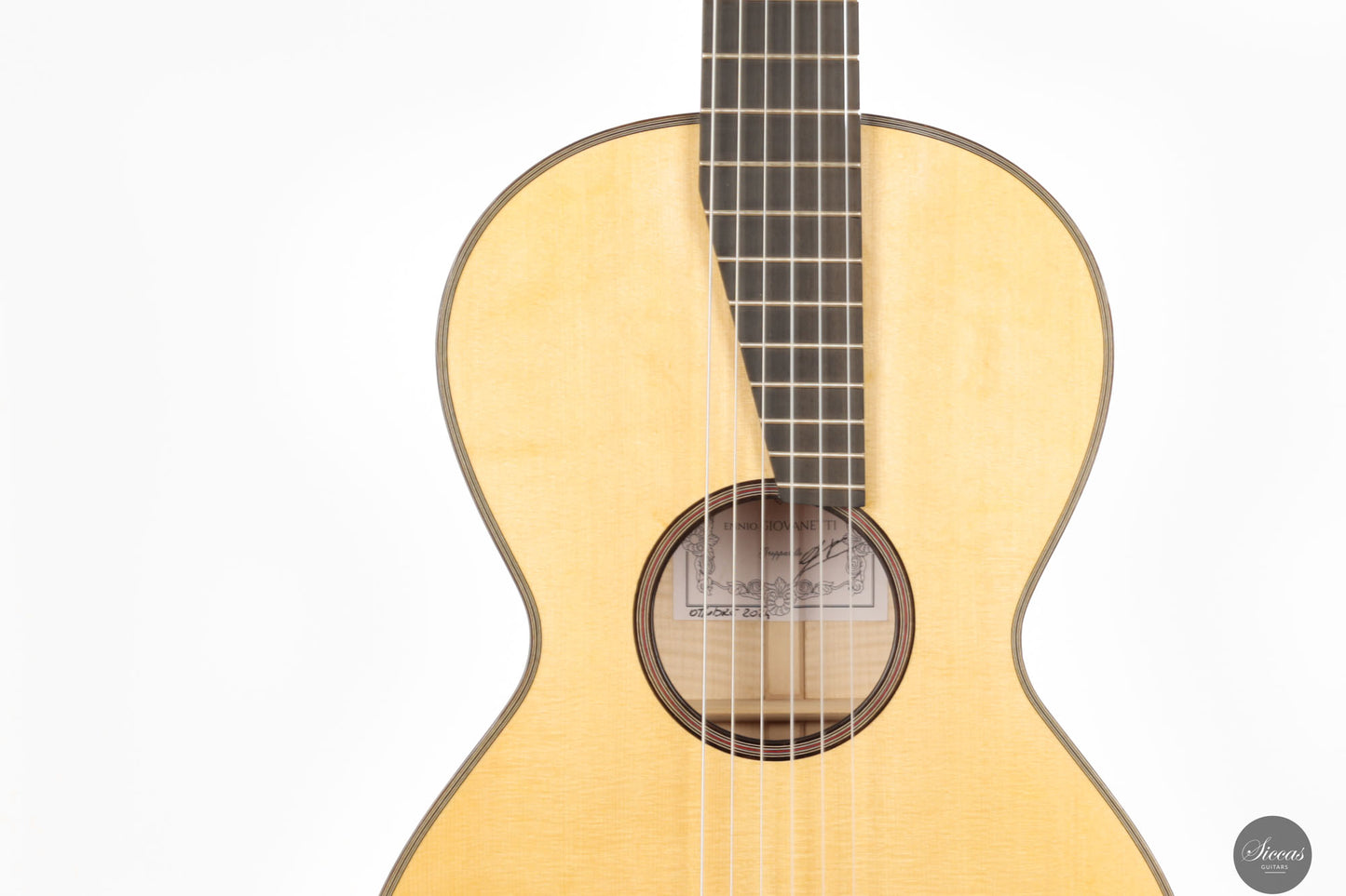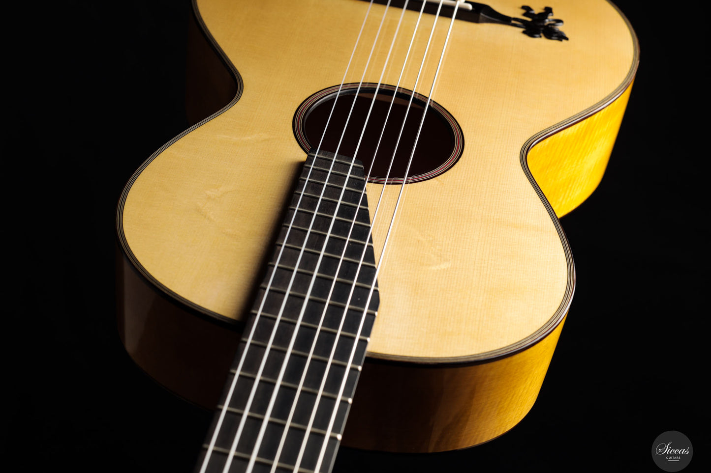 This exquisite 2024 Stauffer replica pays homage to Johann Georg Stauffer's groundbreaking designs. It features a spruce top paired with stunning flamed maple back and sides, which not only elevate its tonal clarity but also provide a striking visual aesthetic. Ennio’s attention to detail and dedication to craftsmanship shine in this reproduction of the Stauffer model, enhanced with subtle modern refinements that reflect his expertise.