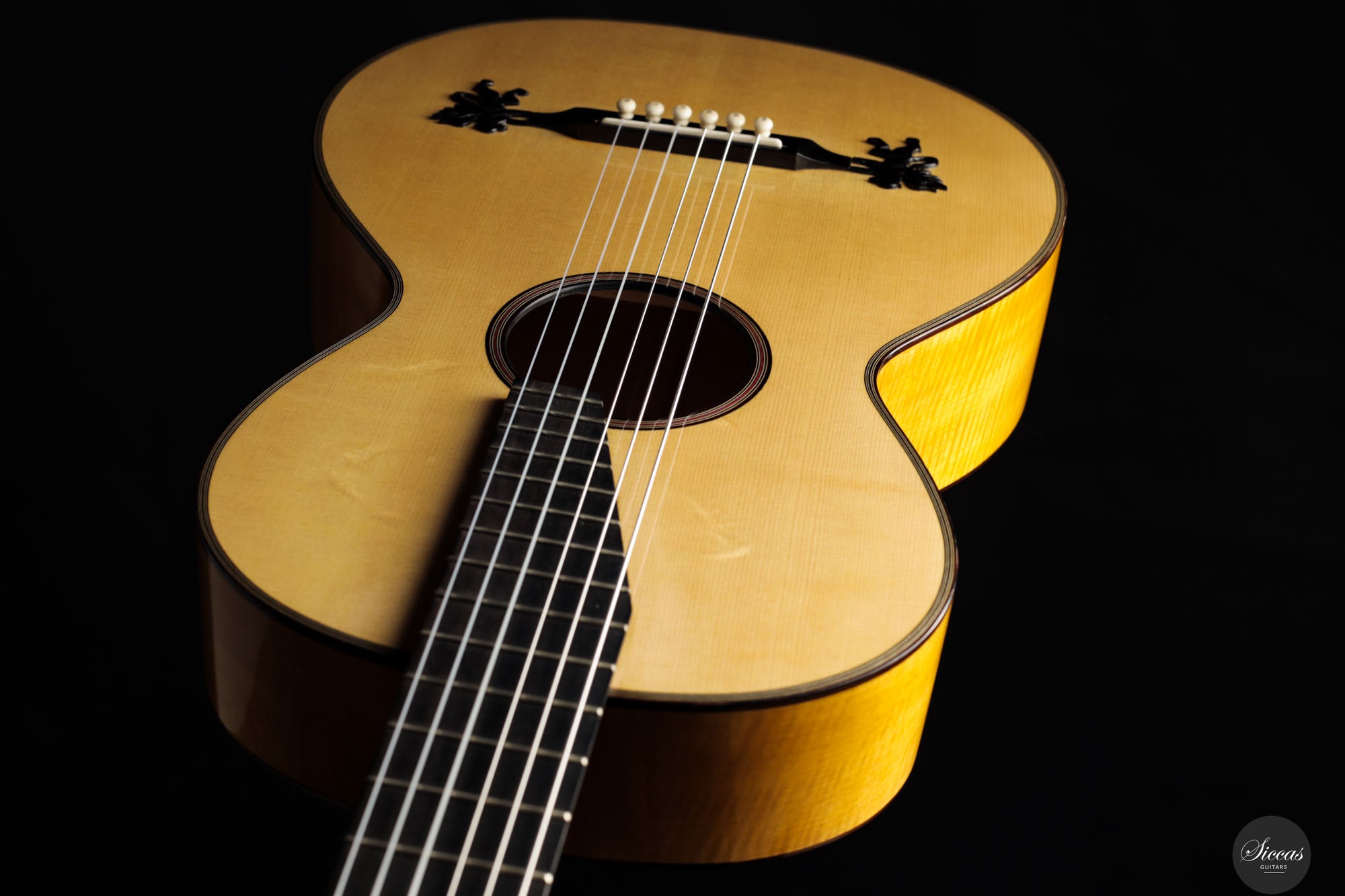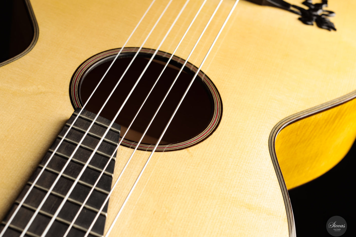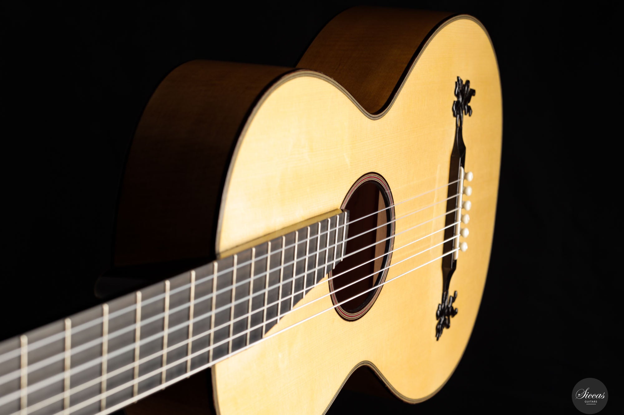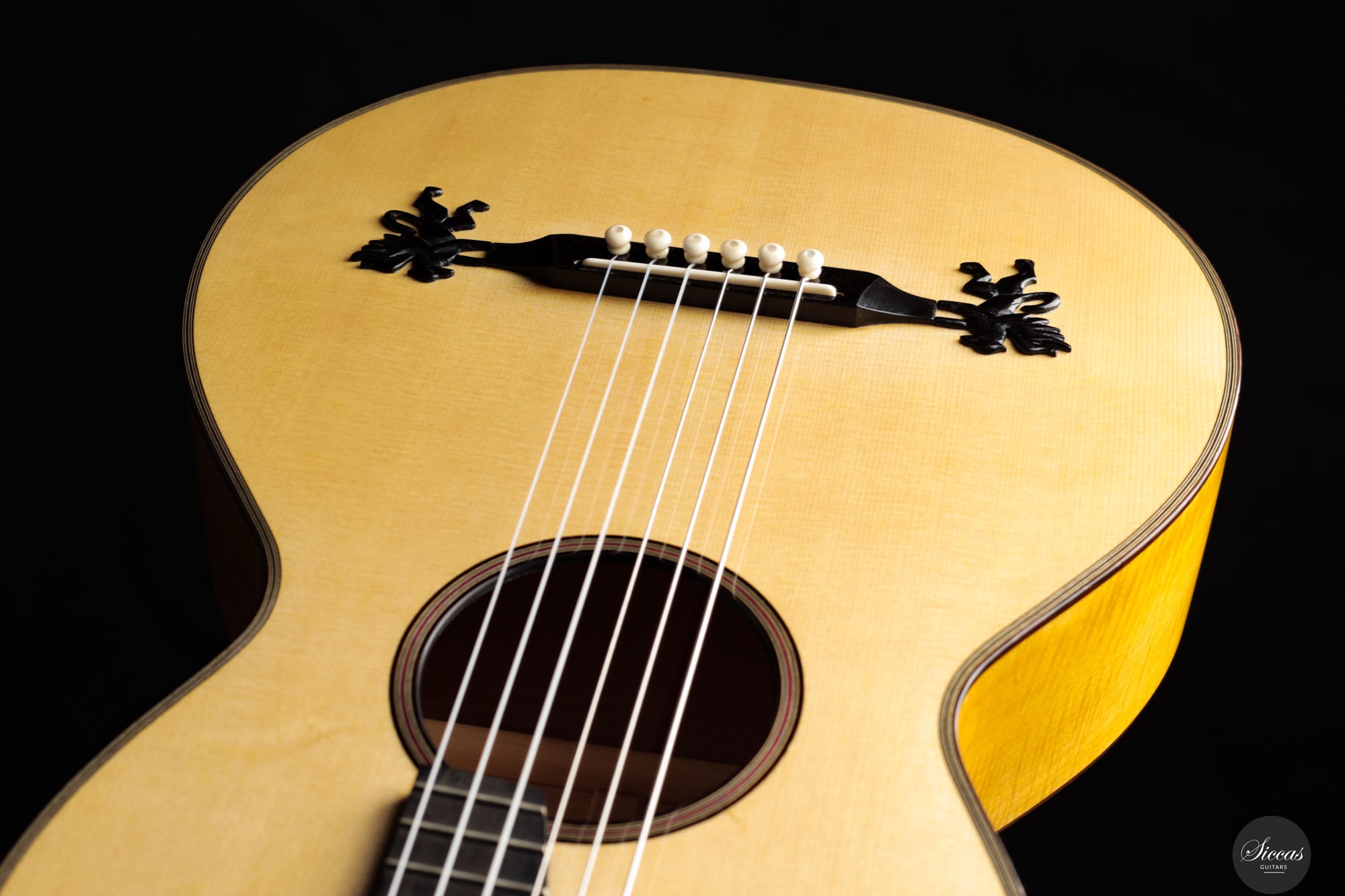 This exquisite 2024 Stauffer replica pays homage to Johann Georg Stauffer's groundbreaking designs. It features a spruce top paired with stunning flamed maple back and sides, which not only elevate its tonal clarity but also provide a striking visual aesthetic. Ennio’s attention to detail and dedication to craftsmanship shine in this reproduction of the Stauffer model, enhanced with subtle modern refinements that reflect his expertise.