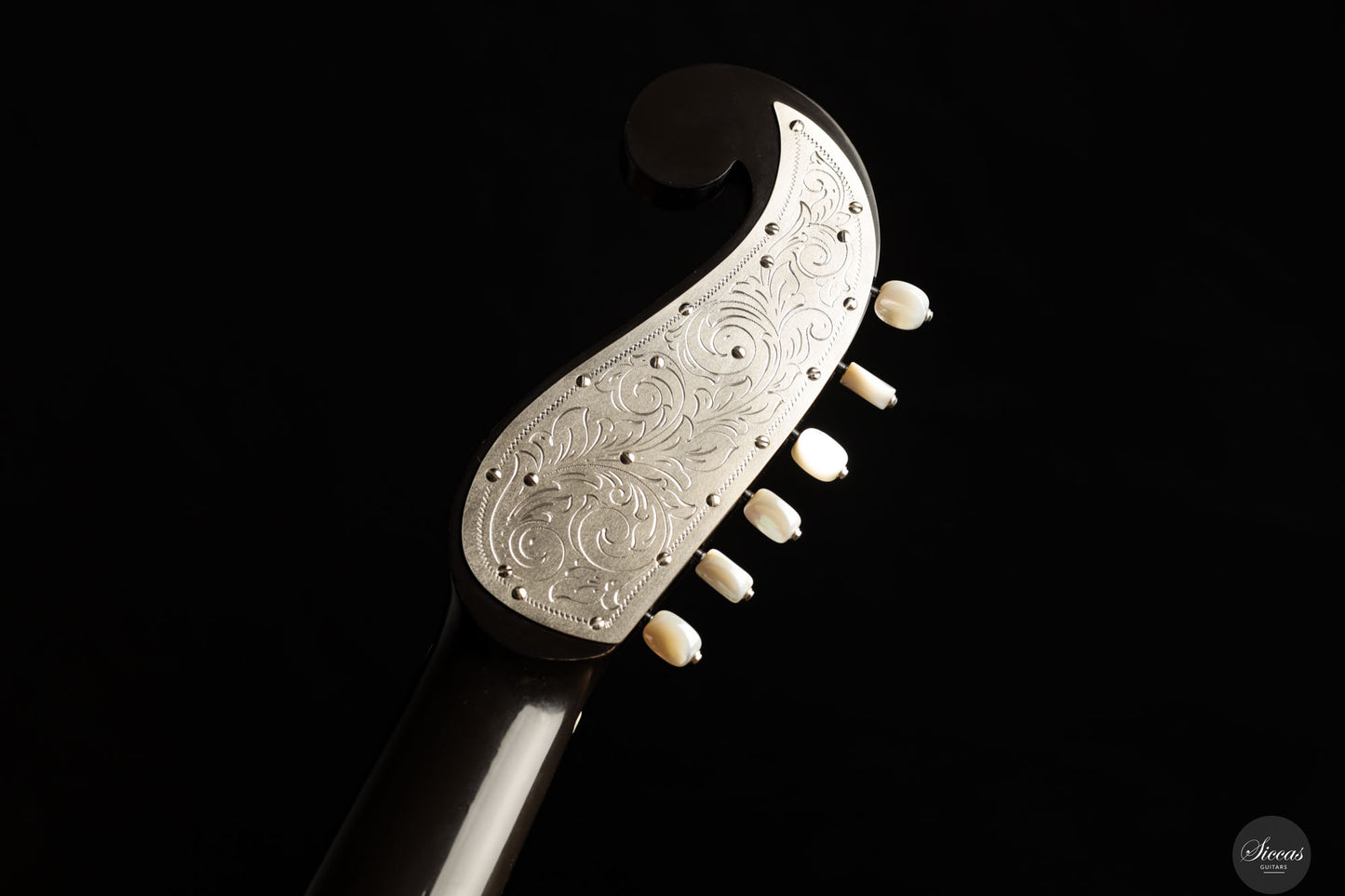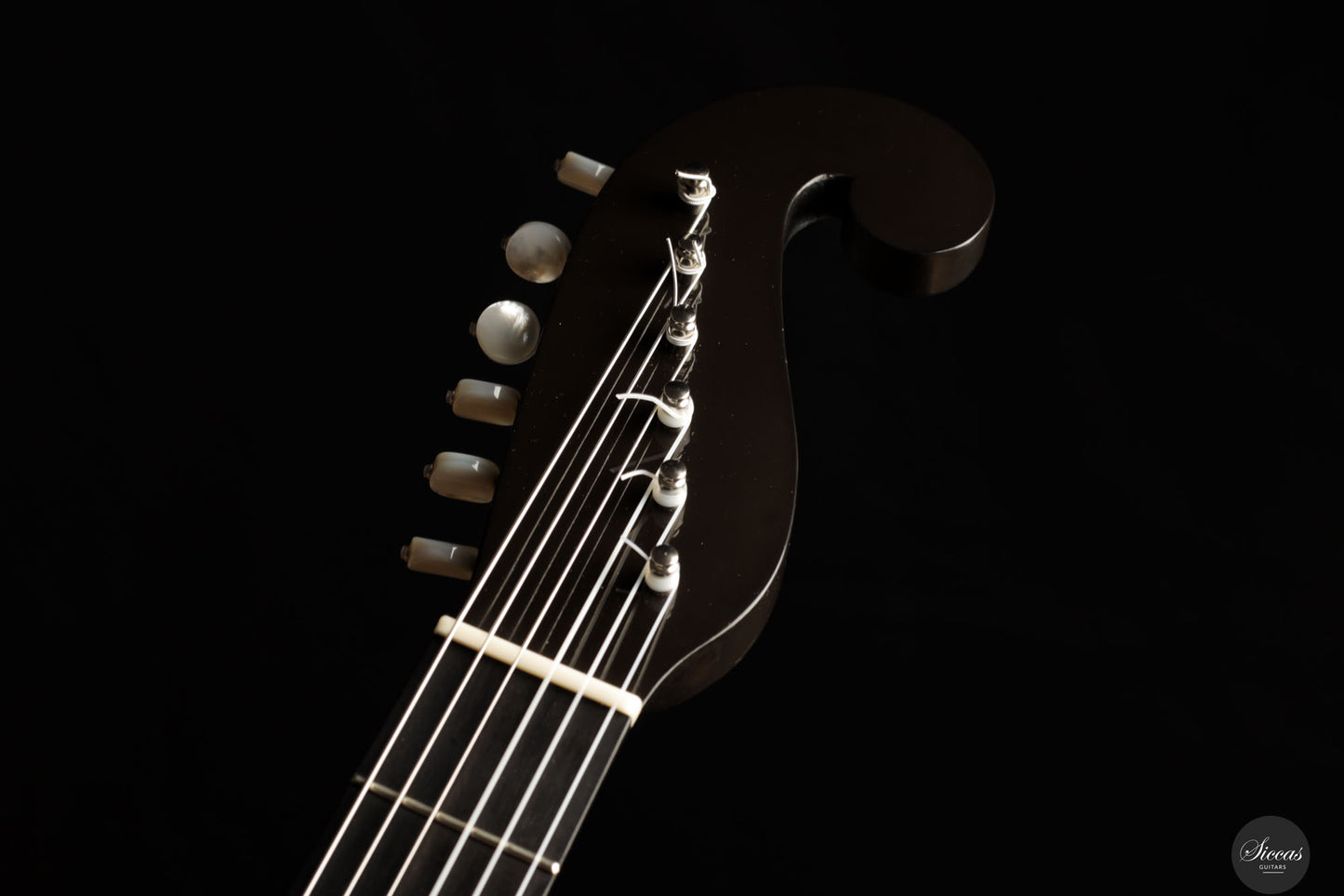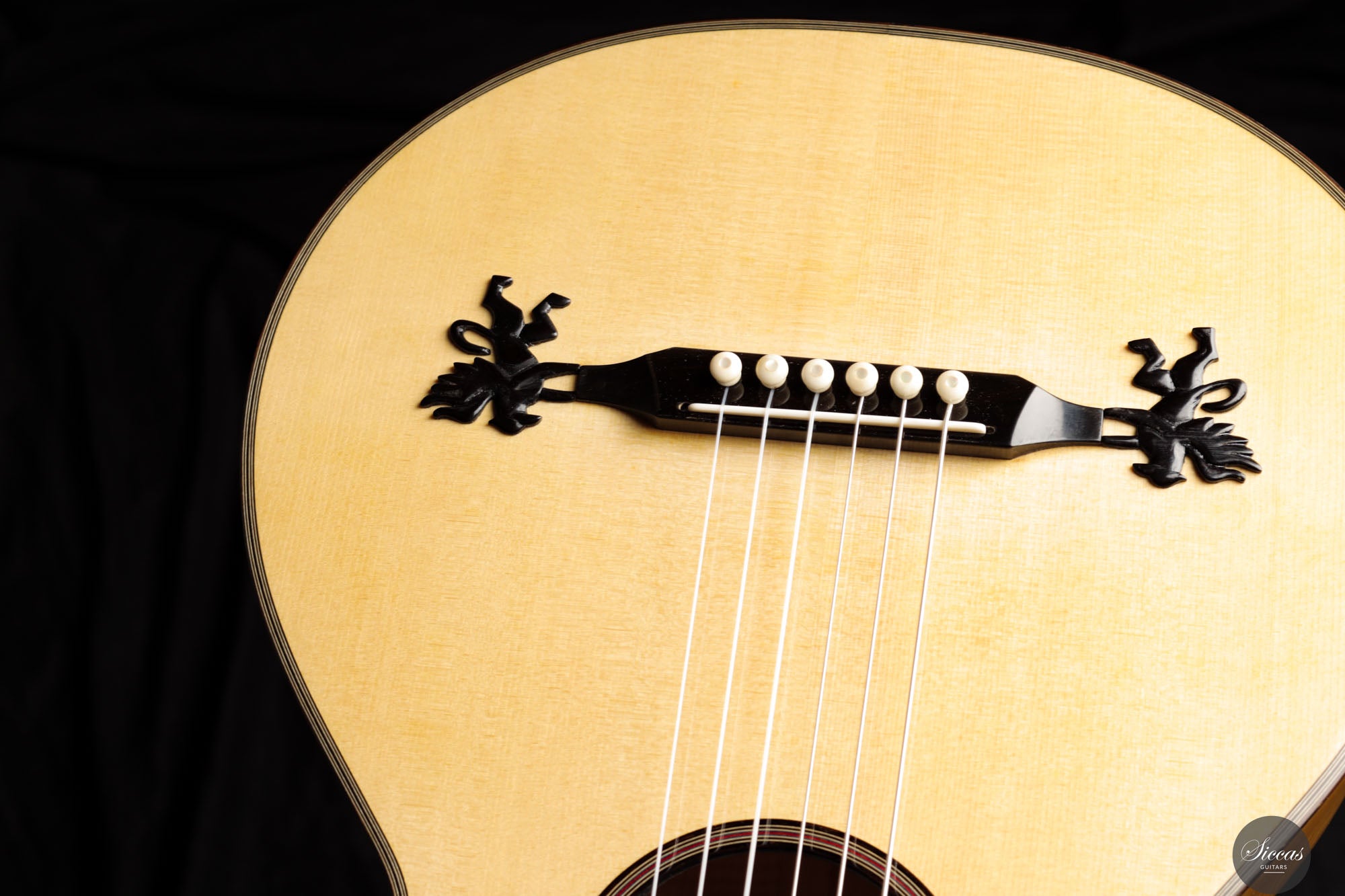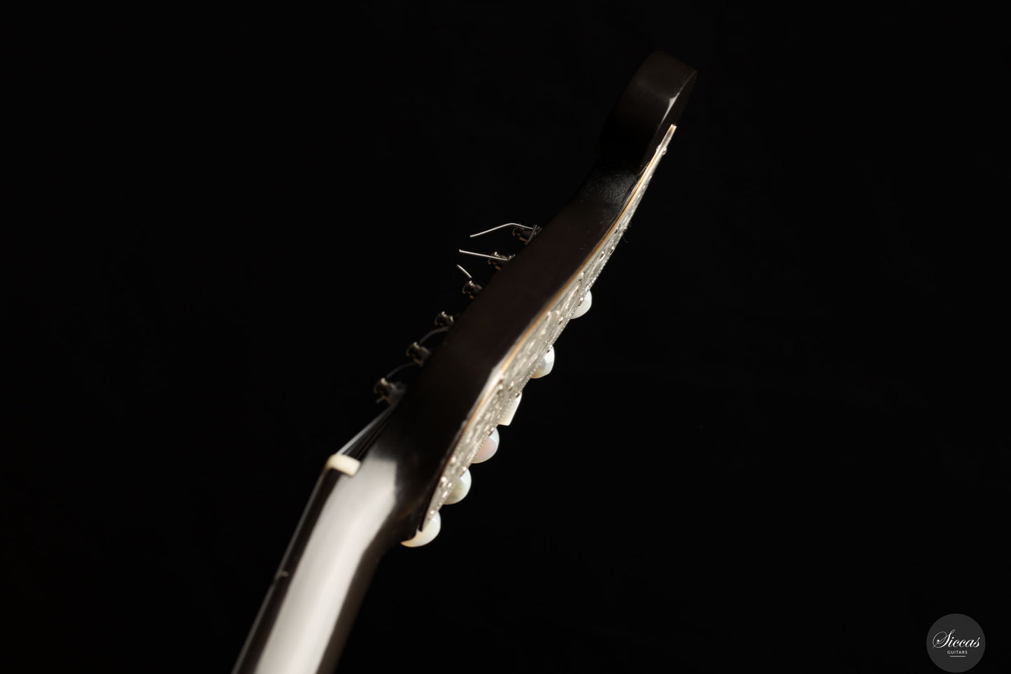 This exquisite 2024 Stauffer replica pays homage to Johann Georg Stauffer's groundbreaking designs. It features a spruce top paired with stunning flamed maple back and sides, which not only elevate its tonal clarity but also provide a striking visual aesthetic. Ennio’s attention to detail and dedication to craftsmanship shine in this reproduction of the Stauffer model, enhanced with subtle modern refinements that reflect his expertise.