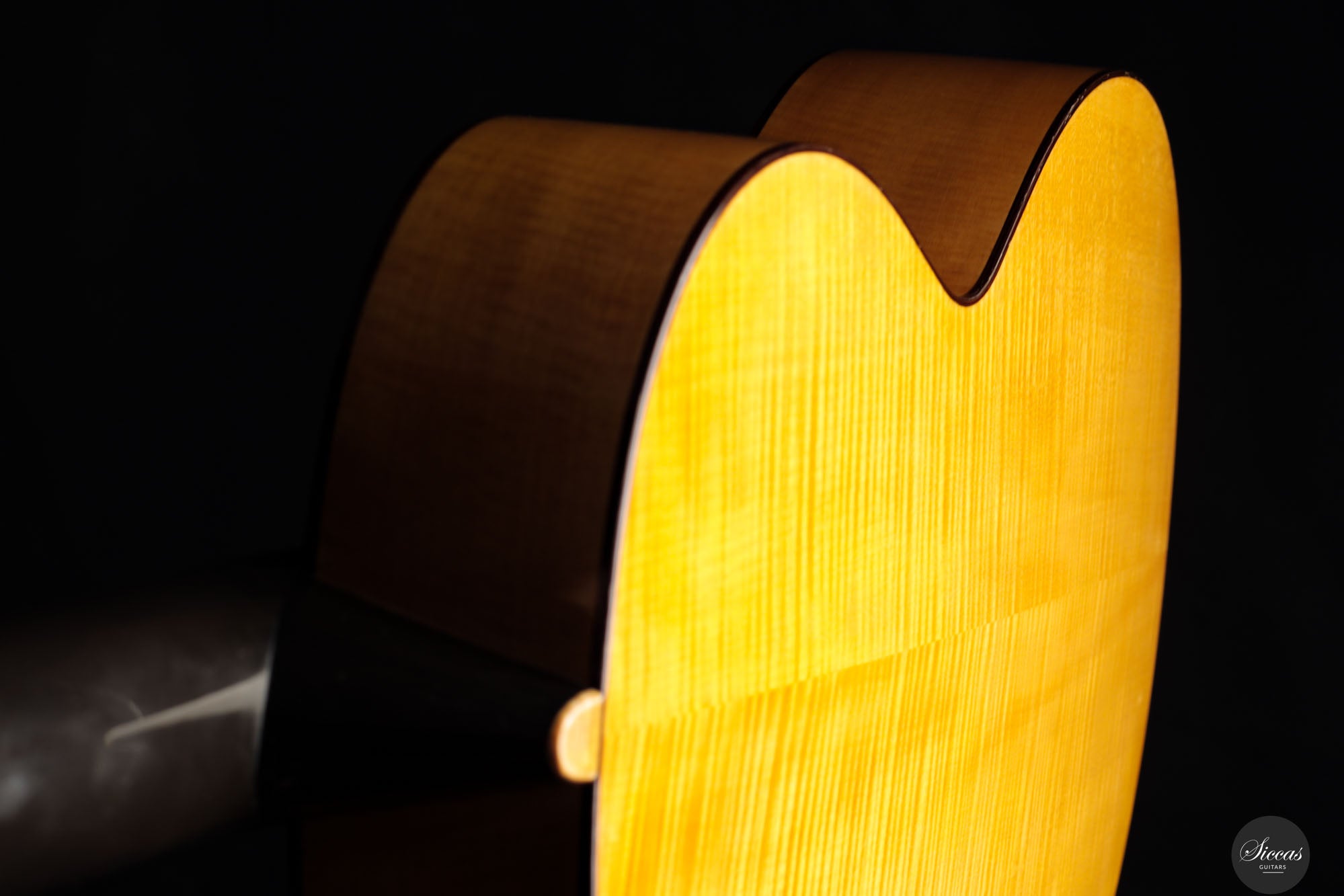 Ennio Giovanetti has been crafting exceptional guitars since 1998 in his workshop in Sariano di Gropparello, near Piacenza, Italy. His journey in guitar making began with studies under Enrico Bottelli in Milan, where he had the opportunity to explore and study iconic guitars by Antonio de Torres, Simplicio, and Garcia, among others. Ennio’s instruments are built in the traditional style, yet they are easily distinguishable by their innovative elements. A prime example is the unique design of the bridge, where a section behind the tie block is excavated to optimize the string angle, enhancing vibration and sound projection.