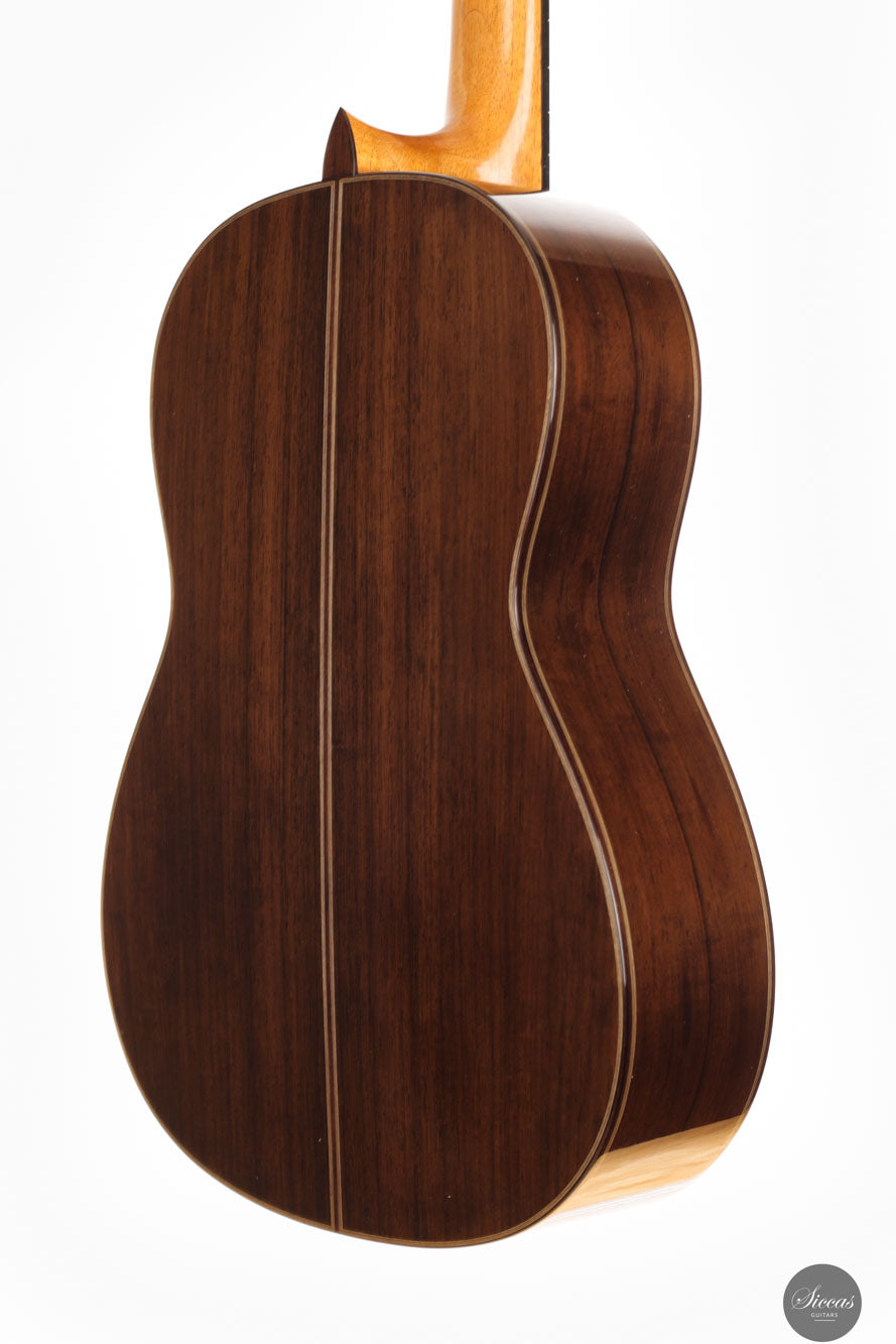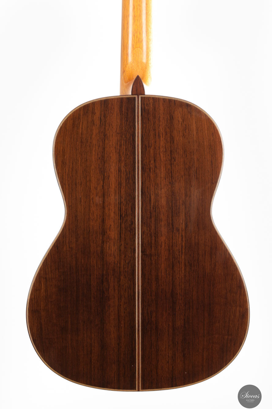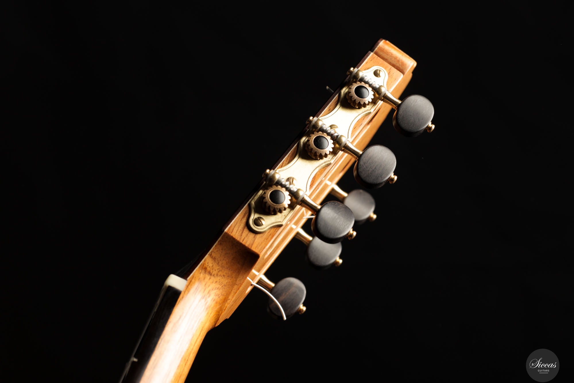 The 2025 Ennio Giovanetti guitar with a 64cm scale is an instrument that exudes simplicity and elegance. The dark and timeless Indian rosewood used in its construction is a testament to Ennio’s exceptional taste in selecting high-quality materials for his instruments. The rosette of this guitar is a nod to the traditional Madrilenian design used by renowned guitar makers such as Santos Hernandez and Domingo Esteso in the 1920s. The contrast between the light inner mosaic and the dark outer circles is a stunning visual feature that adds to the guitar’s charm and character. In addition to its striking appearance, this guitar has an exceptional sound quality that complements its aesthetic qualities. Beyond its captivating appearance, this instrument delivers extraordinary sound quality. The tone is powerful, open, and precise, with a remarkable volume that makes it suitable for any performance setting. Its superb playability is ensured by a thoughtfully shaped, comfortable neck that feels natural and effortless in hand. One of the guitar’s most distinctive features is its beautifully designed elevated fingerboard—an uncommon element in Ennio’s creations. This design not only adds to its aesthetic appeal but also enhances accessibility and playability in the upper register, making it a truly exceptional concert instrument.