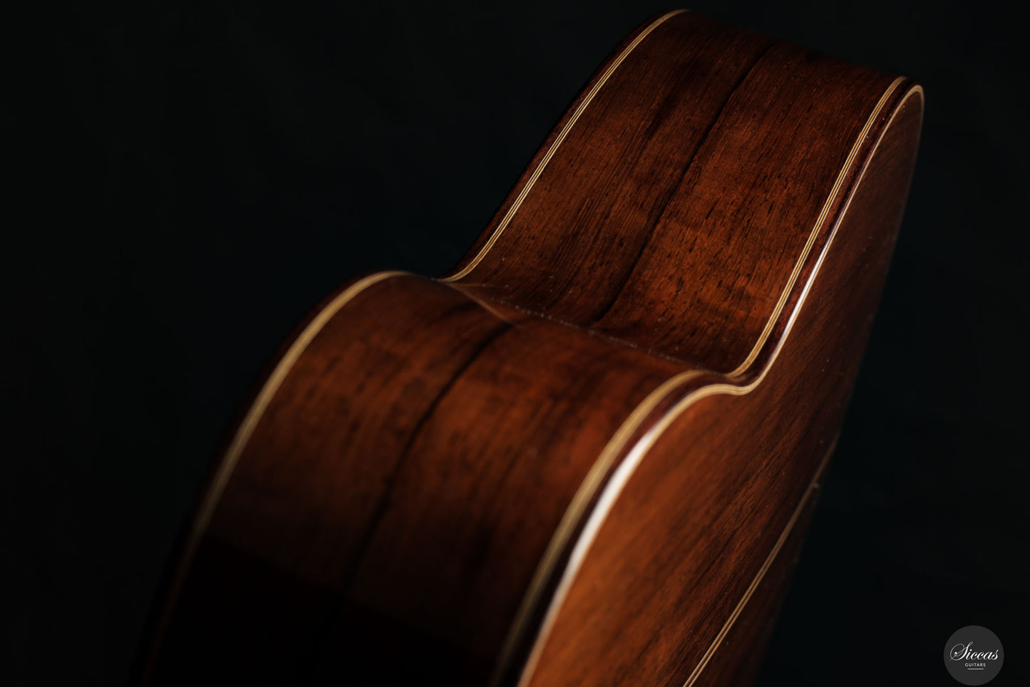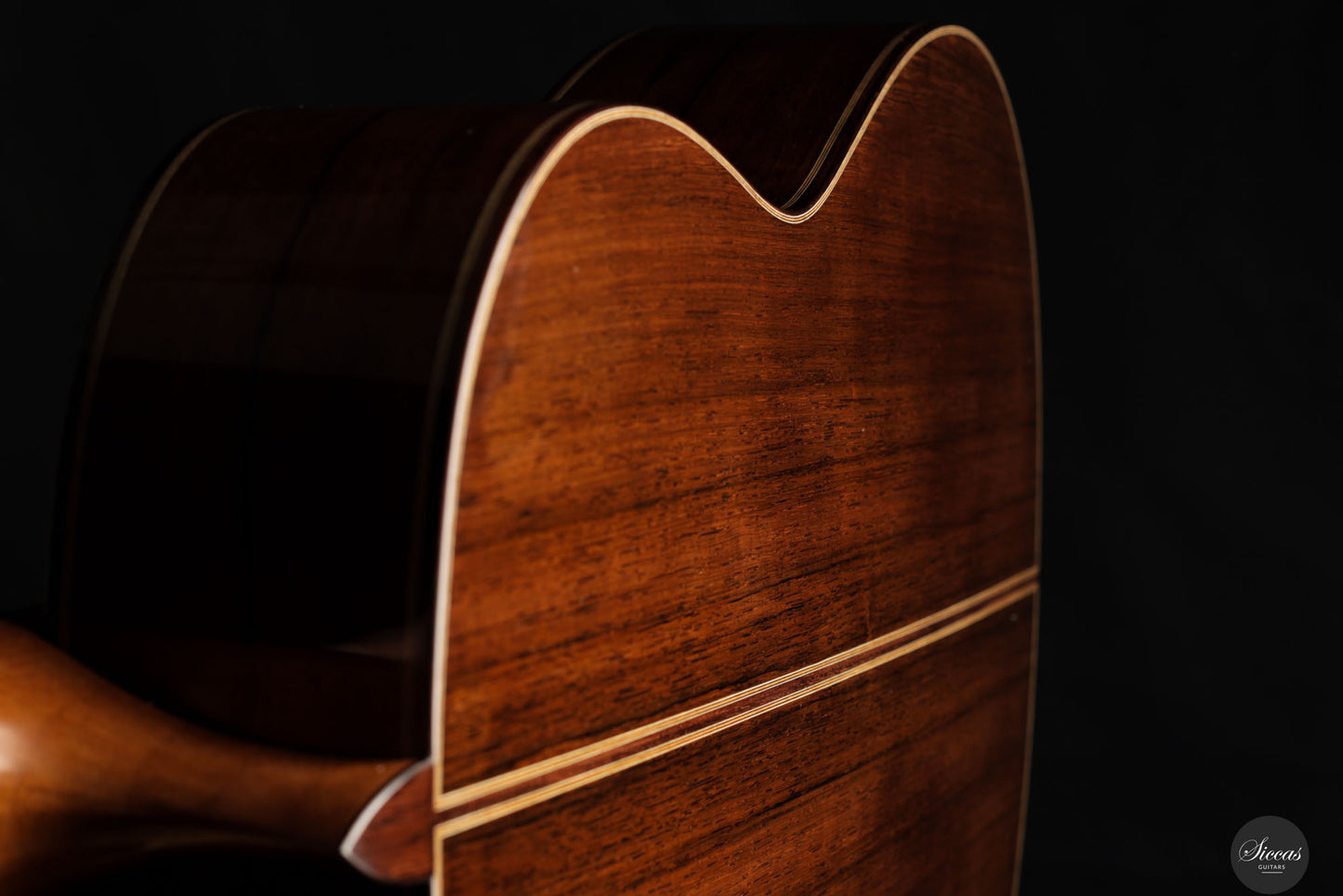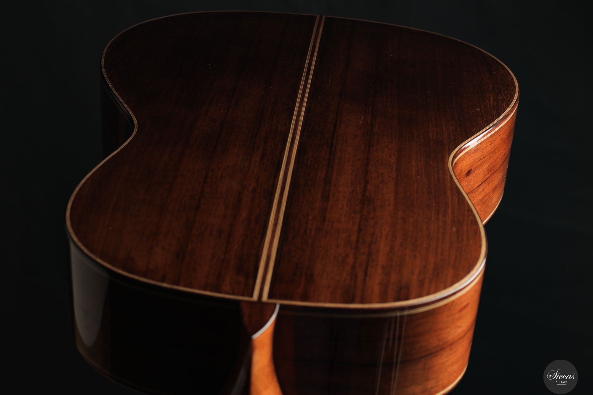 The 2025 Ennio Giovanetti guitar with a 64cm scale is an instrument that exudes simplicity and elegance. The dark and timeless Indian rosewood used in its construction is a testament to Ennio’s exceptional taste in selecting high-quality materials for his instruments. The rosette of this guitar is a nod to the traditional Madrilenian design used by renowned guitar makers such as Santos Hernandez and Domingo Esteso in the 1920s. The contrast between the light inner mosaic and the dark outer circles is a stunning visual feature that adds to the guitar’s charm and character. In addition to its striking appearance, this guitar has an exceptional sound quality that complements its aesthetic qualities. Beyond its captivating appearance, this instrument delivers extraordinary sound quality. The tone is powerful, open, and precise, with a remarkable volume that makes it suitable for any performance setting. Its superb playability is ensured by a thoughtfully shaped, comfortable neck that feels natural and effortless in hand. One of the guitar’s most distinctive features is its beautifully designed elevated fingerboard—an uncommon element in Ennio’s creations. This design not only adds to its aesthetic appeal but also enhances accessibility and playability in the upper register, making it a truly exceptional concert instrument.