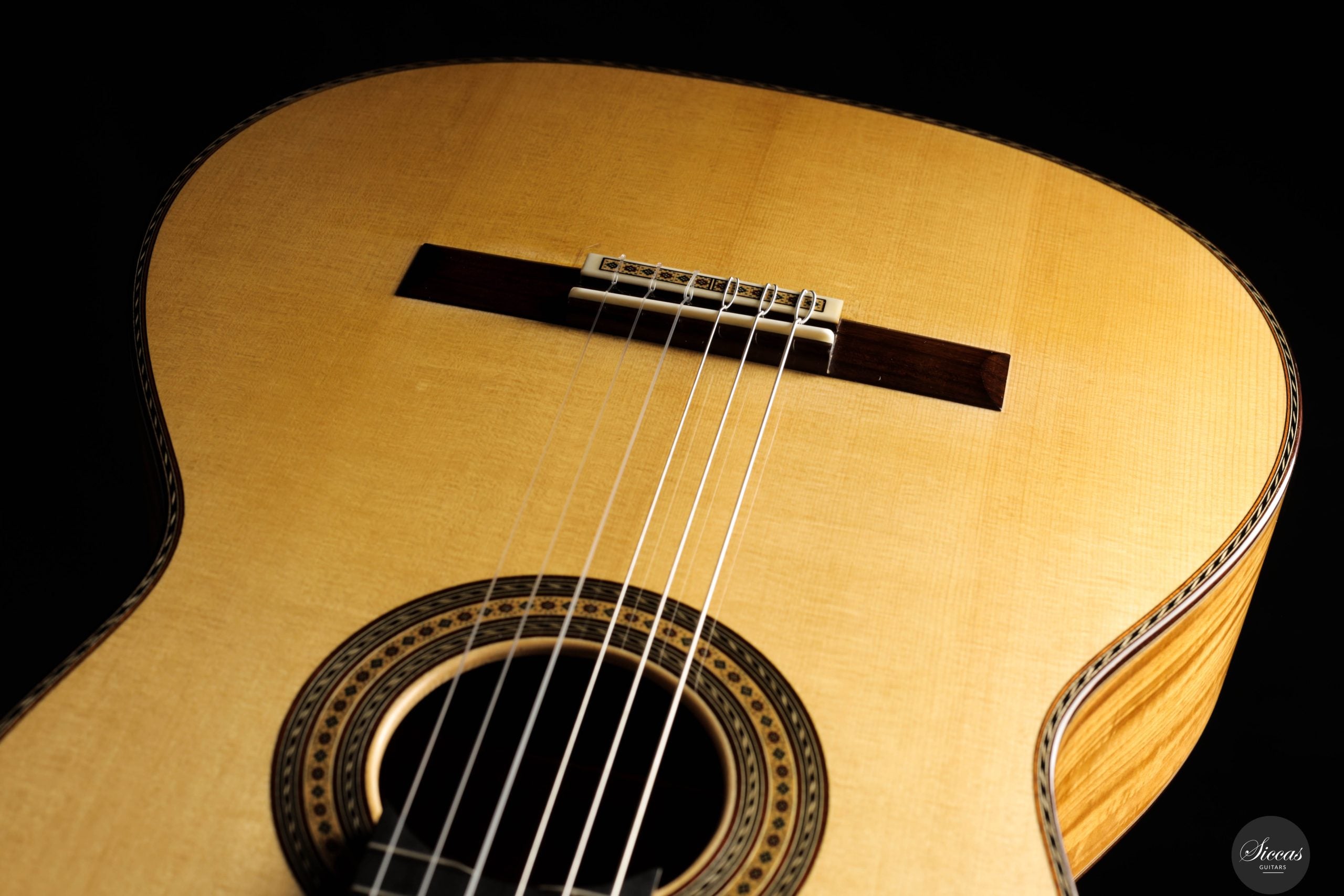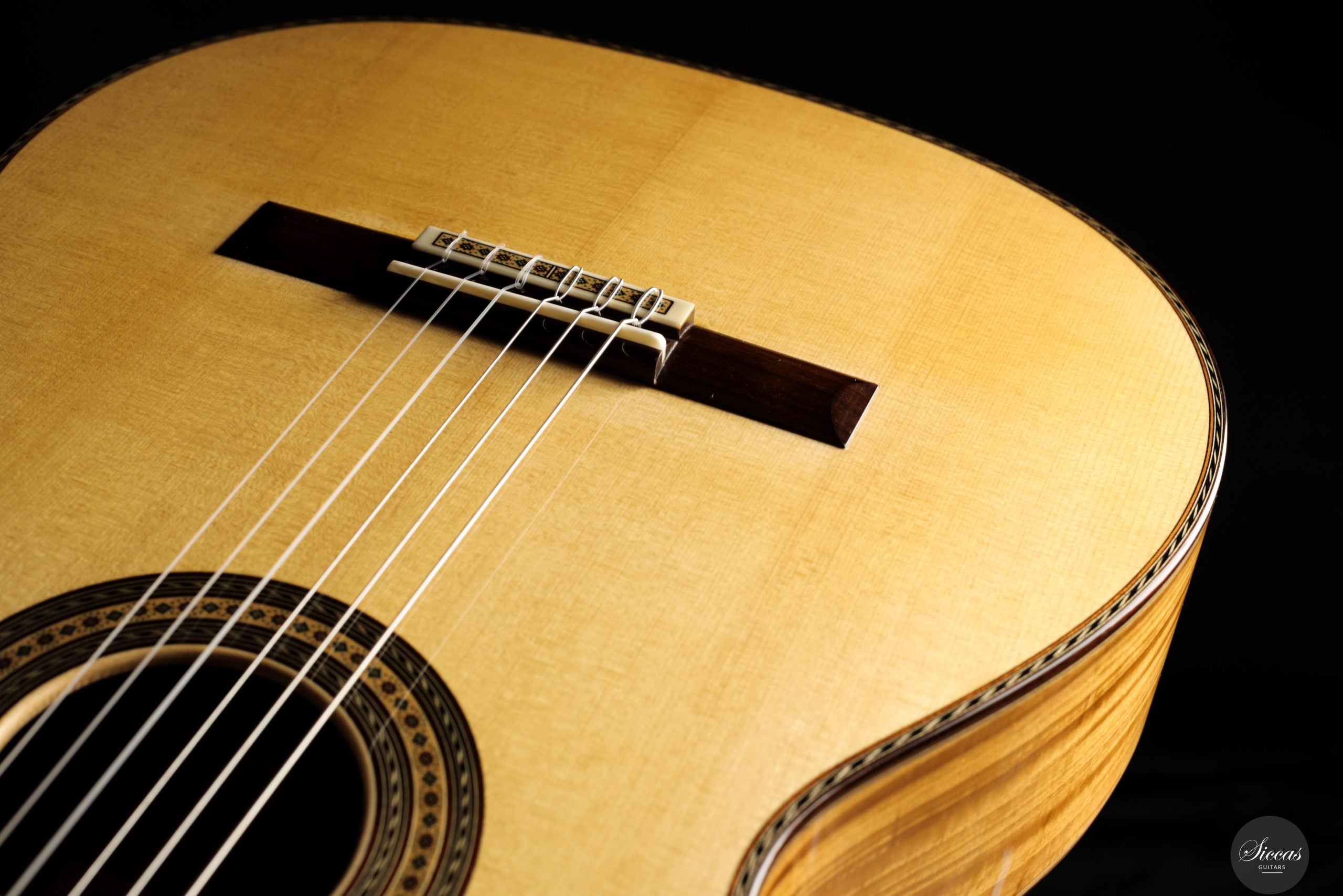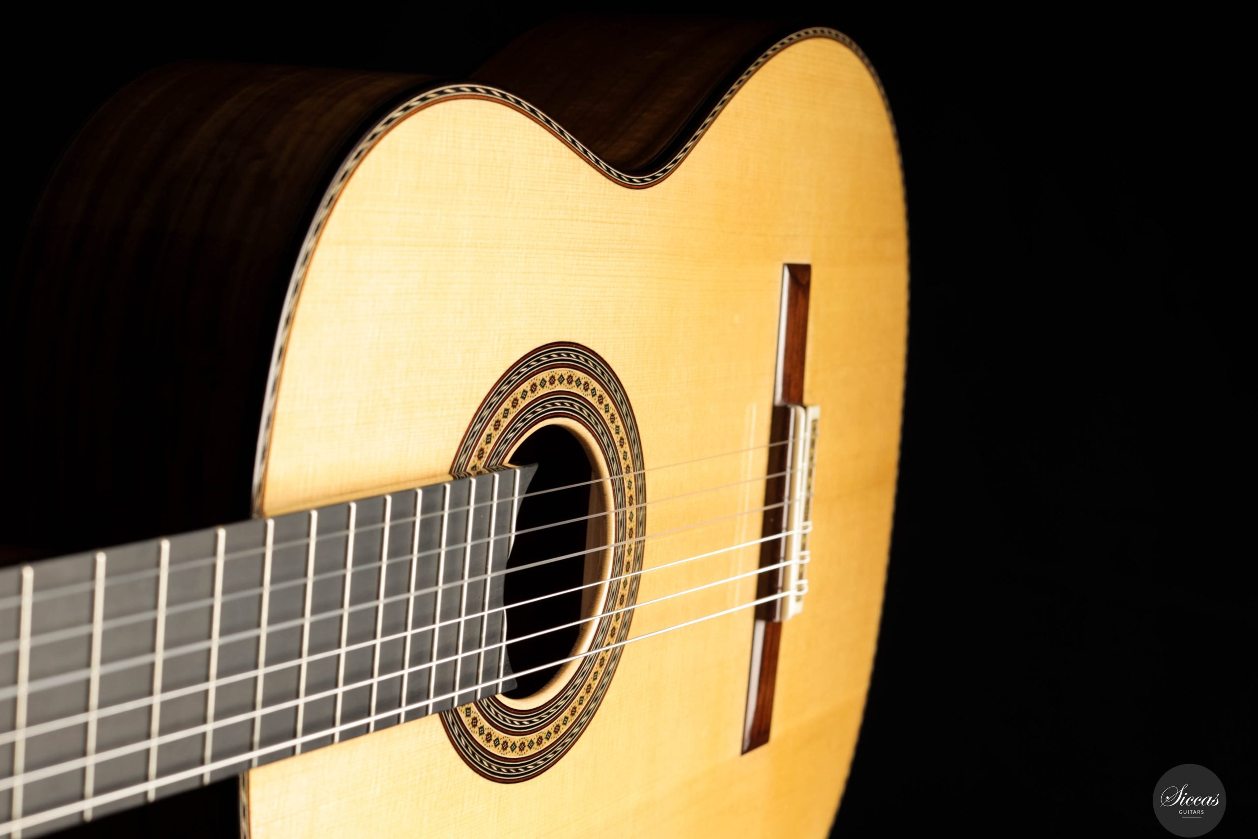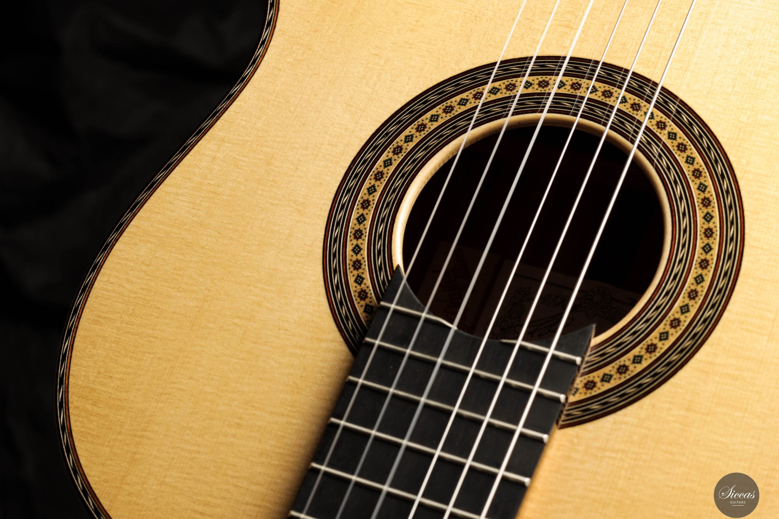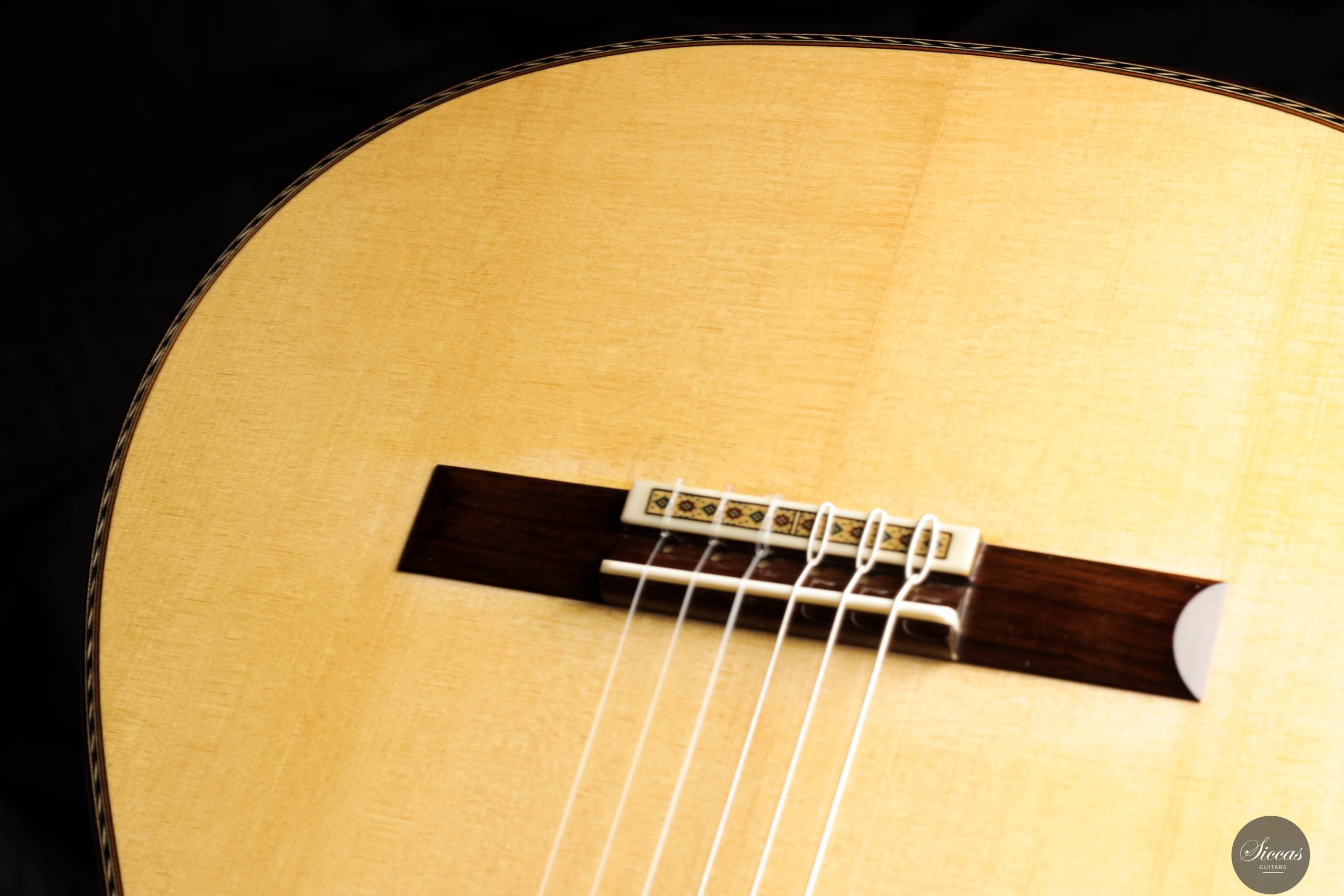Despite its traditional voicing, the guitar incorporates several innovations aimed at enhancing volume and tonal response. The soundboard is made from carefully aged spruce and built over a fully spherical template, resulting in a domed top not only in one but in all directions. This curvature allows the top to be extremely thin while retaining structural integrity. As a result, the internal bracing consists of only four fan braces and a small bridge plate, a minimalist structure made possible by the doming. To compensate for this geometry, the guitar features an elevated fingerboard that aligns the neck to the raised top surface.